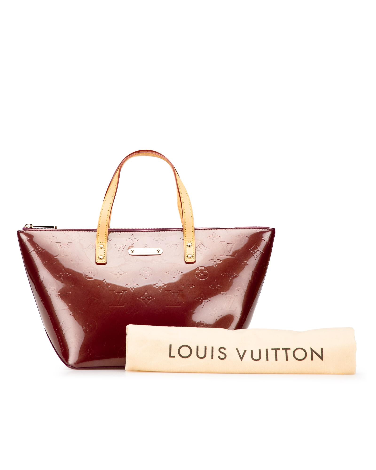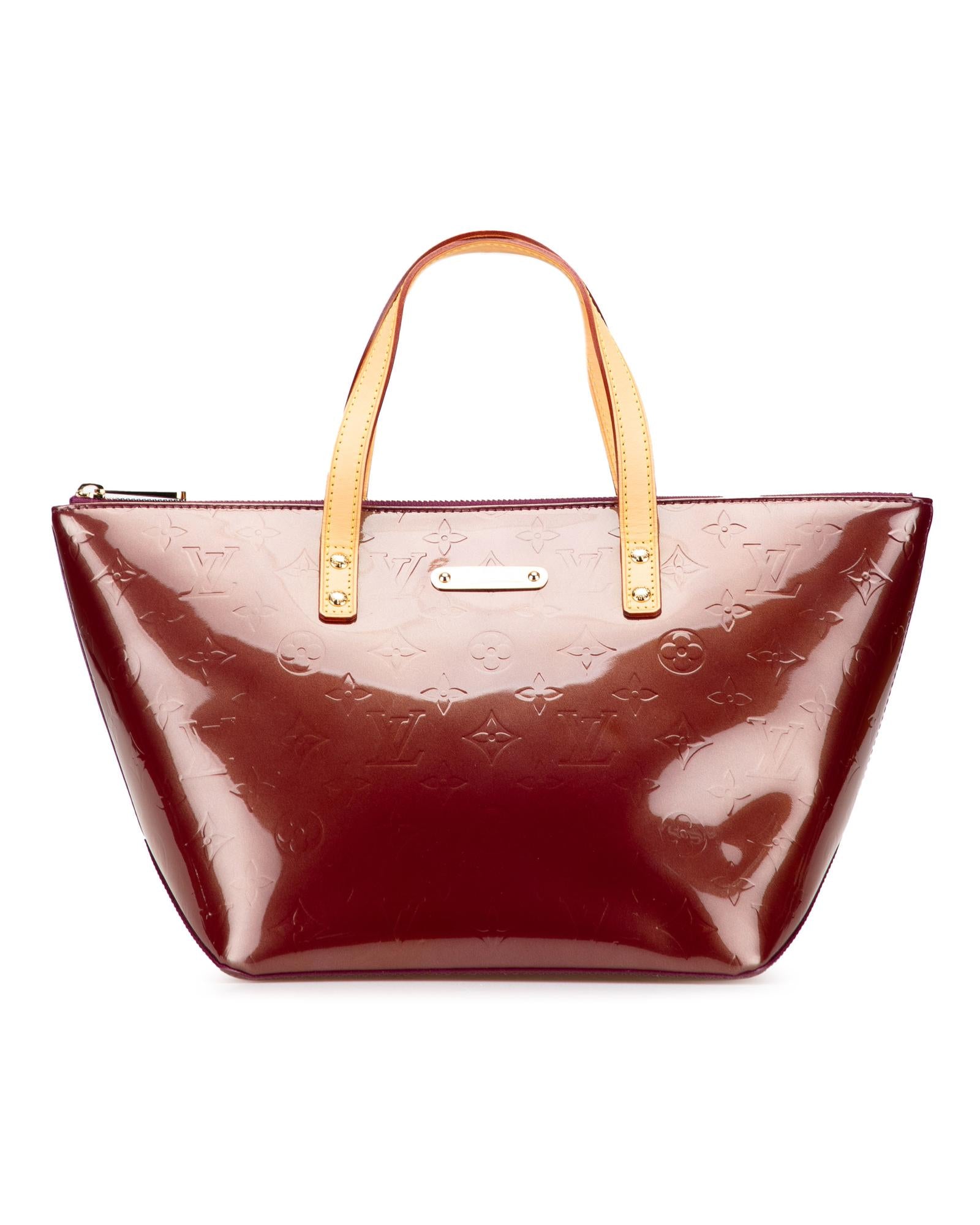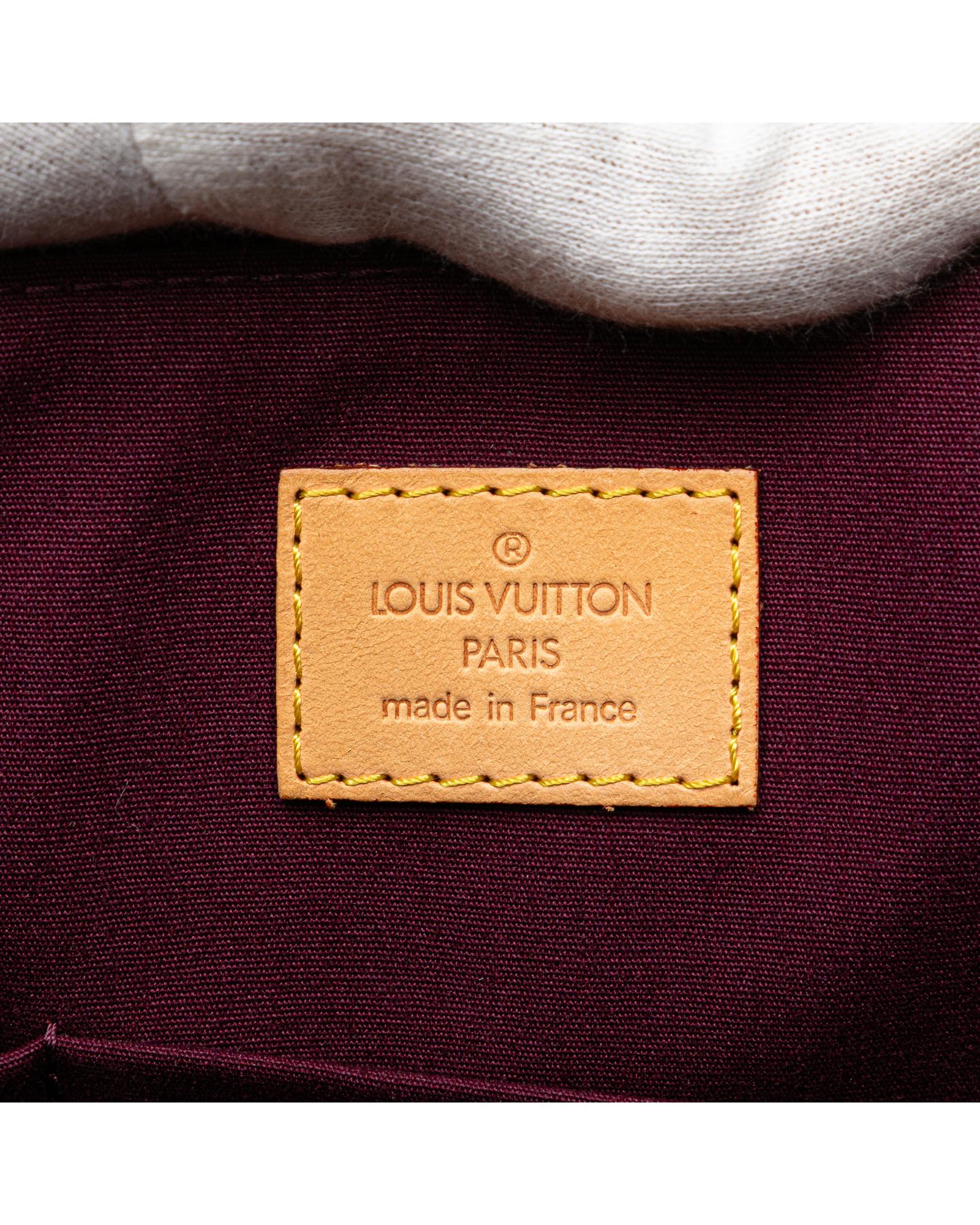 The Bellevue PM features a vernis leather body flat vachetta leather handles a top zip closure and interior slip pocketsBrand: Louis Vuitton Vintage