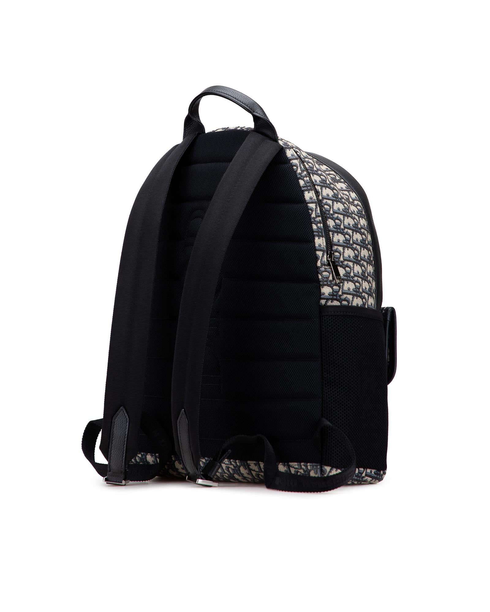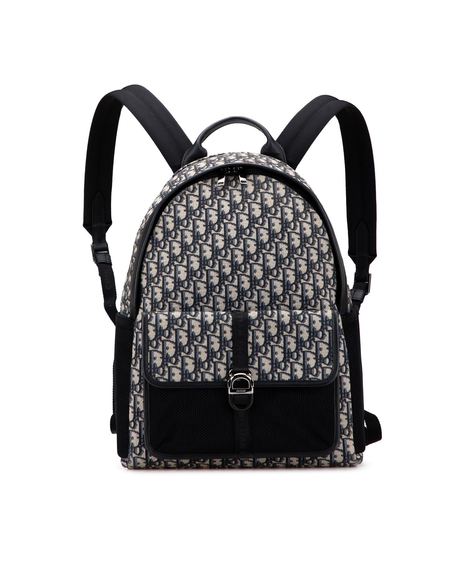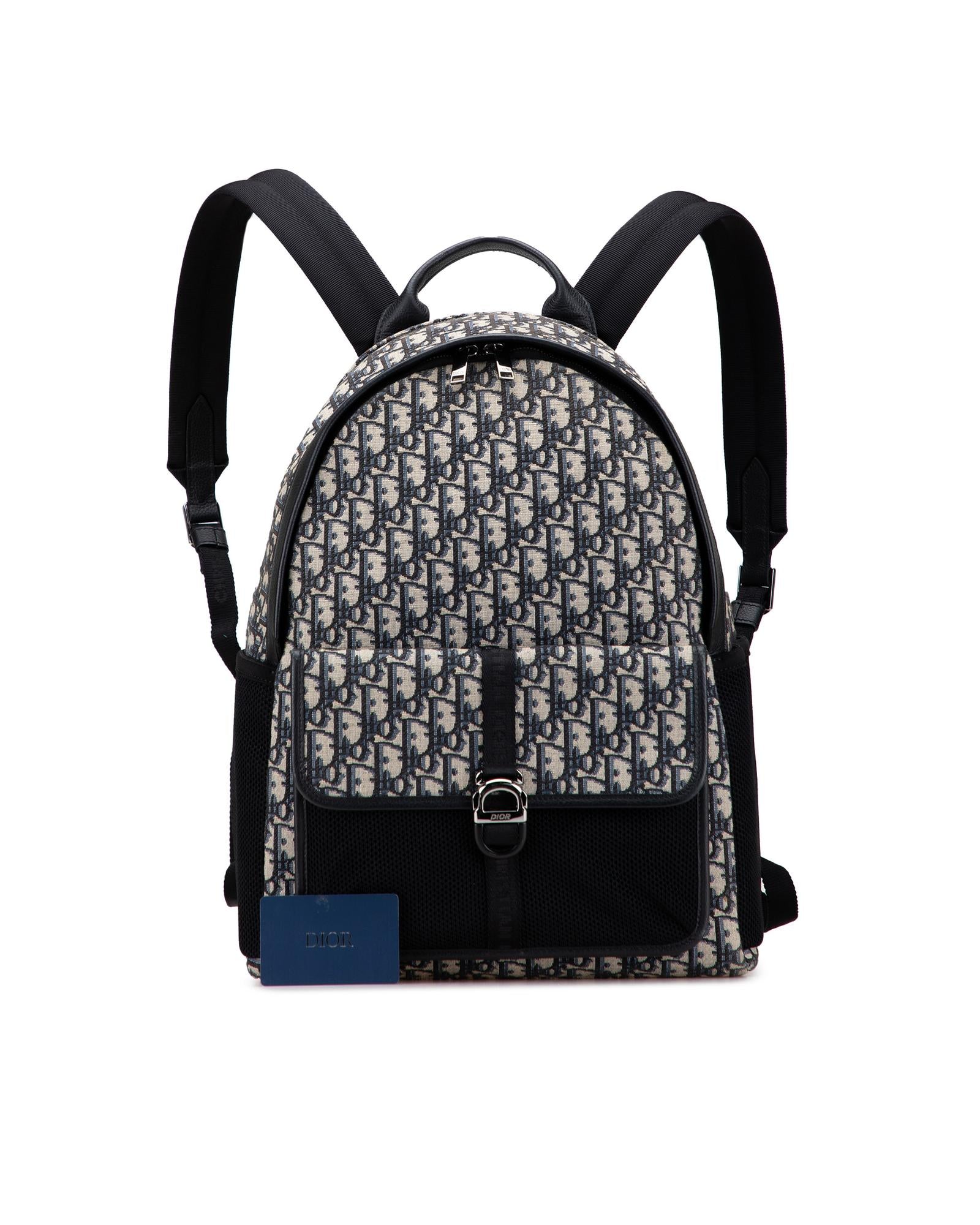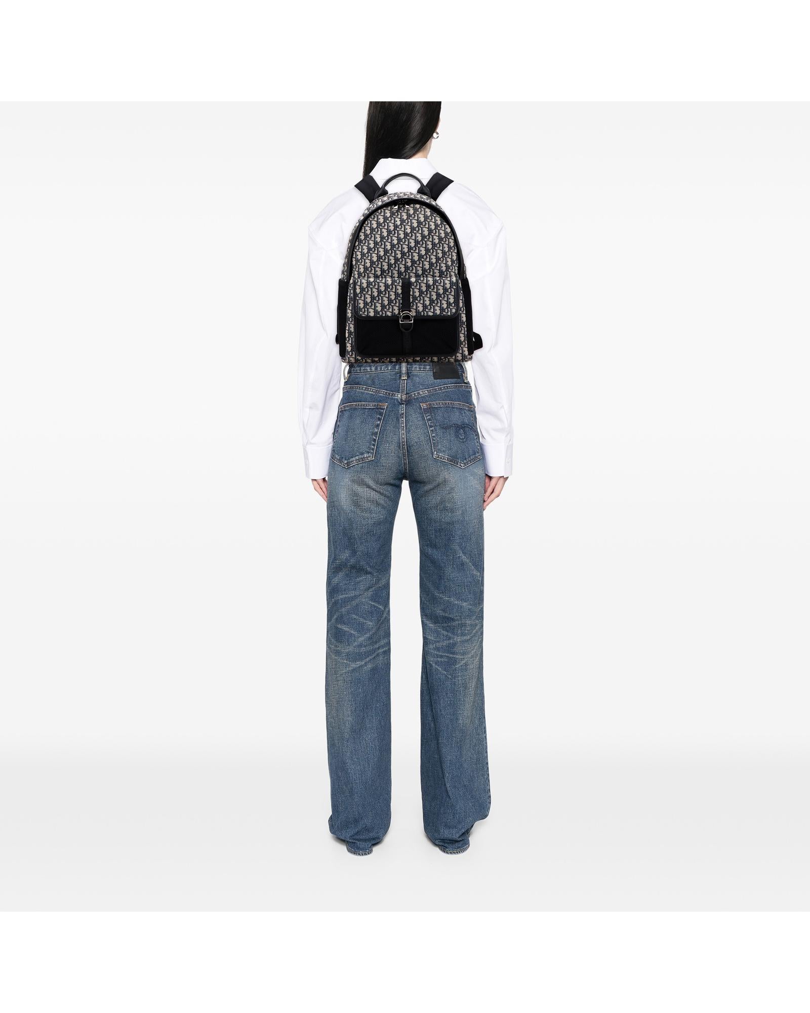 This backpack features a canvas body with leather trim a flat leather top handle adjustable flat back straps a top zip closure a top zip compartment for a laptop exterior side and front zip pockets and an interior slip pocket.