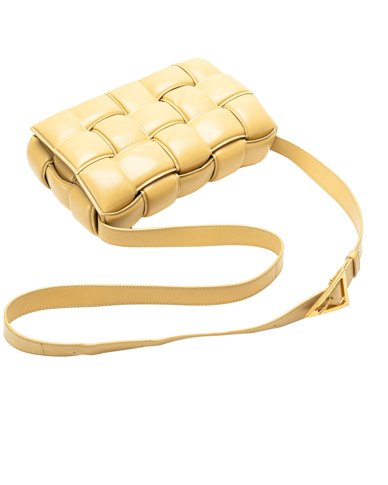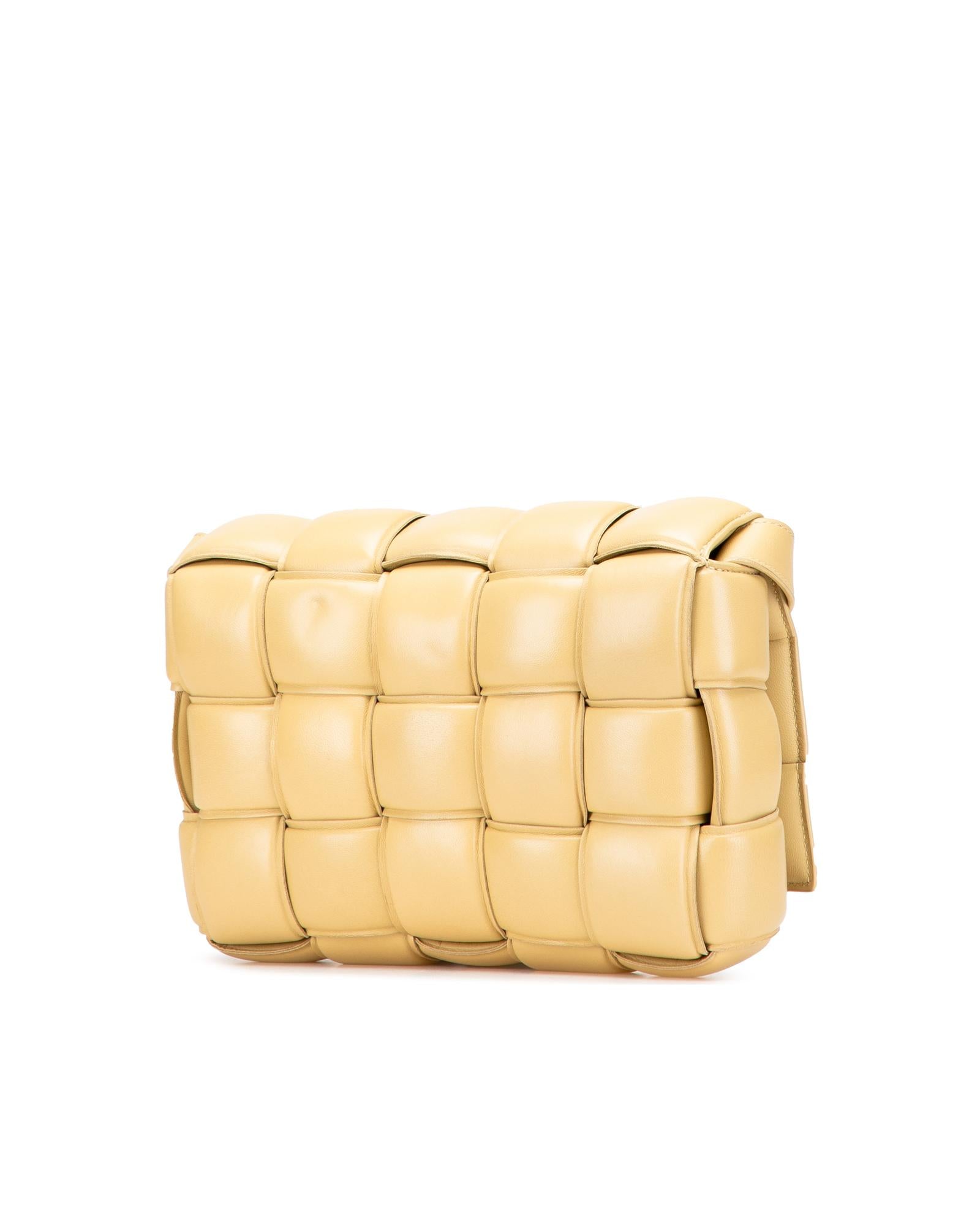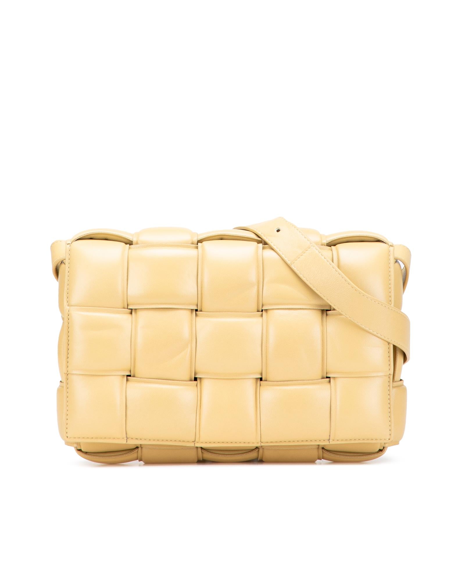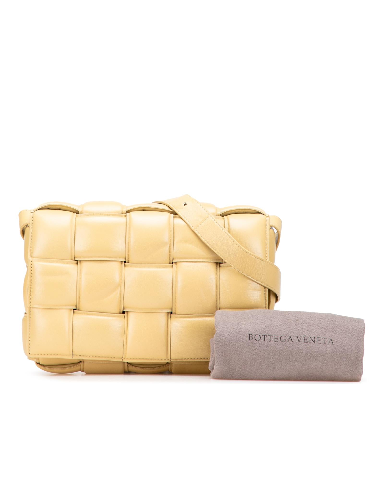 The Padded Cassette features a woven nappa leather body an adjustable flat leather shoulder strap a flap with push lock closure and an interior zip pocket.Brand: Bottega Veneta Vintage