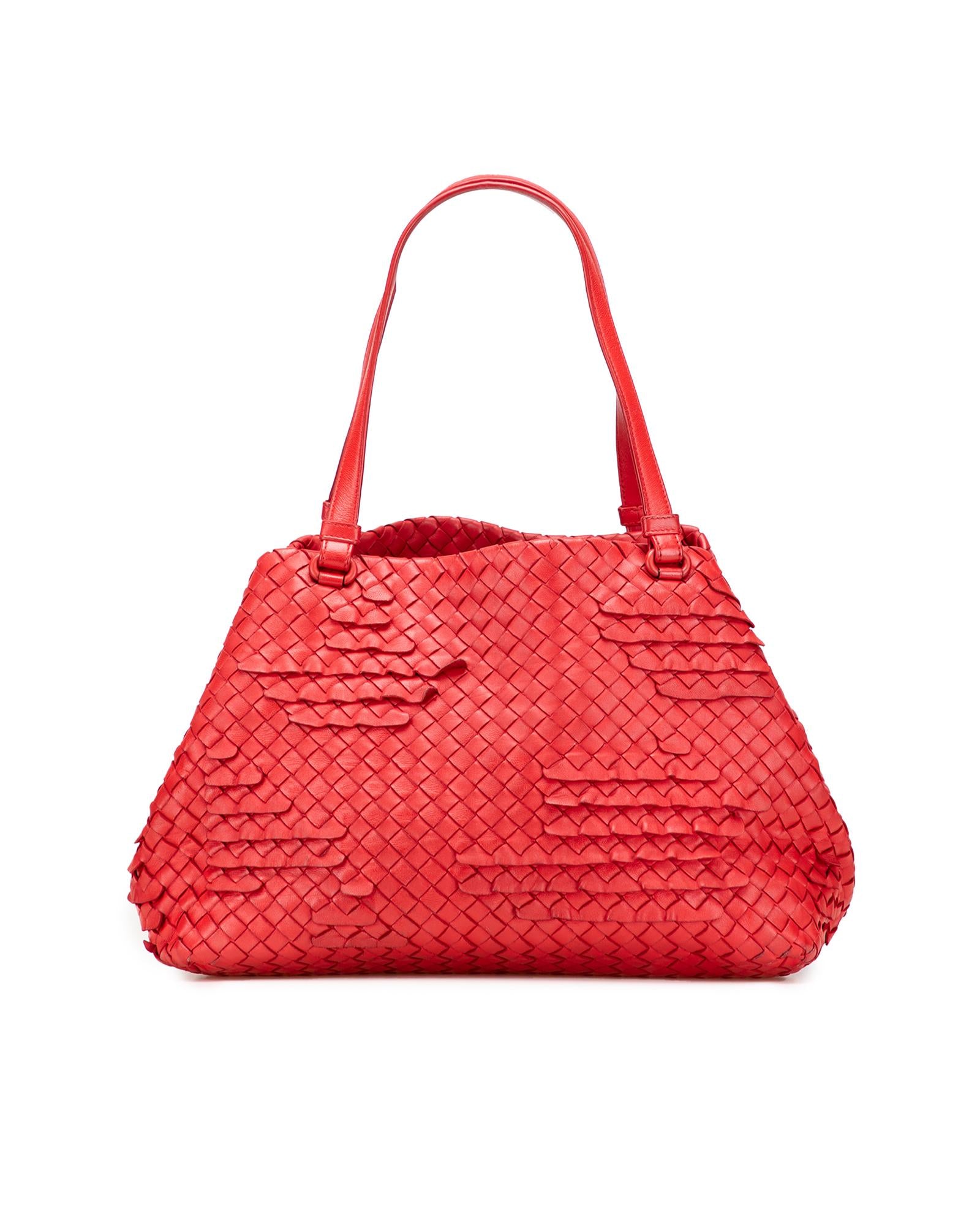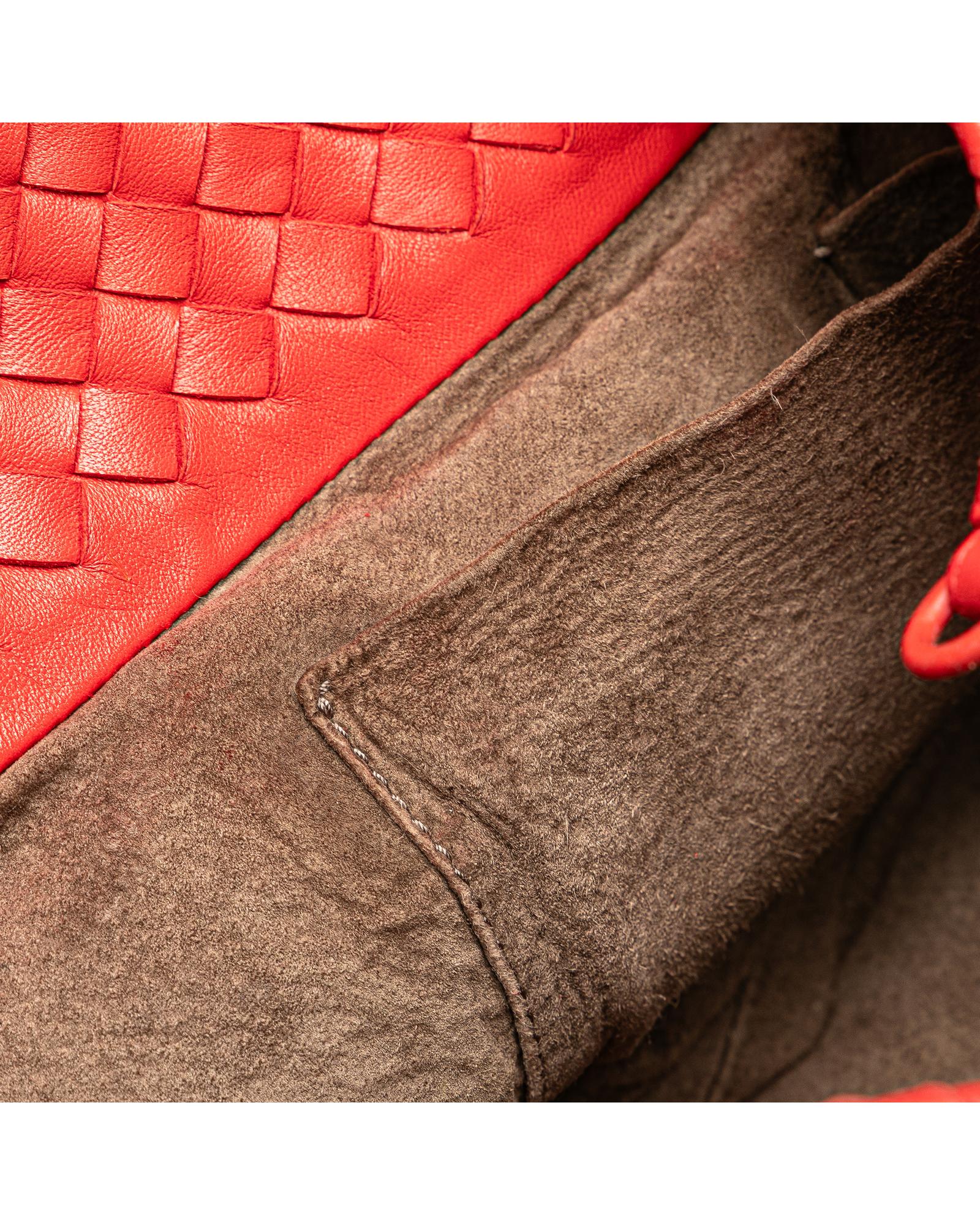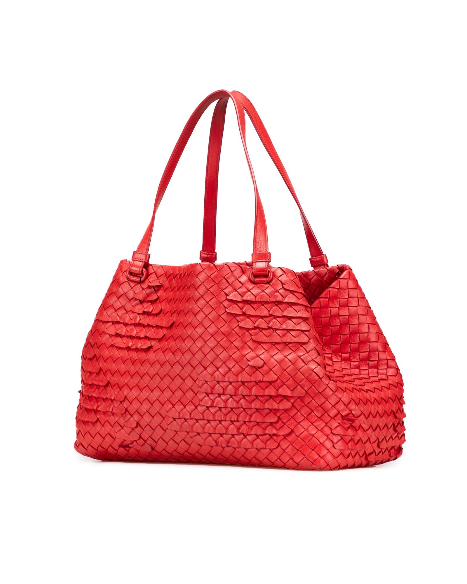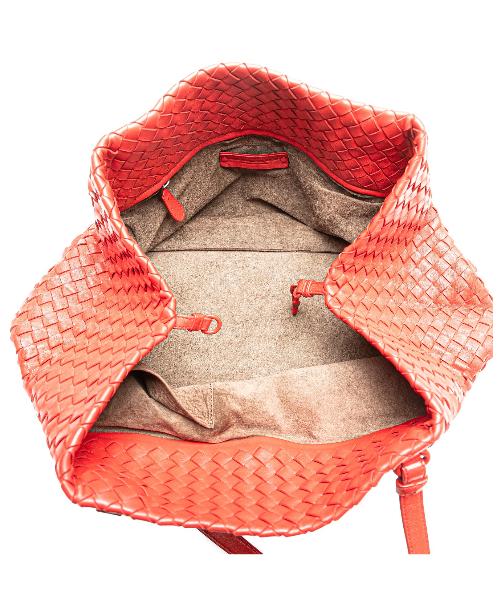 This tote bag features a woven leather body flat leather straps an open top with hook closure and interior zip and slip pockets.