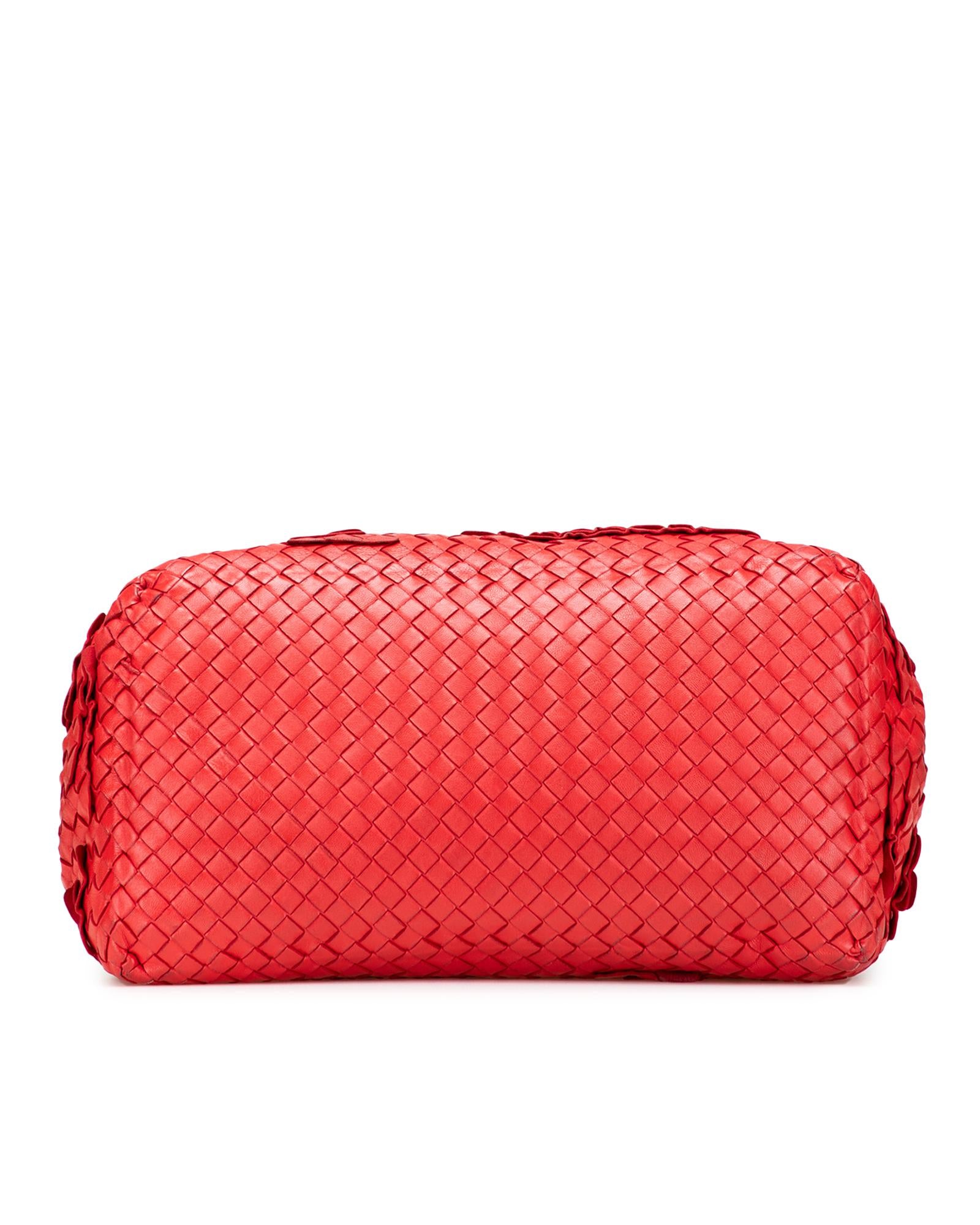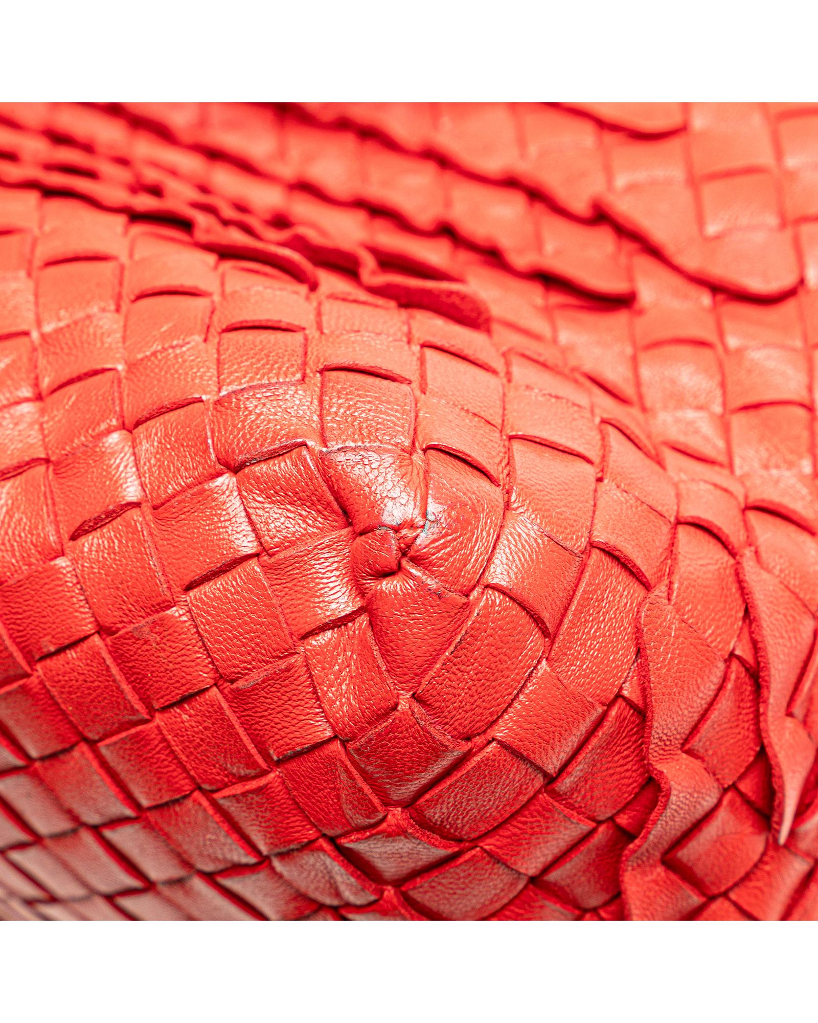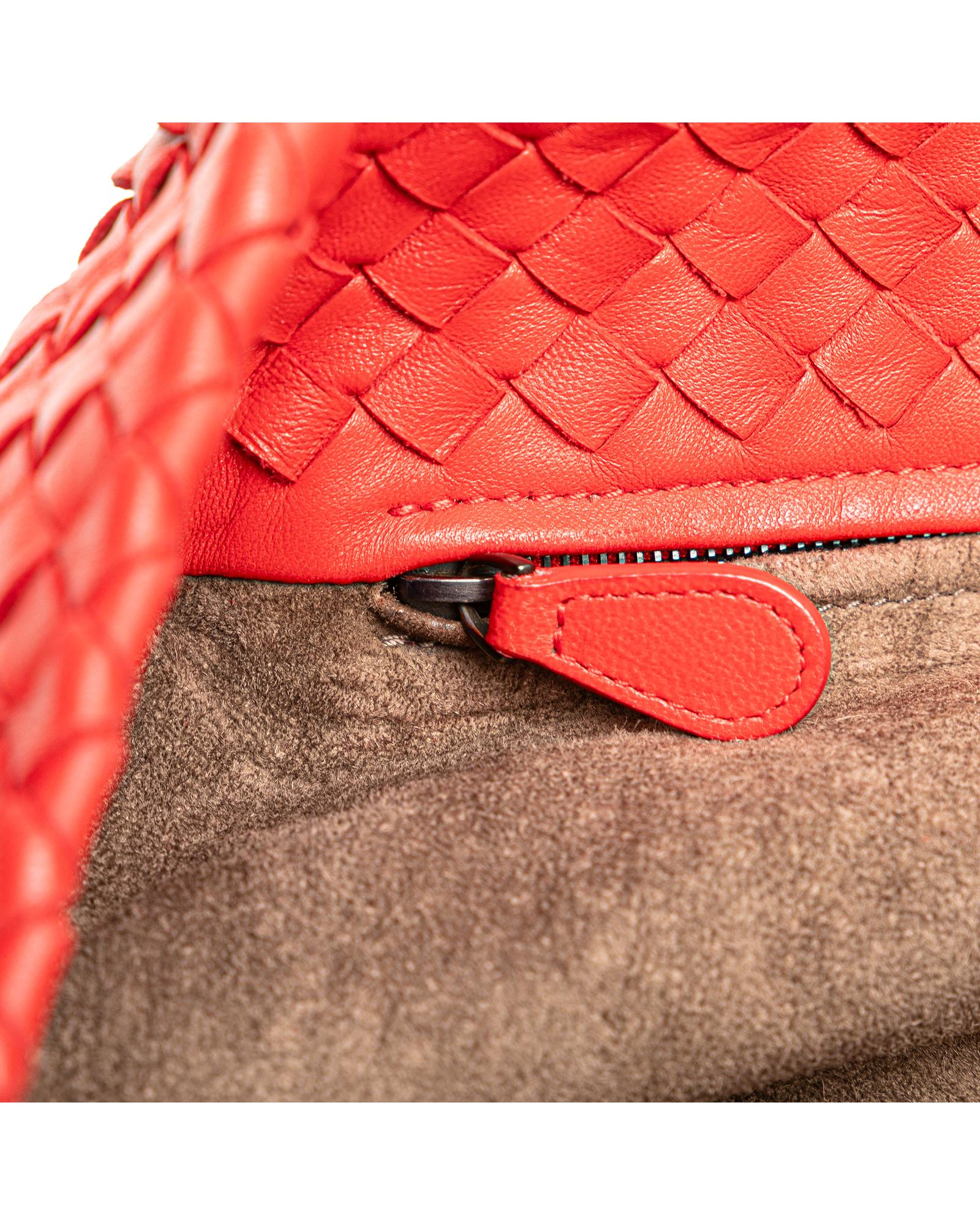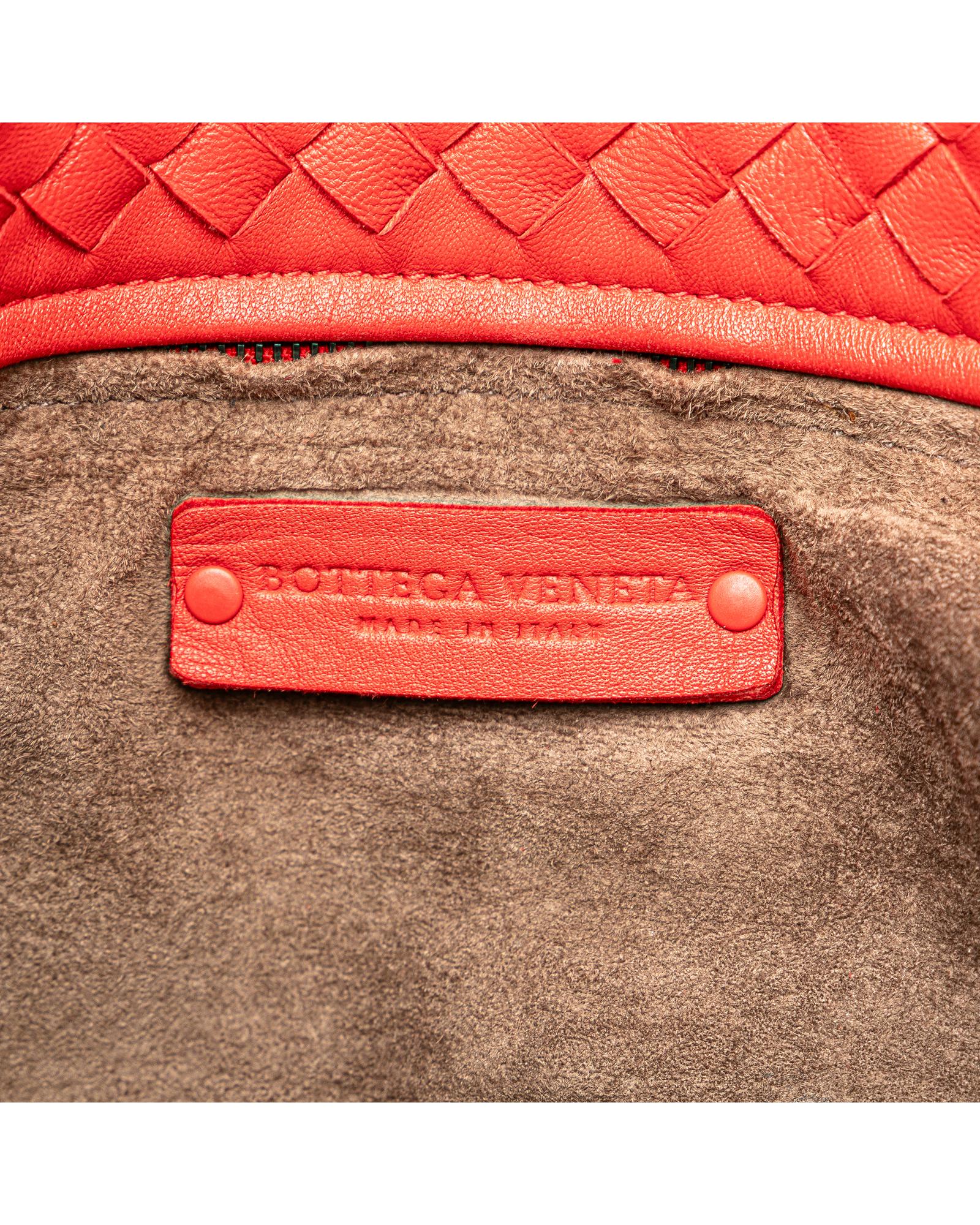 This tote bag features a woven leather body flat leather straps an open top with hook closure and interior zip and slip pockets.