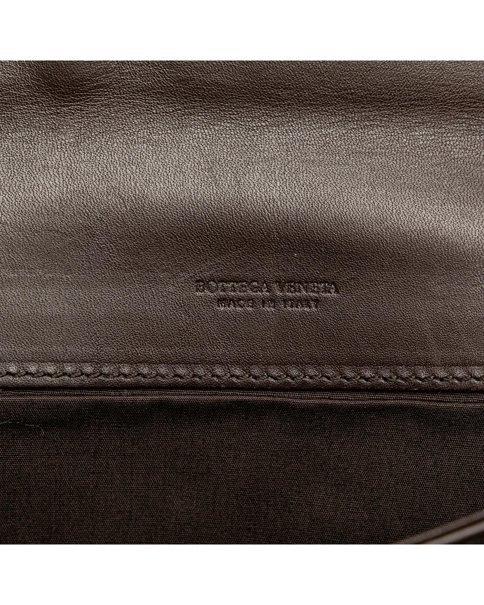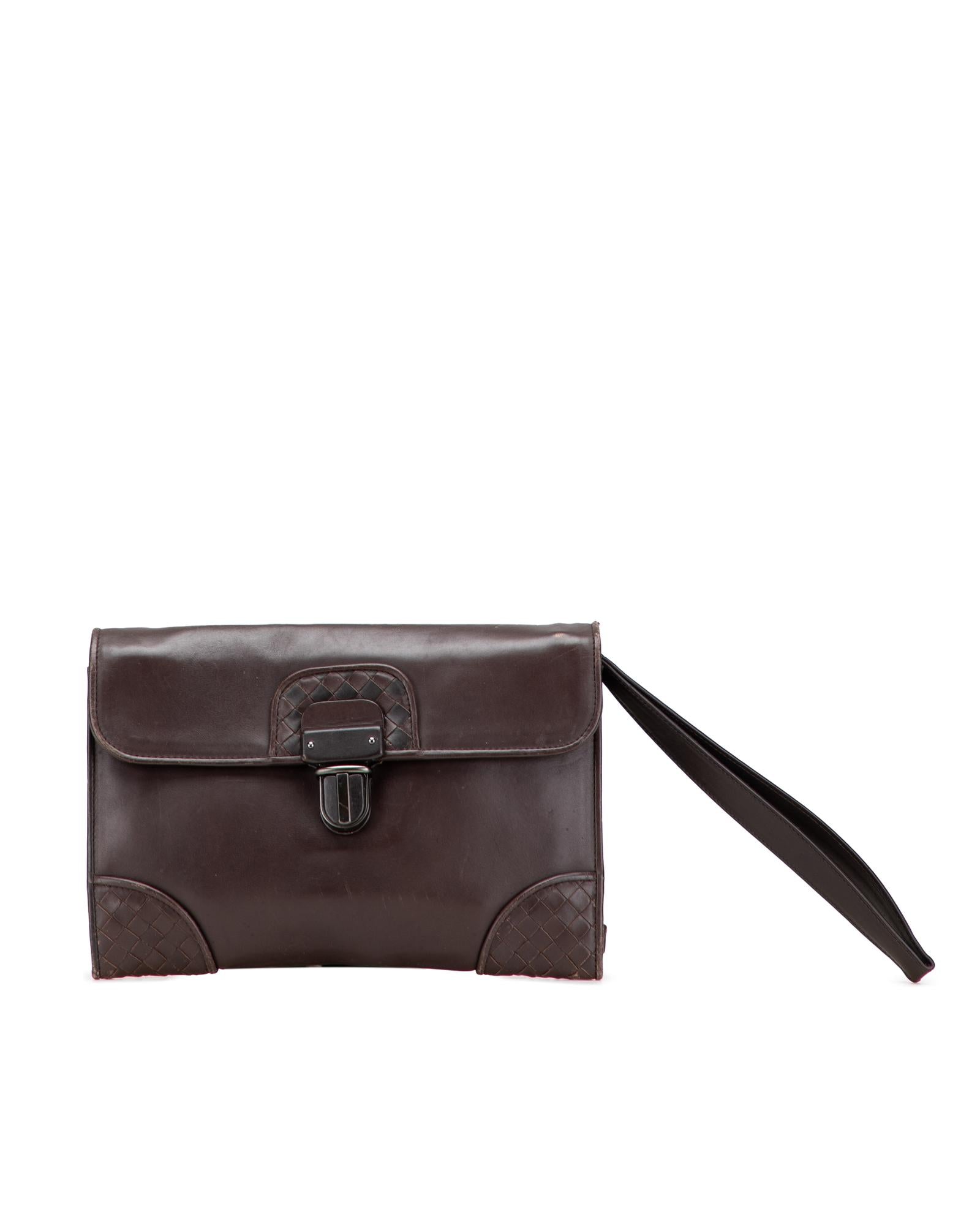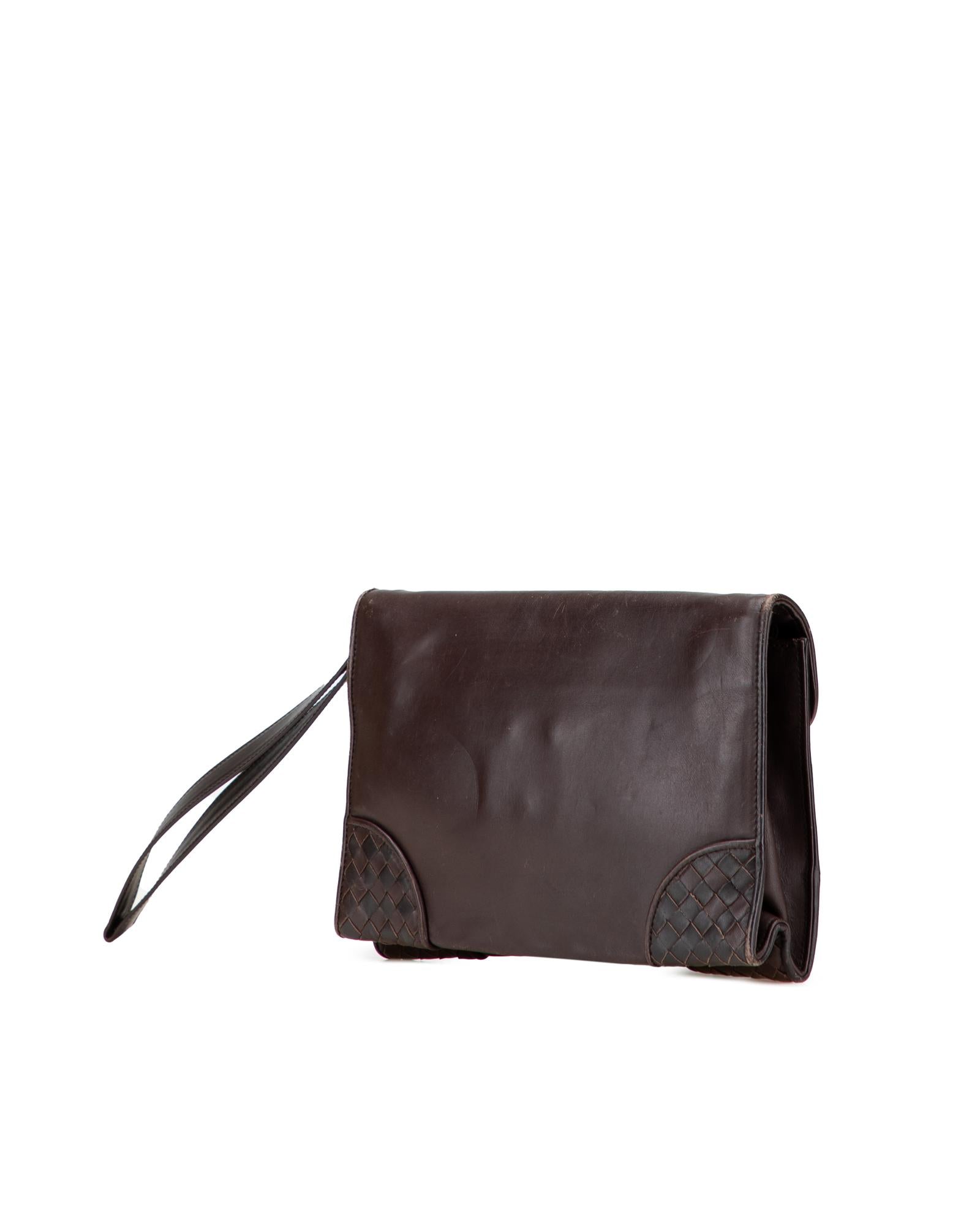 This clutch bag features a leather body with woven details and a front flap with a push lock closure.Brand: Bottega Veneta Vintage