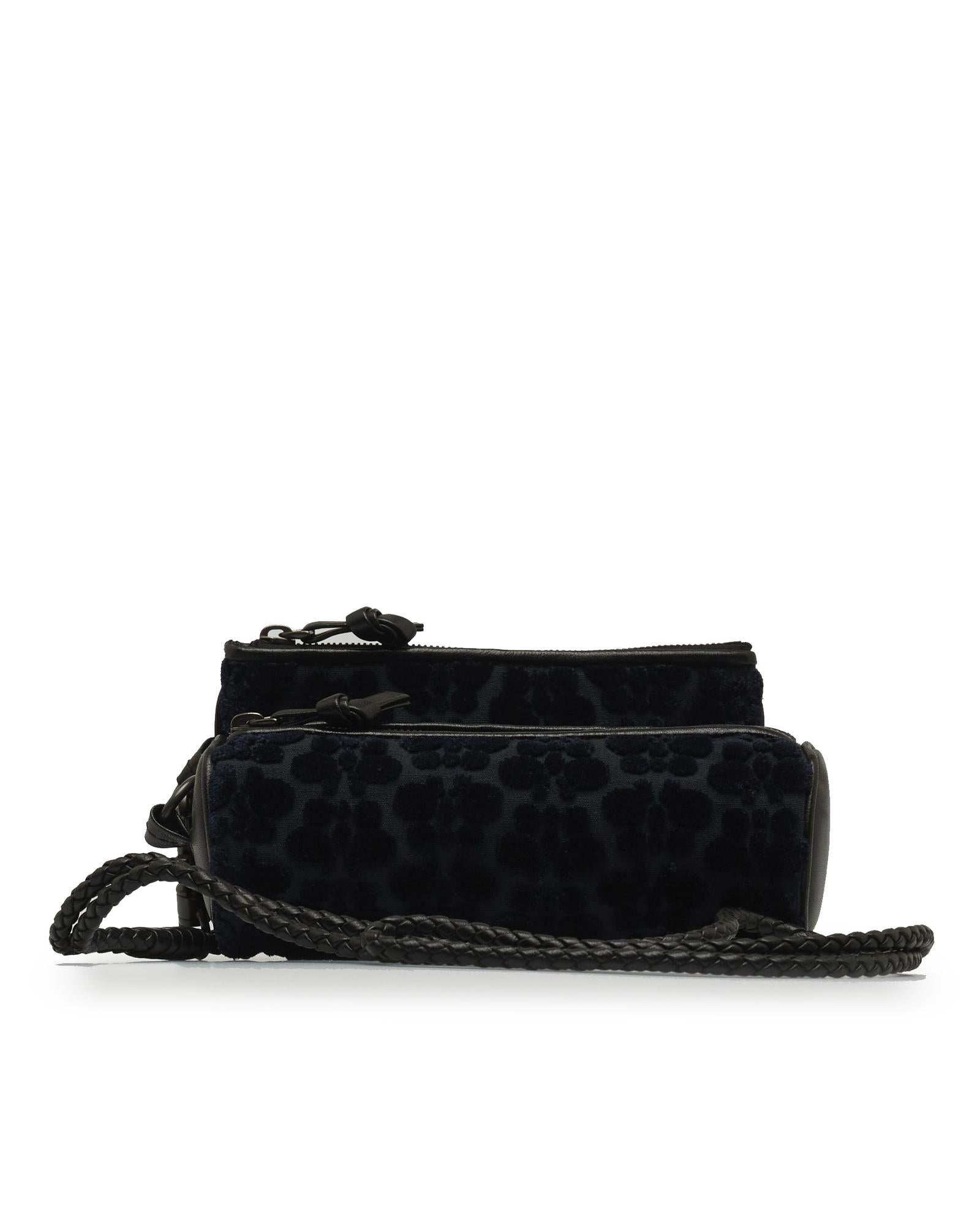 This crossbody bag features a velvet body and leather trim a braided leather strap and a top zip closure.