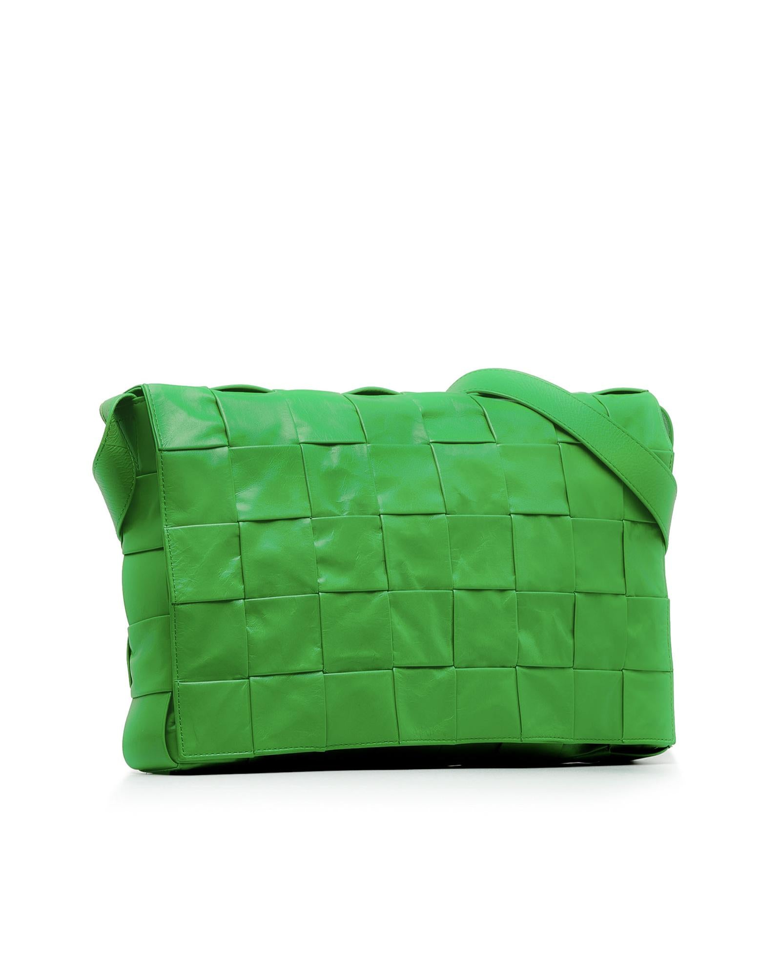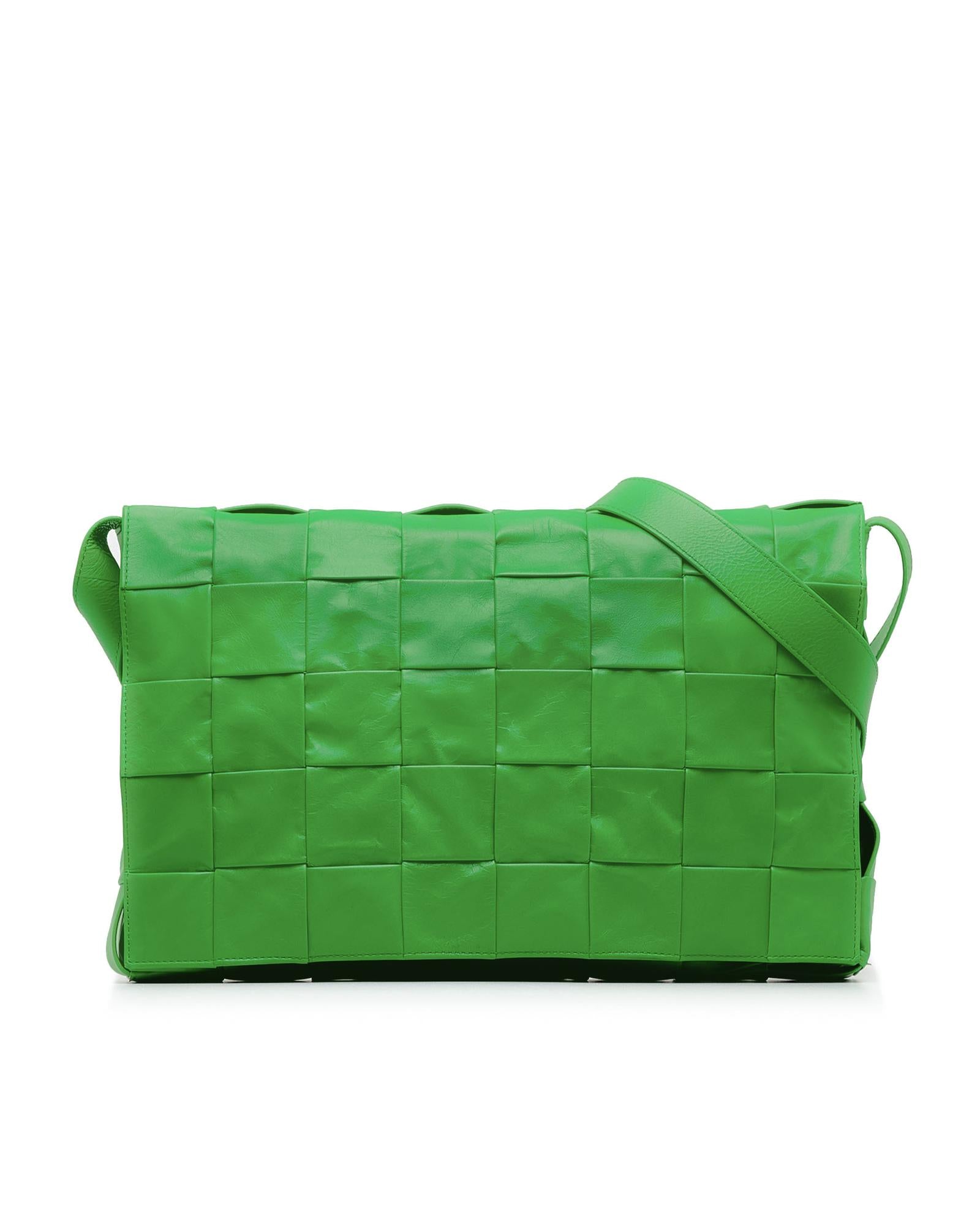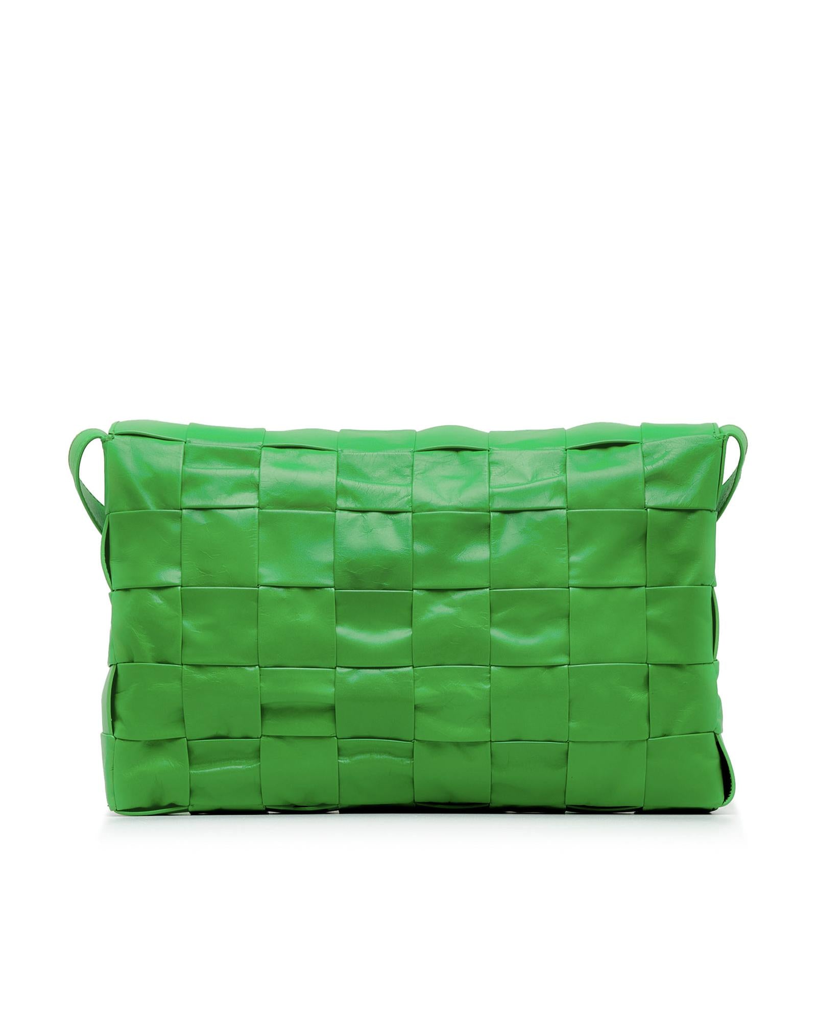 The Cassette features a woven leather body a flat leather strap a front flap with magnetic snap button closure and an interior slip pocket.