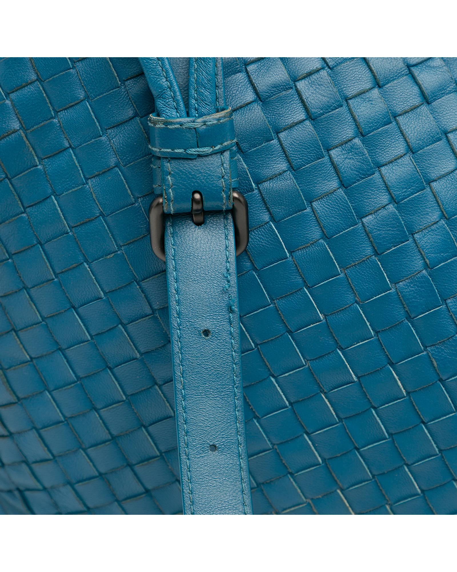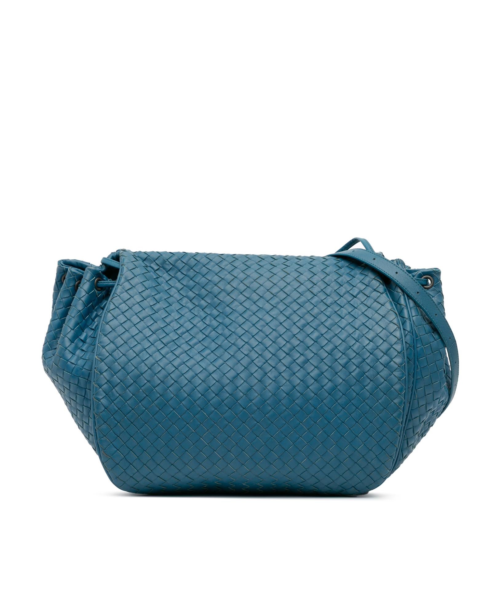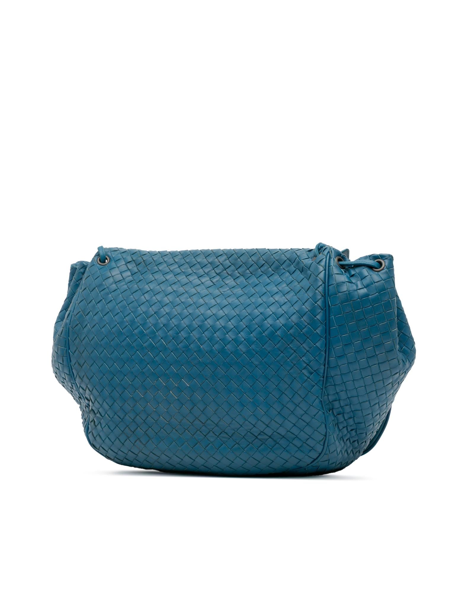 This crossbody features a woven leather body a flat strap a front flap and drawstring closure and interior zip and slip pockets. Strap has been repainted.Brand: Bottega Veneta Vintage