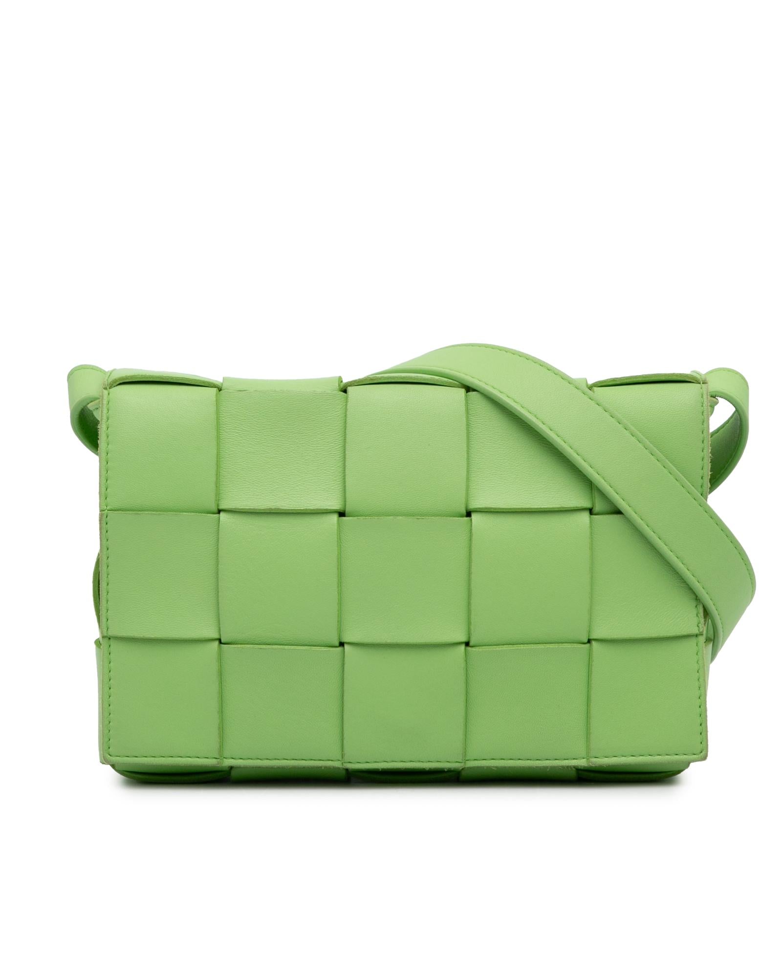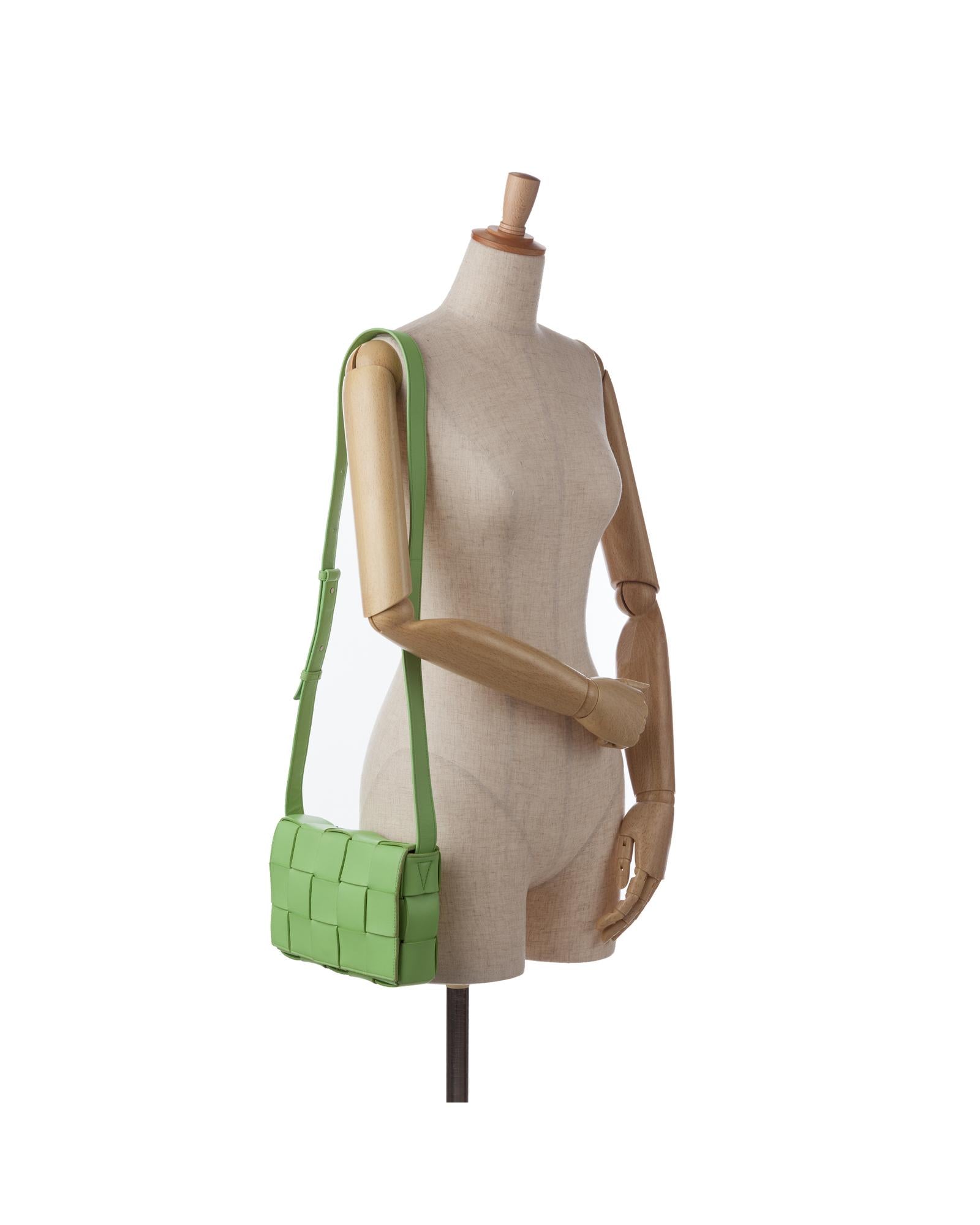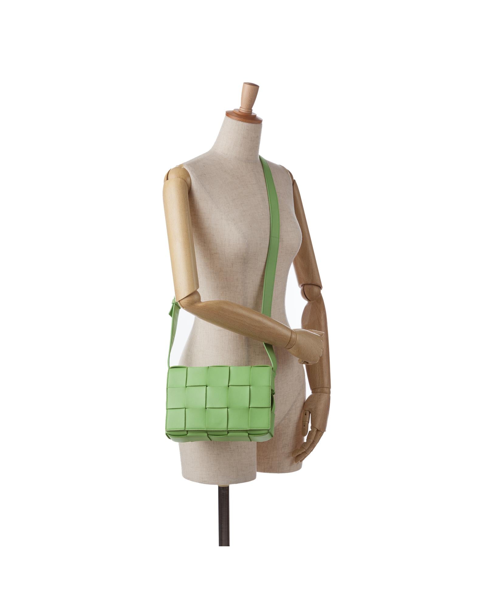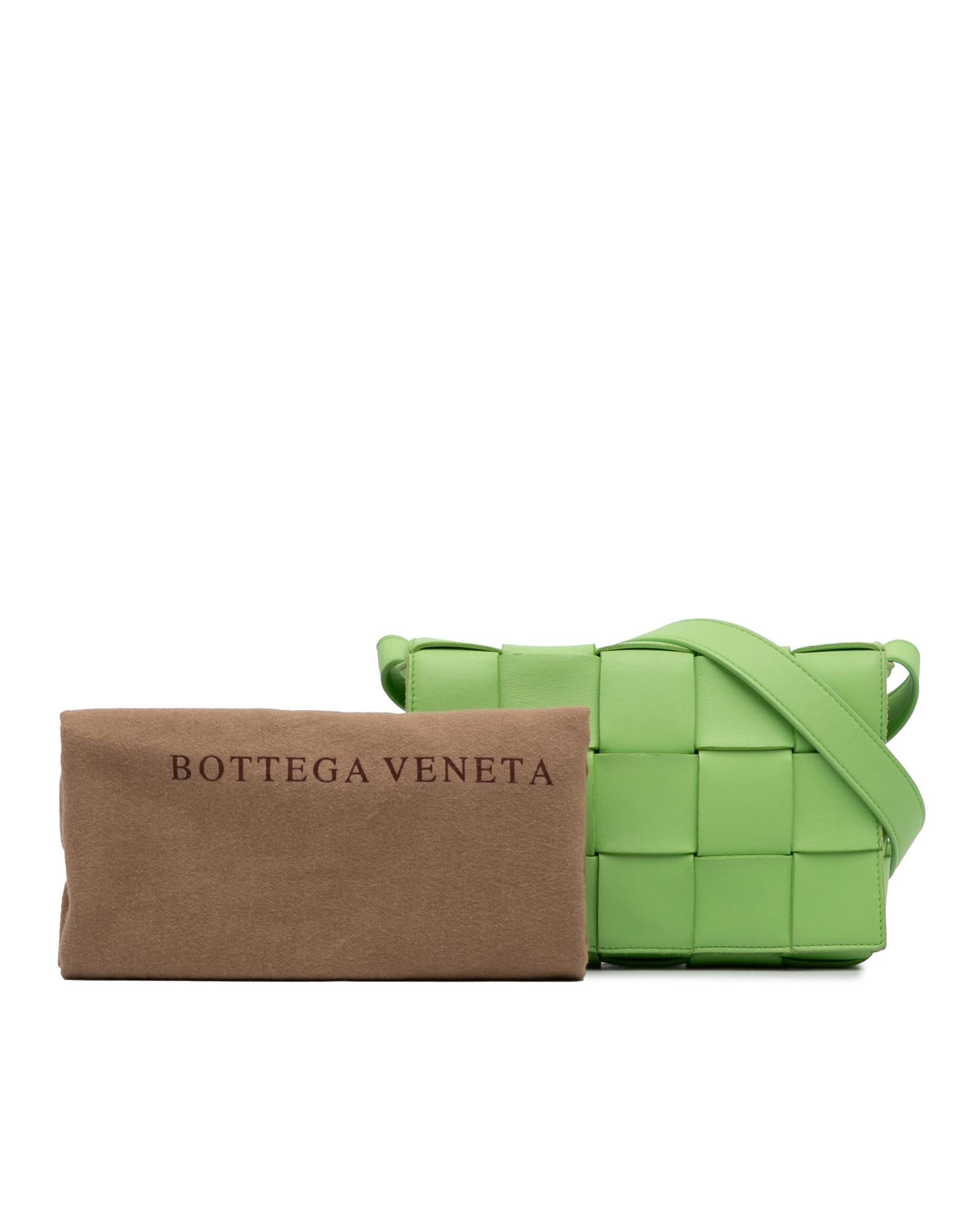 The Cassette features a woven leather body a flat leather strap a front flap with magnetic snap button closure and an interior zip pocket.Brand: Bottega Veneta Vintage