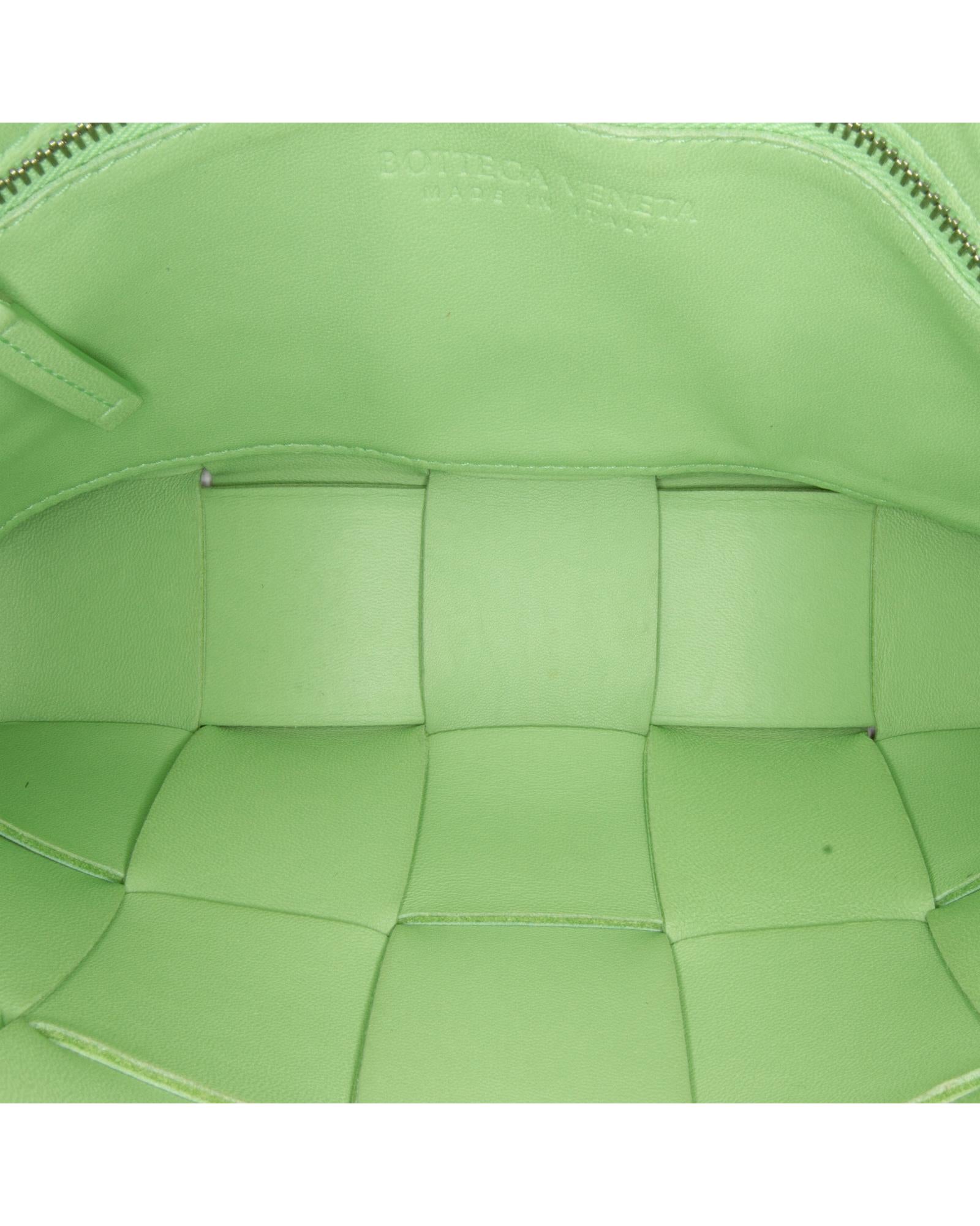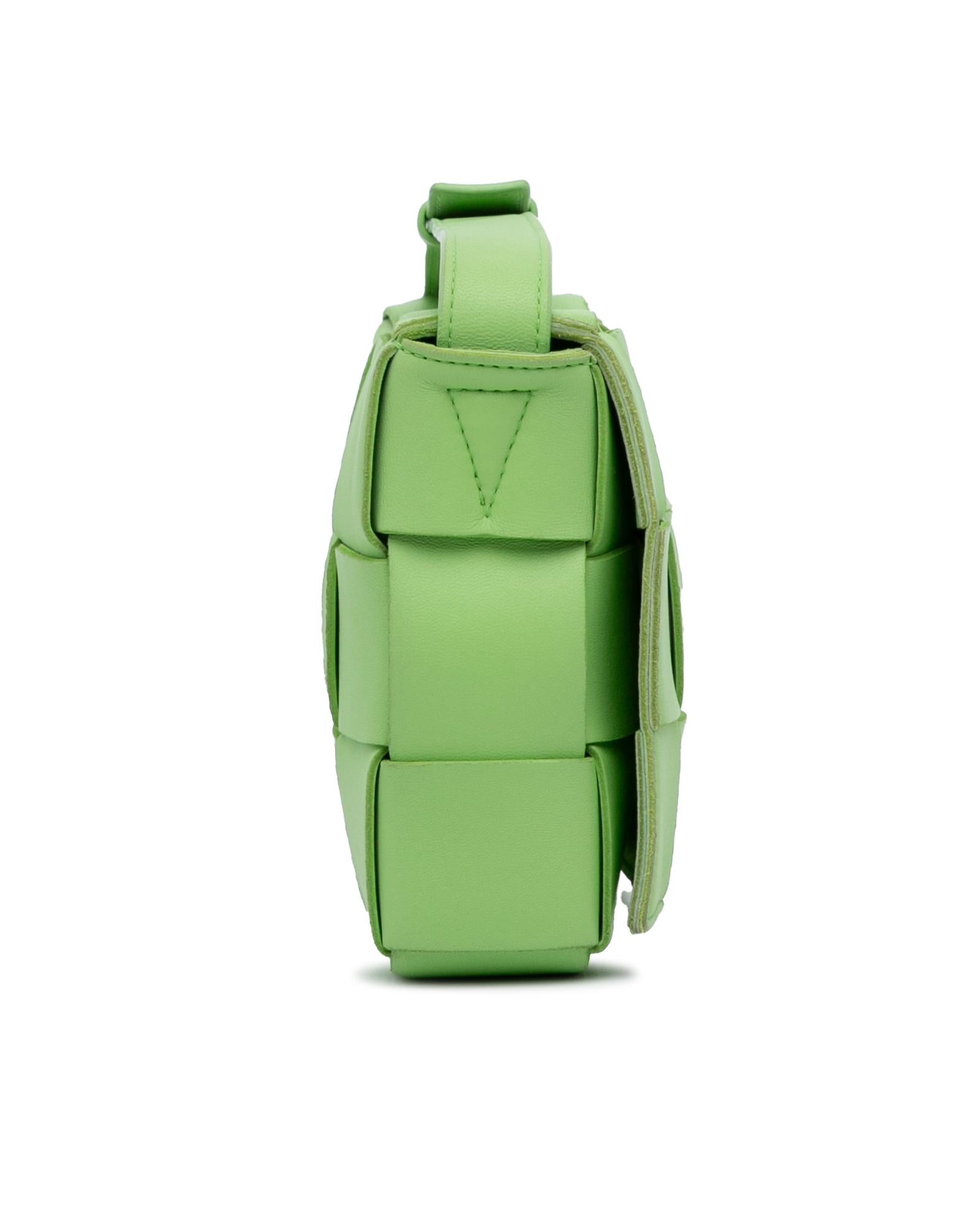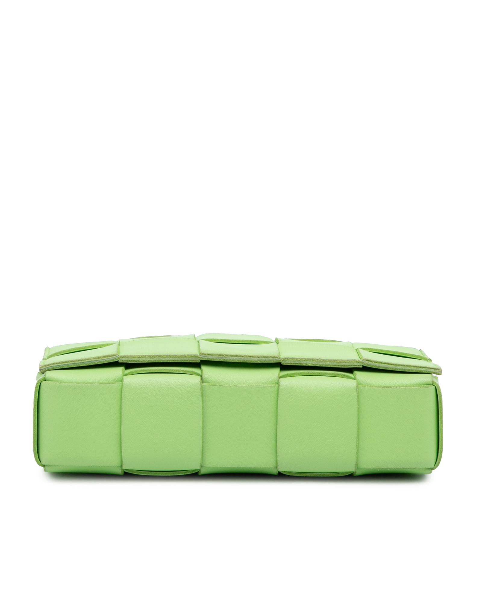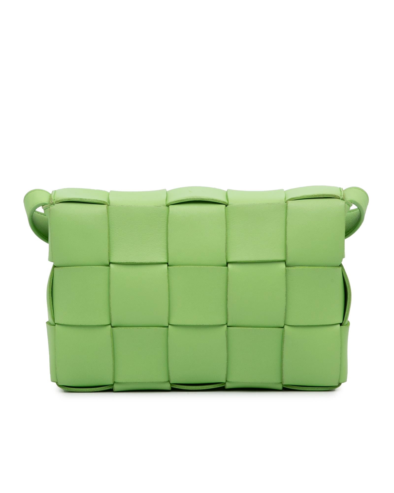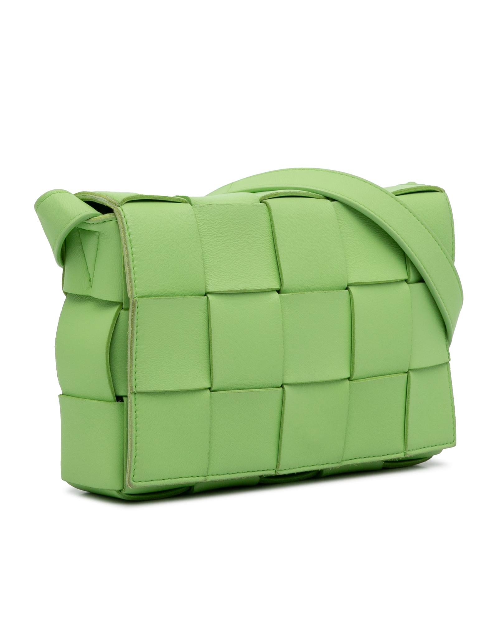 The Cassette features a woven leather body a flat leather strap a front flap with magnetic snap button closure and an interior zip pocket.Brand: Bottega Veneta Vintage