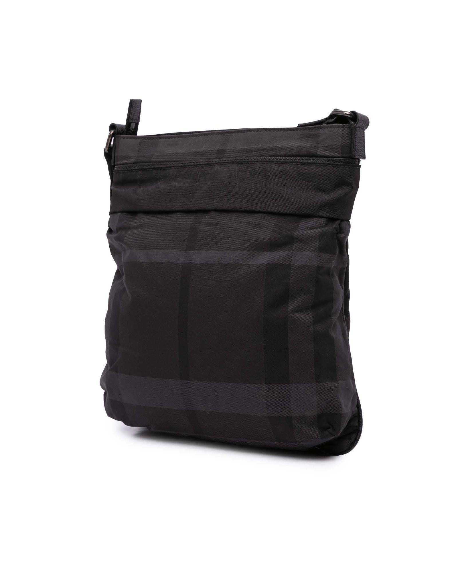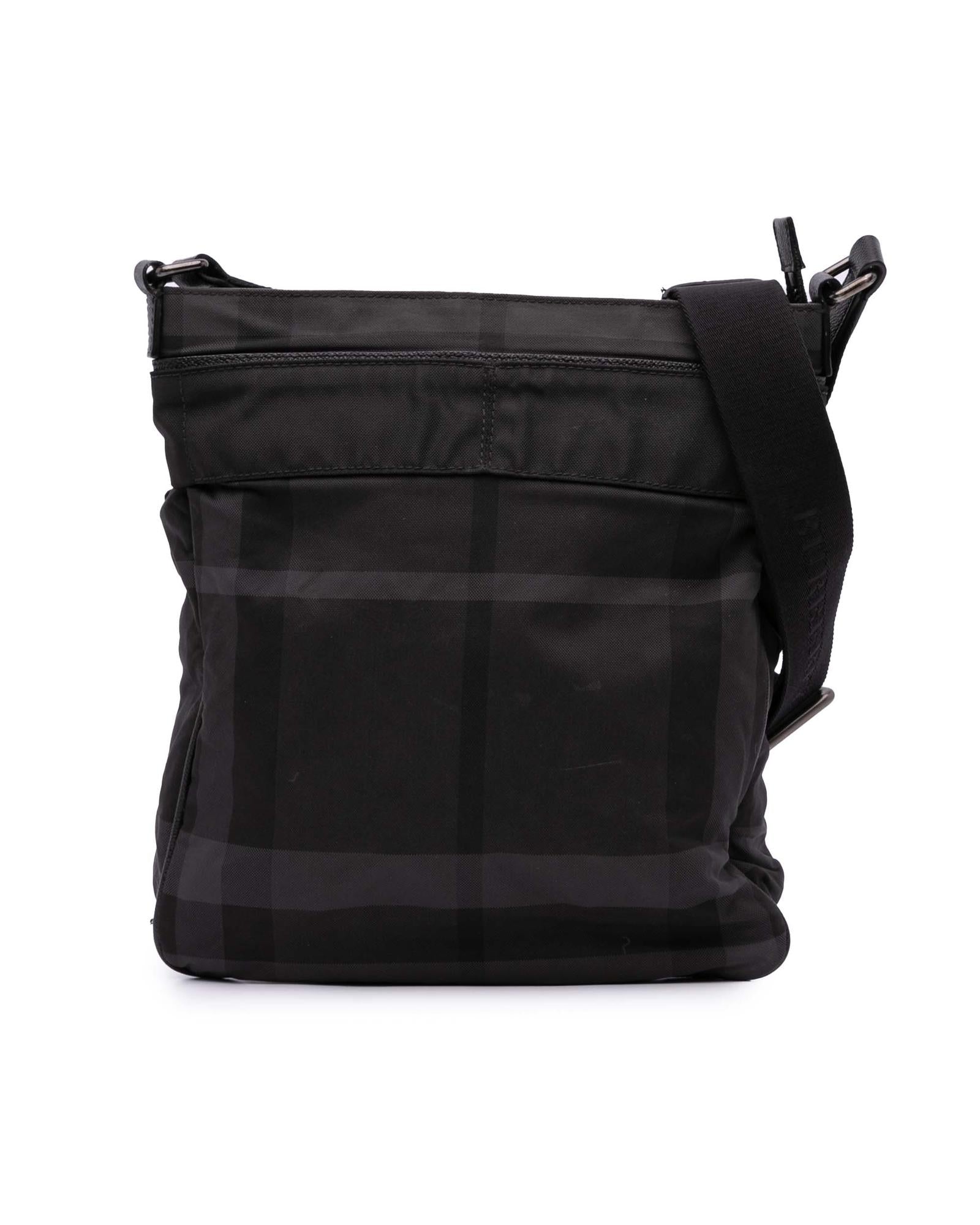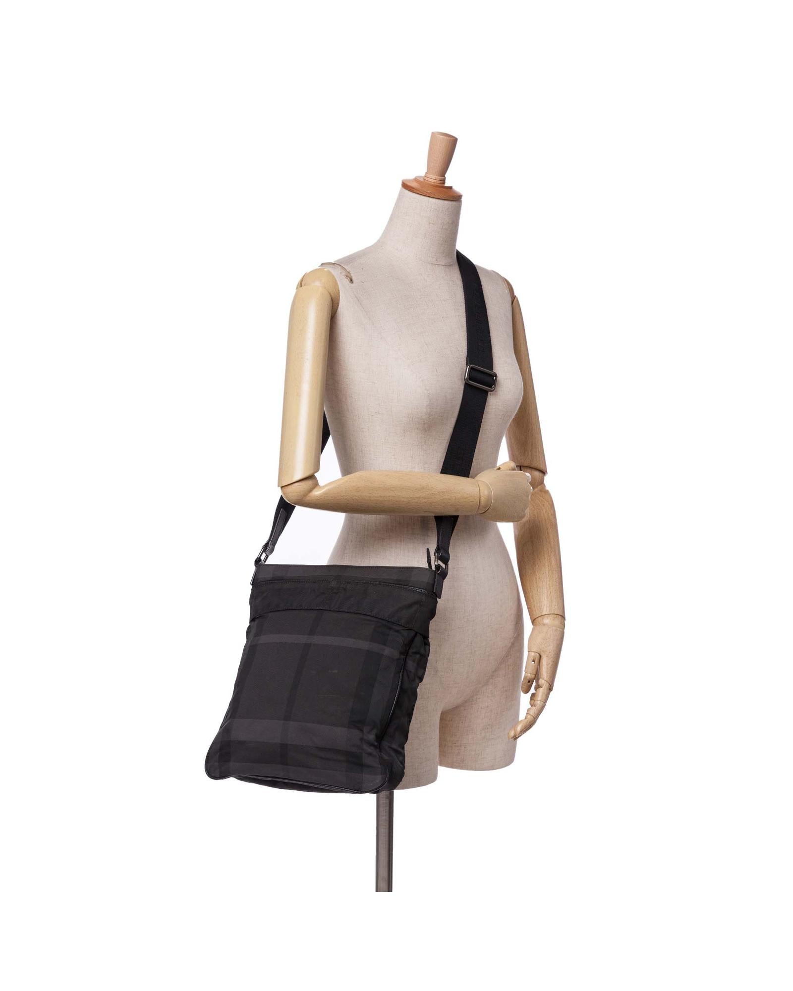 This crossbody bag features a nylon body with leather trim an adjustable flat canvas shoulder strap a top zip closure and interior zip and slip pockets.Brand: Burberry Vintage