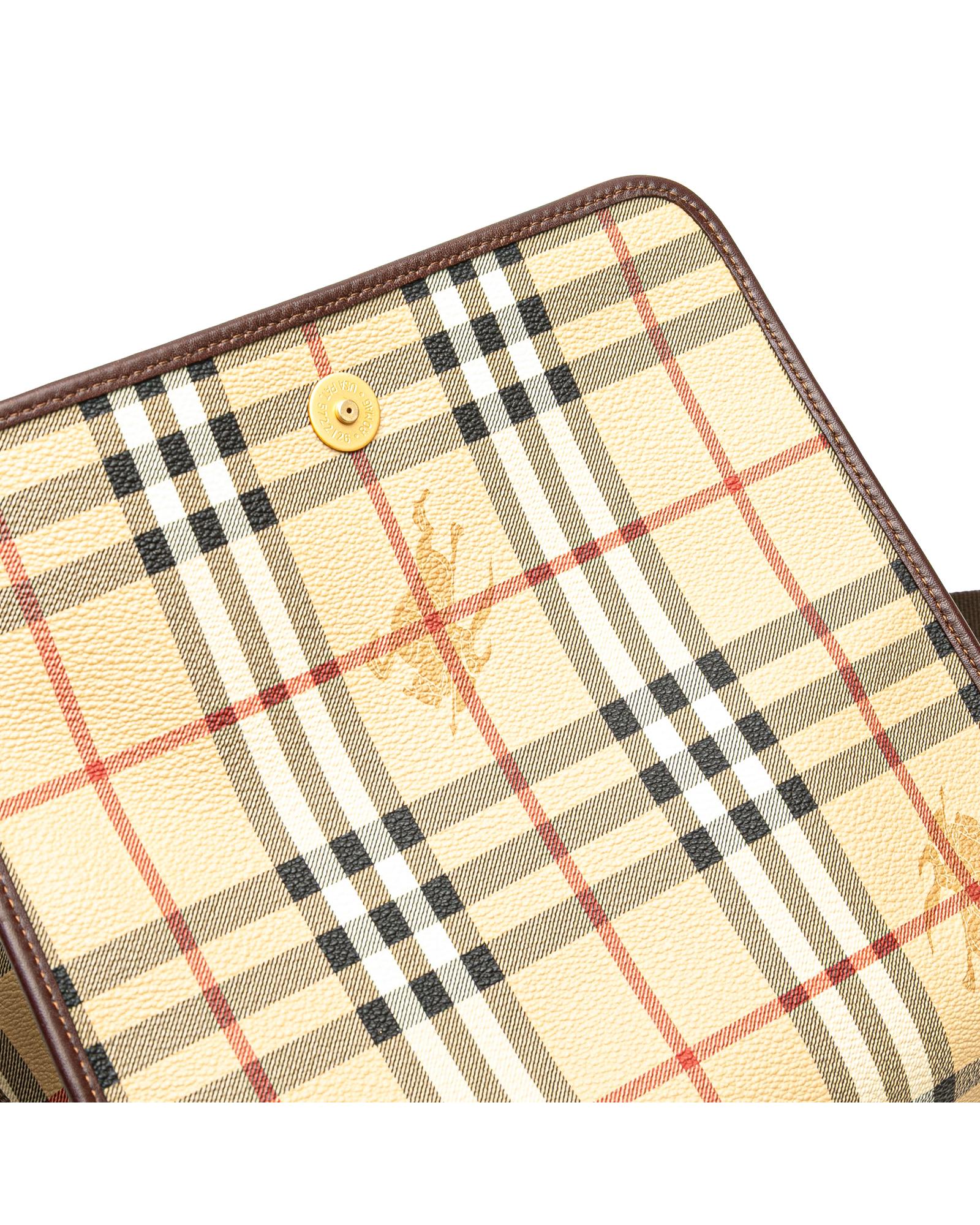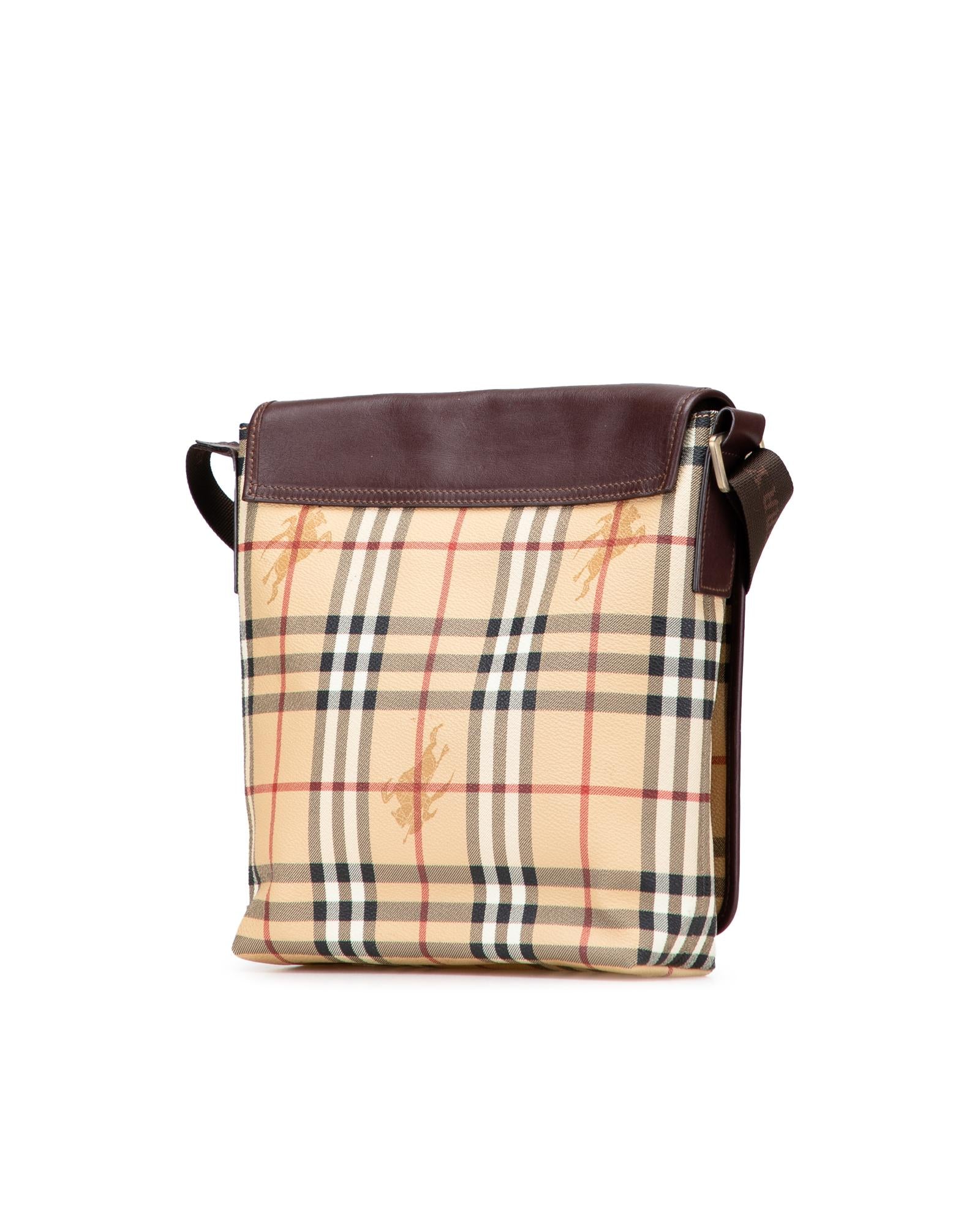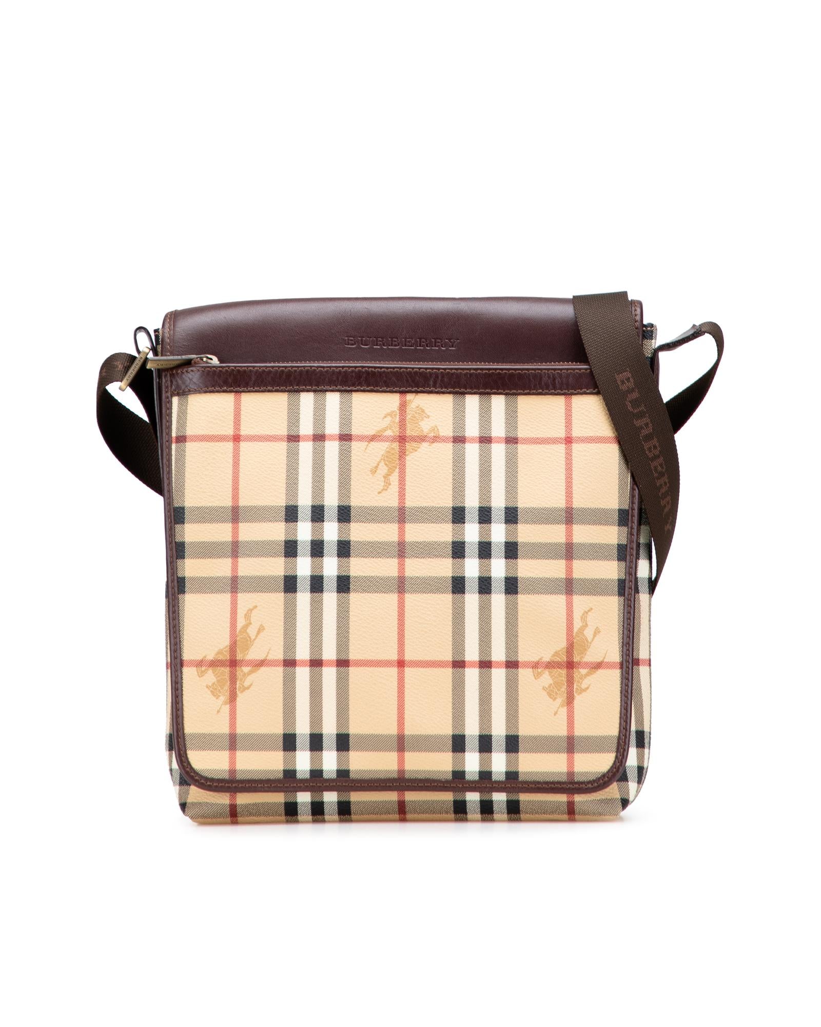 This crossbody bag features a haymarket check coated canvas body with leather trim an adjustable flat strap a flap with zip pocket and magnetic snap closure and an interior zip pocket.Brand: Burberry Vintage