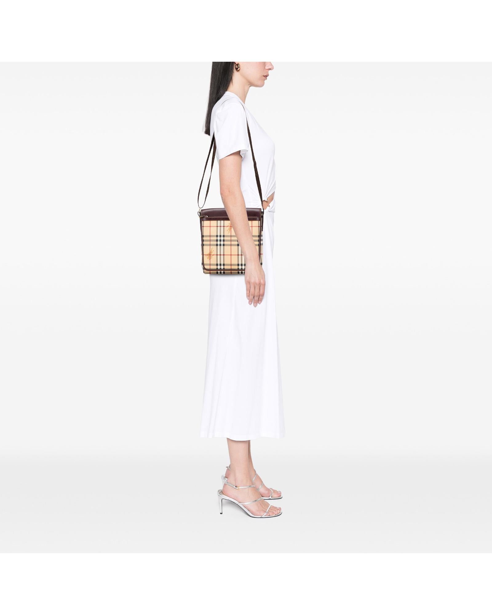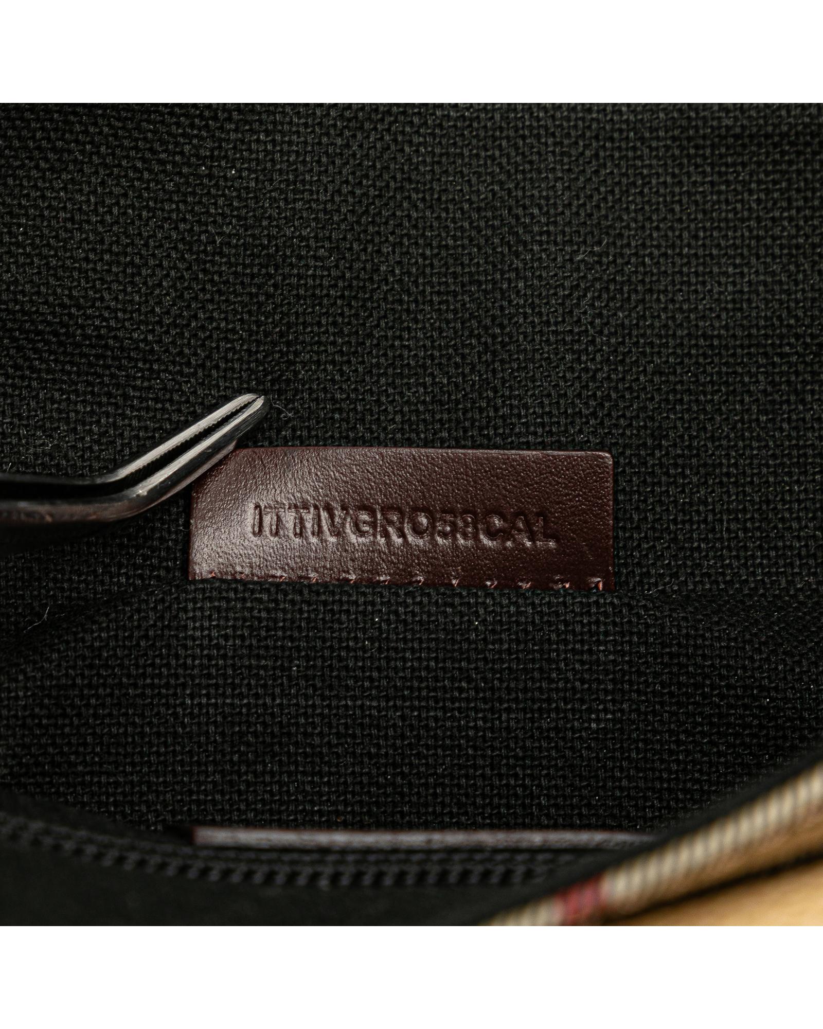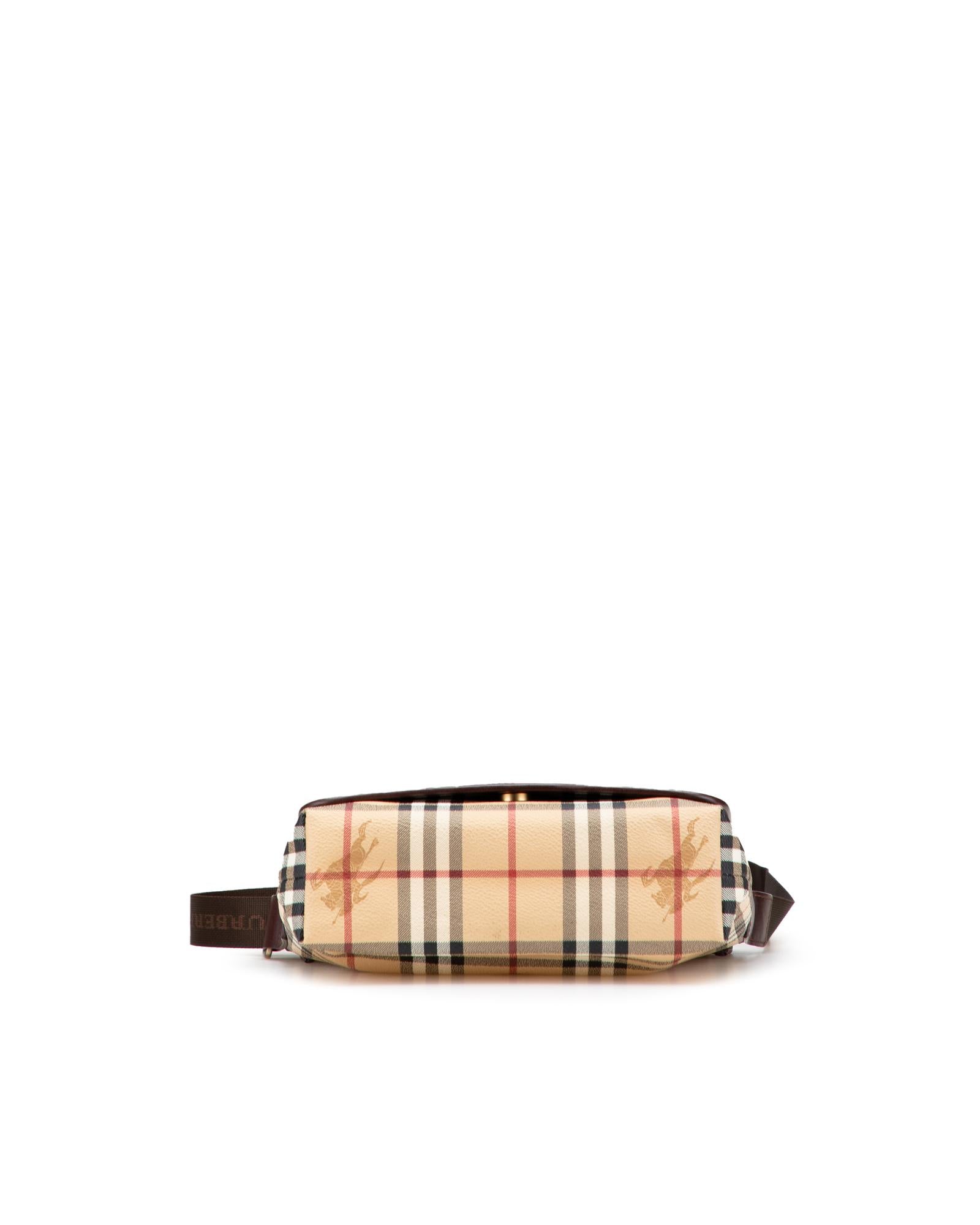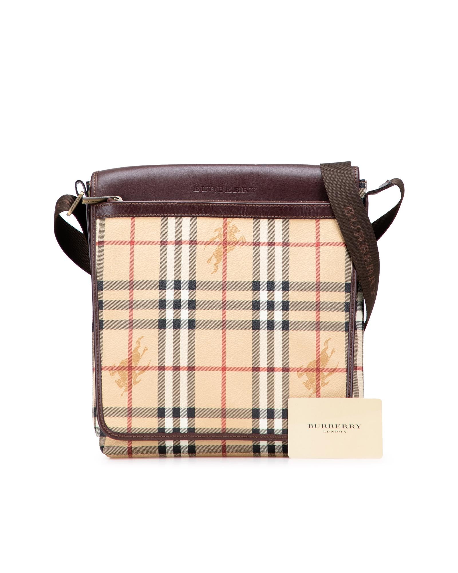This crossbody bag features a haymarket check coated canvas body with leather trim an adjustable flat strap a flap with zip pocket and magnetic snap closure and an interior zip pocket.Brand: Burberry Vintage