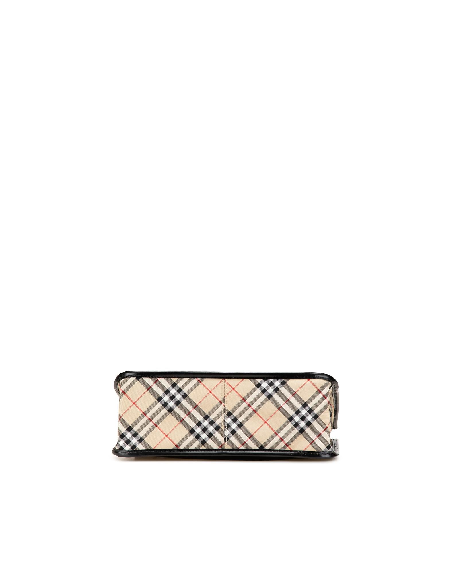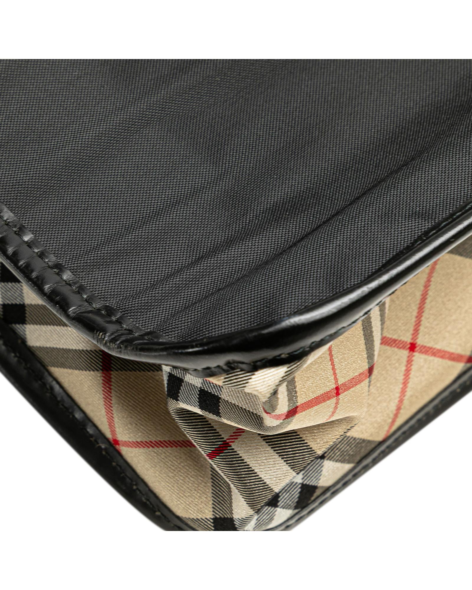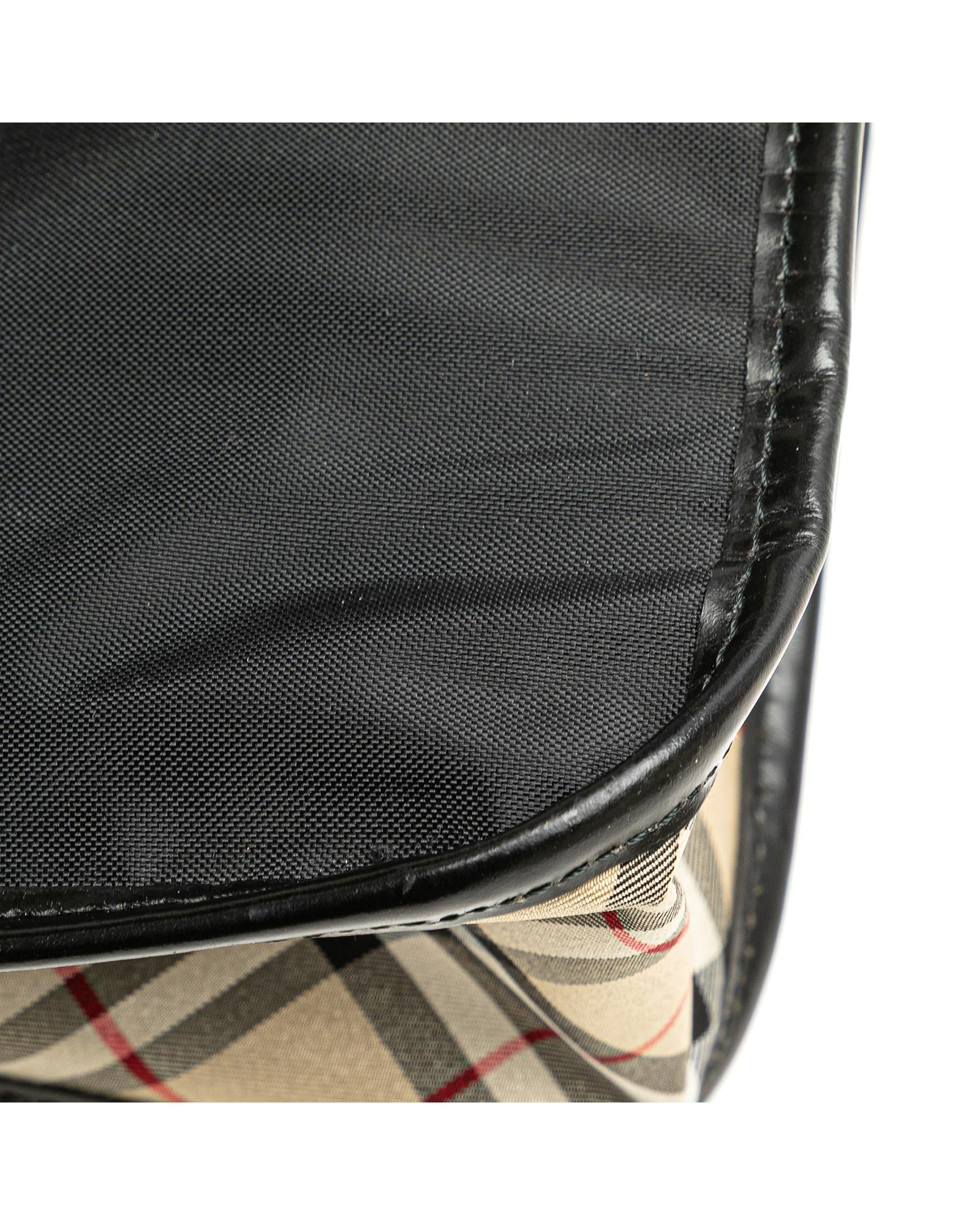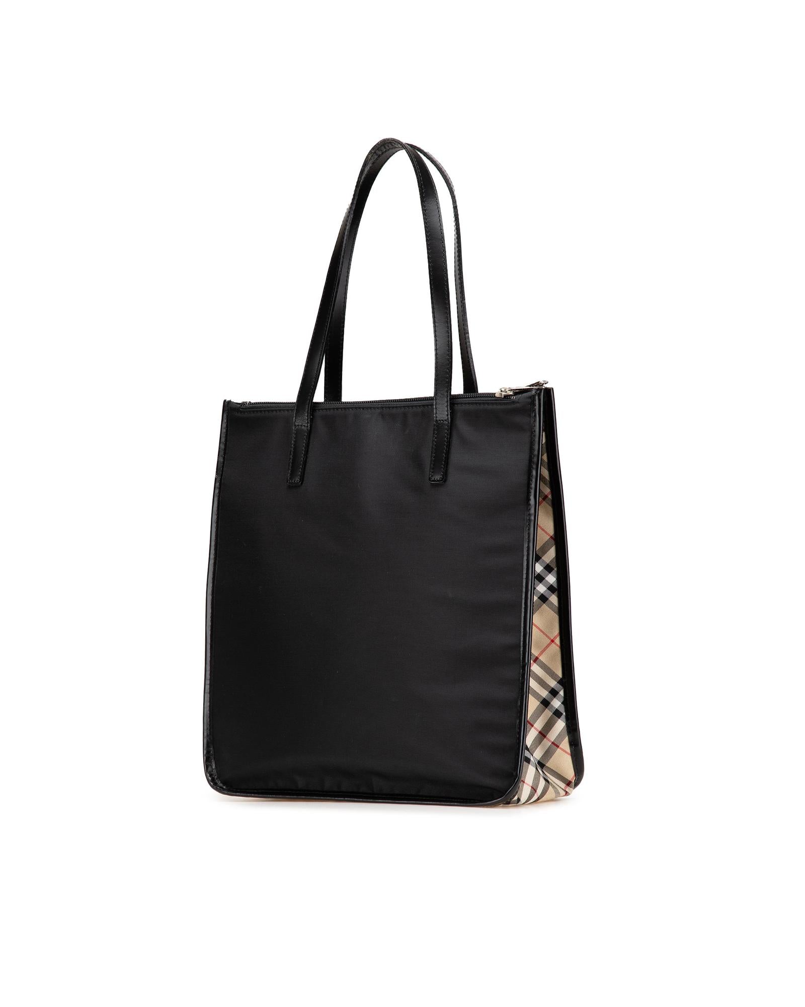 This tote bag features a nylon body with leather trim and nova check canvas side panels flat leather straps an open top with magnetic snap closure and an interior zip pocket.Brand: Burberry