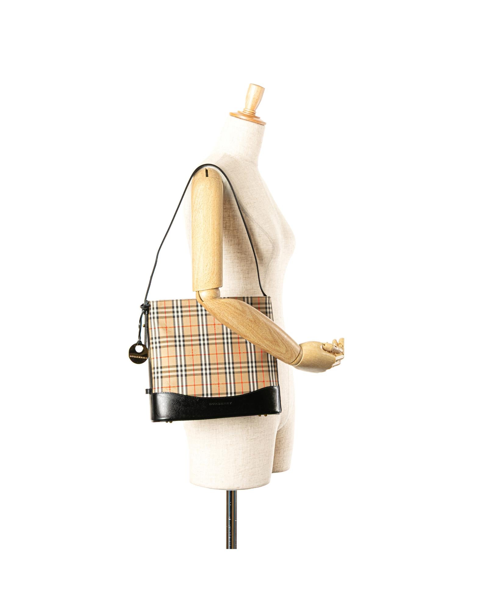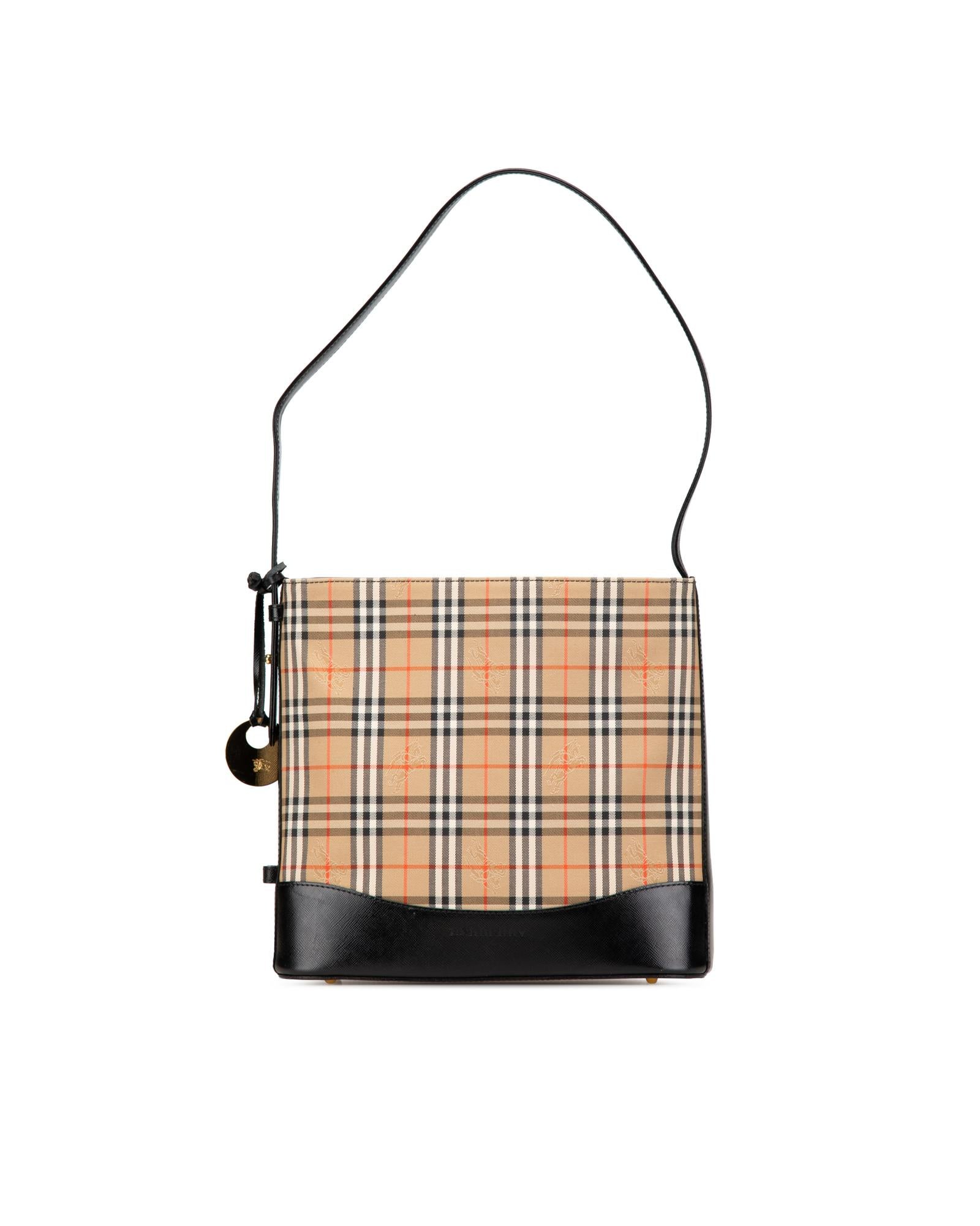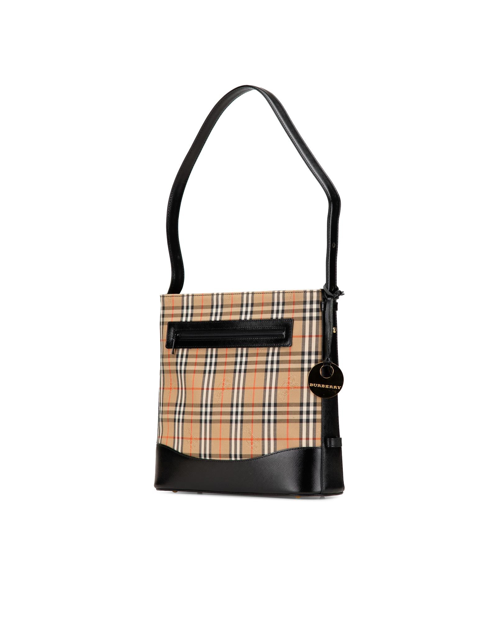 This shoulder bag features a haymarket check canvas body with leather trim a flat leather strap an open top with magnetic snap closure an exterior zip pocket and interior zip and slip pockets.Brand: Burberry