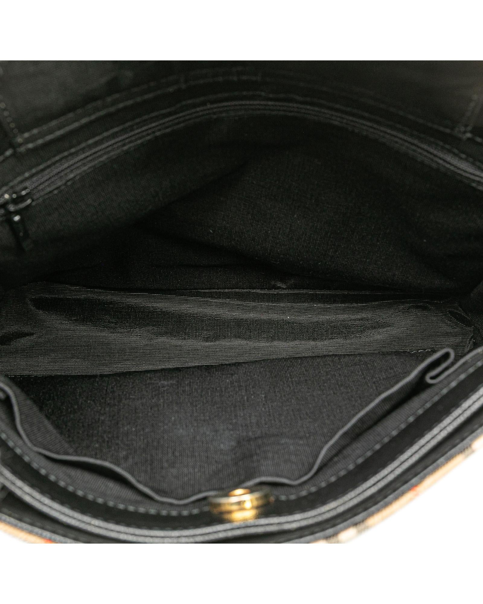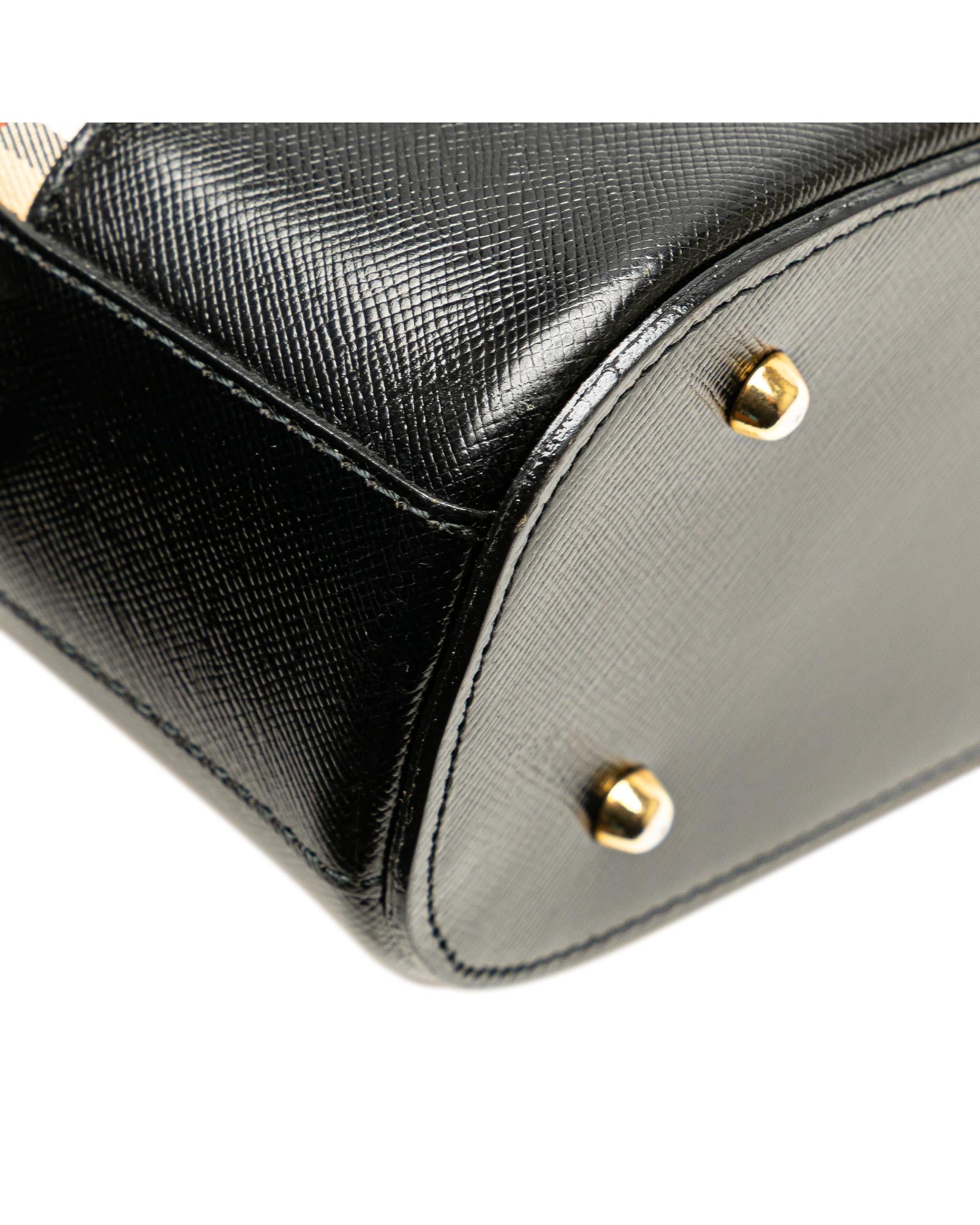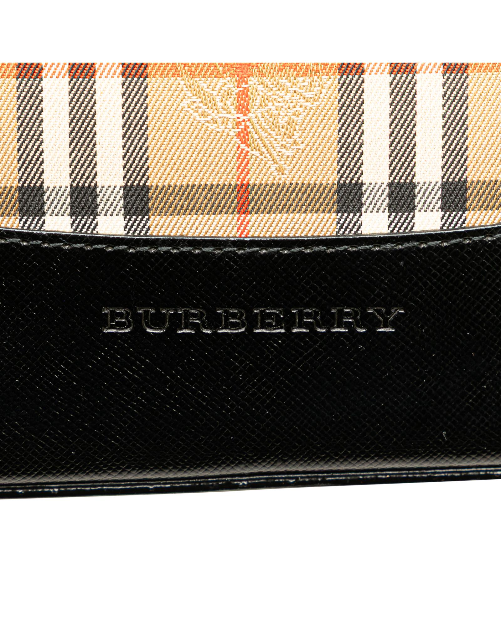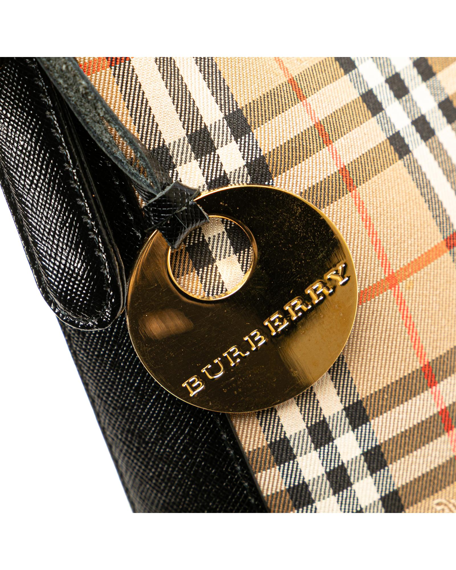 This shoulder bag features a haymarket check canvas body with leather trim a flat leather strap an open top with magnetic snap closure an exterior zip pocket and interior zip and slip pockets.Brand: Burberry