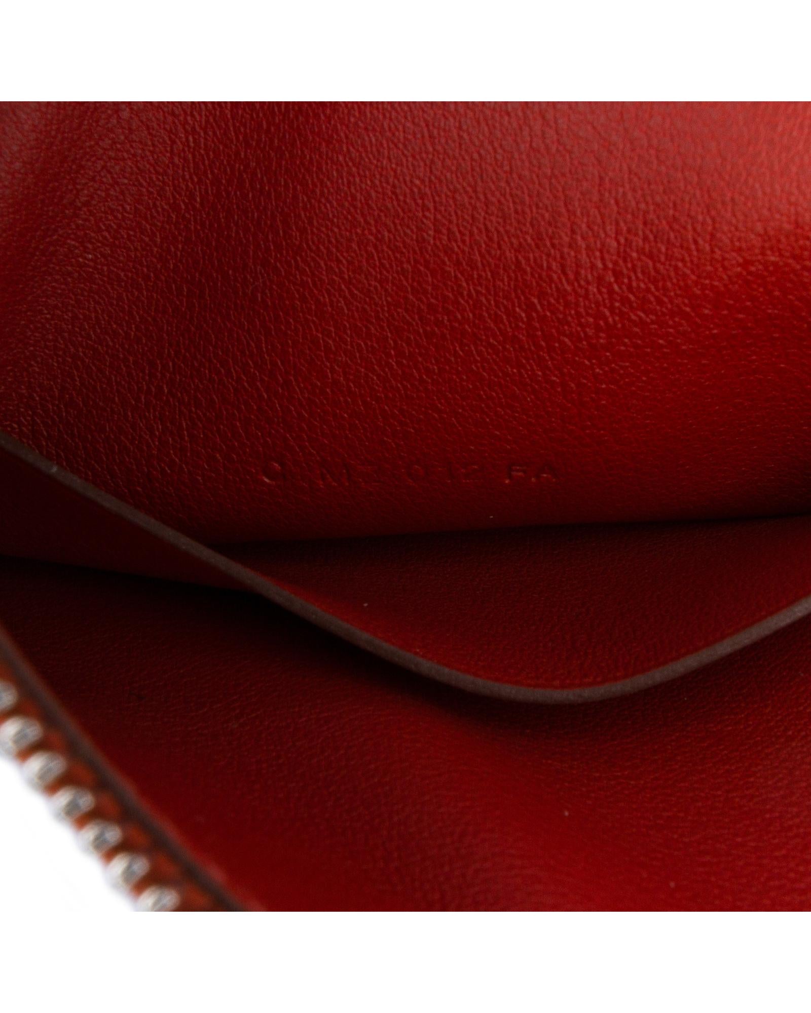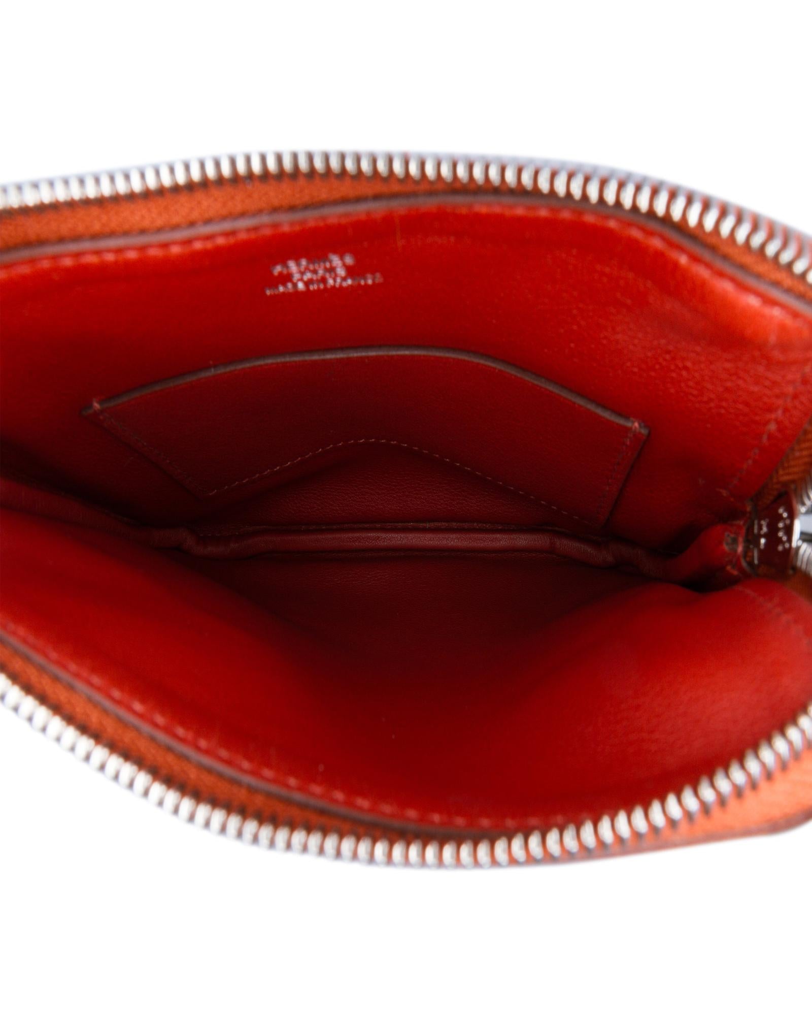 This pouch features a leather body a top zip closure and an interior slip pocket.