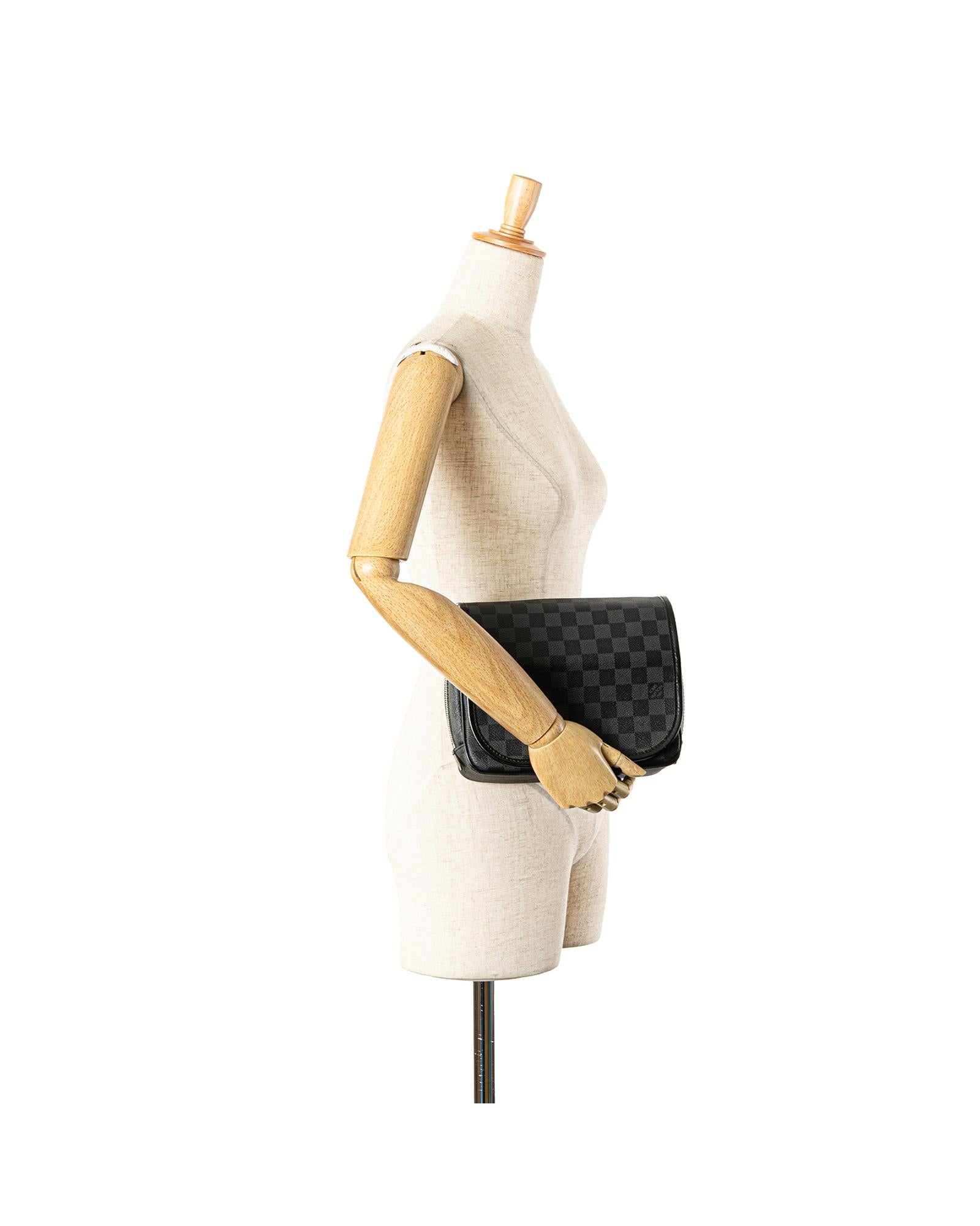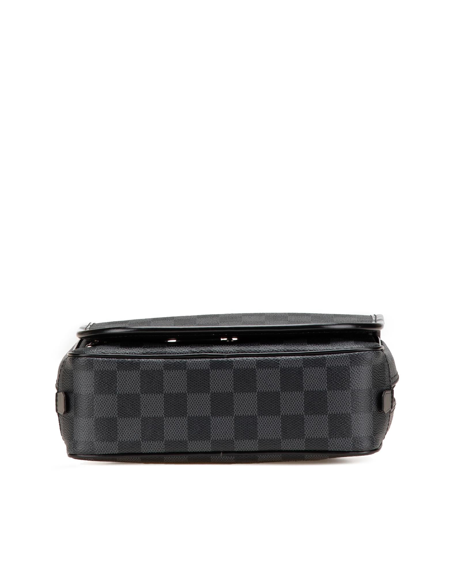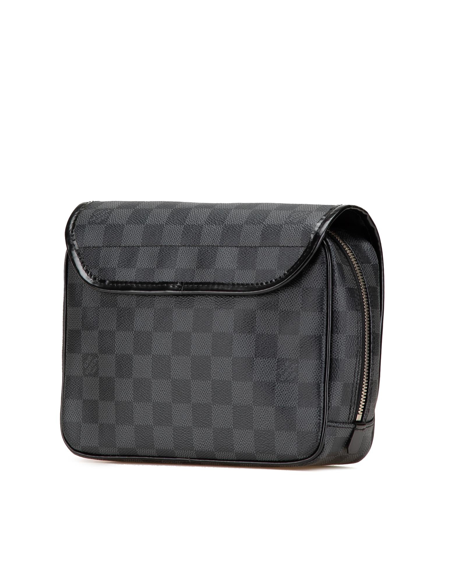 This pouch features a damier graphite canvas body a front flap with snap button closure a top zip closure a back swivel hook and interior slip pockets.Brand: Louis Vuitton