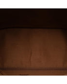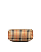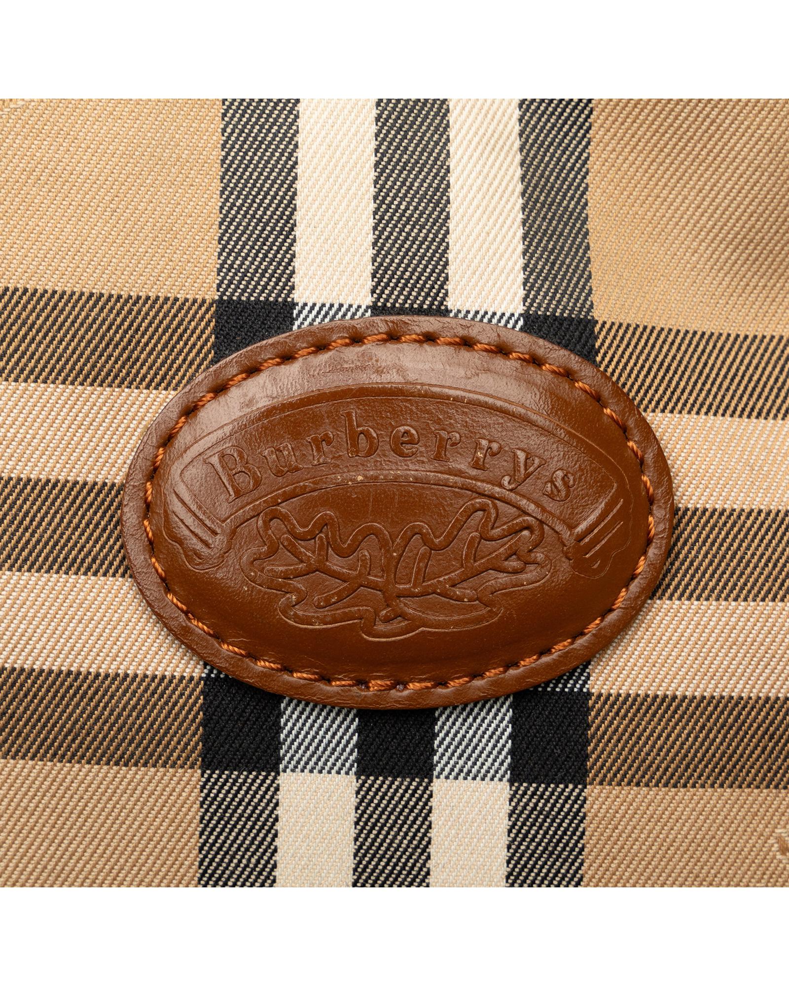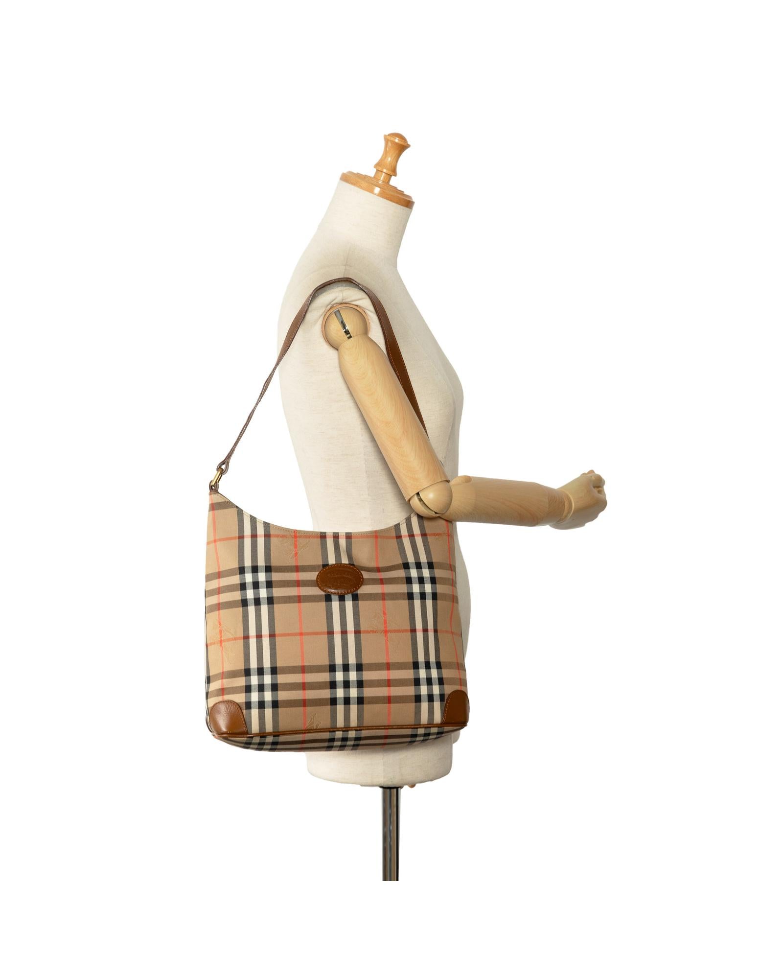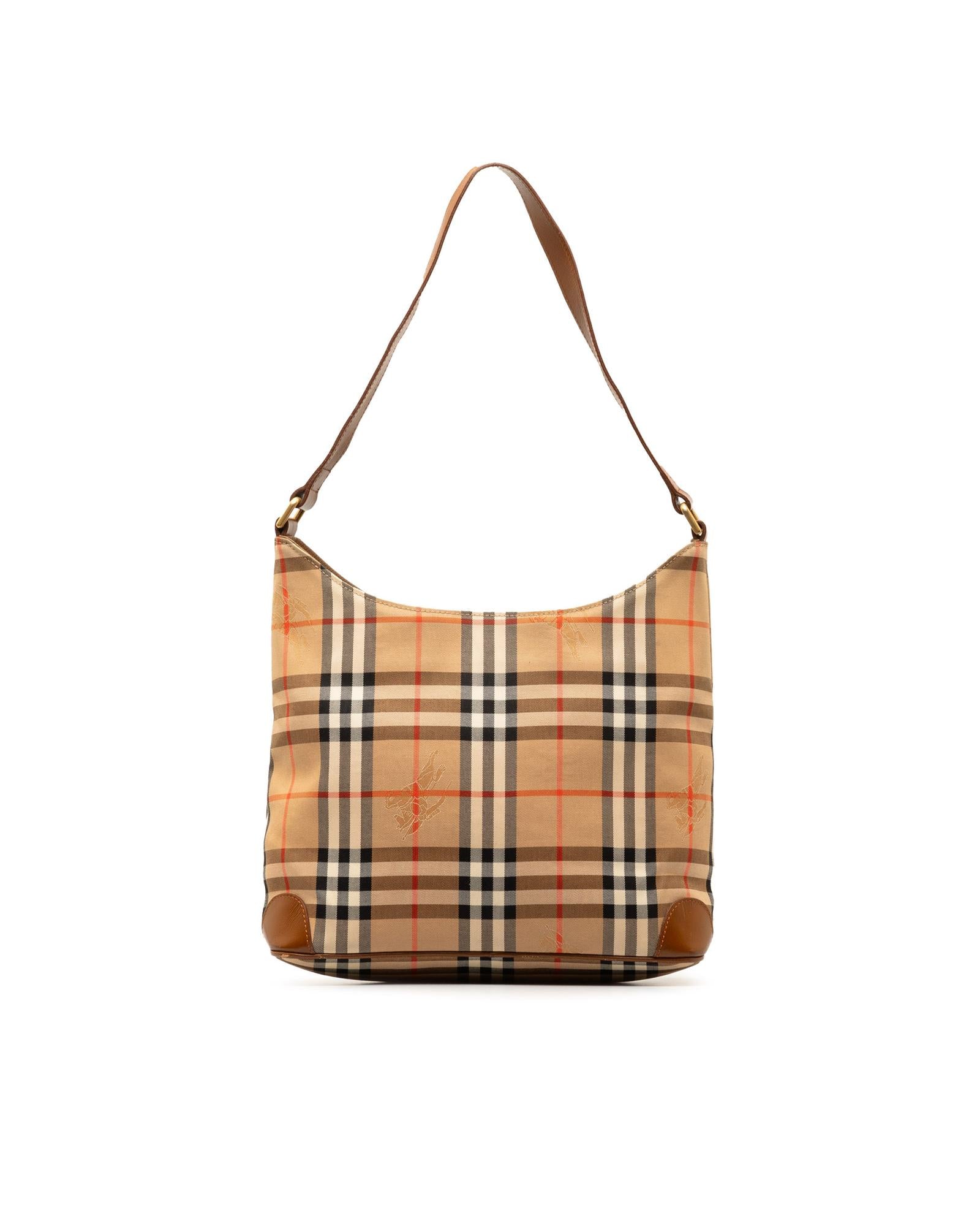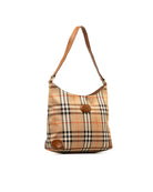 This shoulder bag features a canvas body with leather trim a flat leather strap a top zip closure and interior zip and slip pockets.