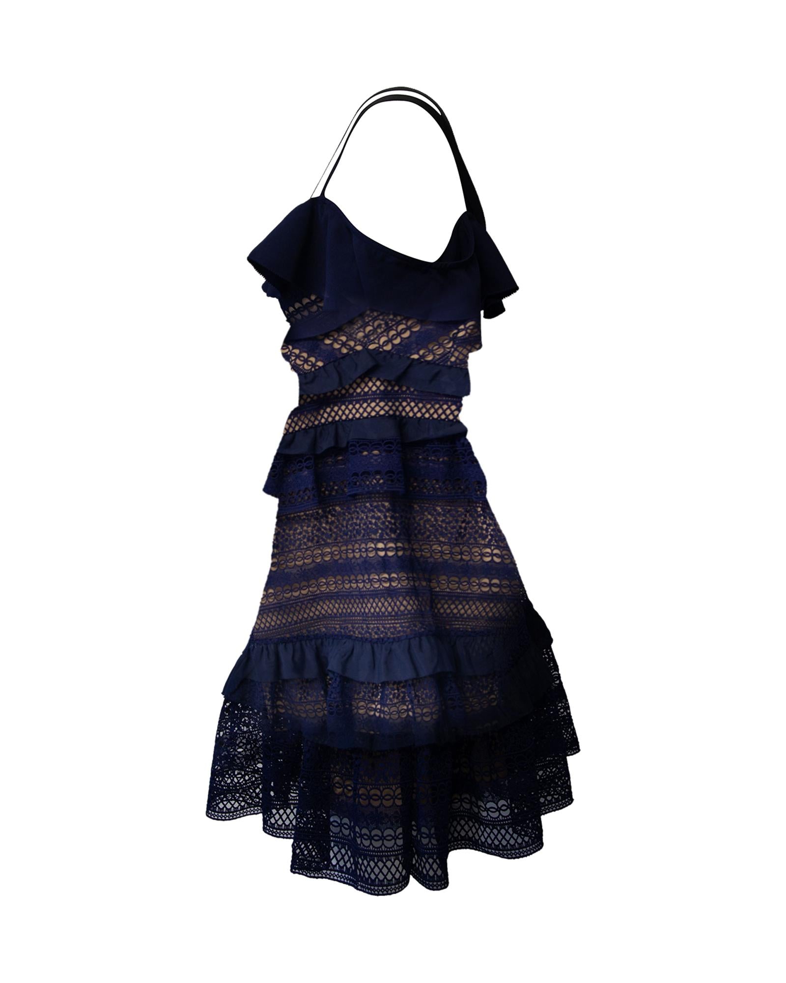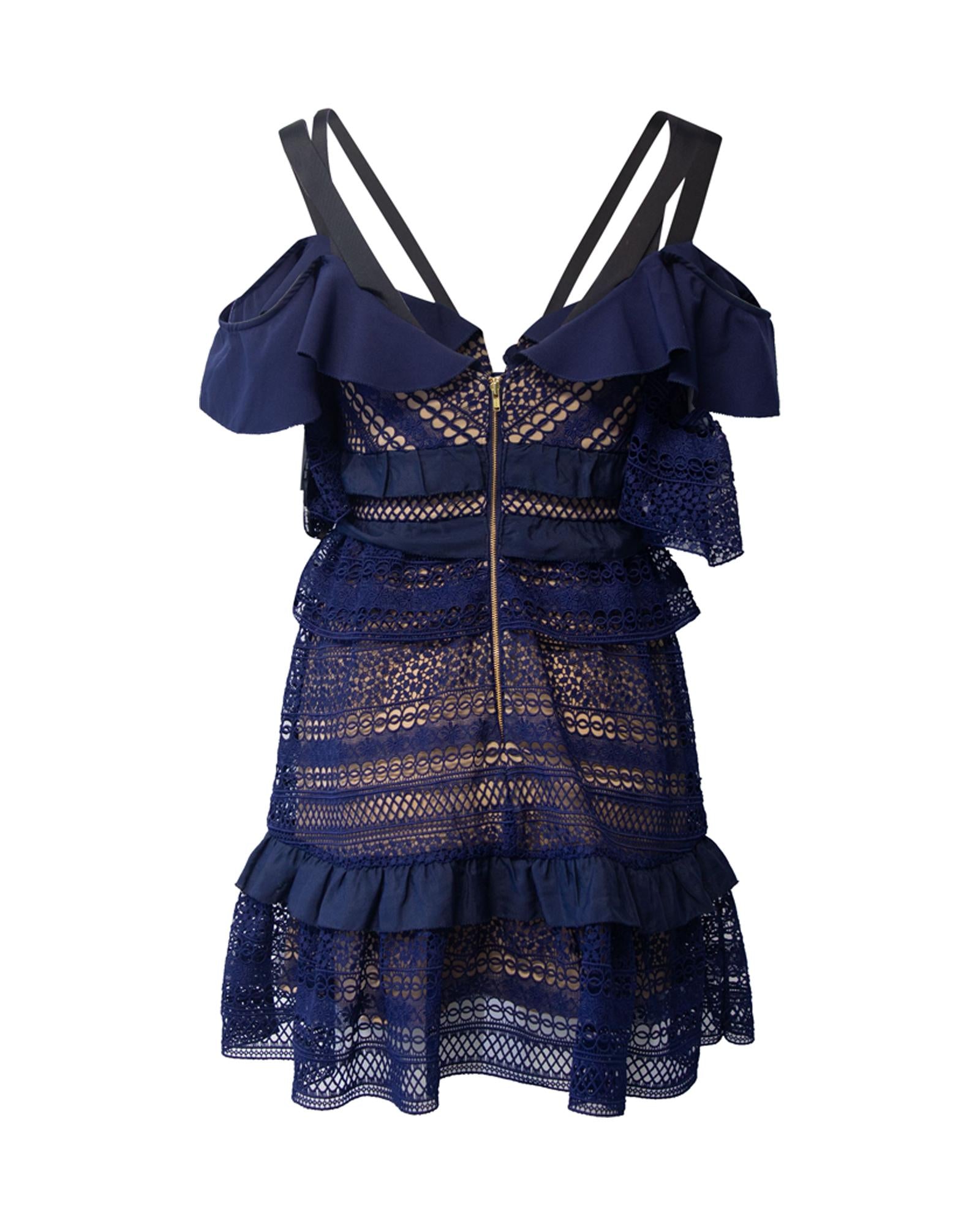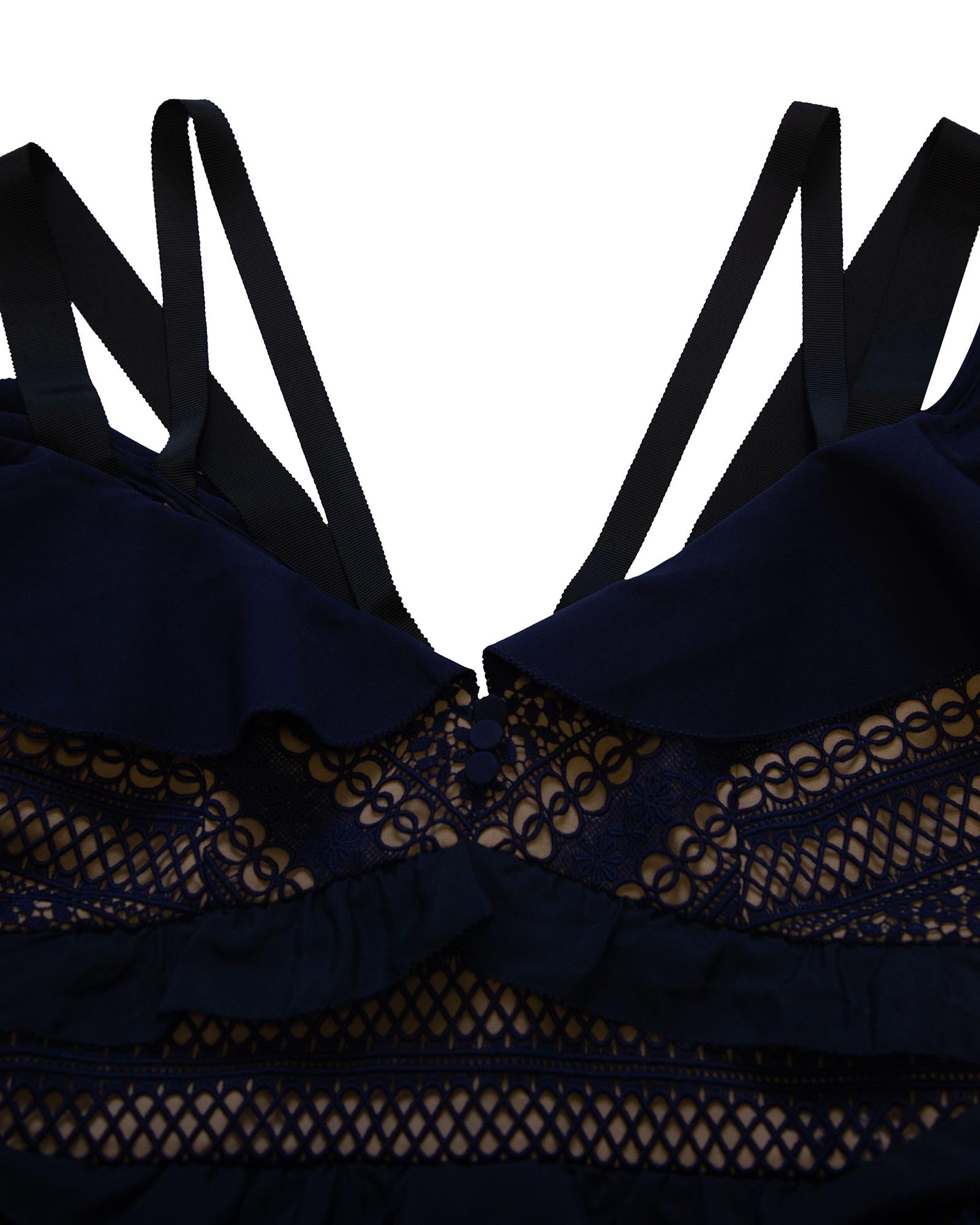 • Portrait Flounced Lace Mini Dress in Navy Blue Polyester