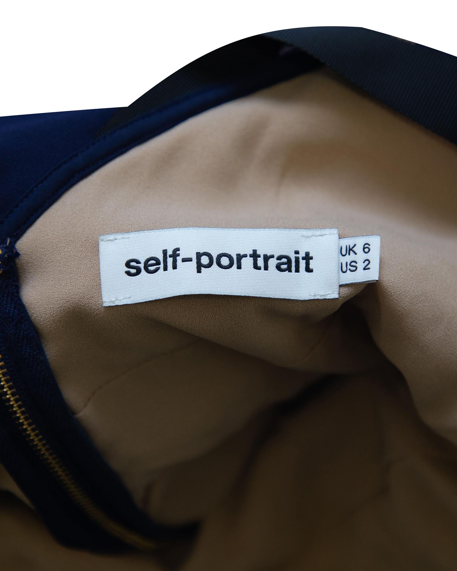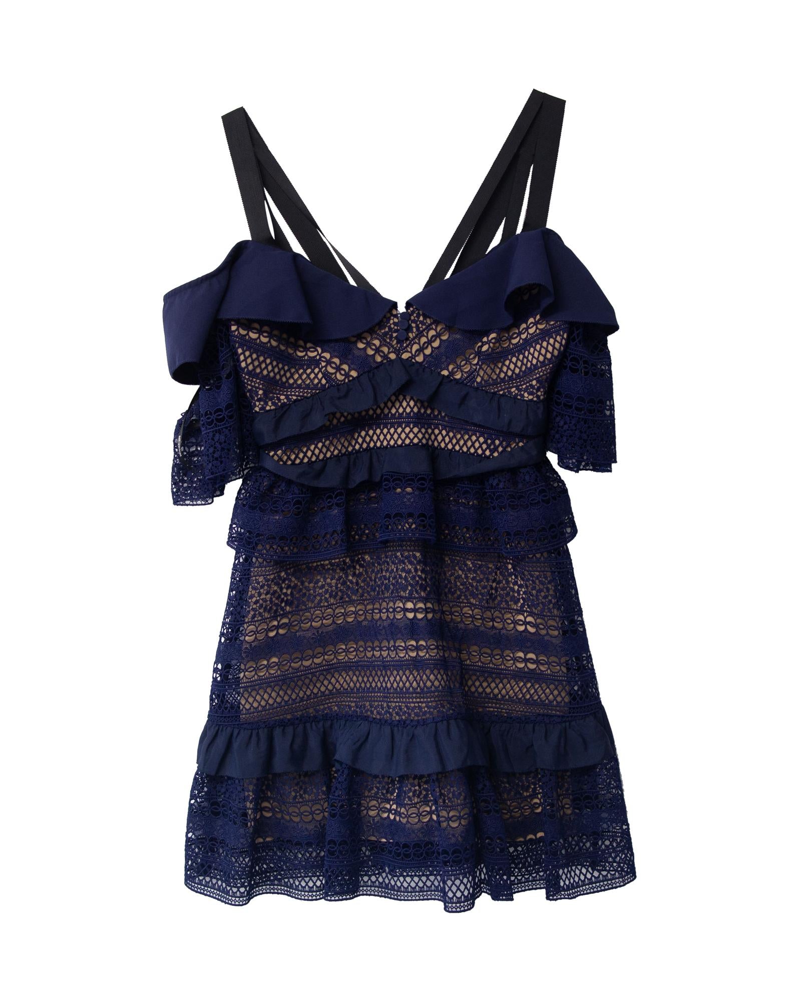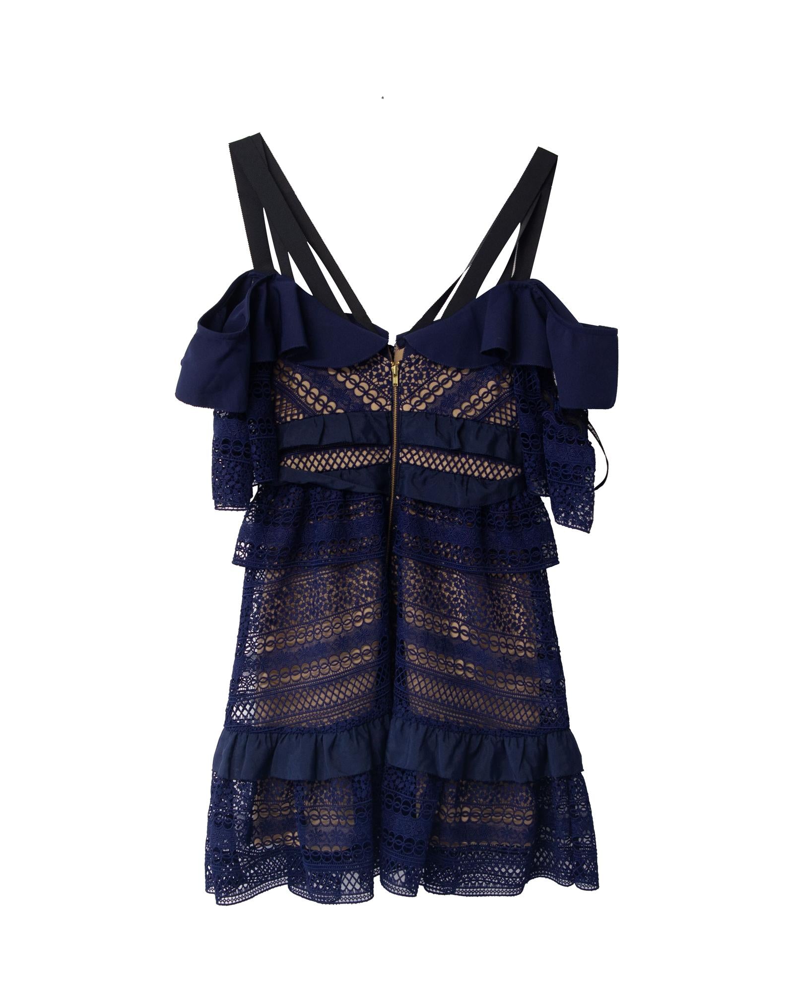 • Portrait Flounced Lace Mini Dress in Navy Blue Polyester