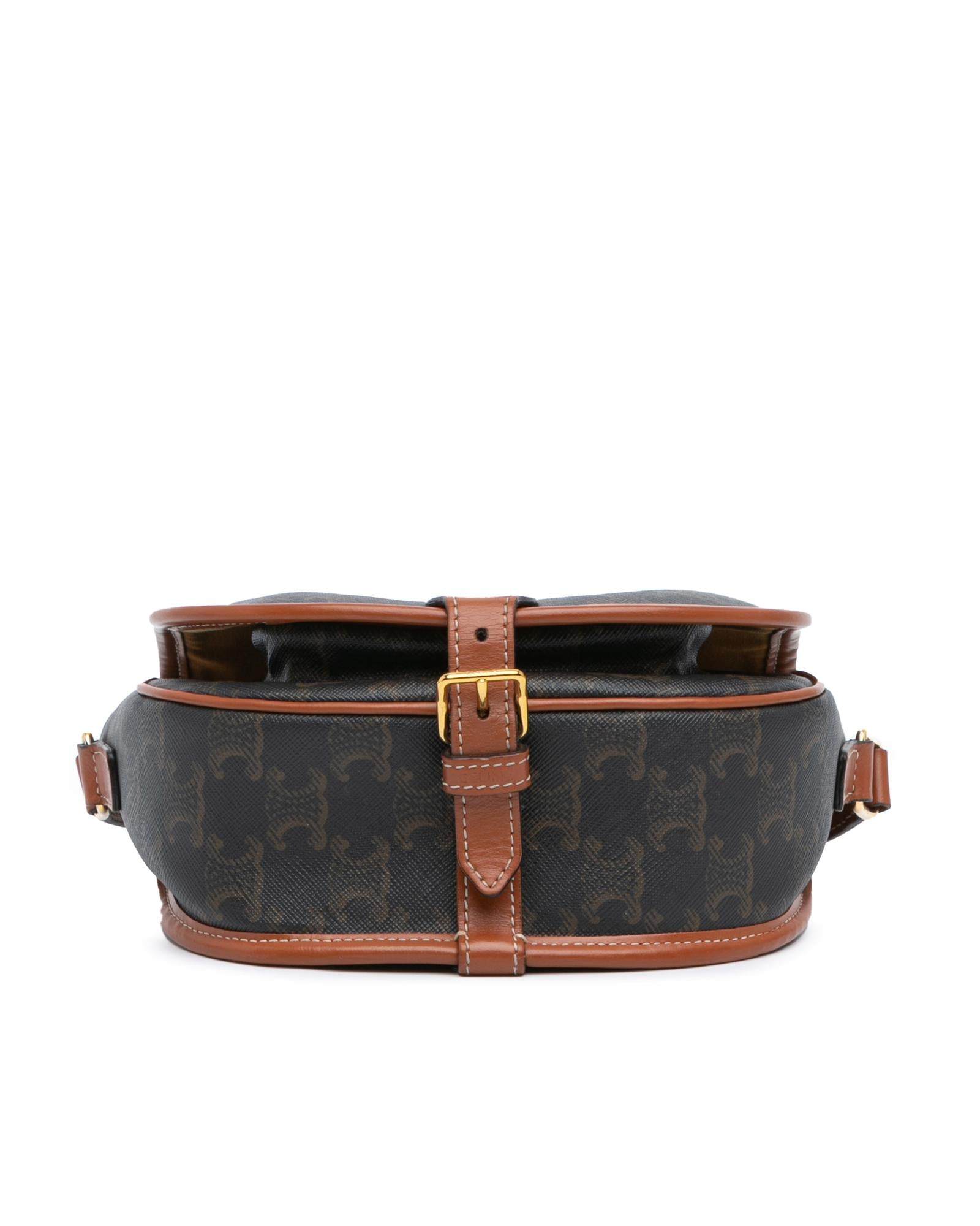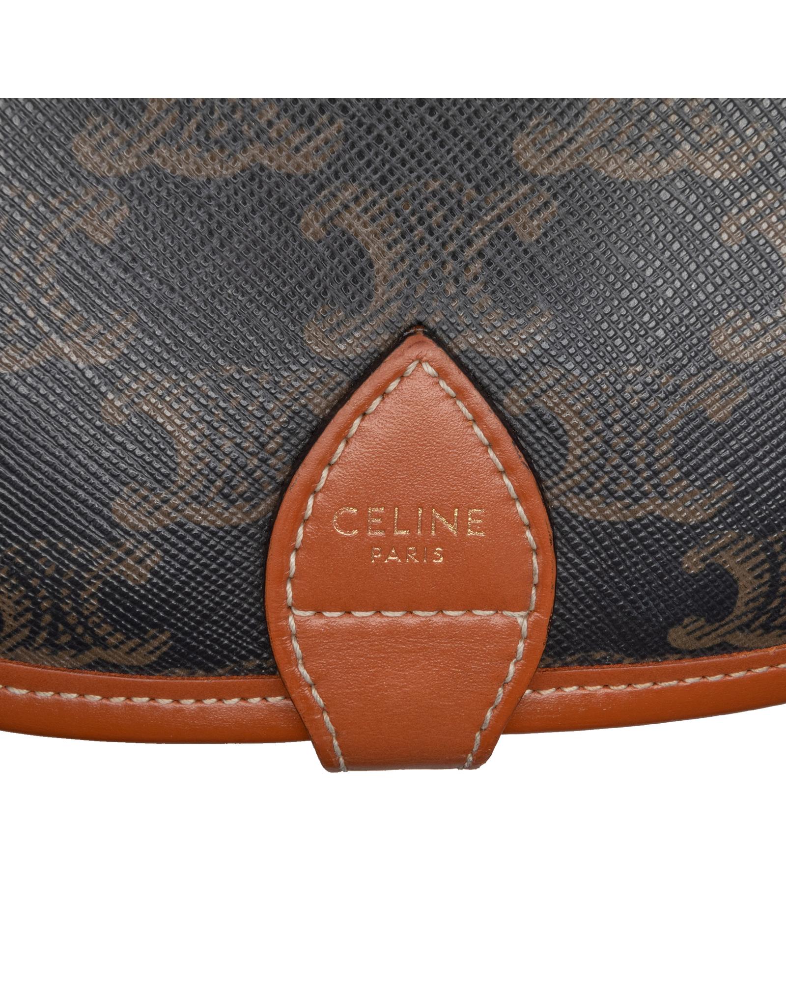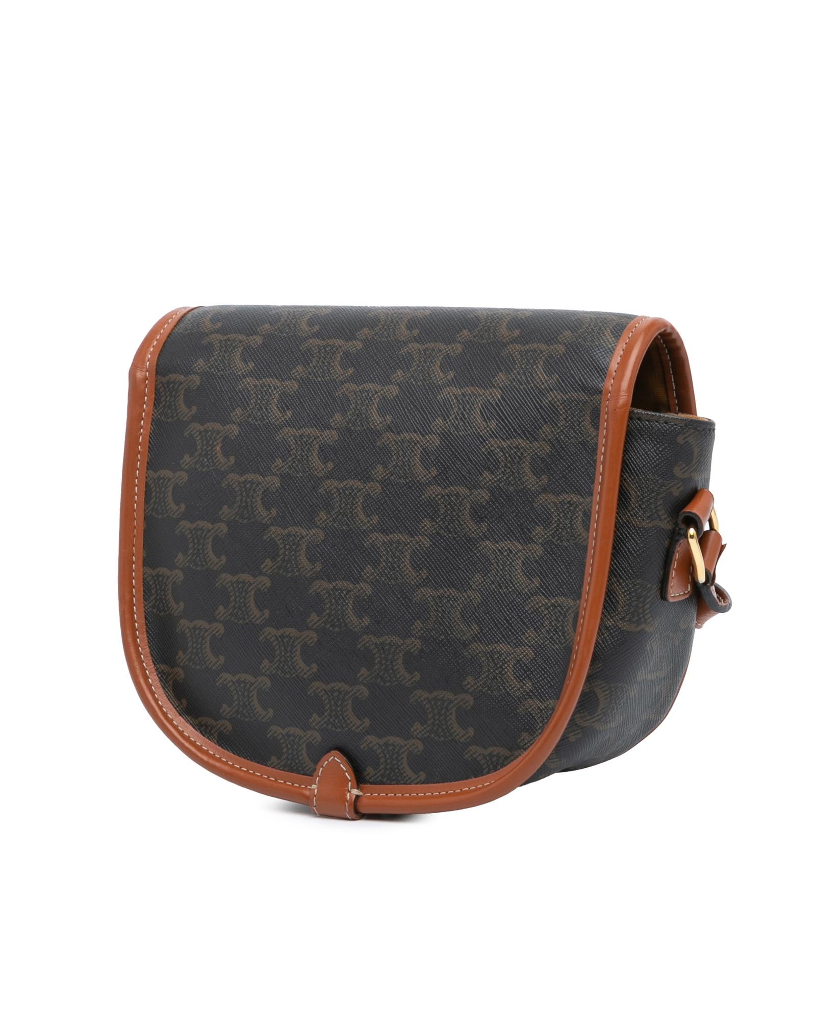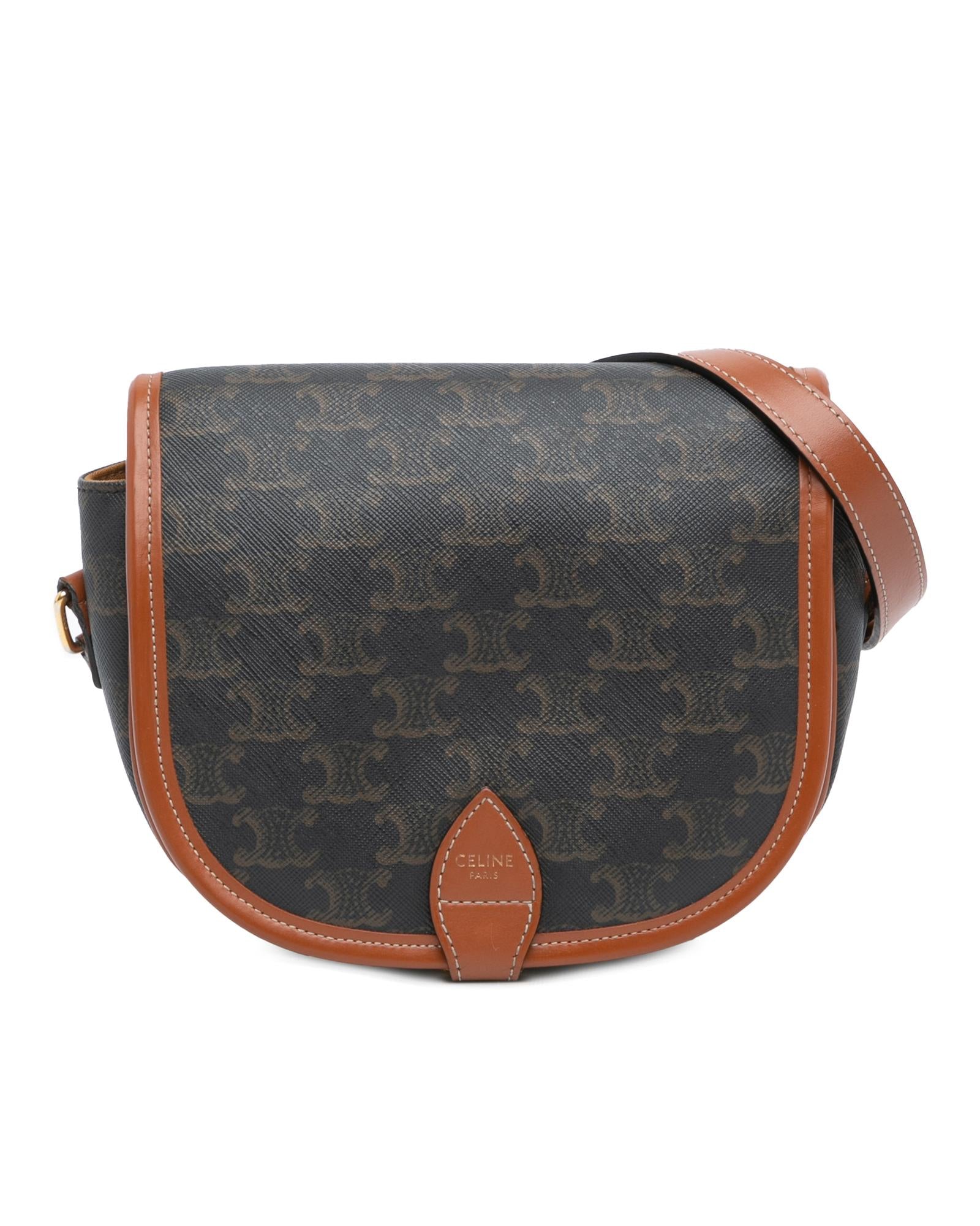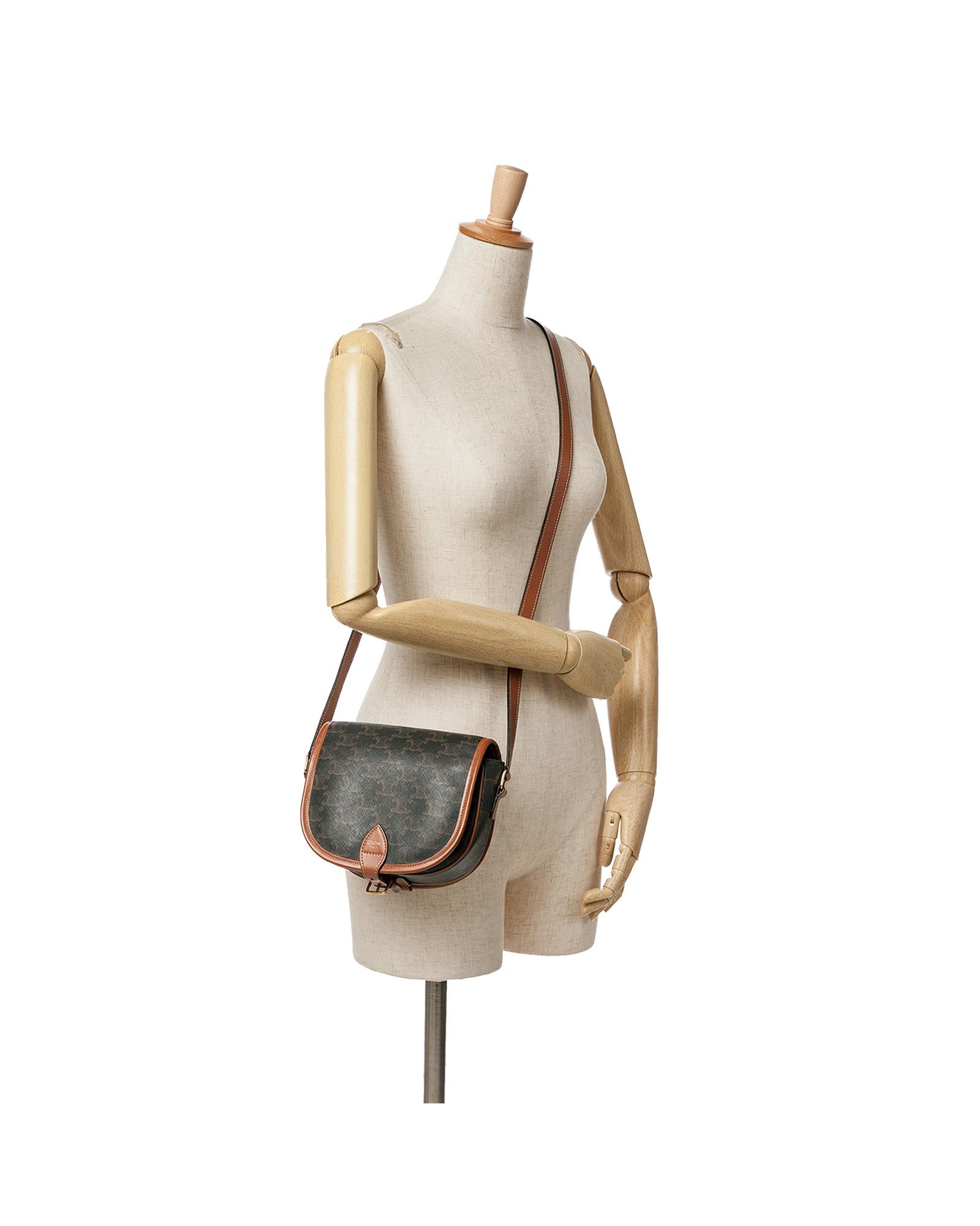 The Folco crossbody bag features a coated canvas body with leather trim a flat leather strap a front flap with a strap and buckle closure an exterior front open pocket and an interior slip pocket.Brand: Celine Vintage