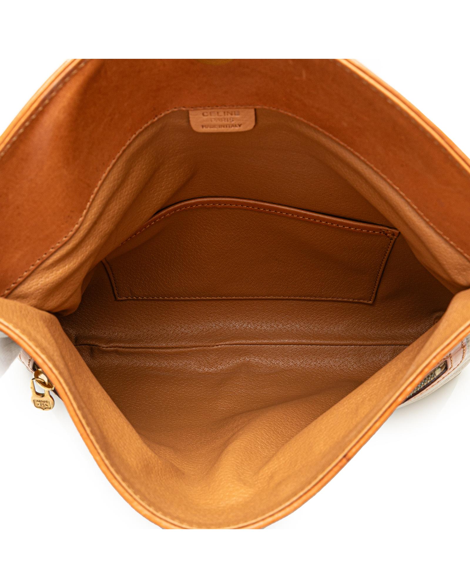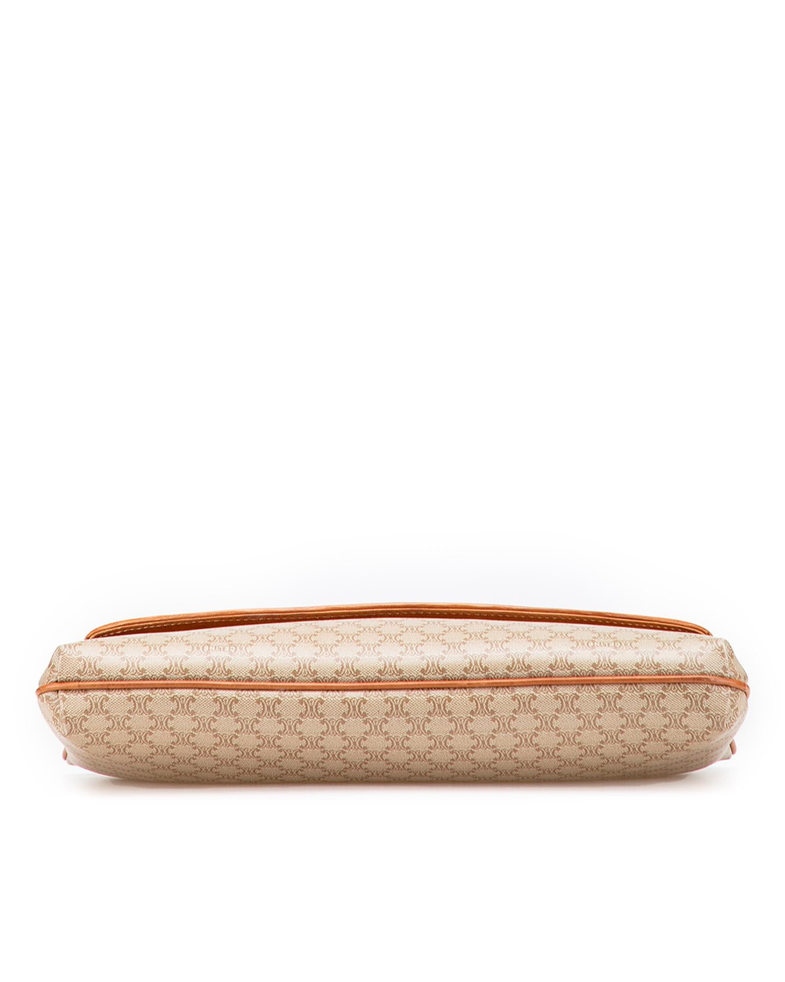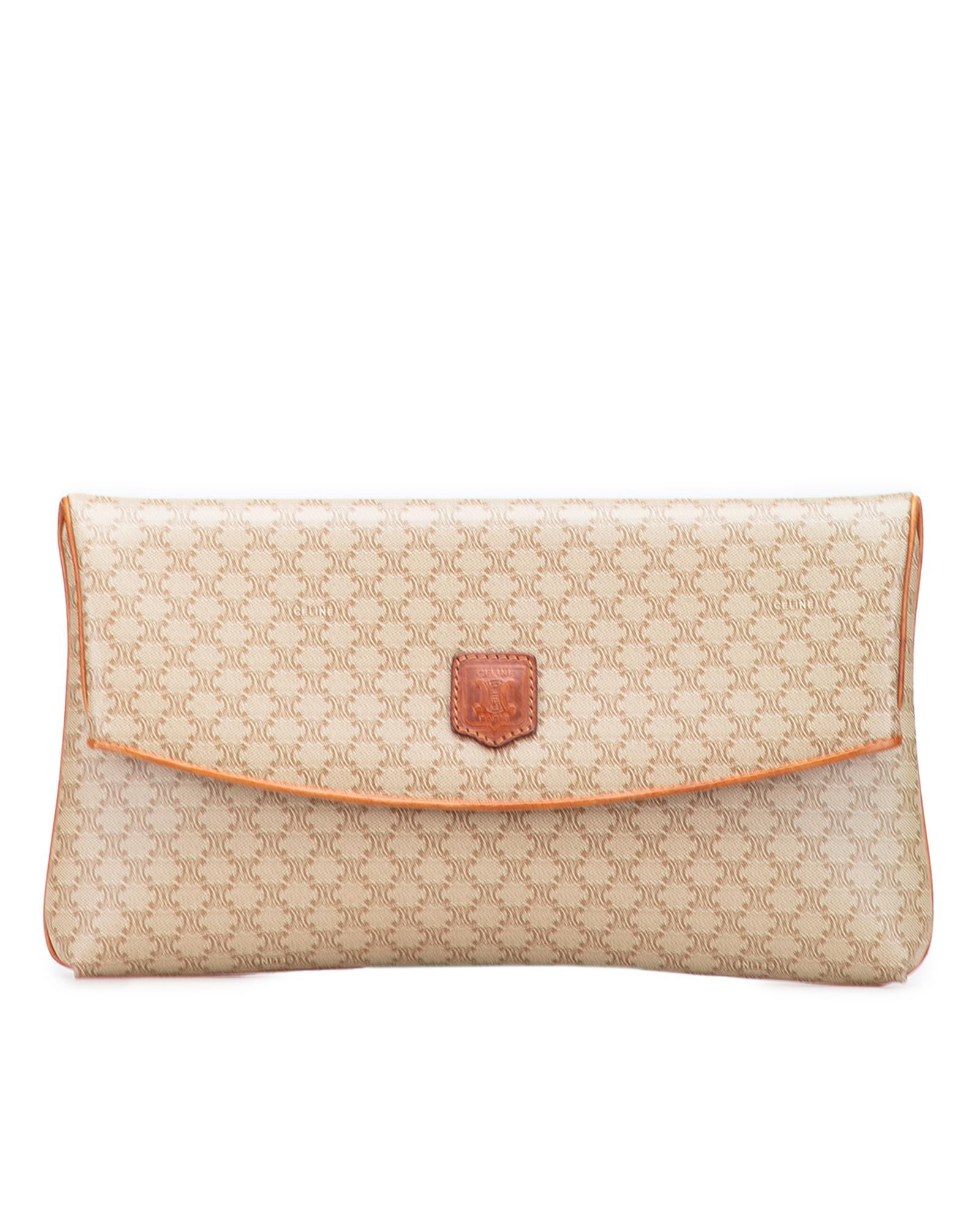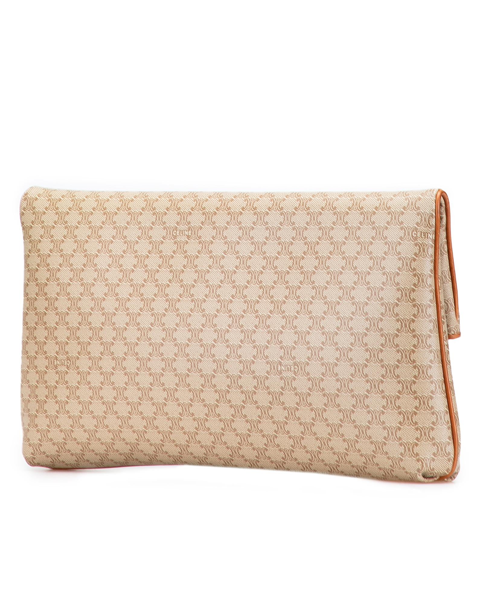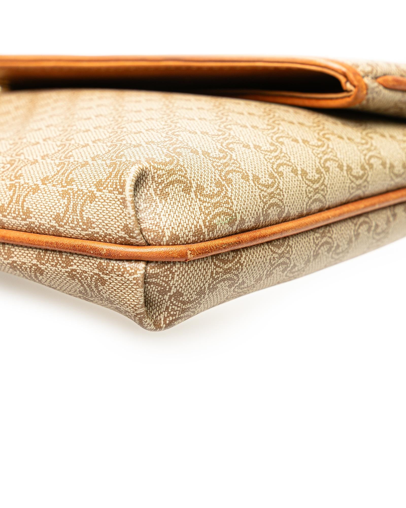 This clutch bag features a coated canvas body with leather trim a fold-over top with magnetic snap closure and an interior slip pocket.Brand: Celine Vintage