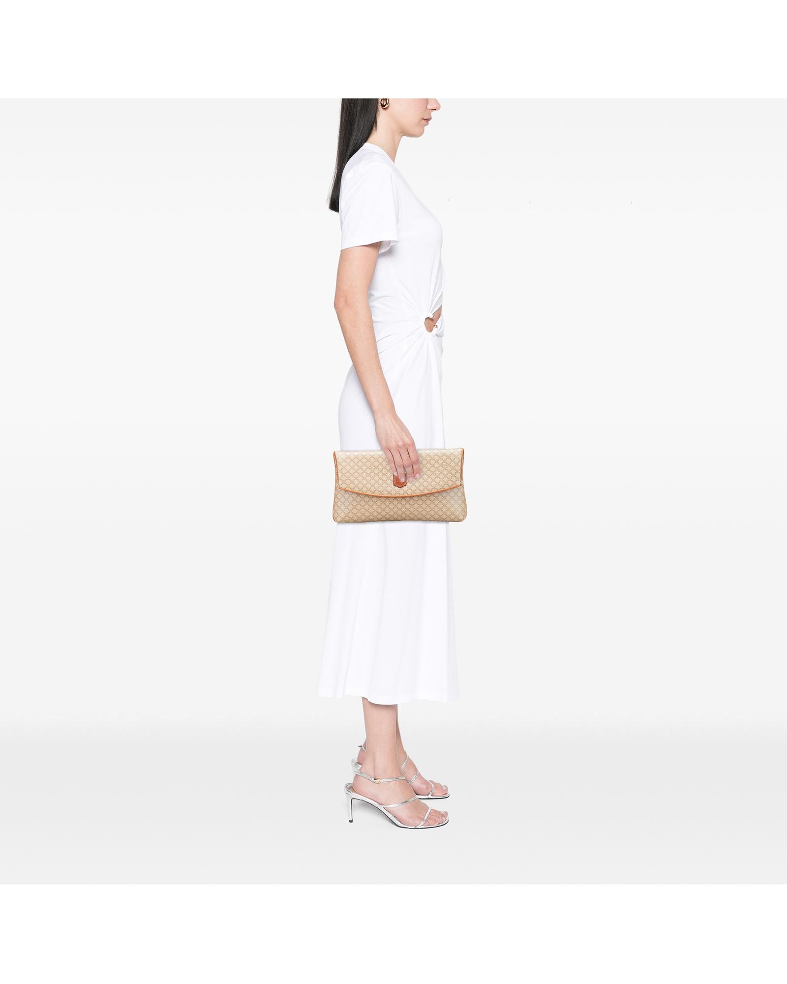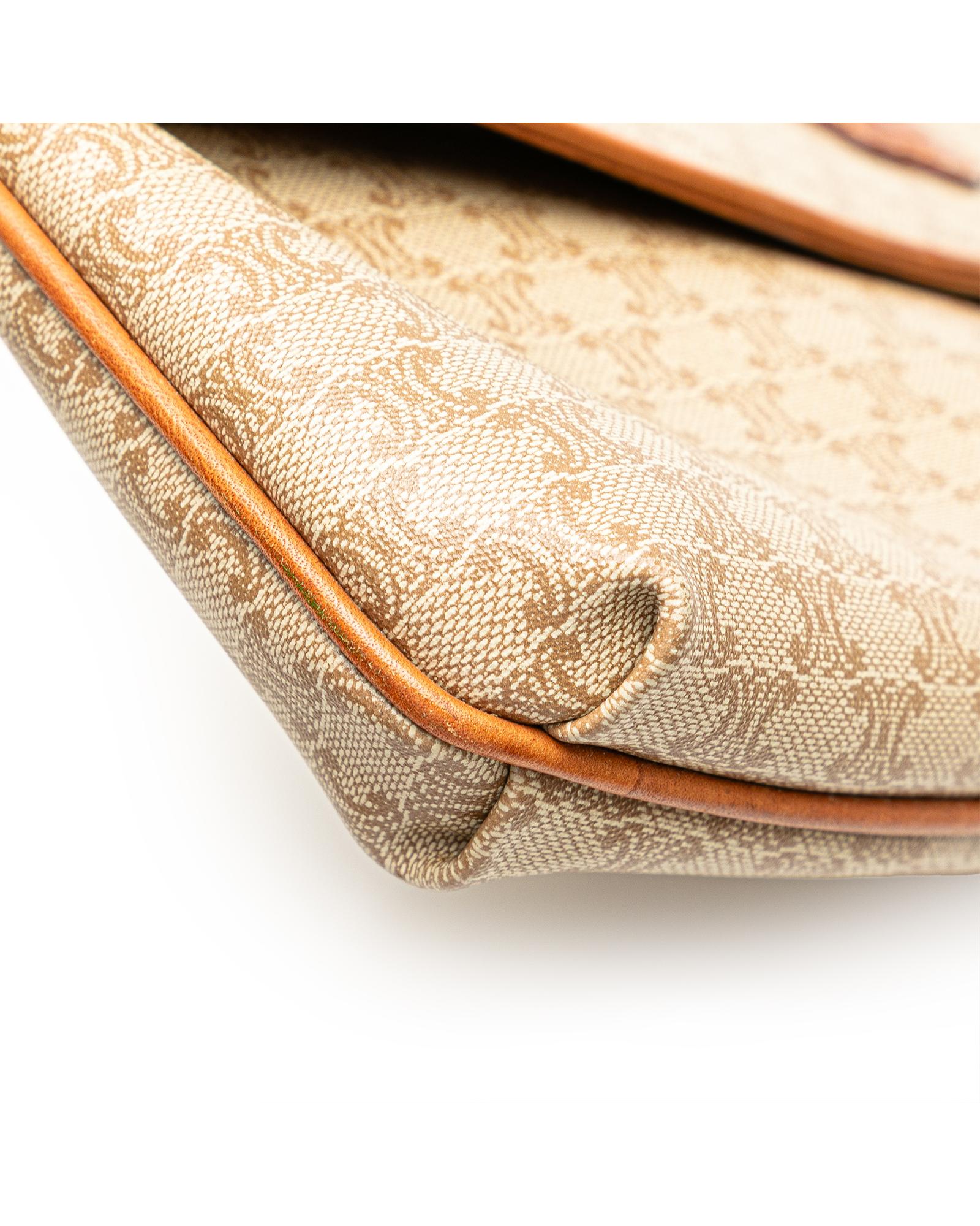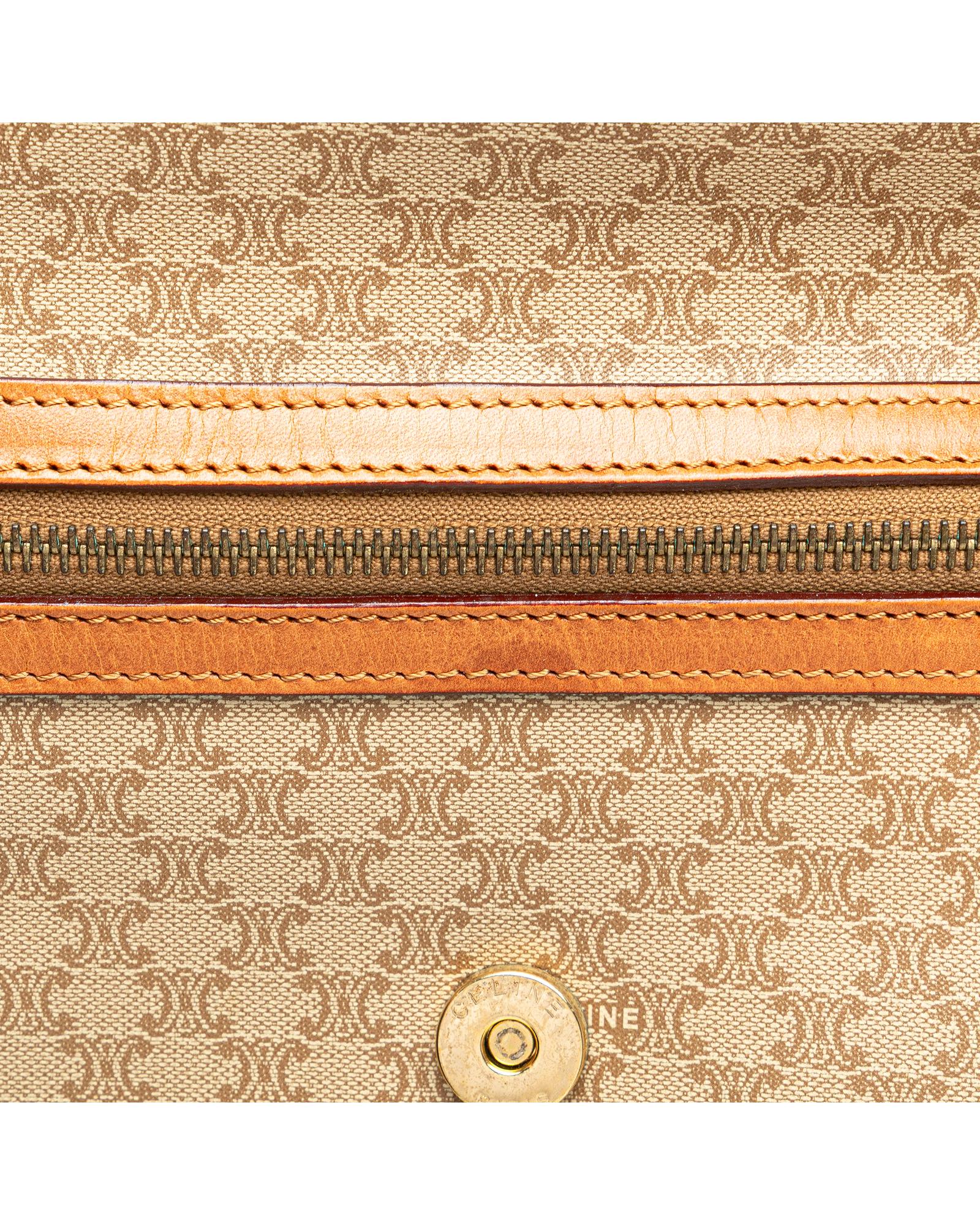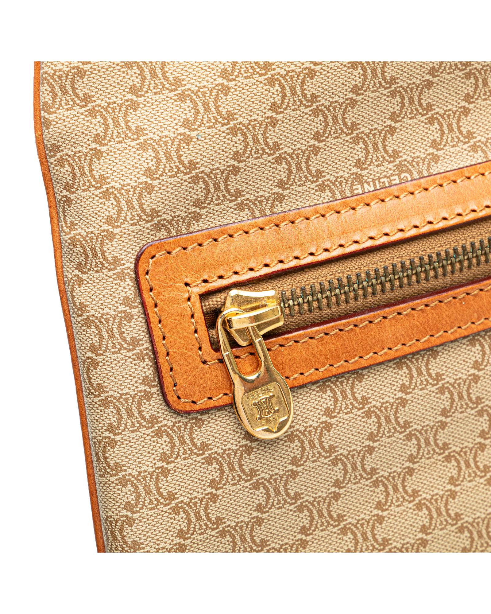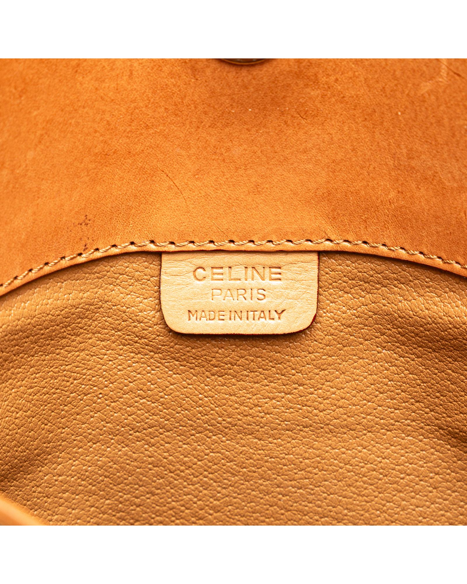 This clutch bag features a coated canvas body with leather trim a fold-over top with magnetic snap closure and an interior slip pocket.Brand: Celine Vintage