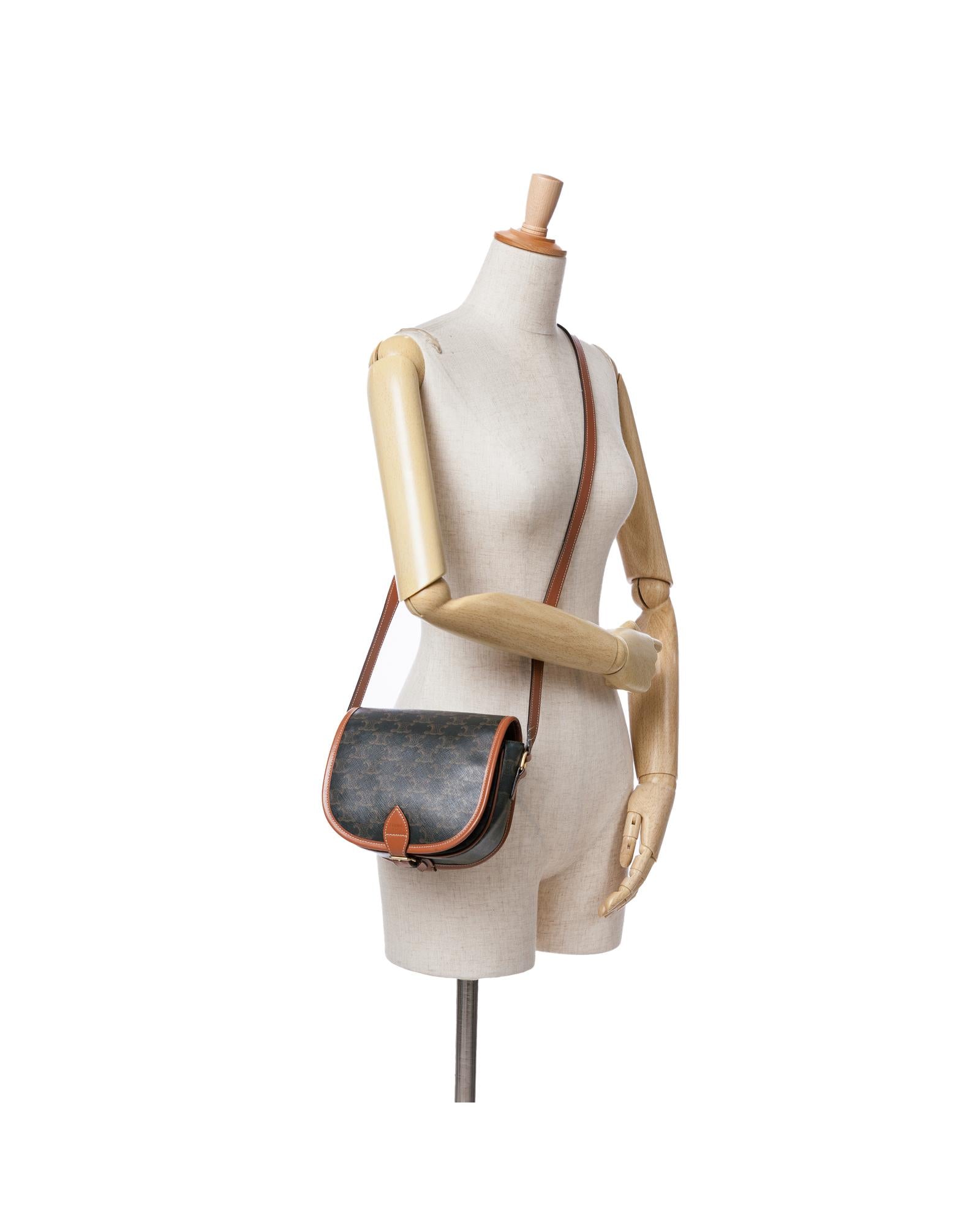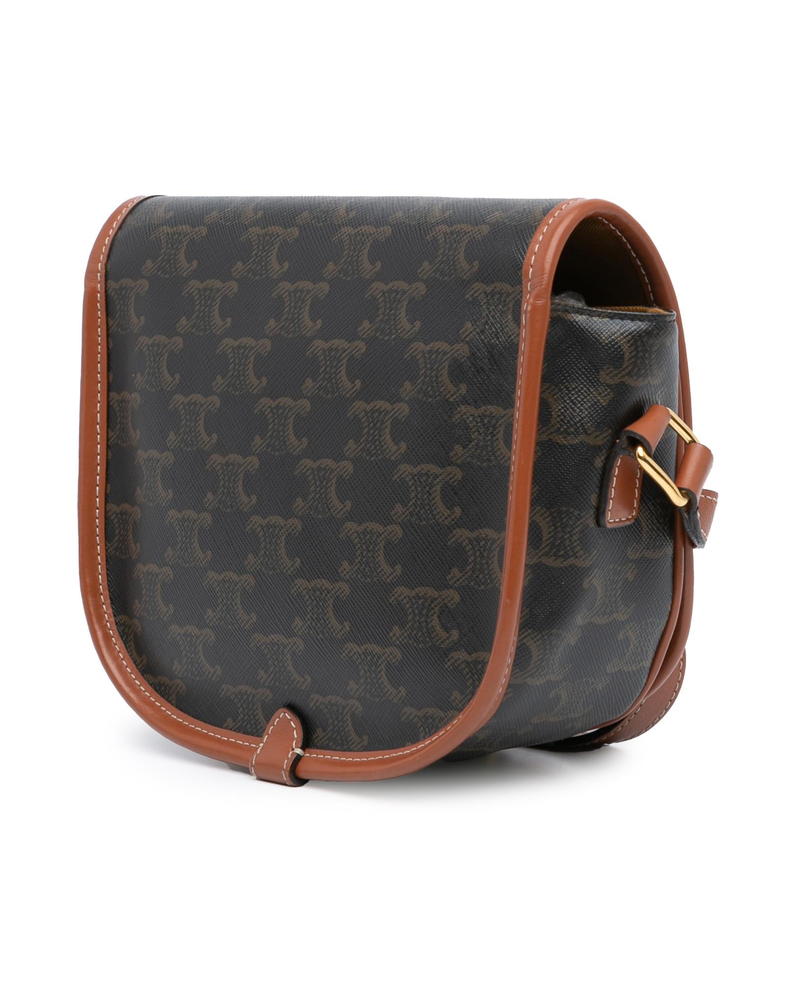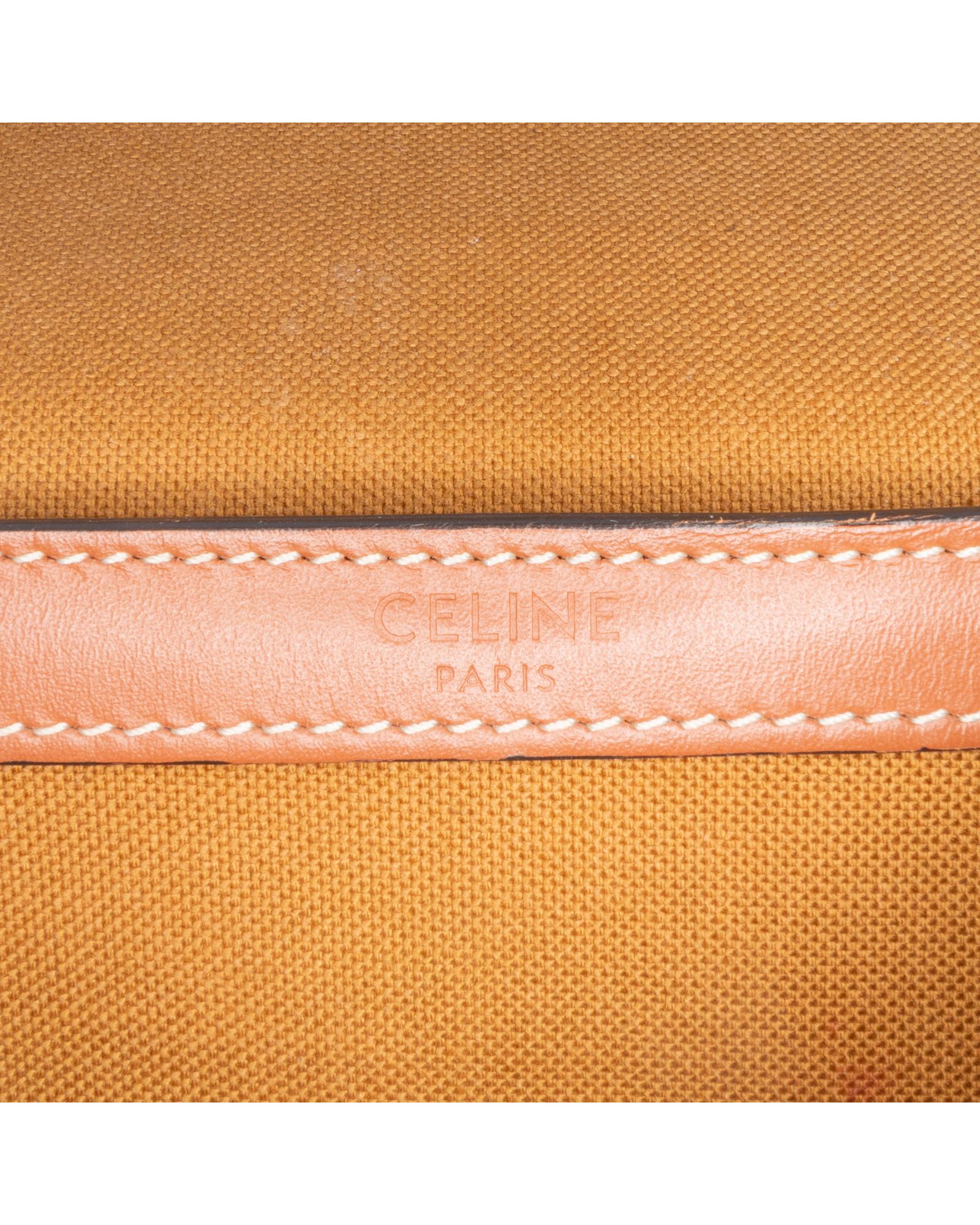 The Folco crossbody bag features a coated canvas body with leather trim a flat leather strap a front flap with a strap and buckle closure an exterior front open pocket and an interior slip pocket.Brand: Celine Vintage