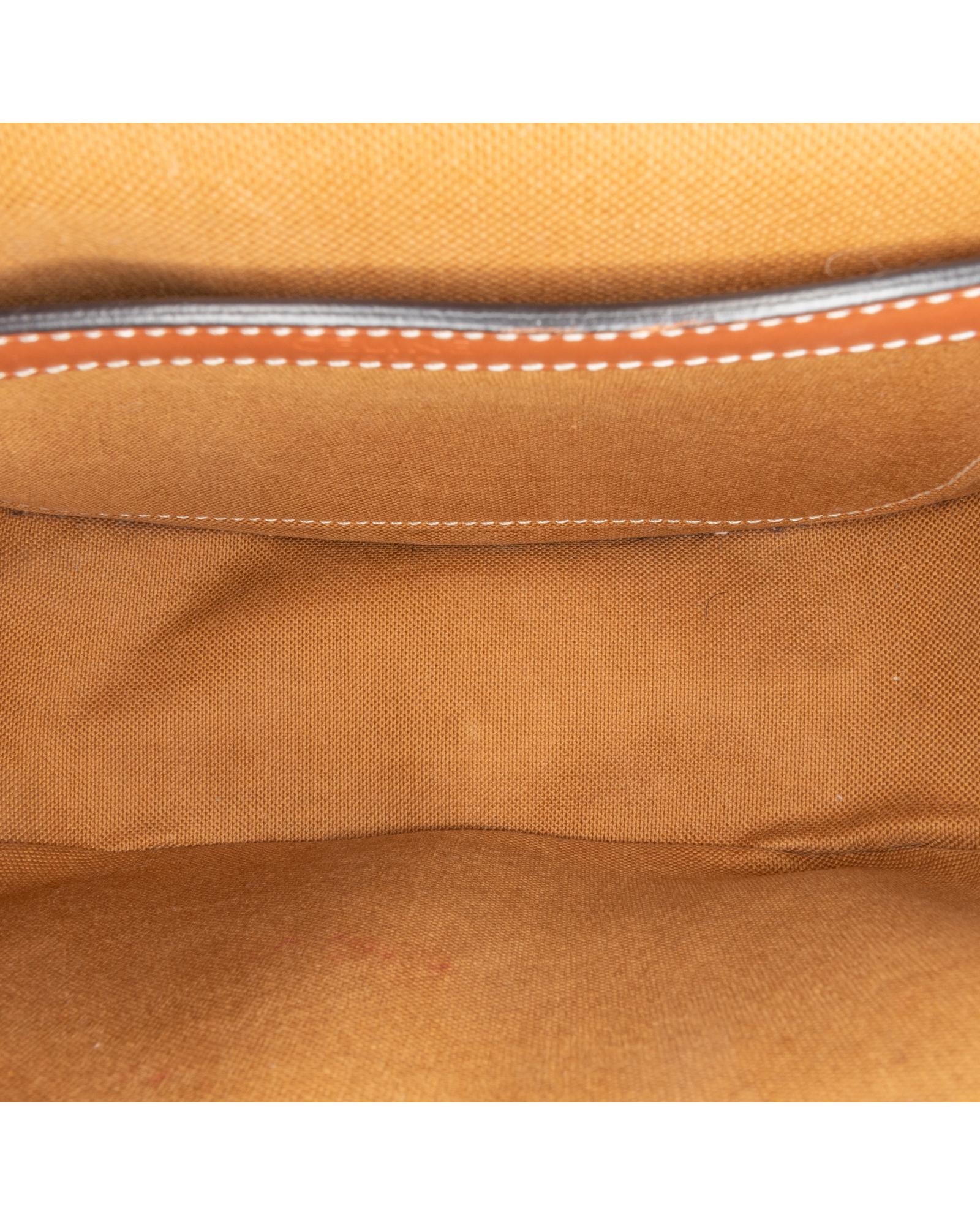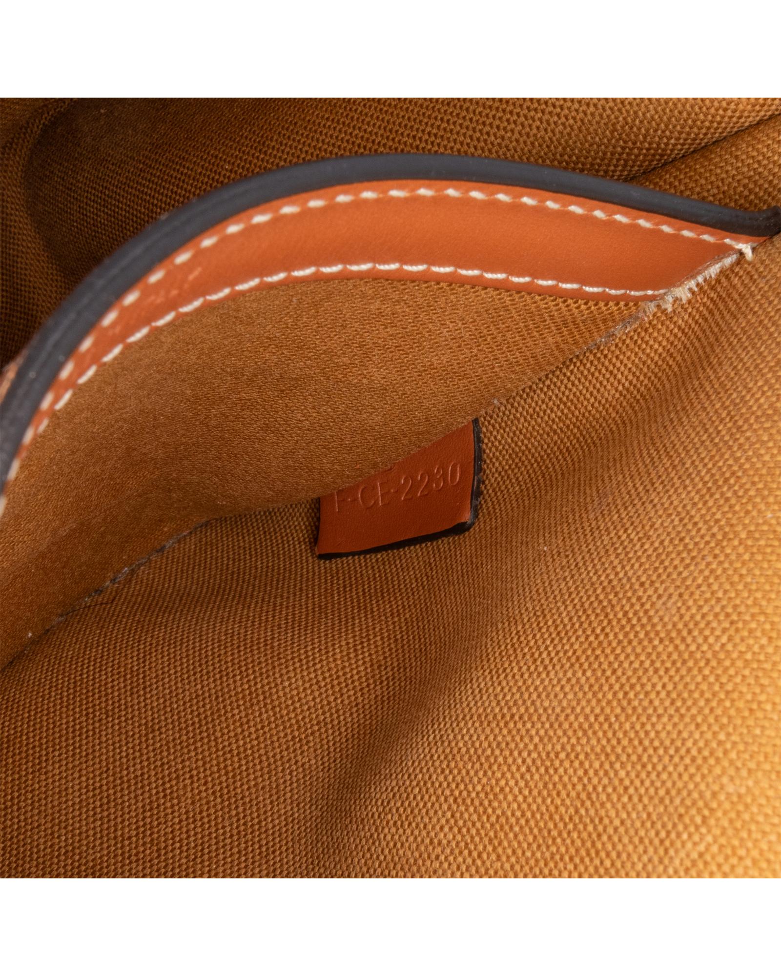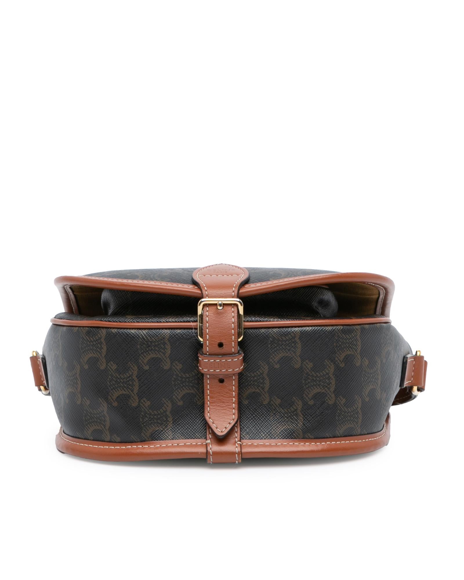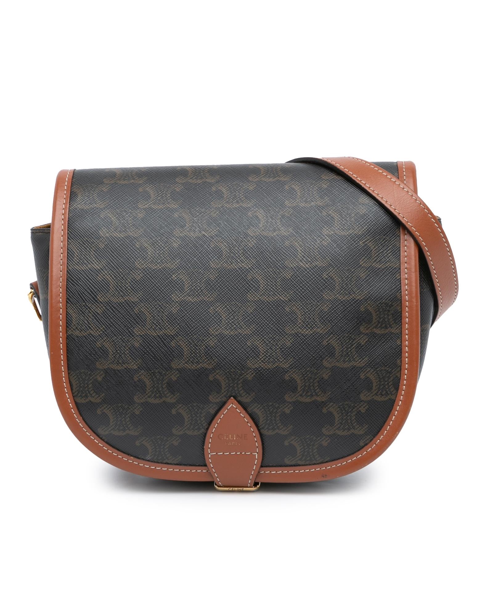 The Folco crossbody bag features a coated canvas body with leather trim a flat leather strap a front flap with a strap and buckle closure an exterior front open pocket and an interior slip pocket.Brand: Celine Vintage