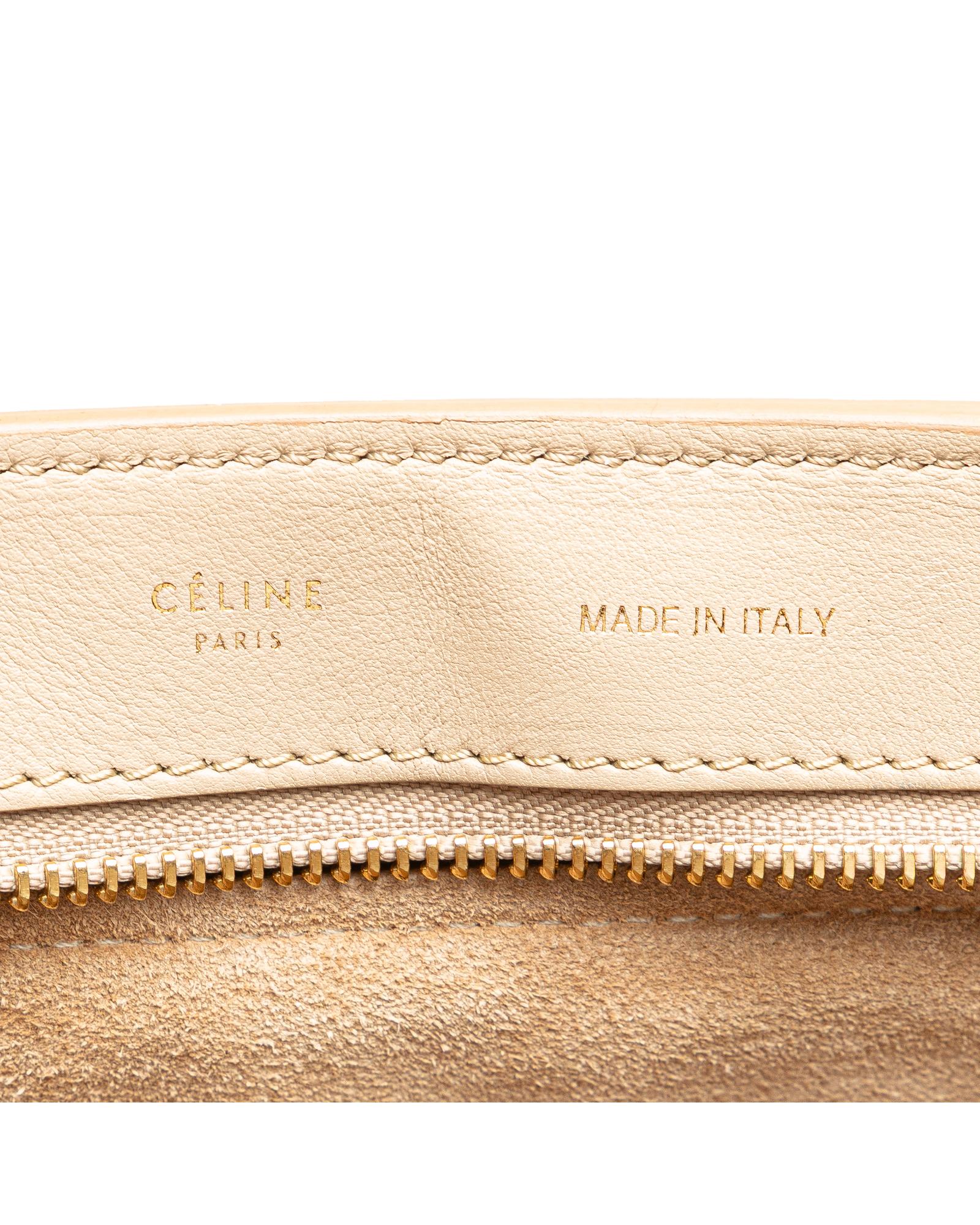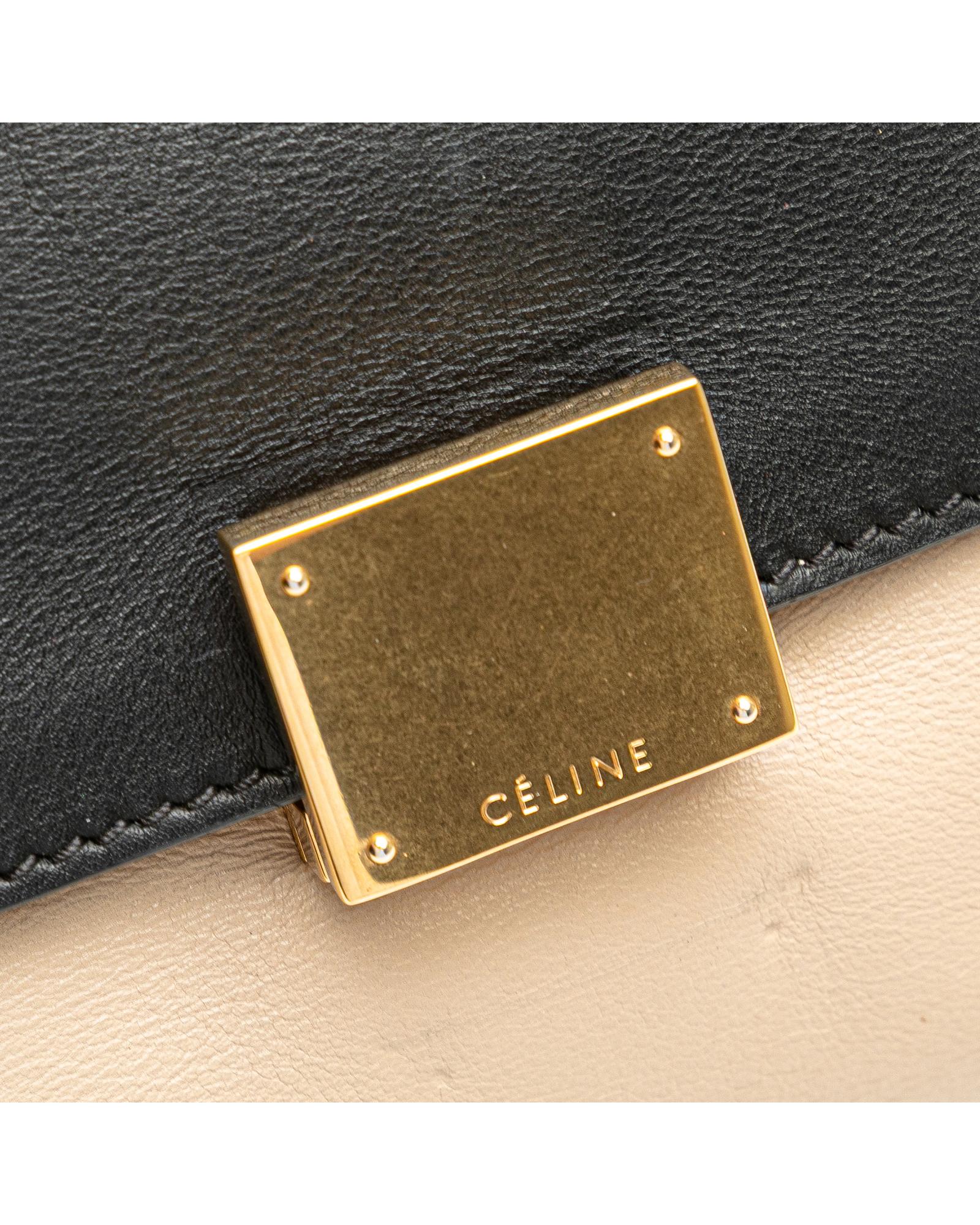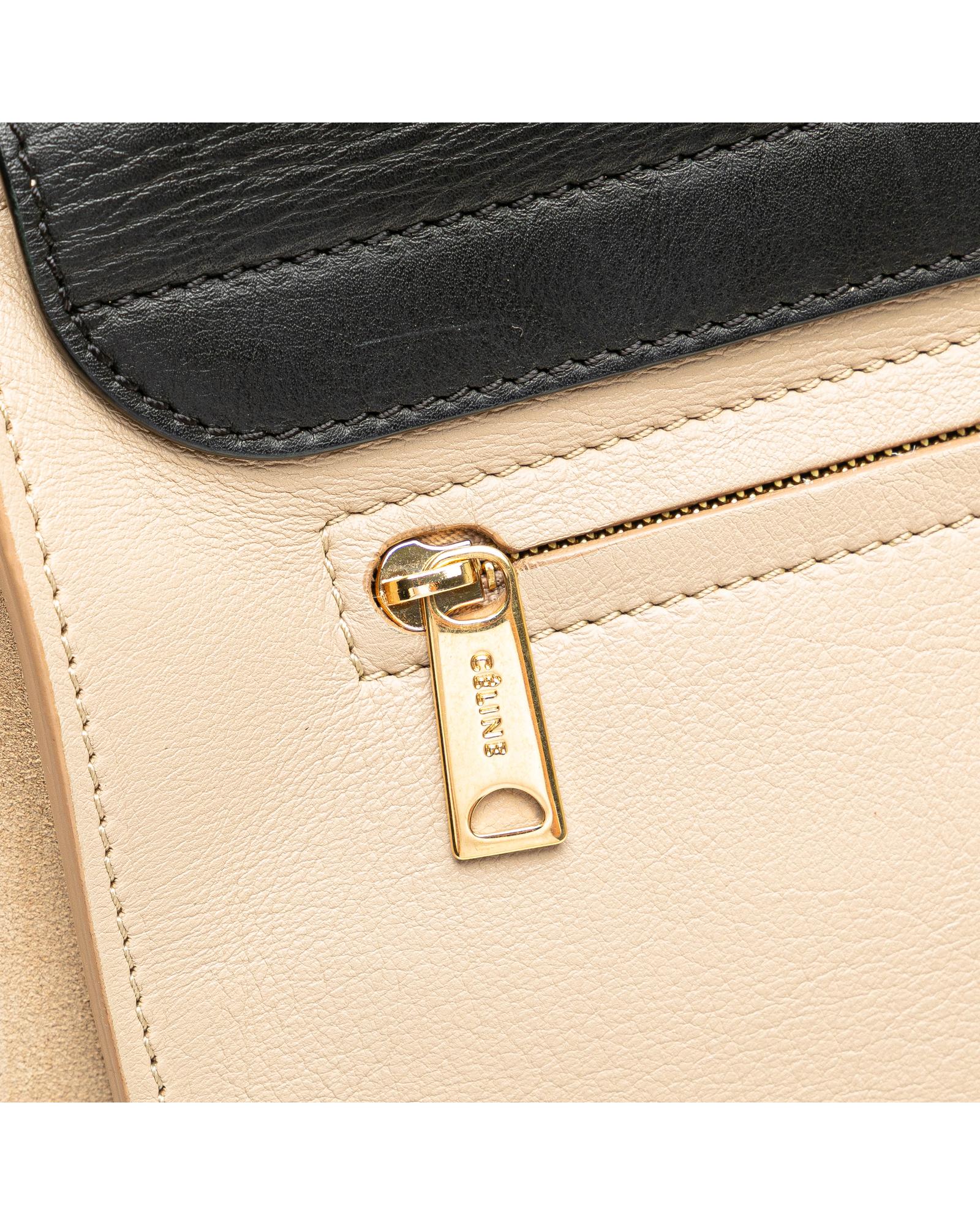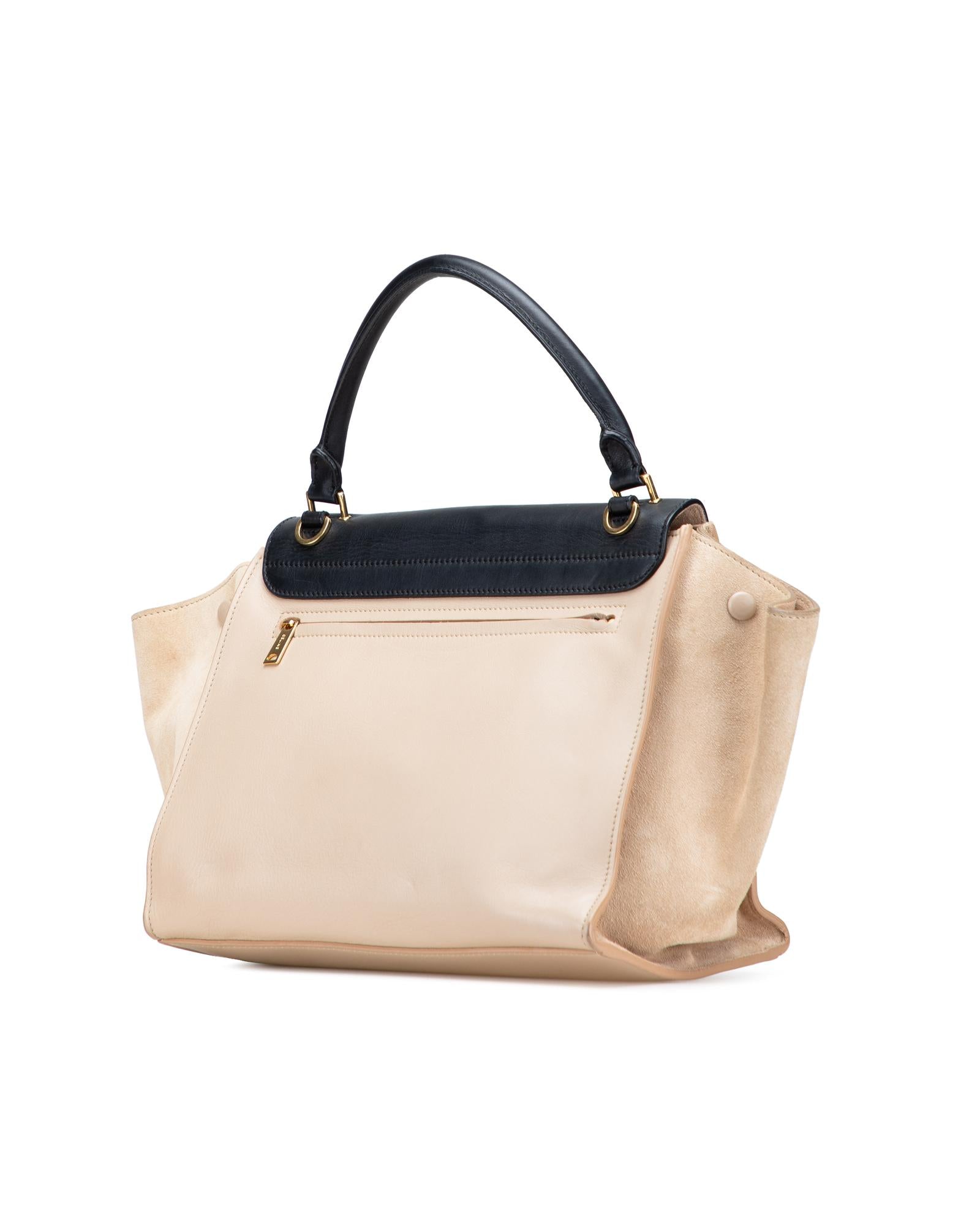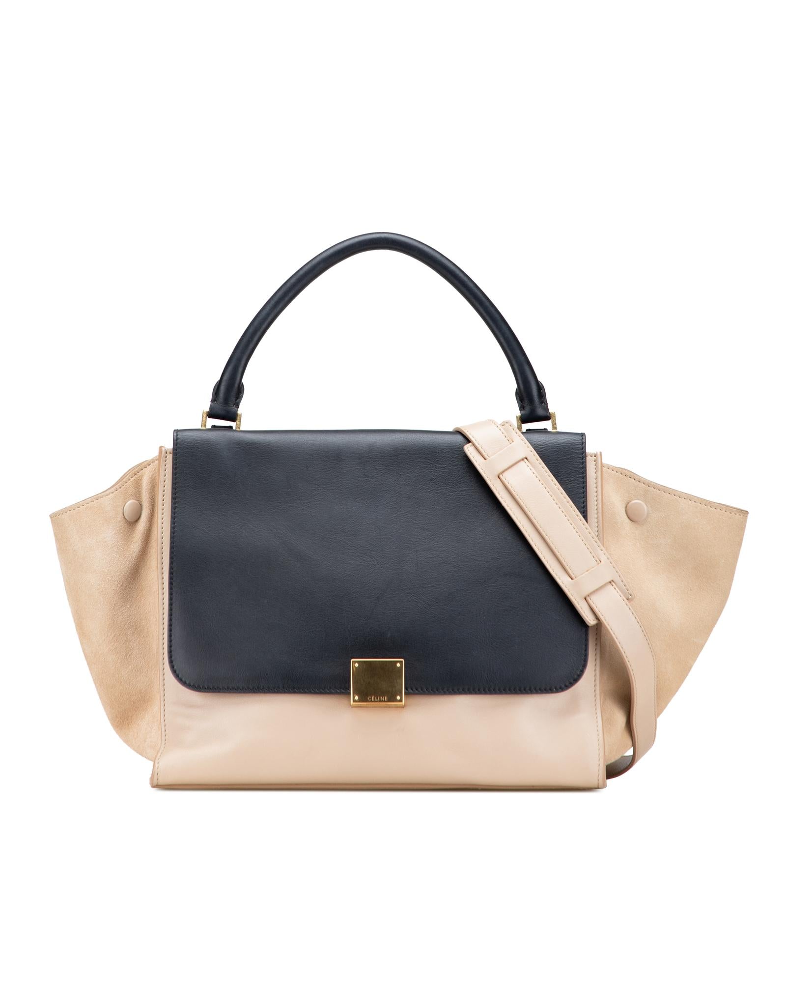 The Trapeze features a calfskin body with suede leather side panels a rolled top handle a detachable flat leather strap a front flap with clasp closure a top zip closure an exterior back zip pocket and interior slip pockets.Brand: Celine Vintage