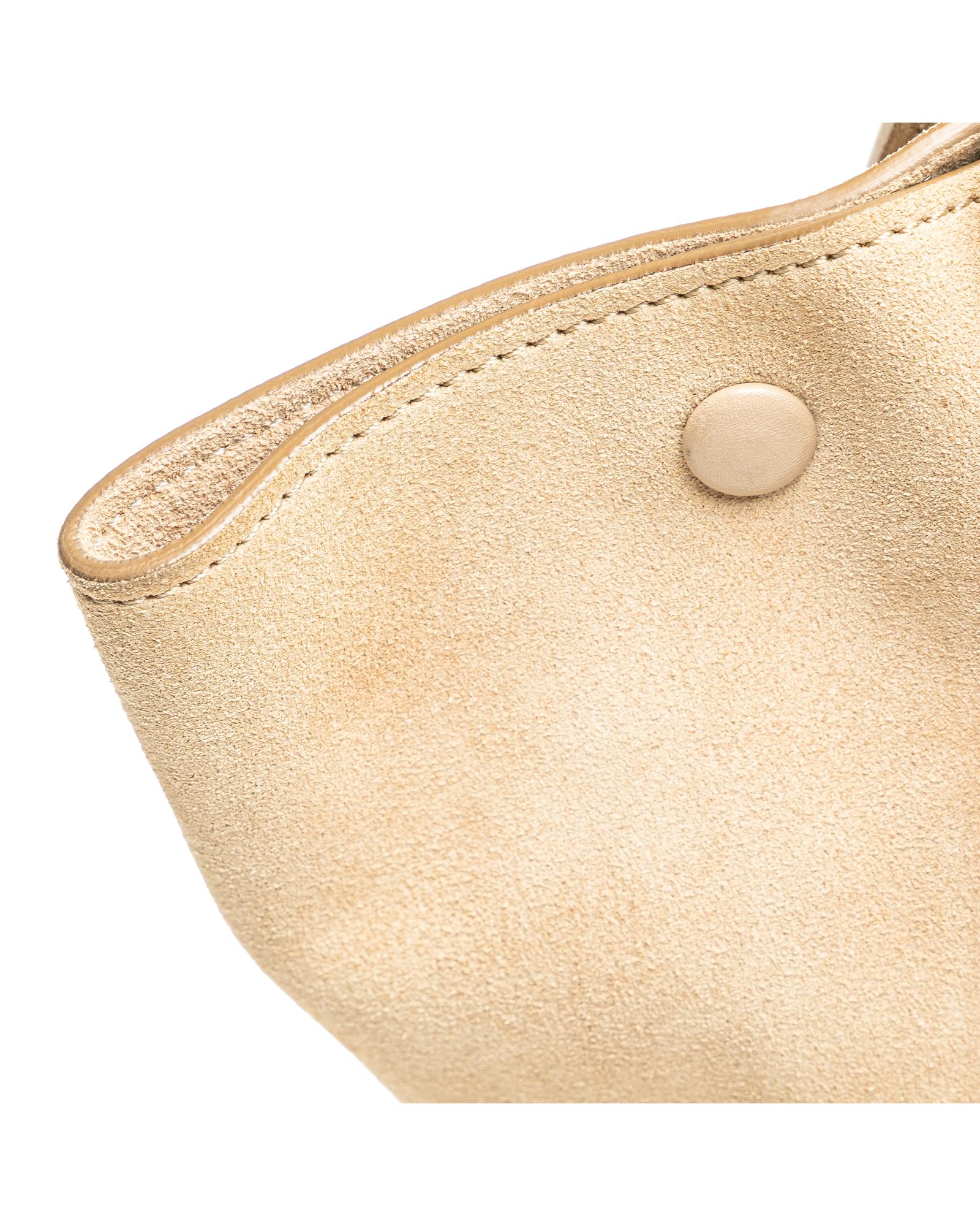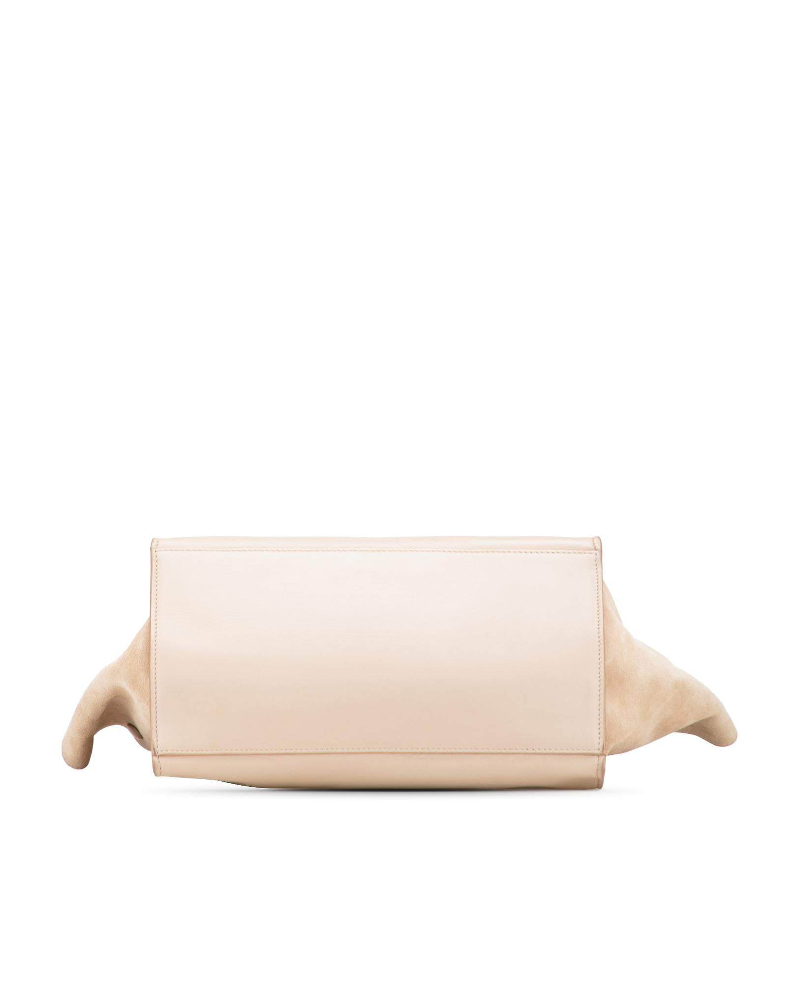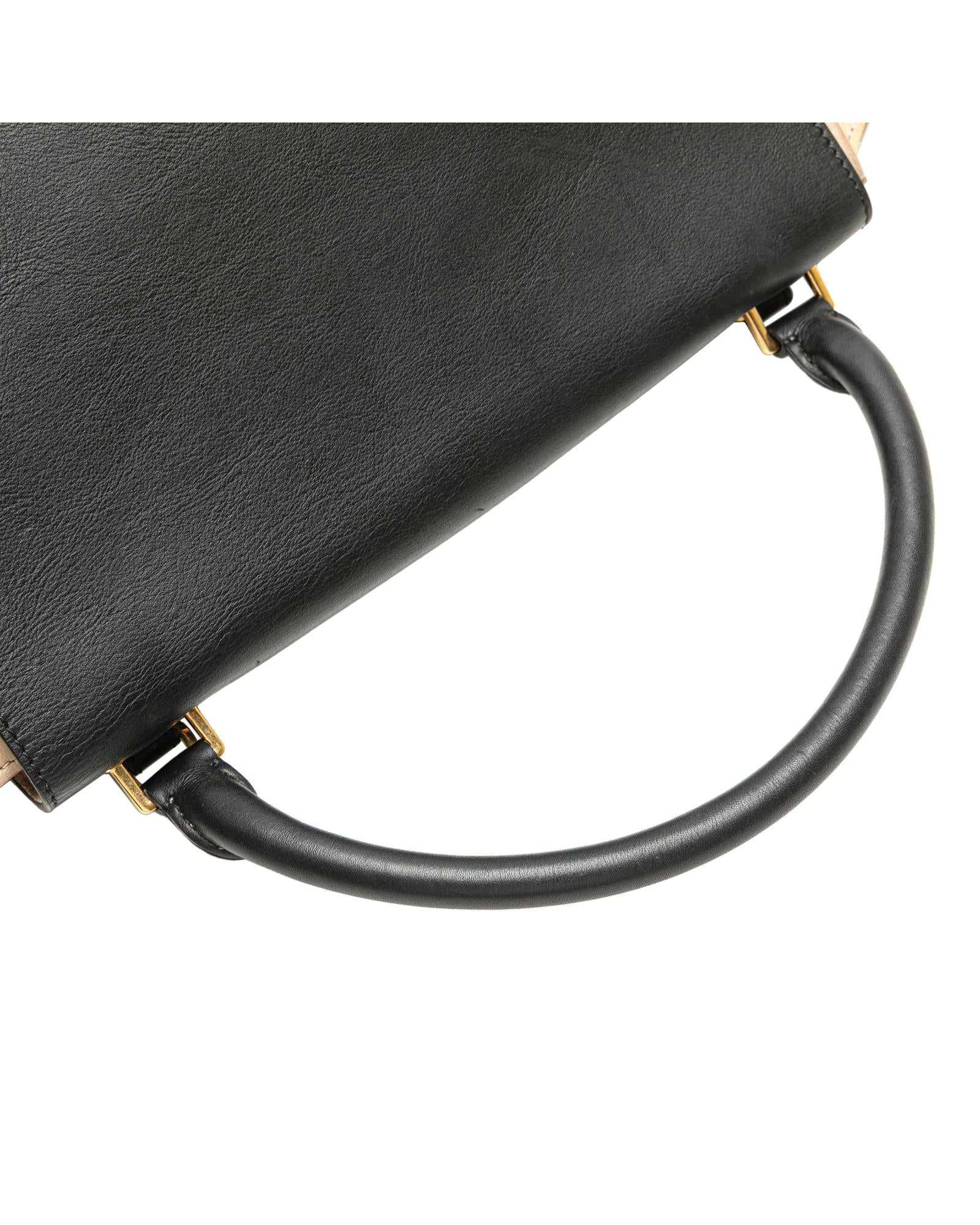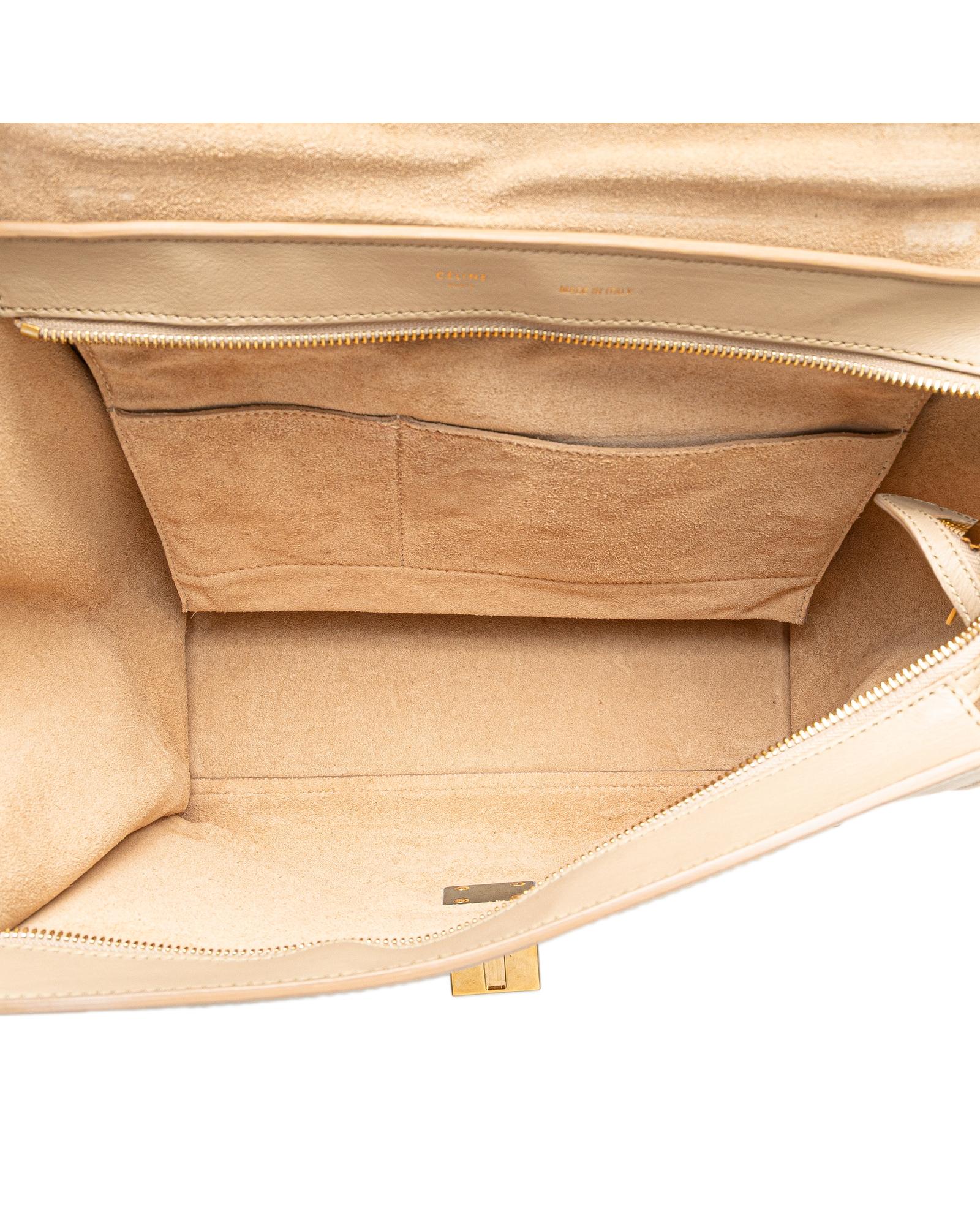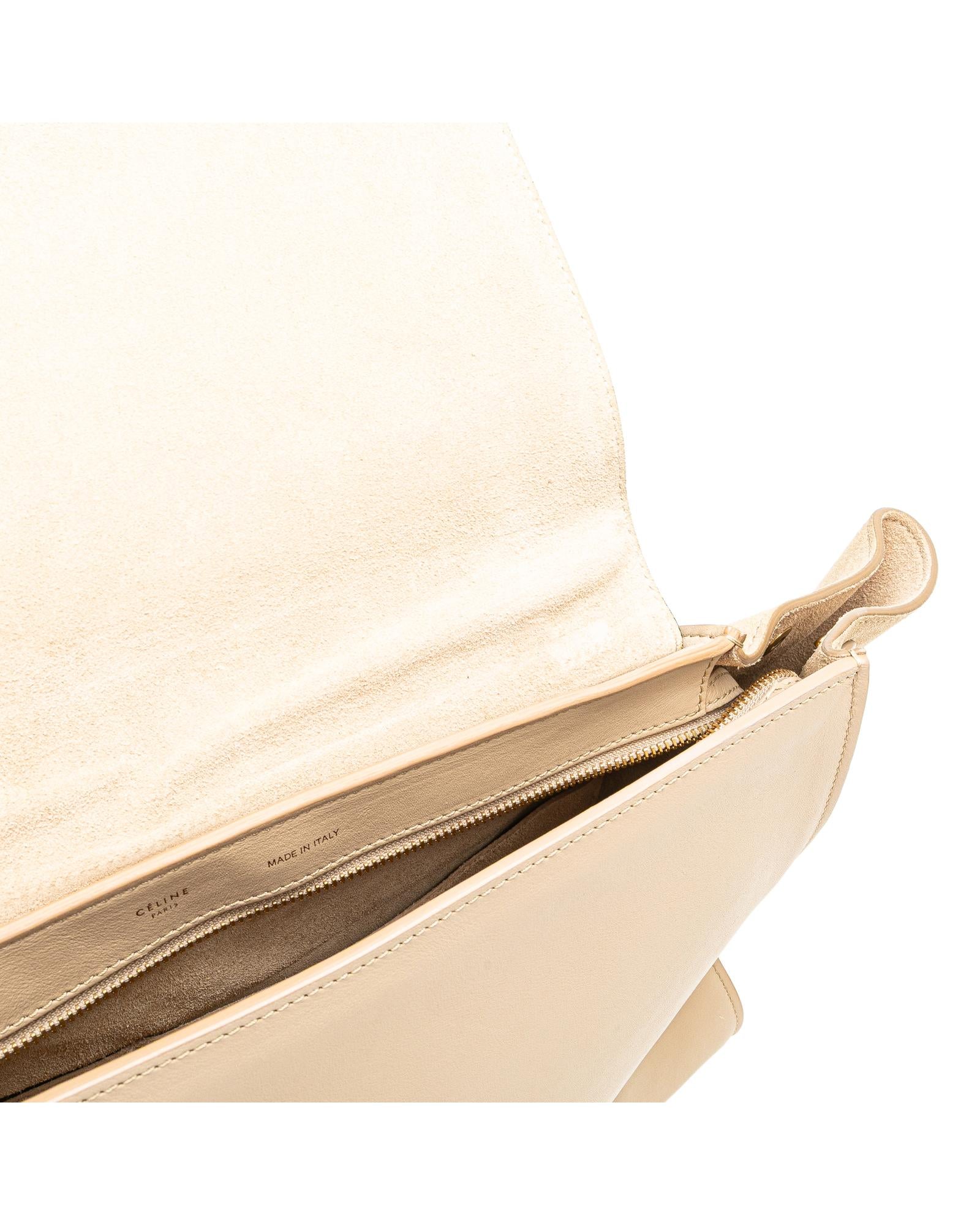 The Trapeze features a calfskin body with suede leather side panels a rolled top handle a detachable flat leather strap a front flap with clasp closure a top zip closure an exterior back zip pocket and interior slip pockets.Brand: Celine Vintage