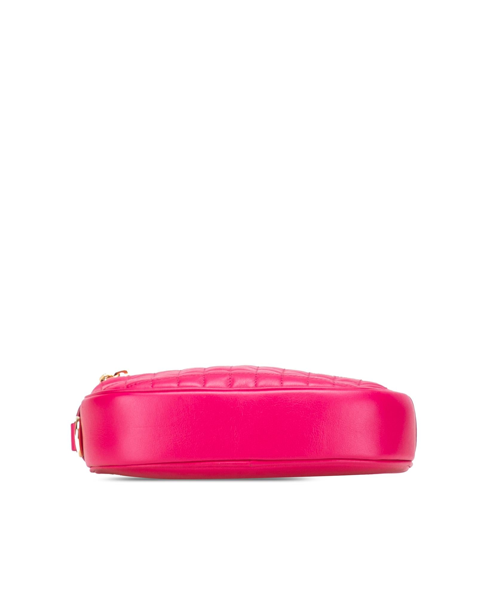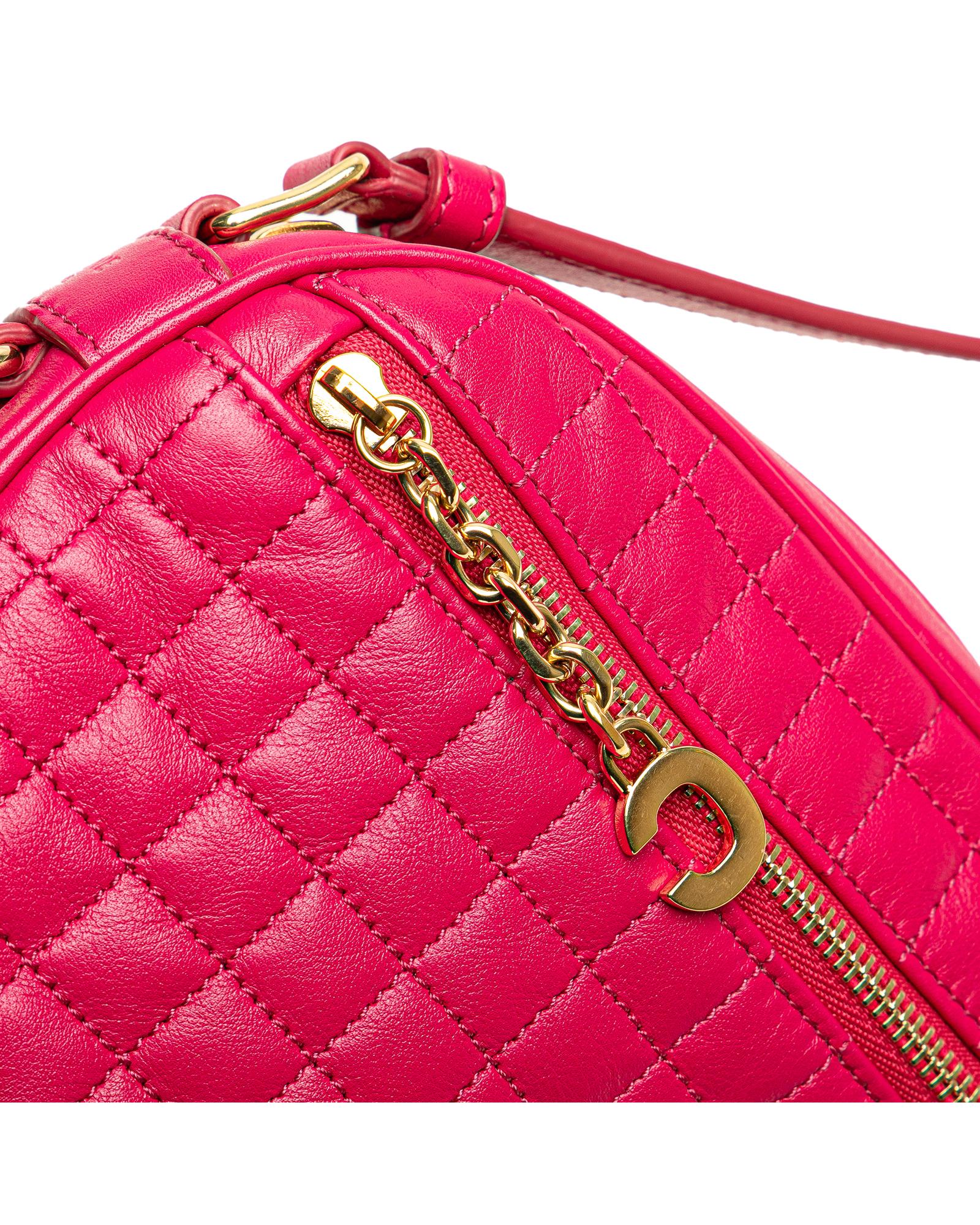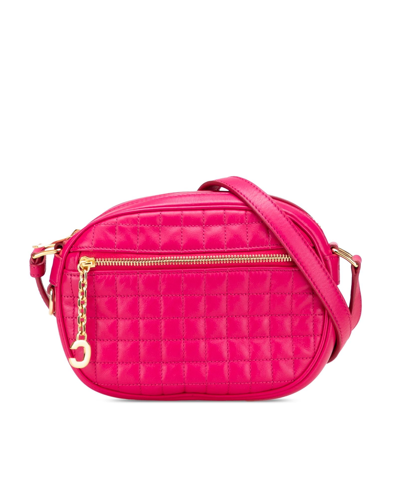 This crossbody bag features a quilted leather body a flat leather strap a top zip closure an exterior front zip pocket and interior slip pockets.