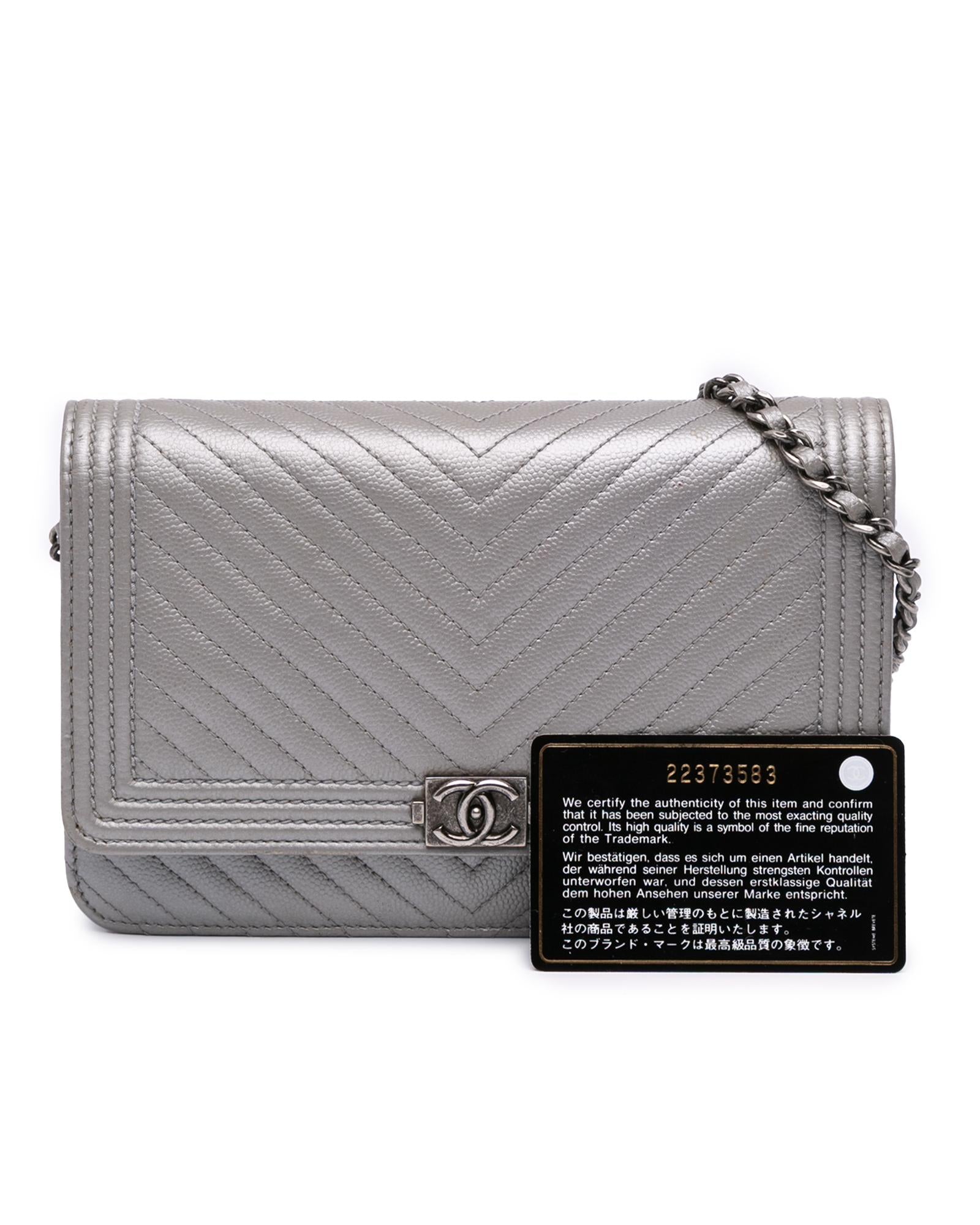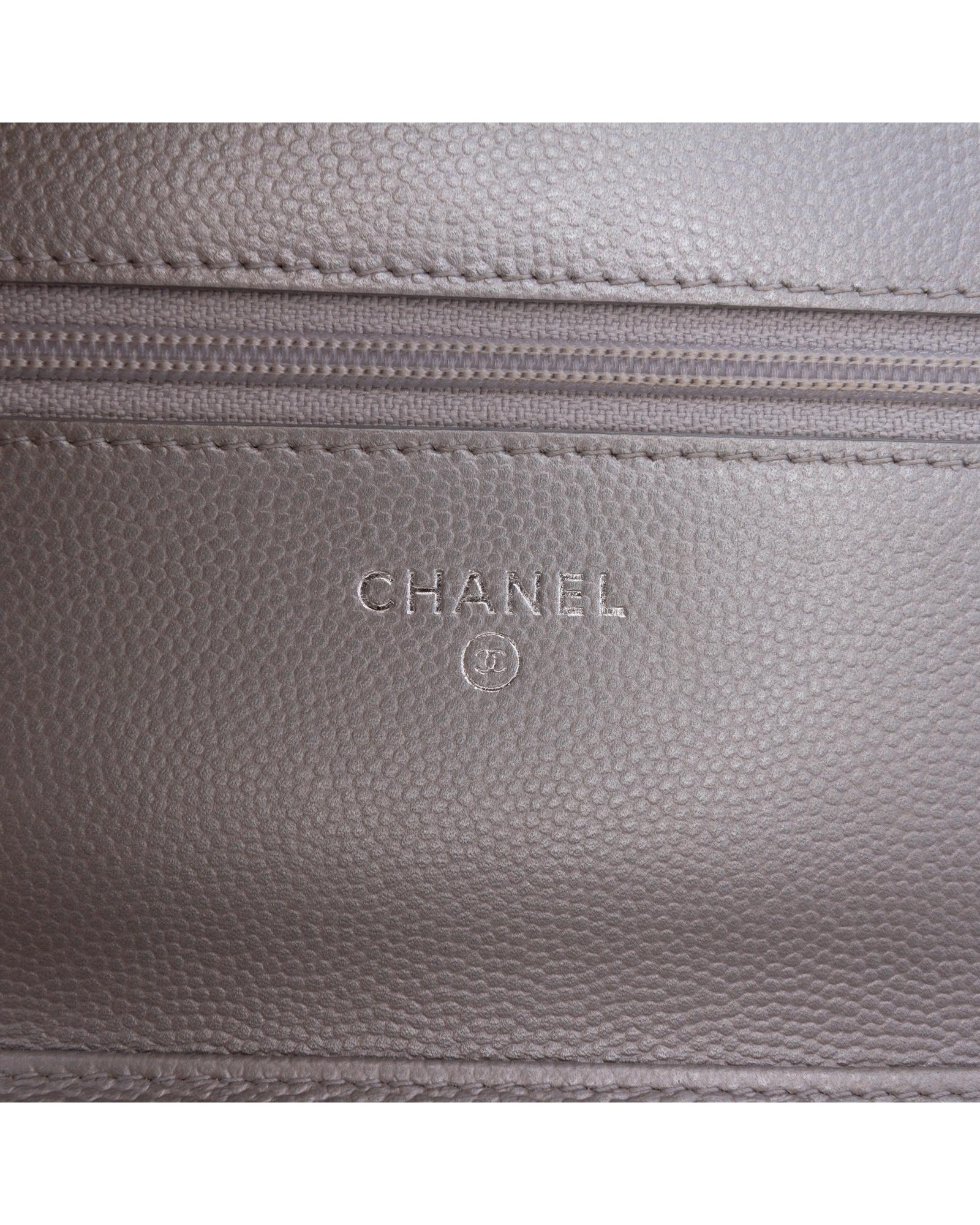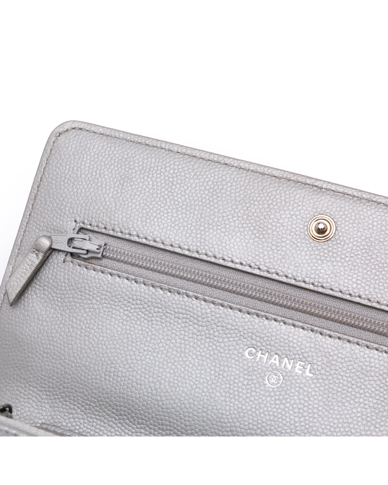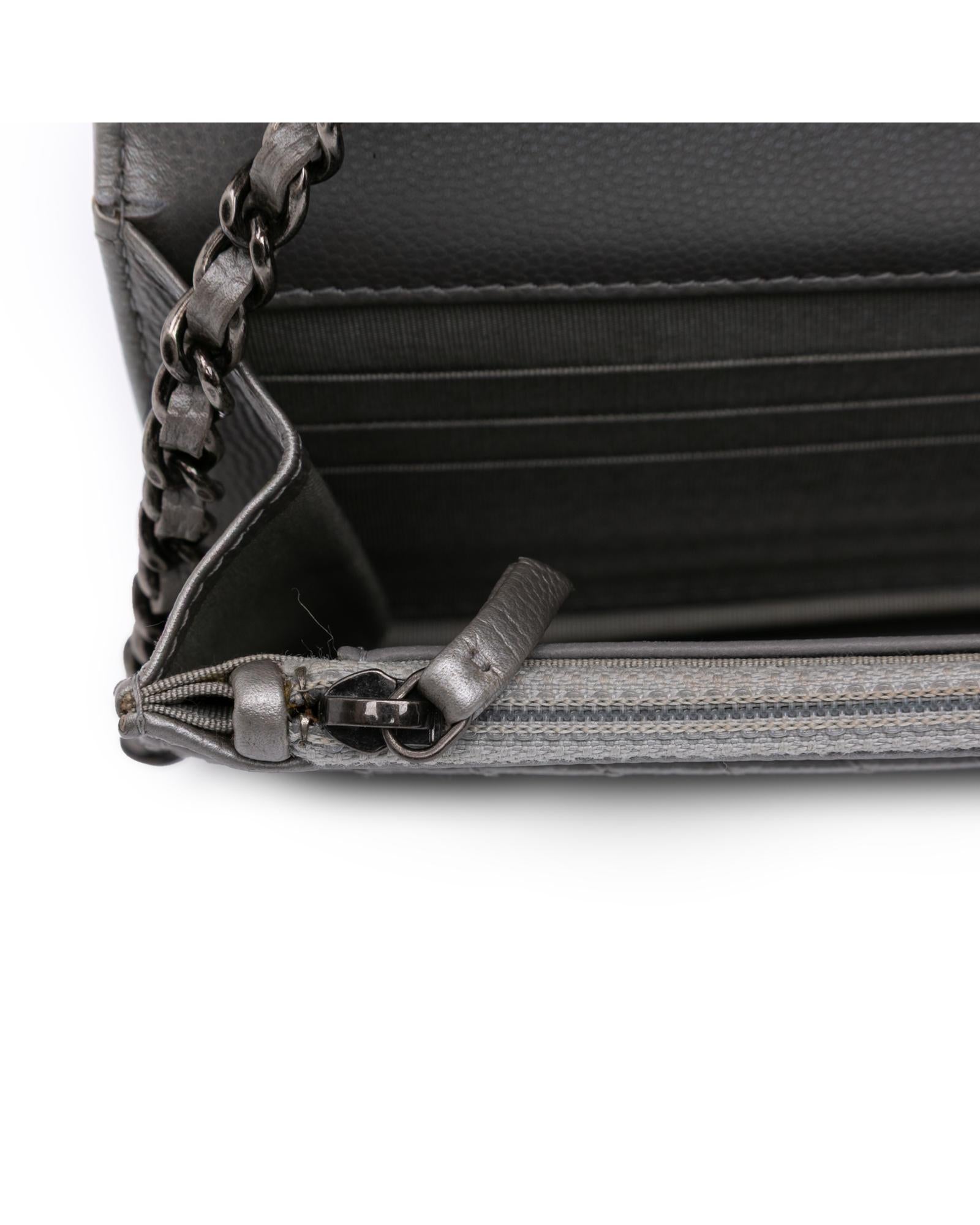 This wallet on chain features a quilted leather body a leather woven chain strap a front flap with a cc push lock closure and interior zip and slip compartments.Brand: Chanel Vintage