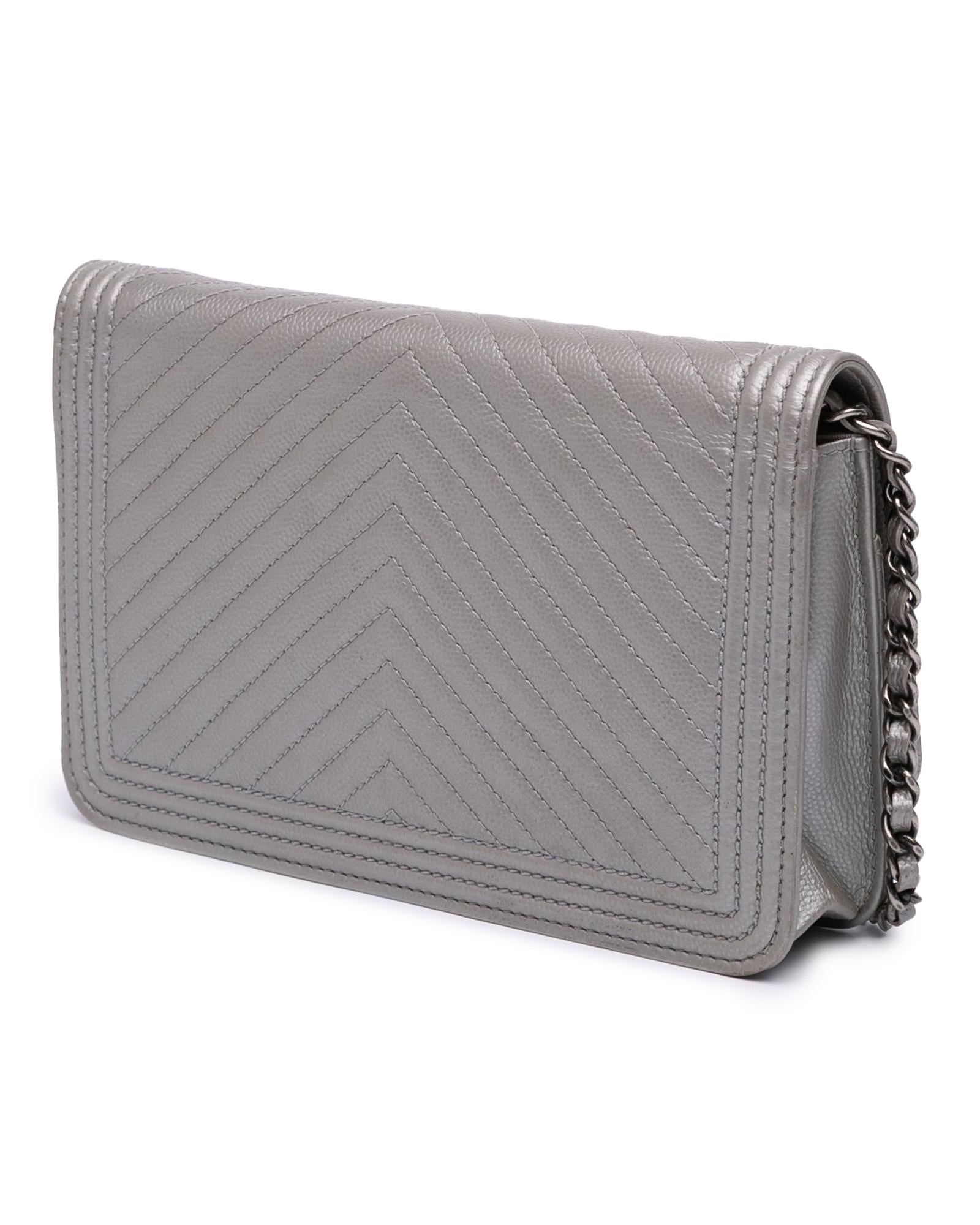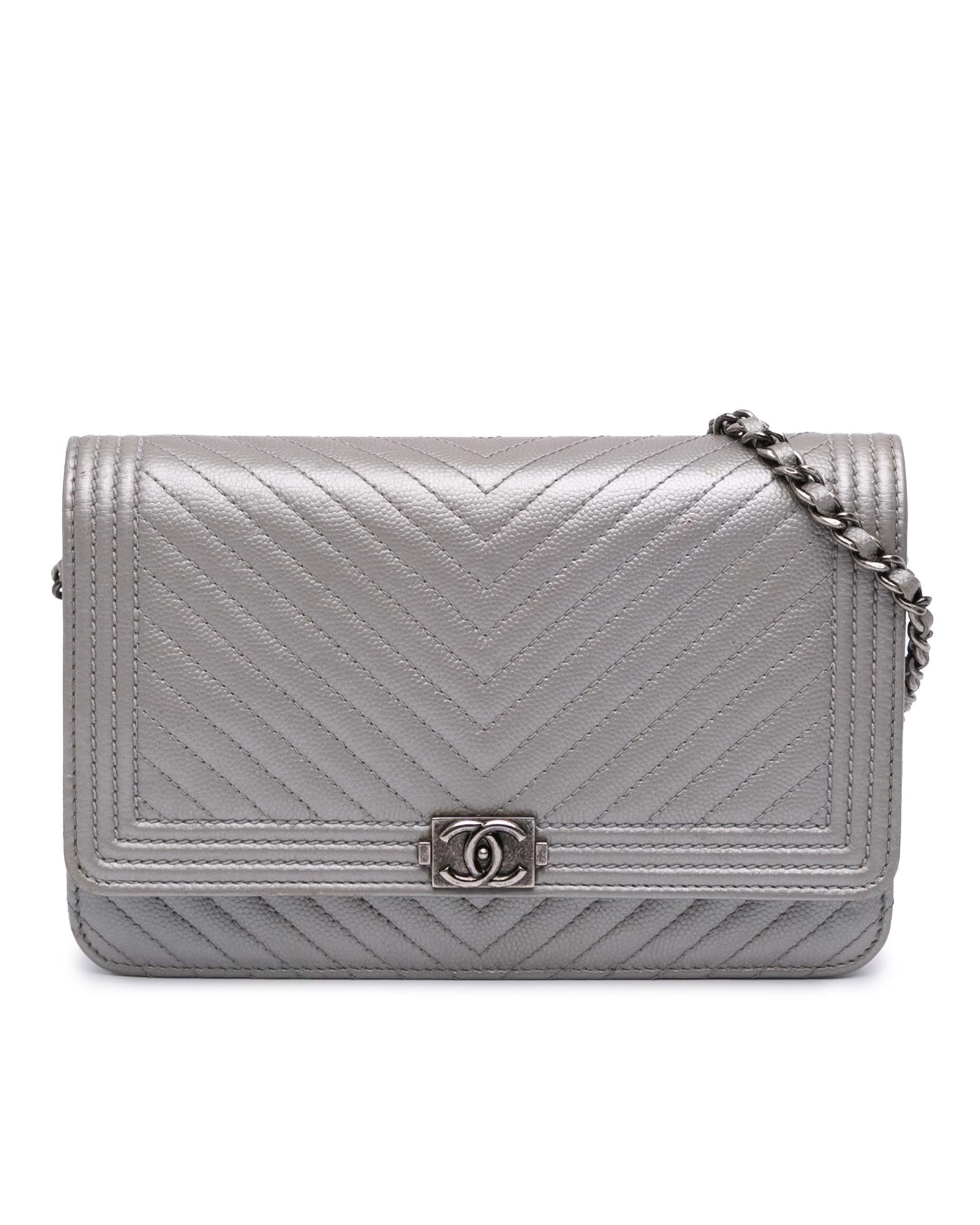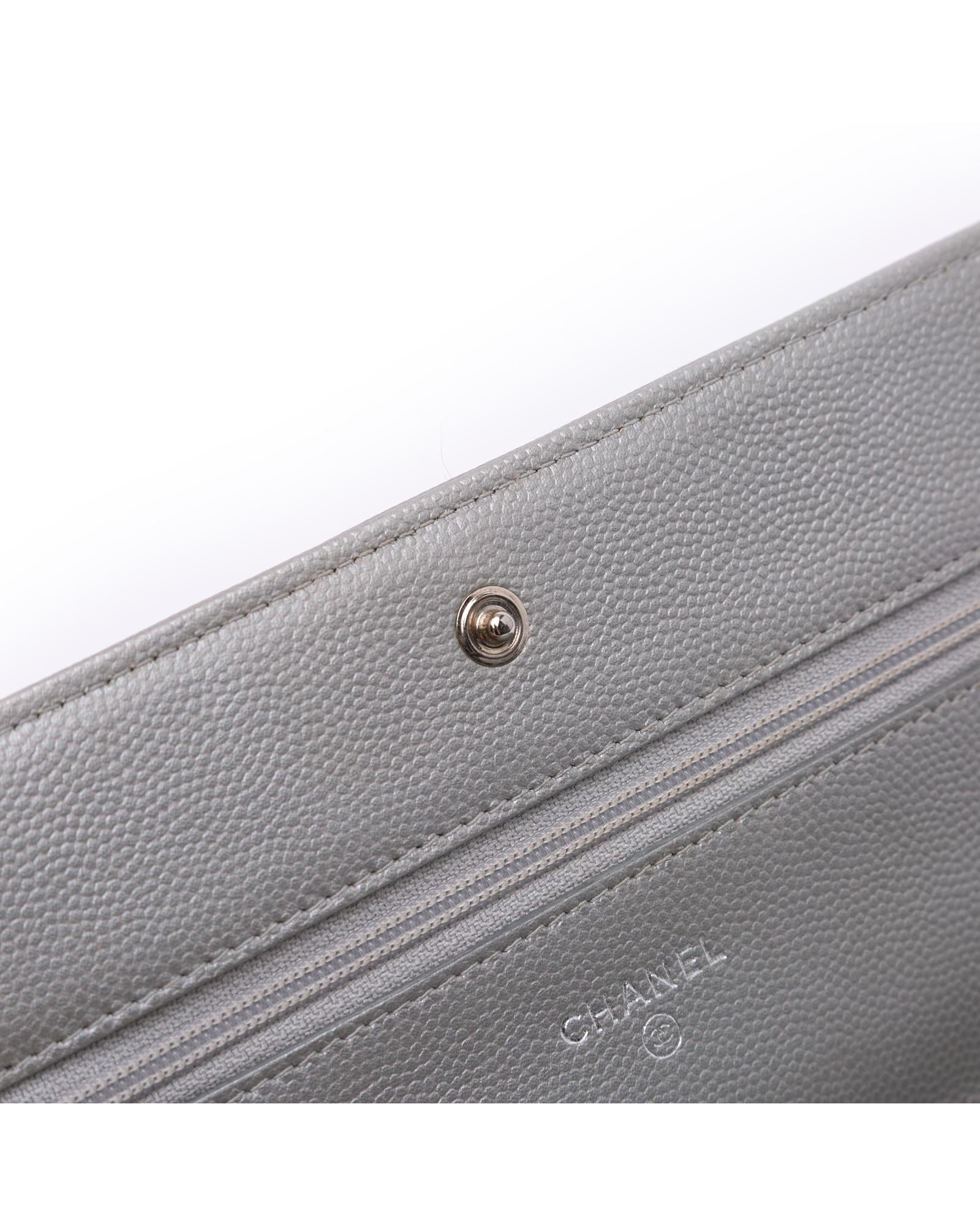 This wallet on chain features a quilted leather body a leather woven chain strap a front flap with a cc push lock closure and interior zip and slip compartments.Brand: Chanel Vintage