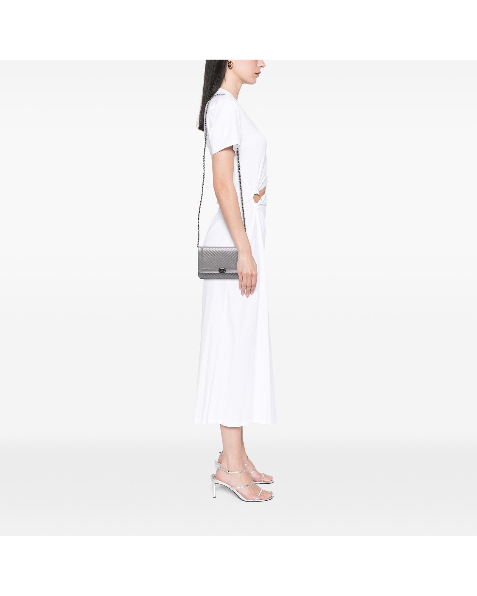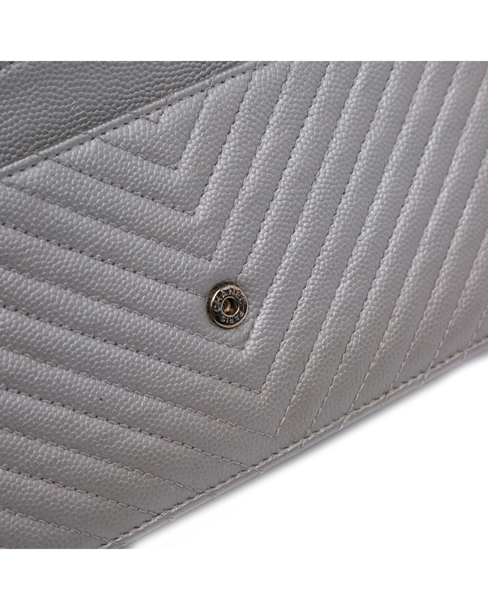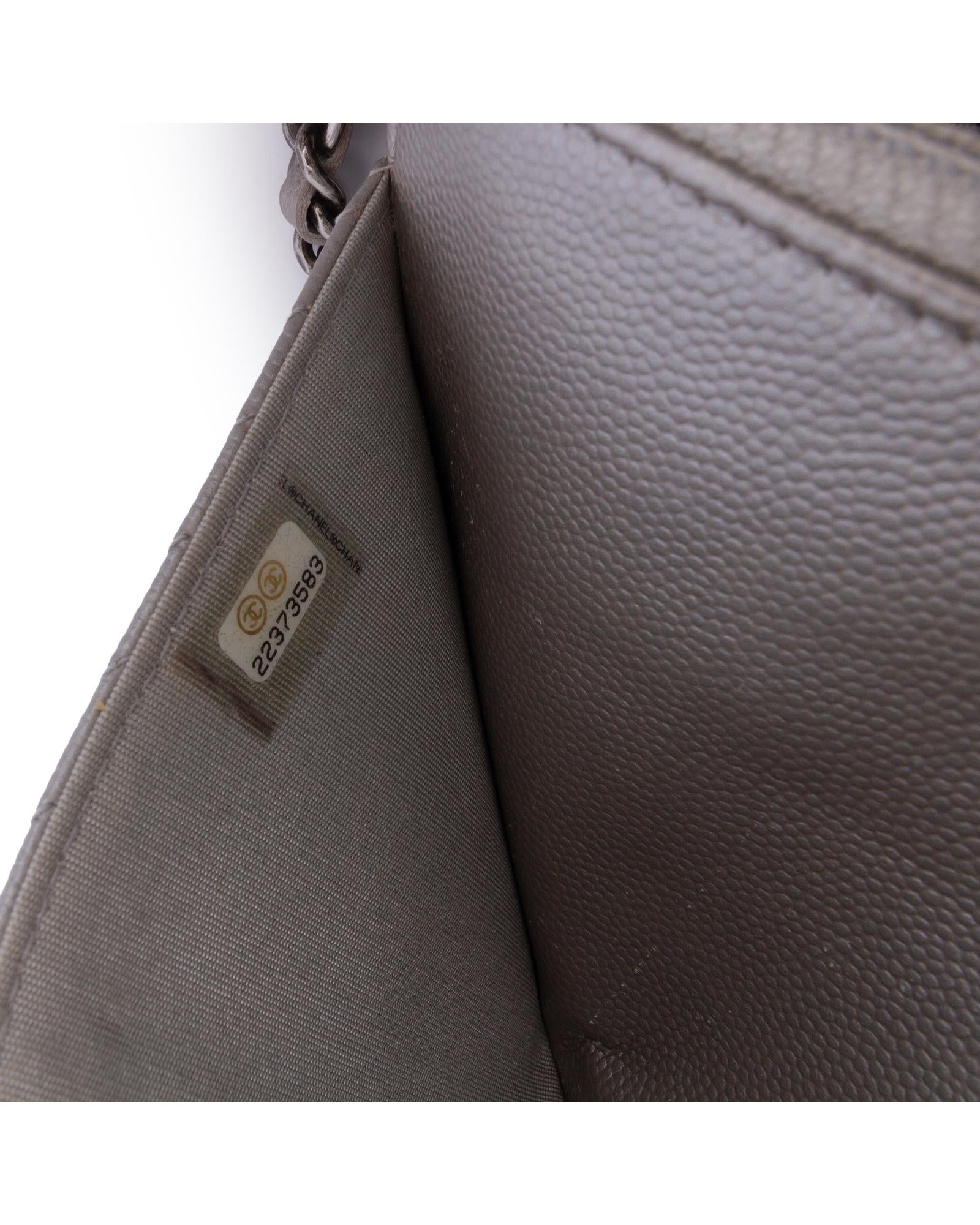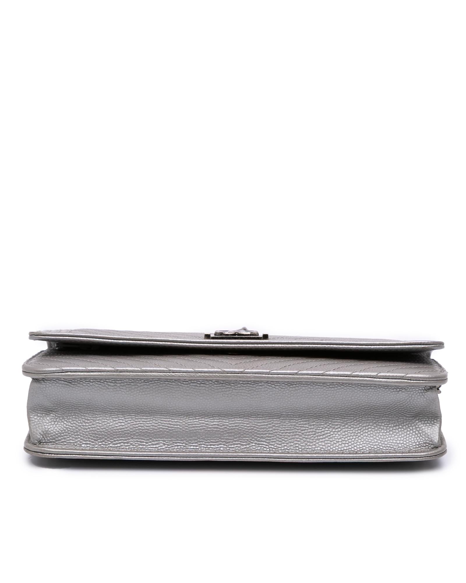 This wallet on chain features a quilted leather body a leather woven chain strap a front flap with a cc push lock closure and interior zip and slip compartments.Brand: Chanel Vintage