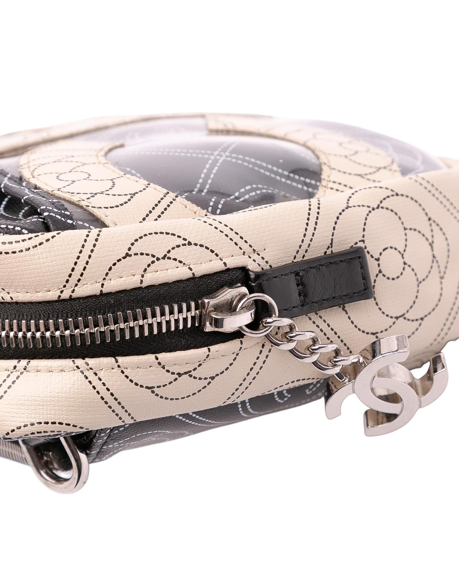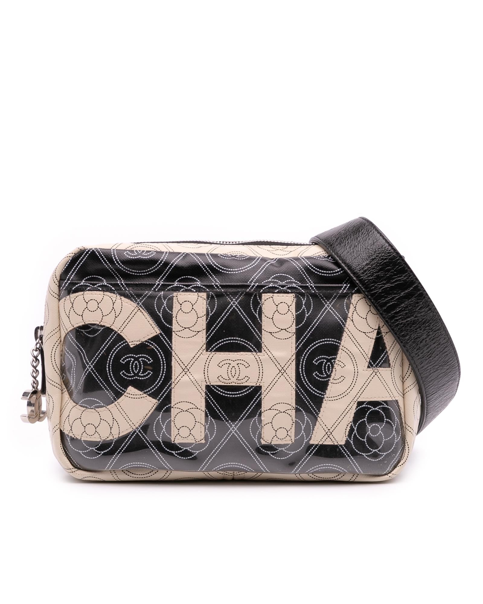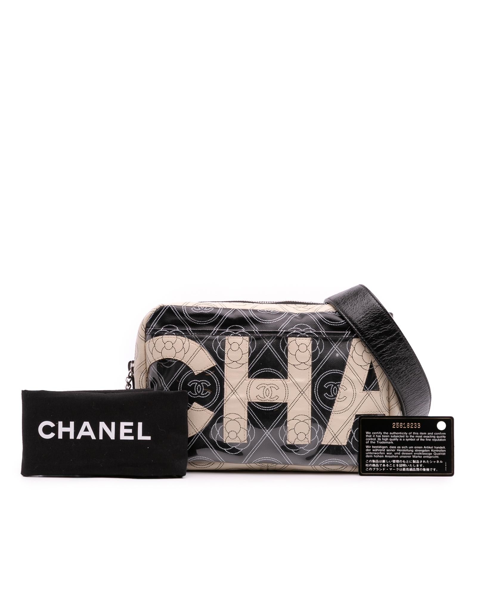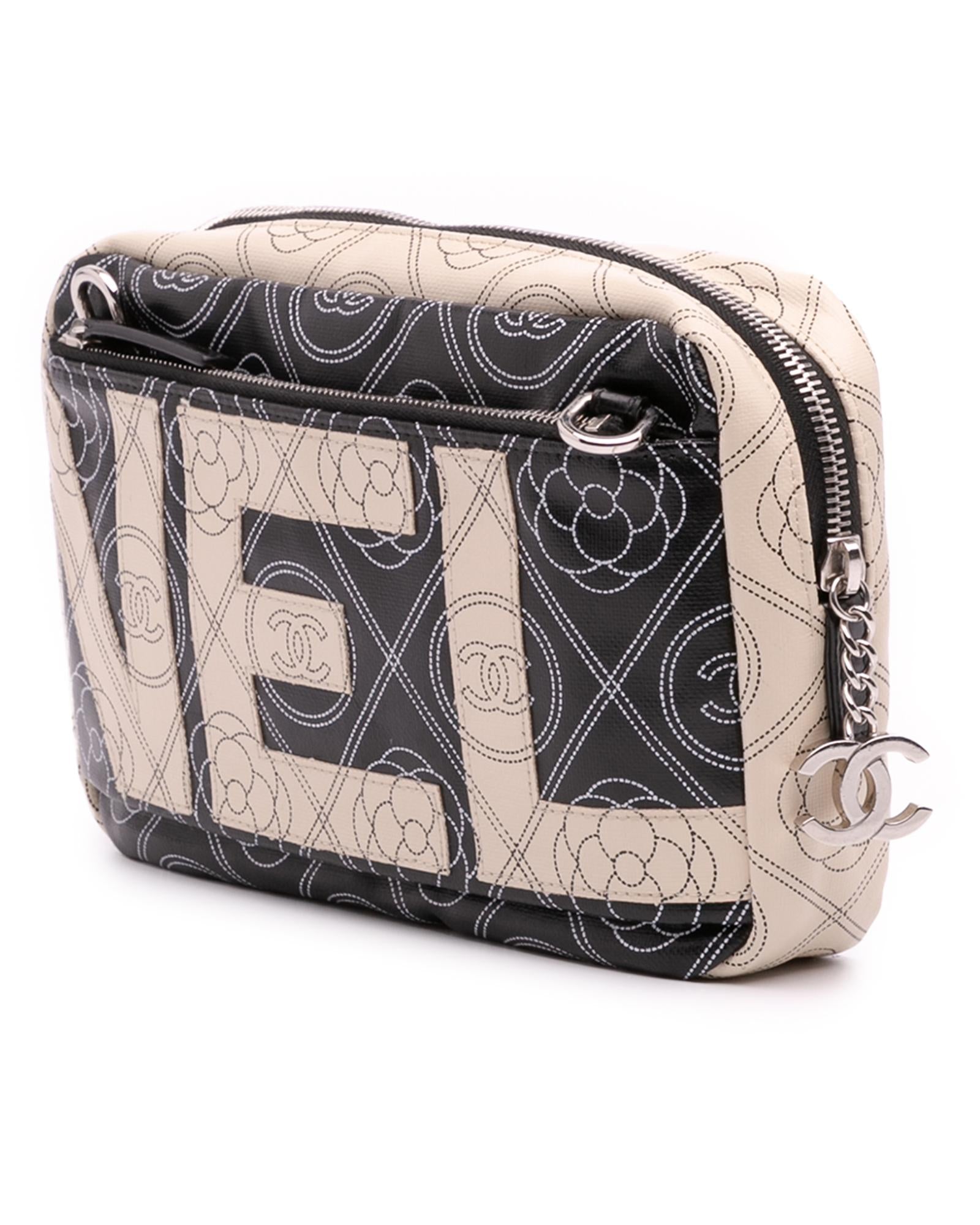 This camera bag features a printed coated canvas body an adjustable and detachable flat leather strap a top zip closure exterior zip and slip pockets and an interior zip pocket.Brand: Chanel Vintage