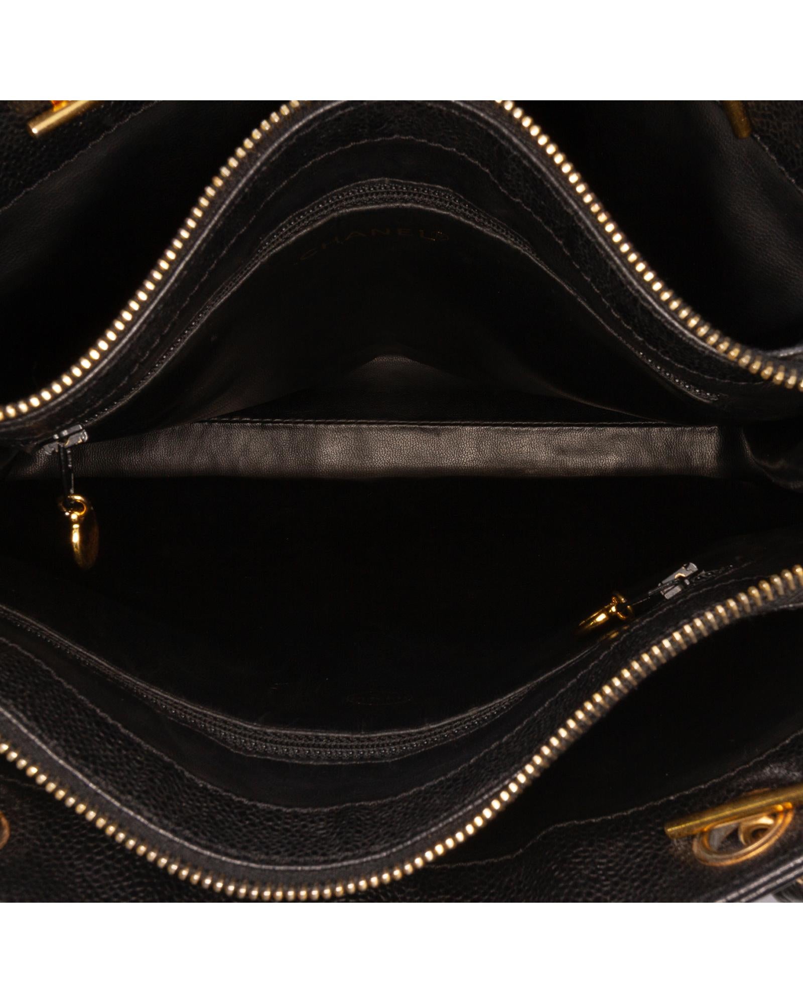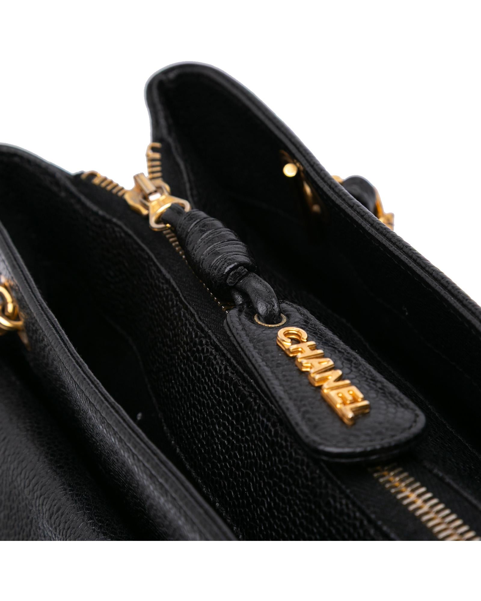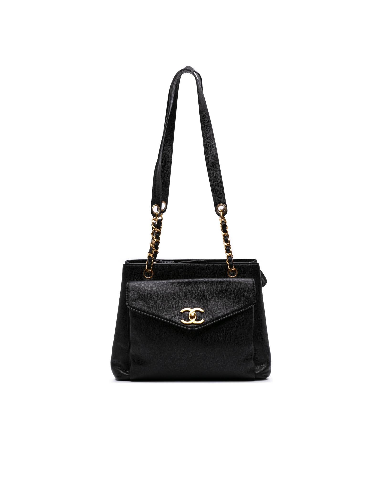 This shoulder bag features a caviar leather body leather woven chains link strap with leather guard an open top an interior center zip compartment and an exterior front flap compartment with CC turn-lock closure.
