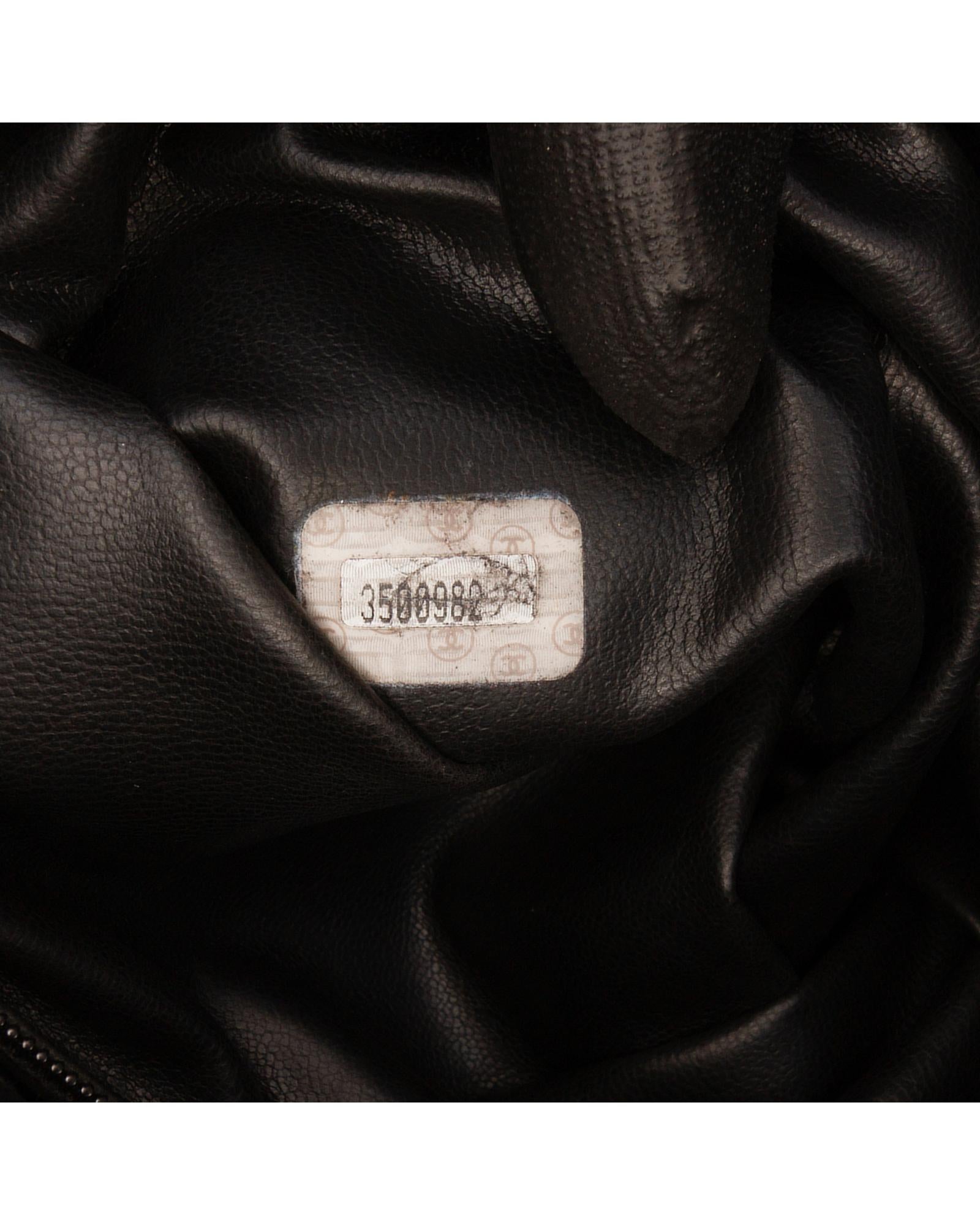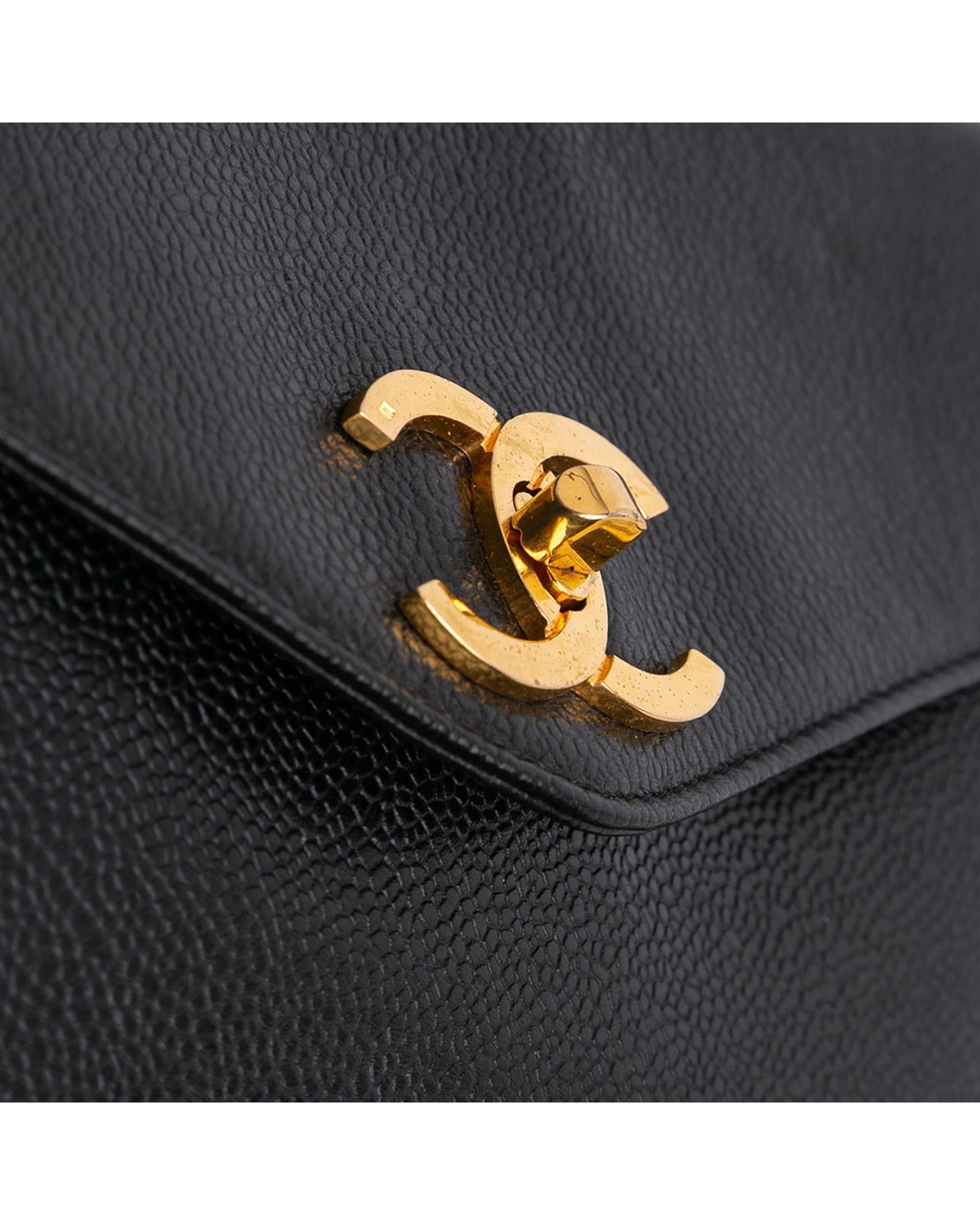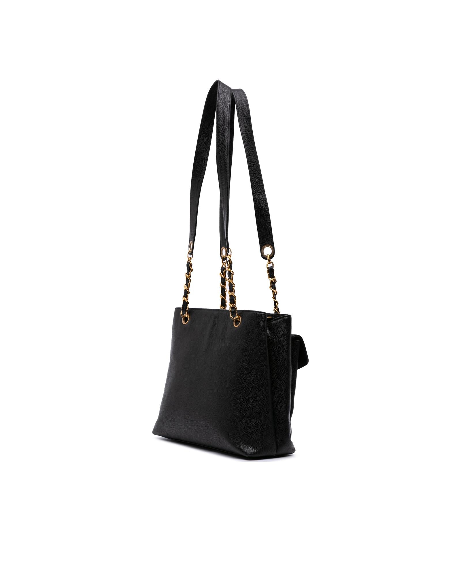 This shoulder bag features a caviar leather body leather woven chains link strap with leather guard an open top an interior center zip compartment and an exterior front flap compartment with CC turn-lock closure.