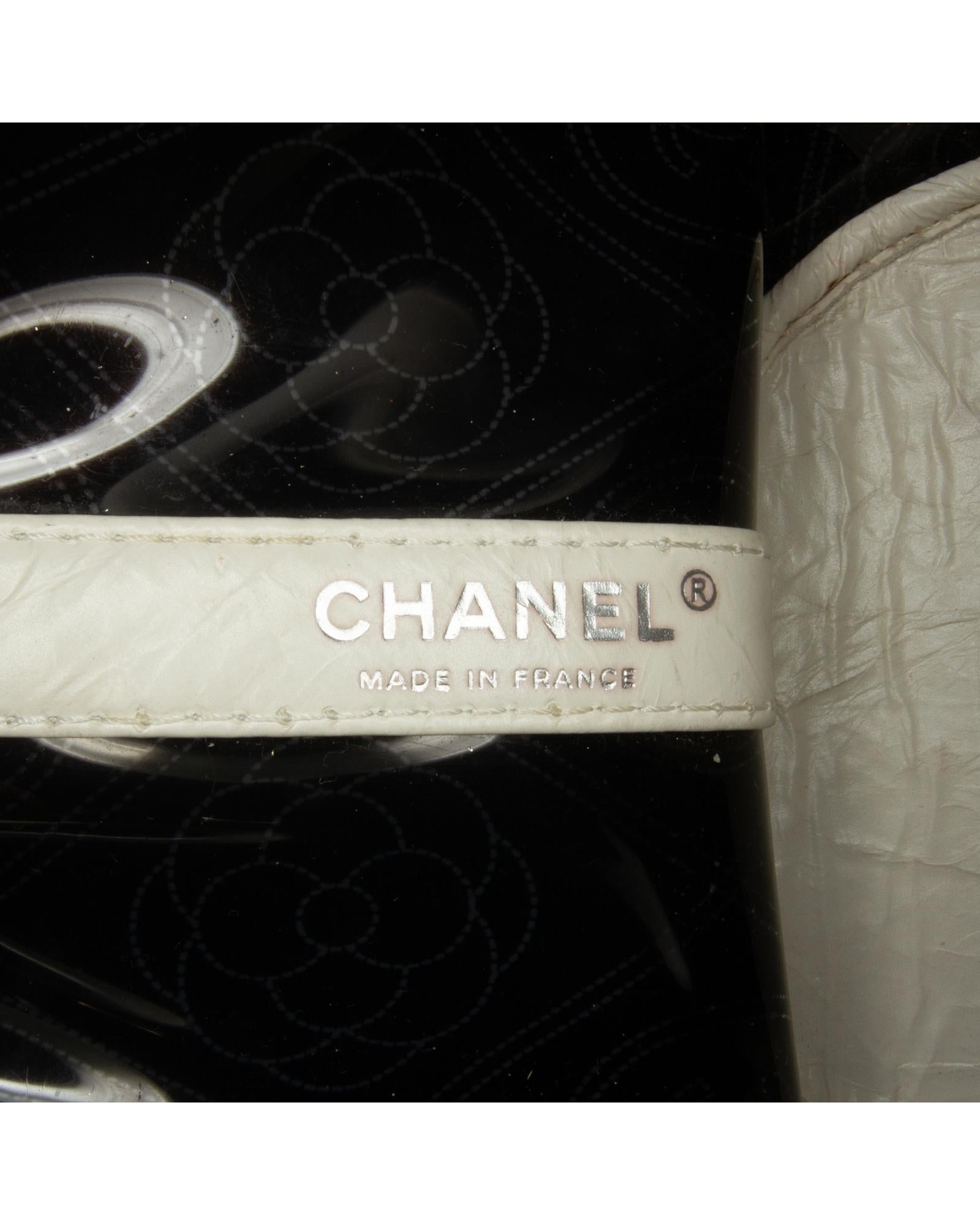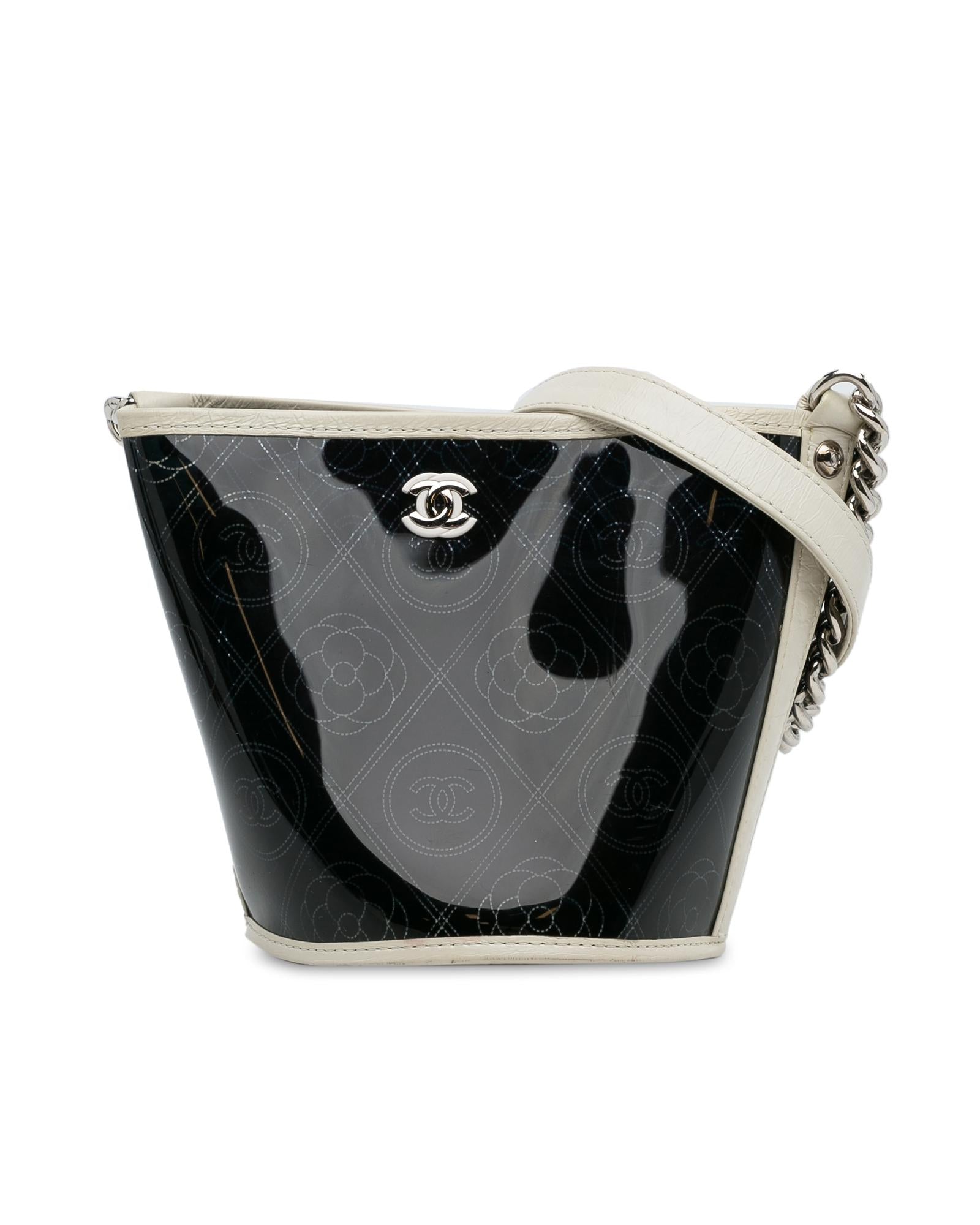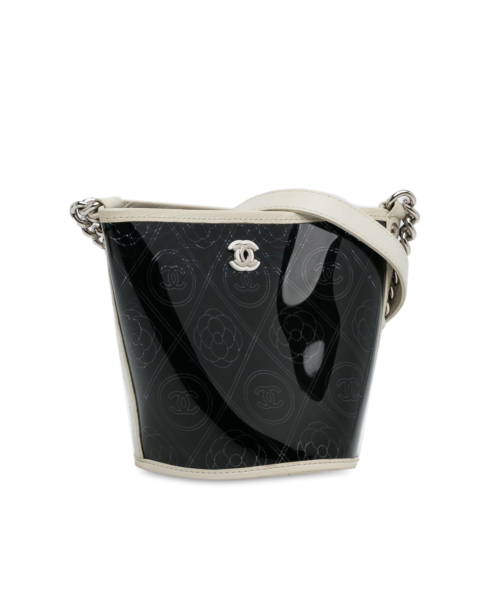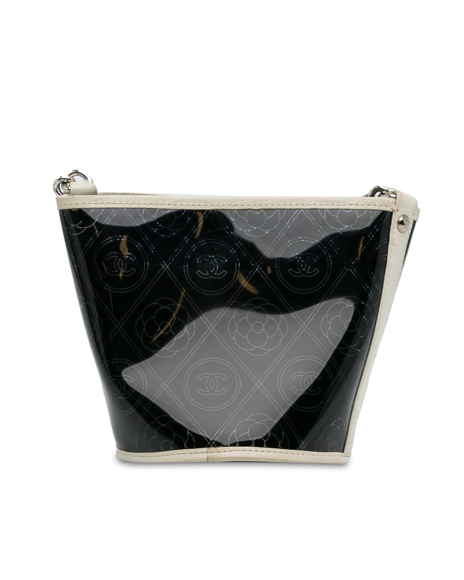 This bucket bag features a PVC body with leather trim a curb chain strap an open top and an interior zip compartment.Brand: Chanel Vintage