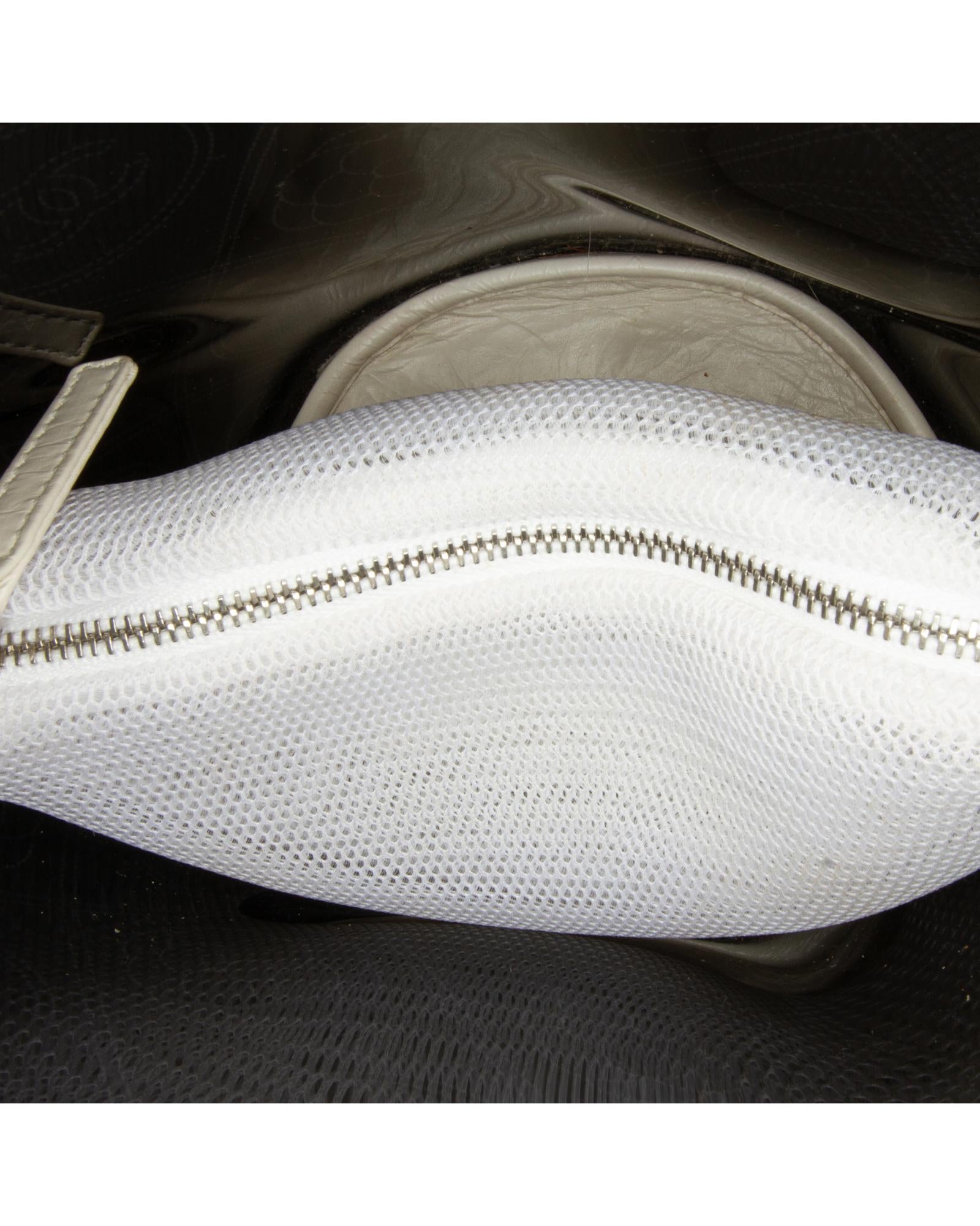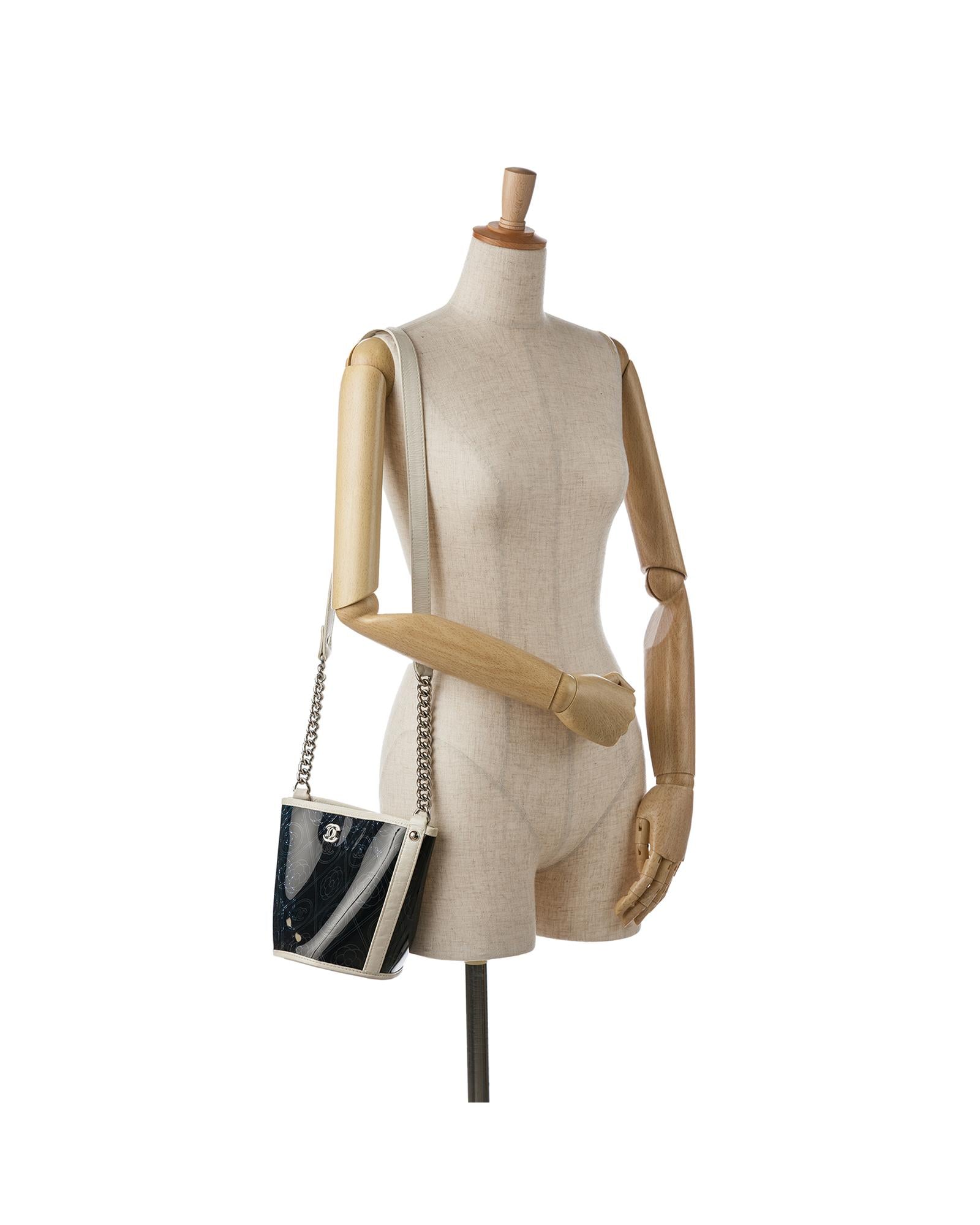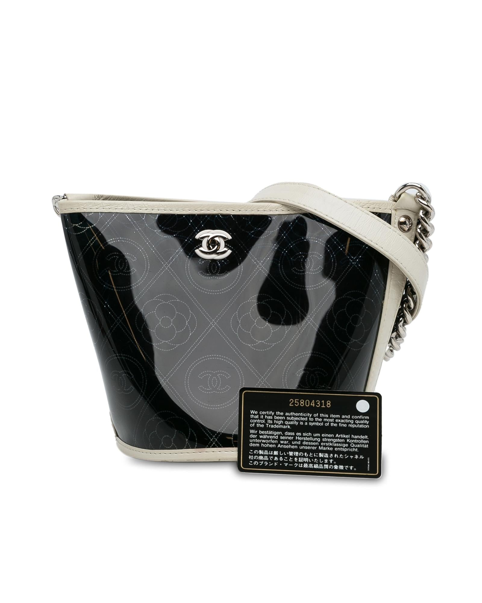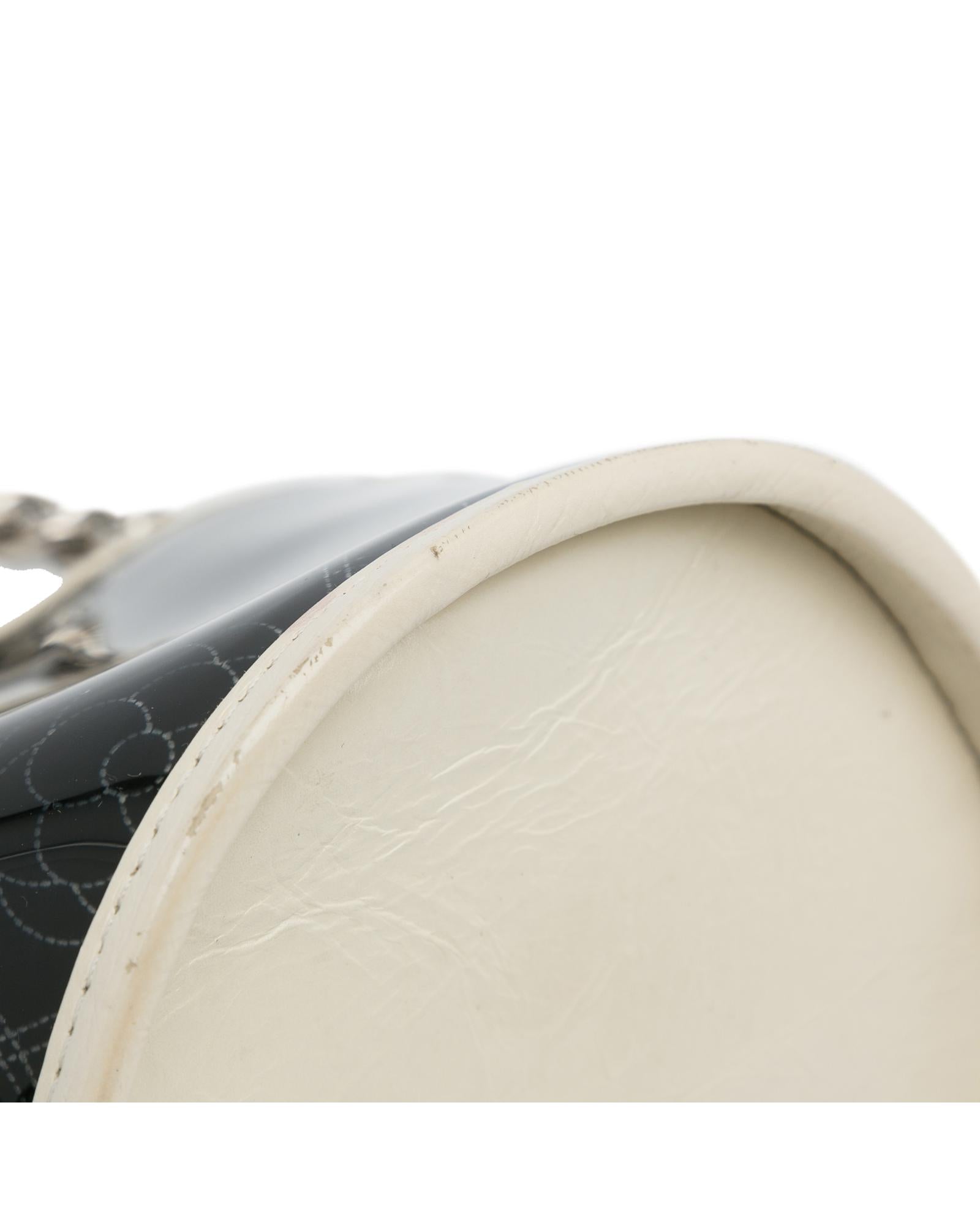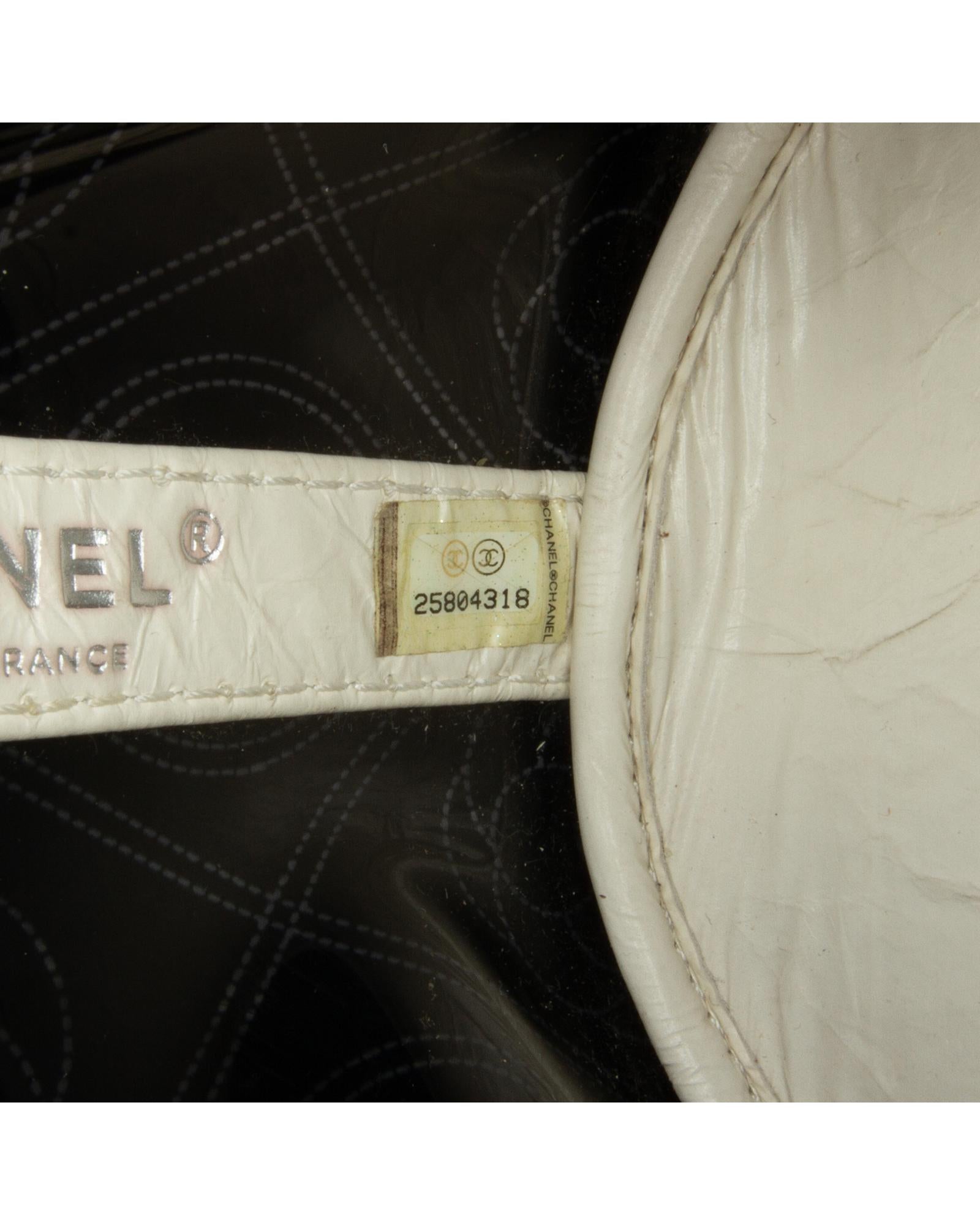 This bucket bag features a PVC body with leather trim a curb chain strap an open top and an interior zip compartment.Brand: Chanel Vintage