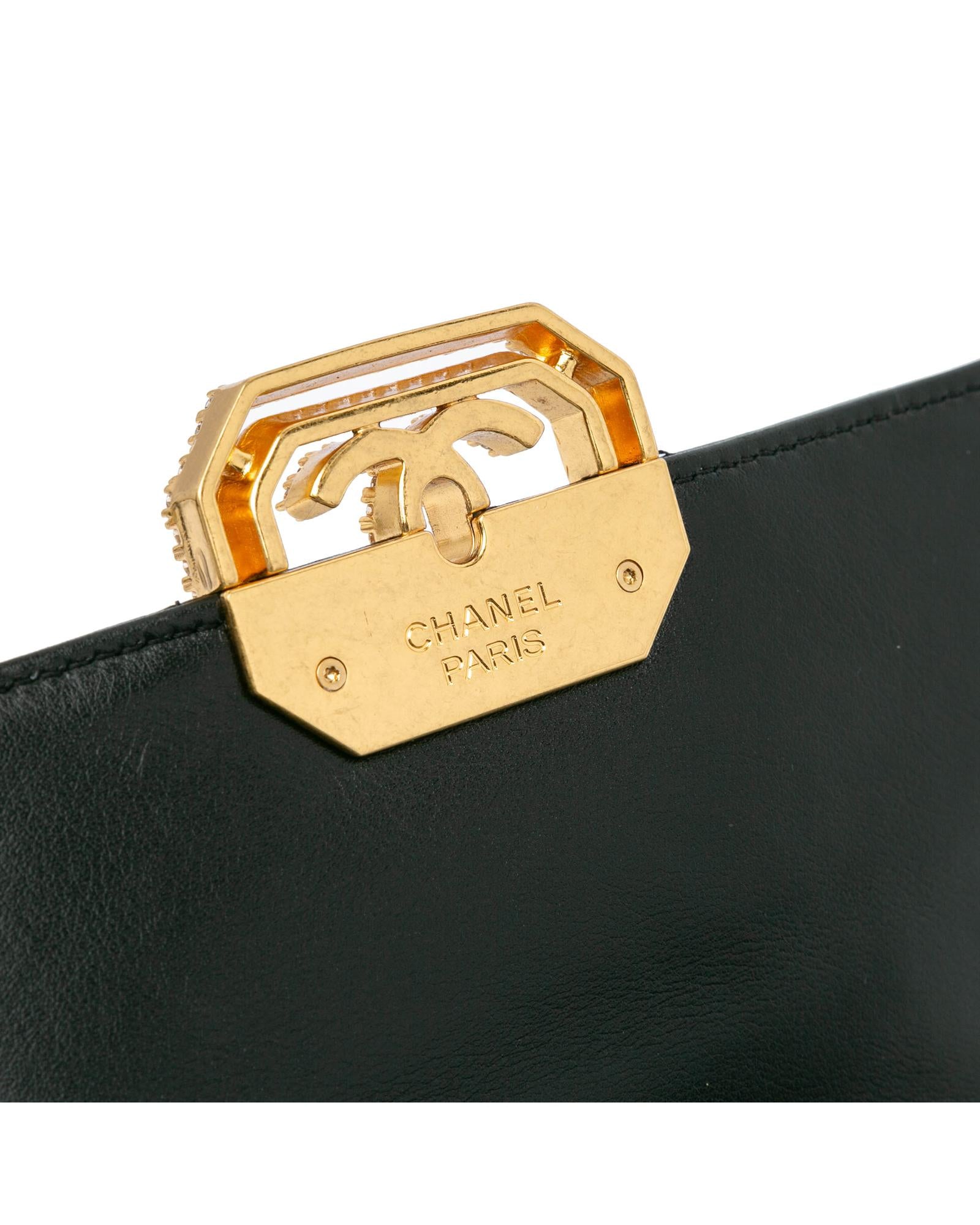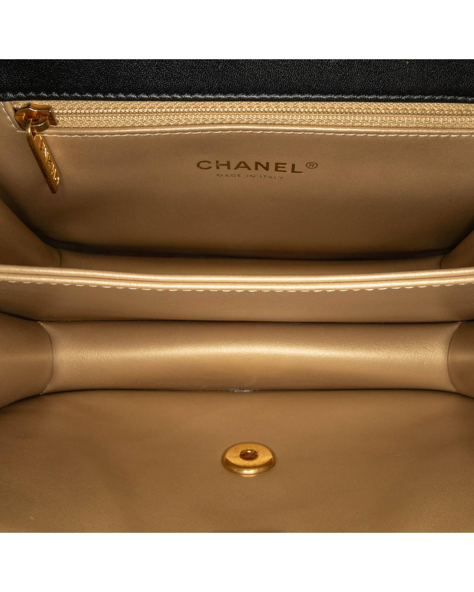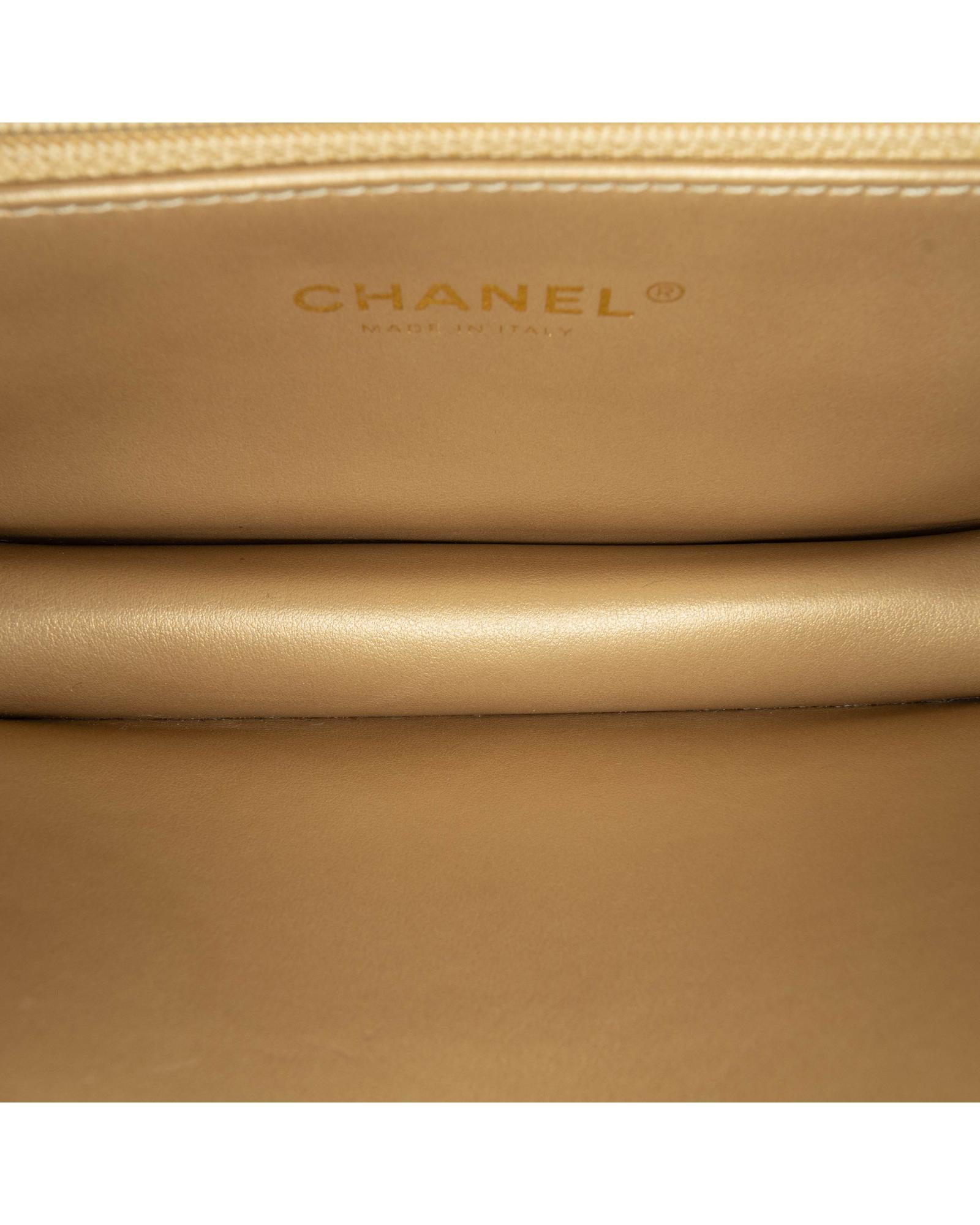 This crossbody bag features lambskin leather body a leather woven chain link shoulder strap a front flap with clasp closure and an interior zip pocket.Brand: Chanel Vintage