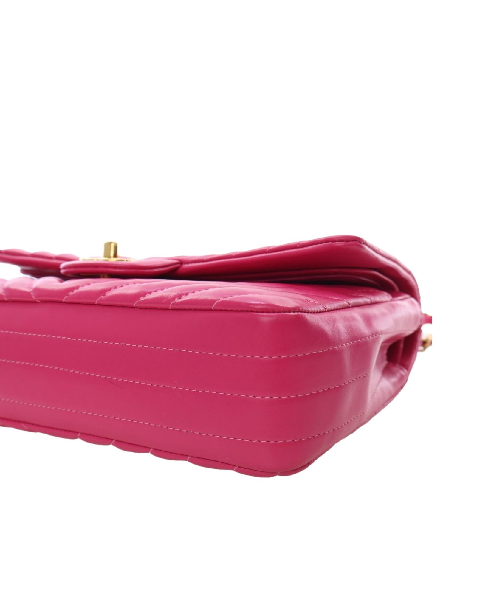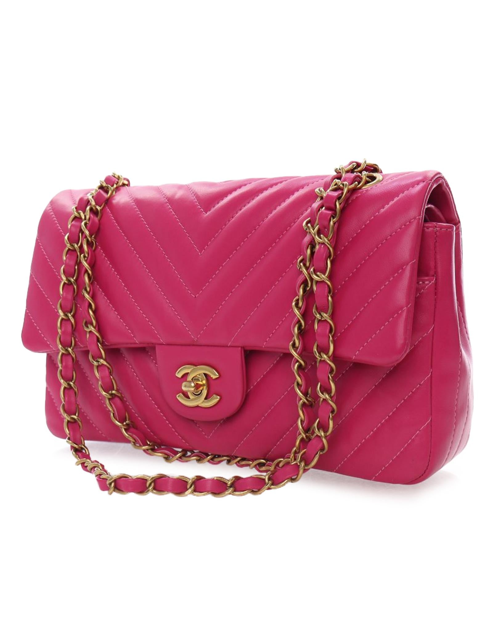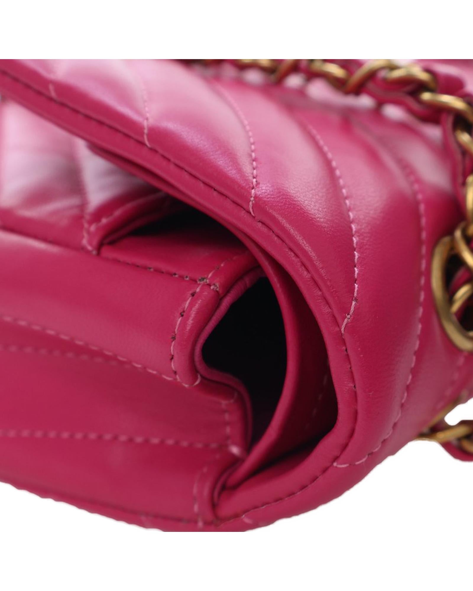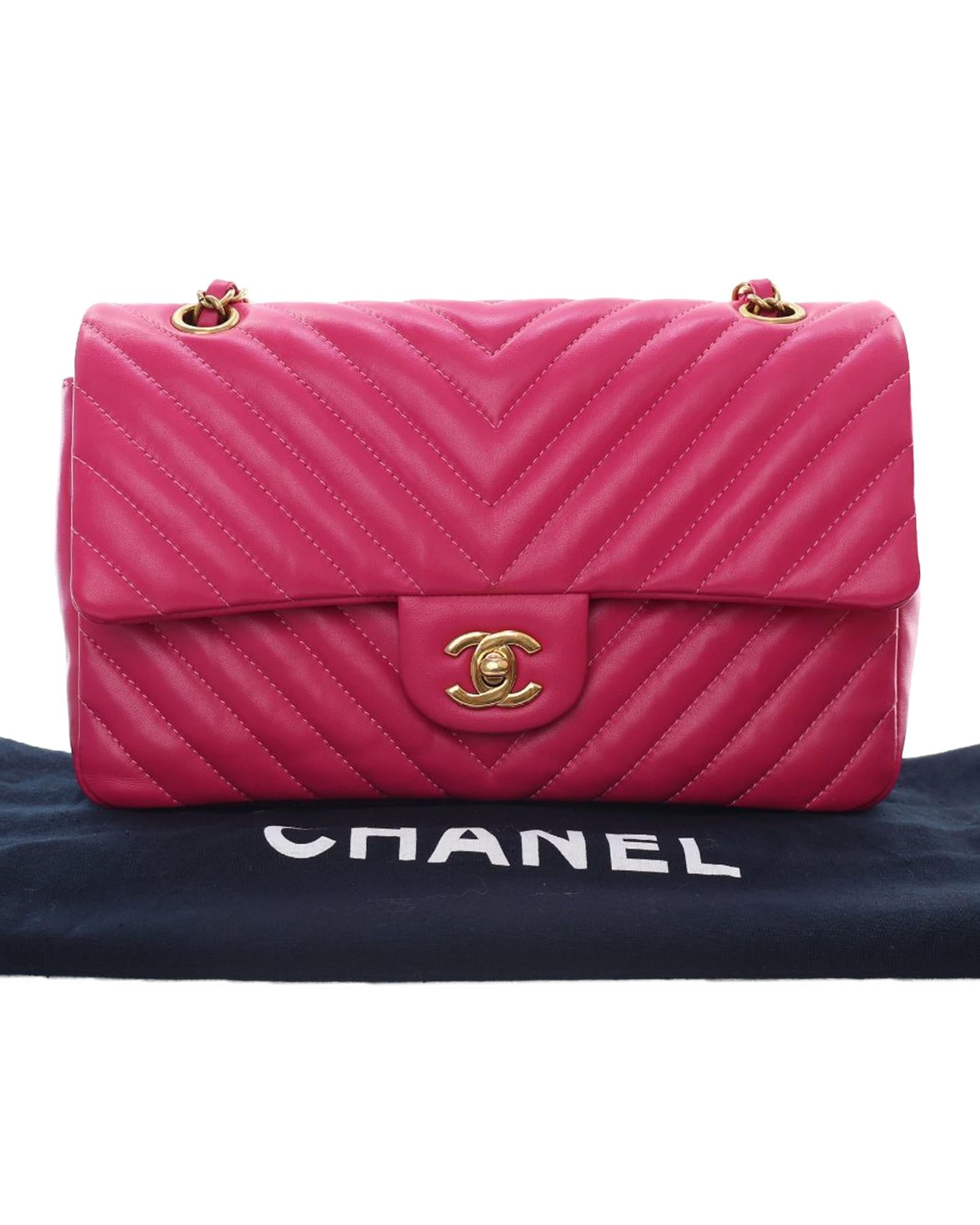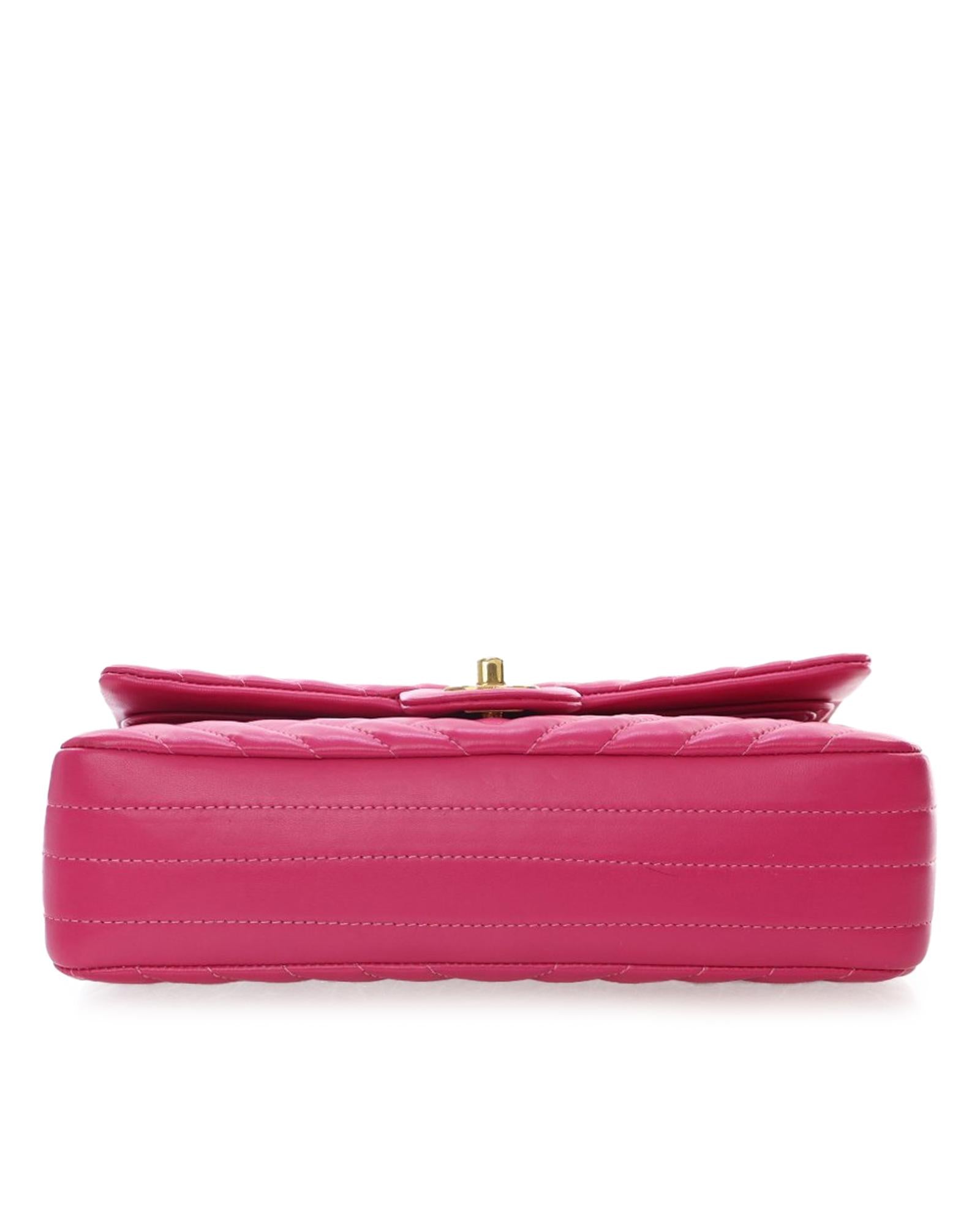This shoulder bag features a quilted lambskin leather body leather woven chain shoulder straps front flaps with interlocking Cs and twist lock closure an exterior back slip pocket and interior zip and slip pockets.