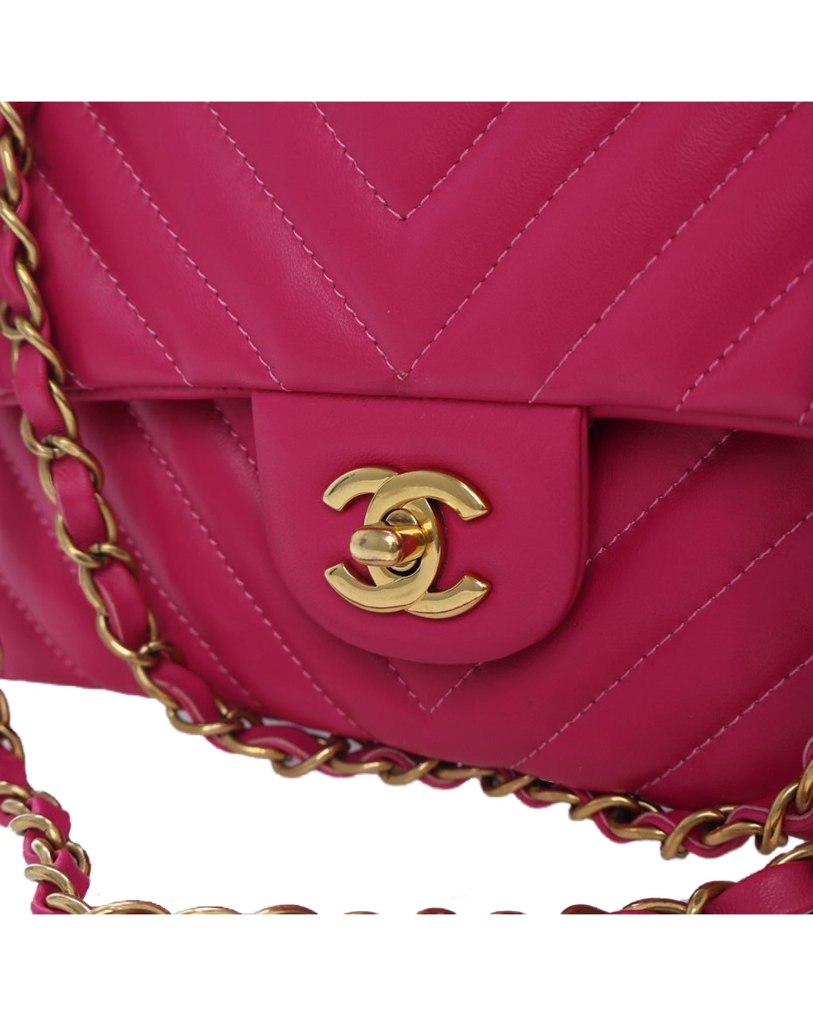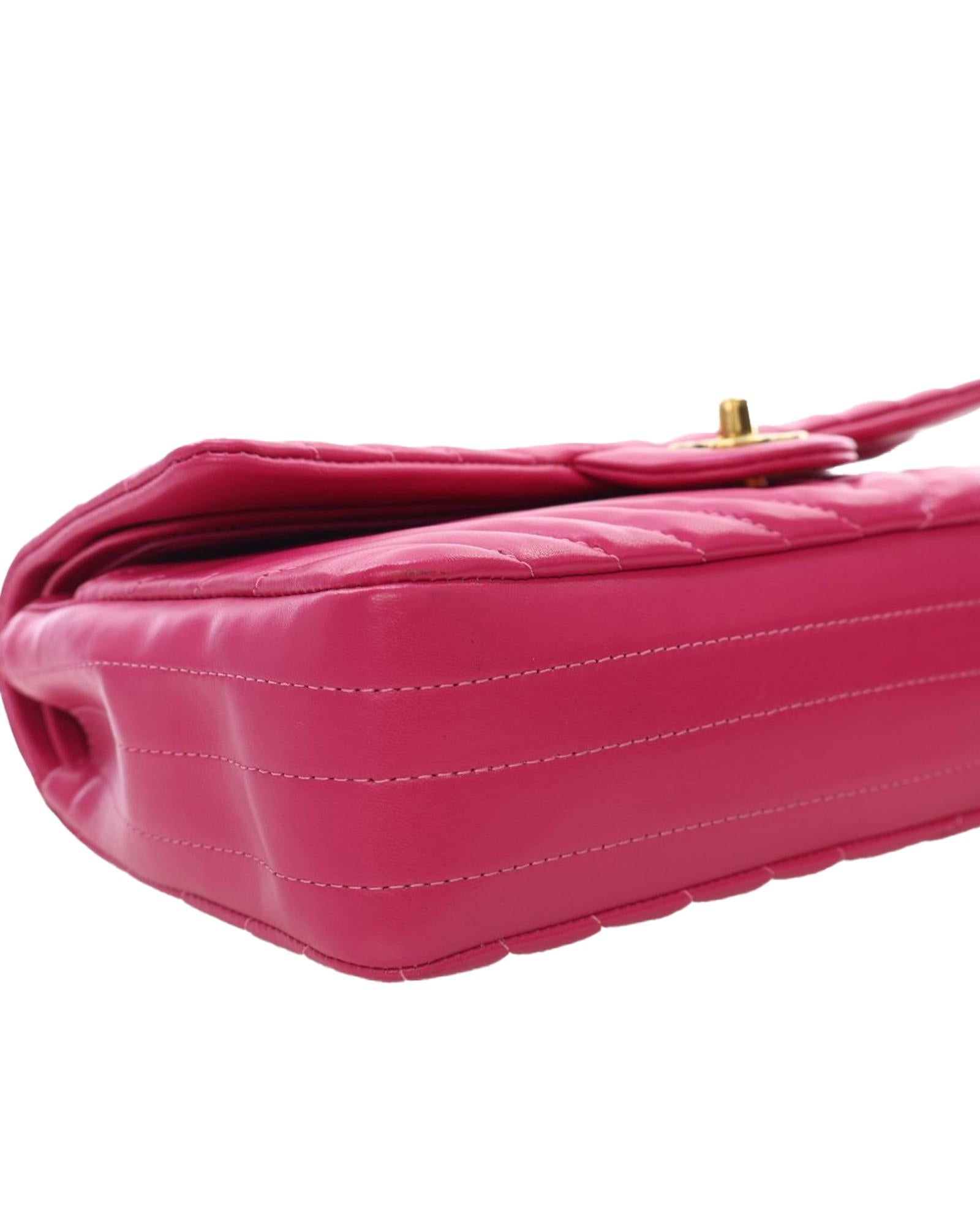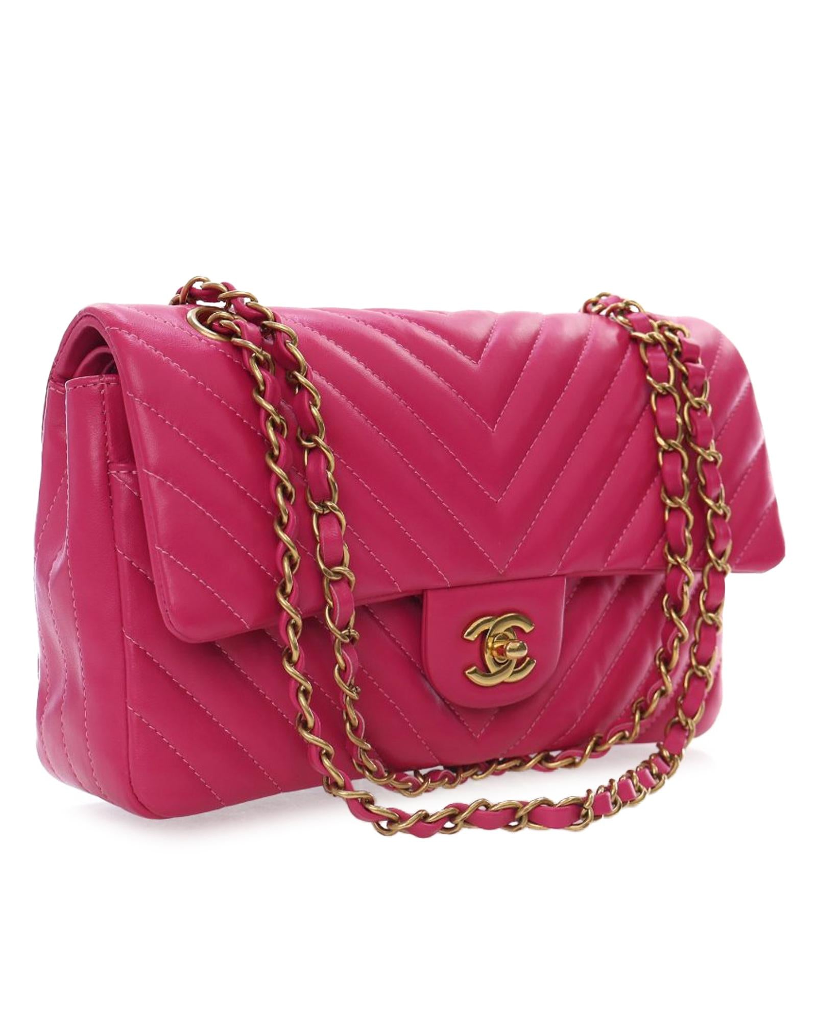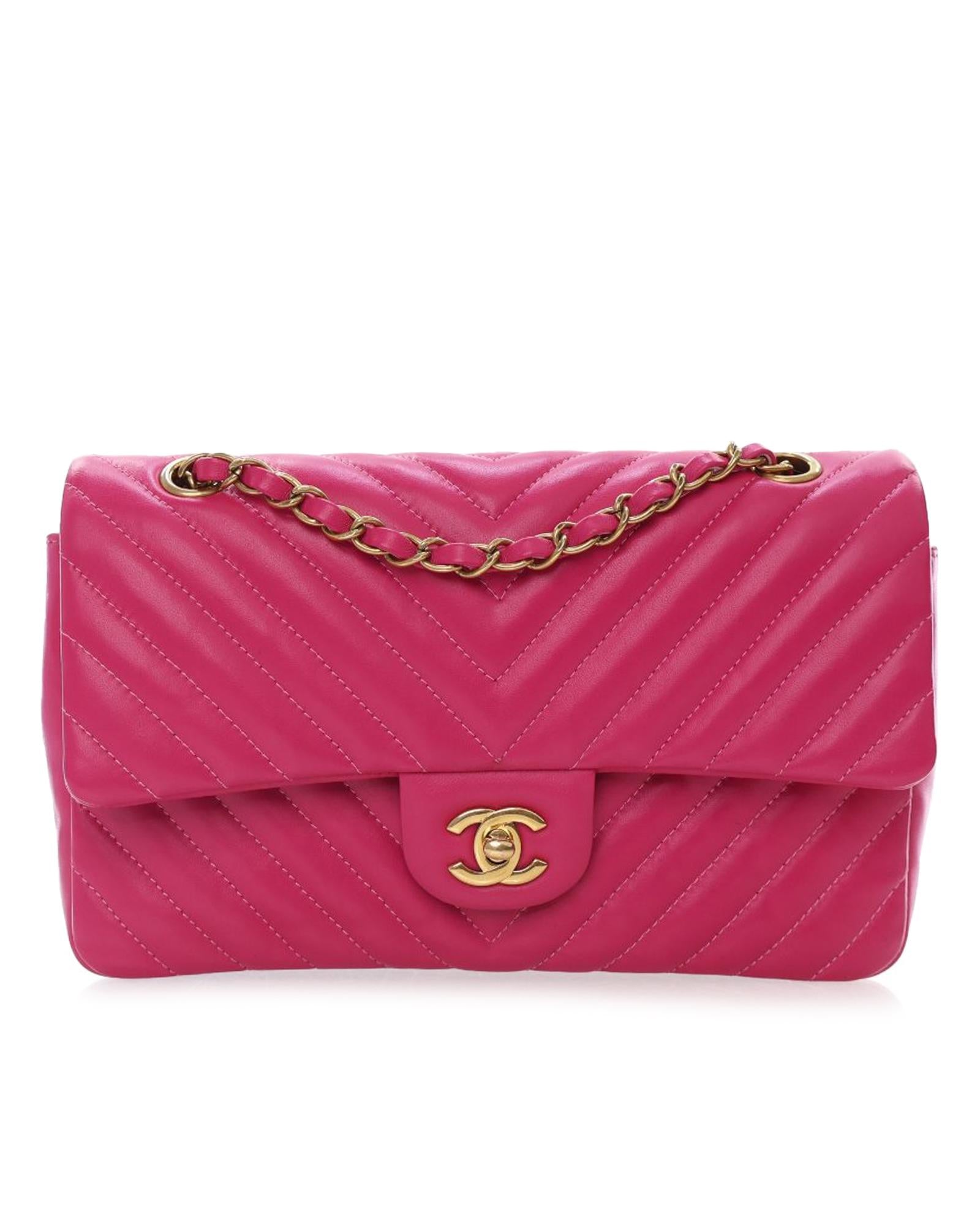 This shoulder bag features a quilted lambskin leather body leather woven chain shoulder straps front flaps with interlocking Cs and twist lock closure an exterior back slip pocket and interior zip and slip pockets.