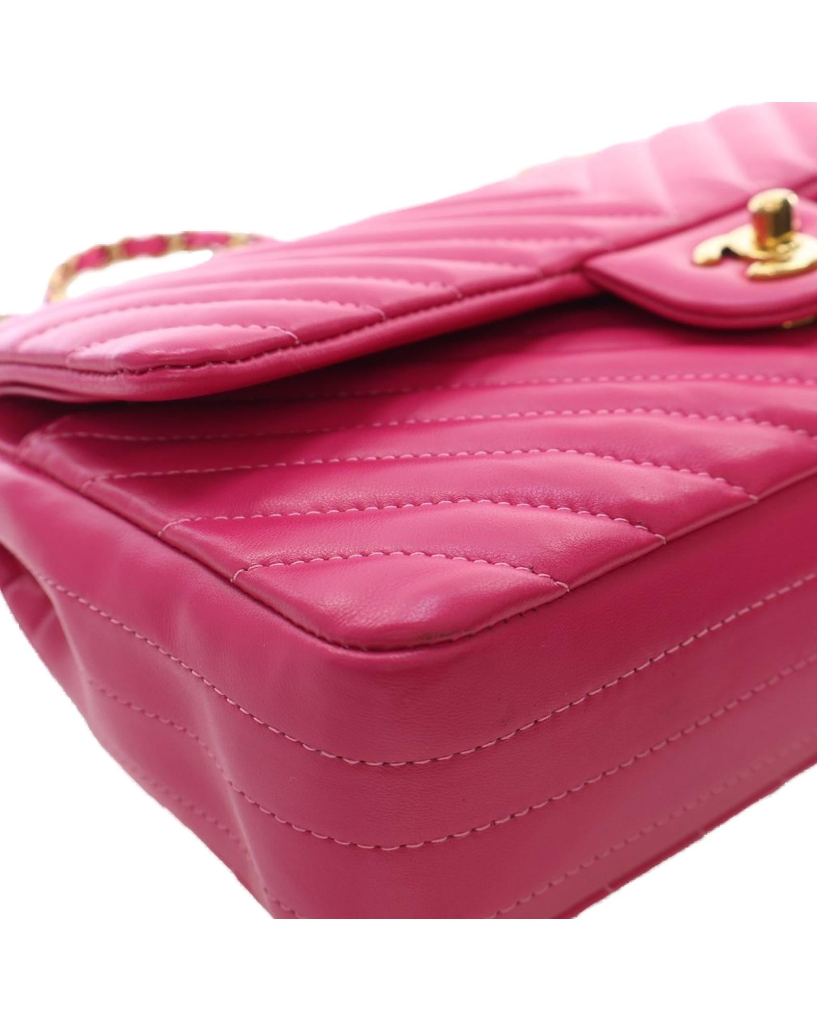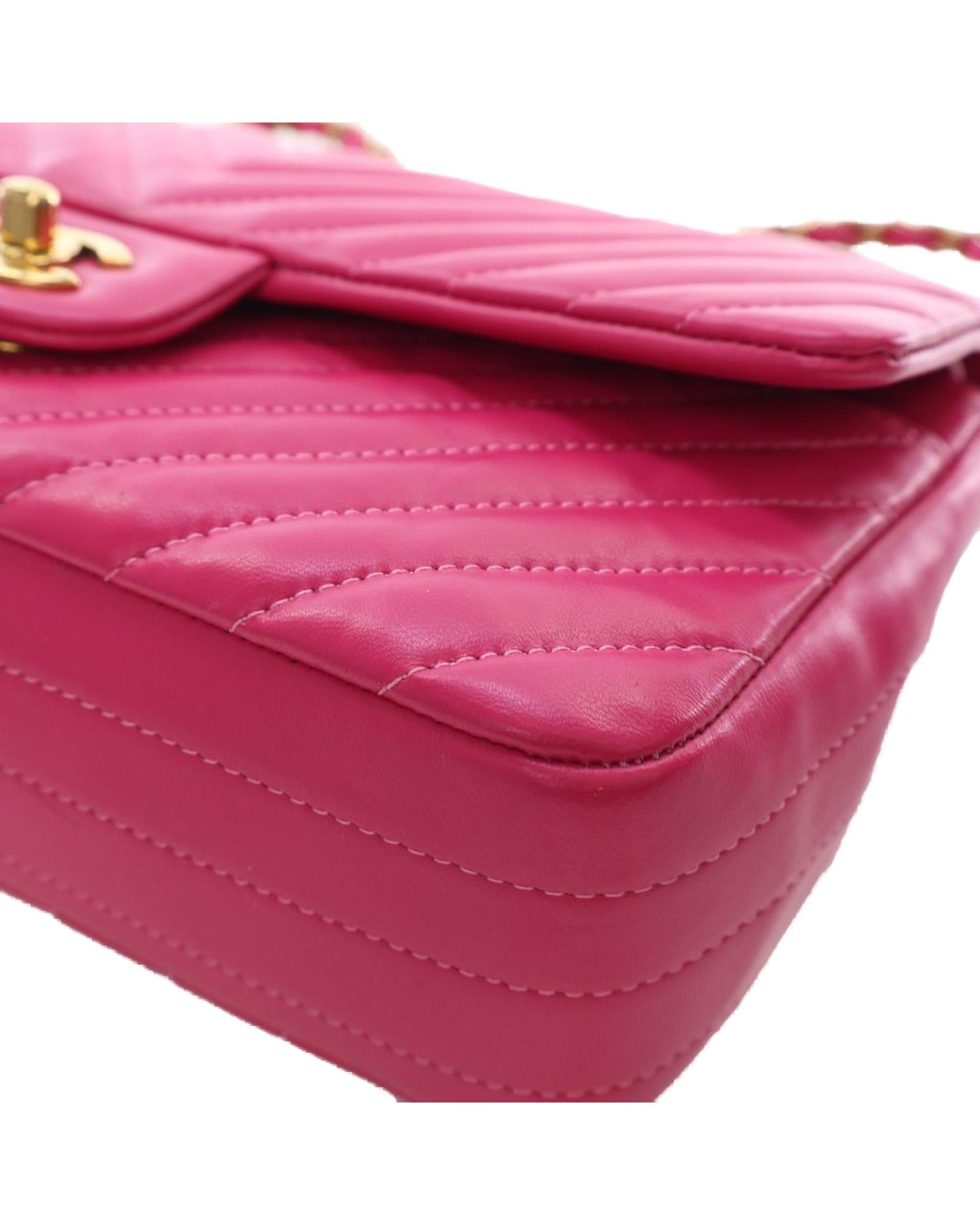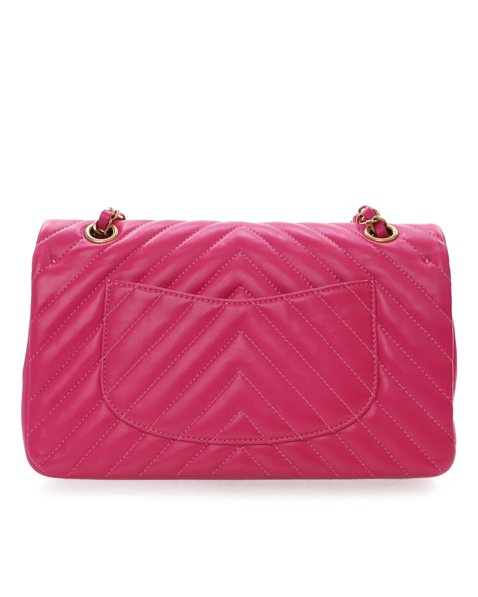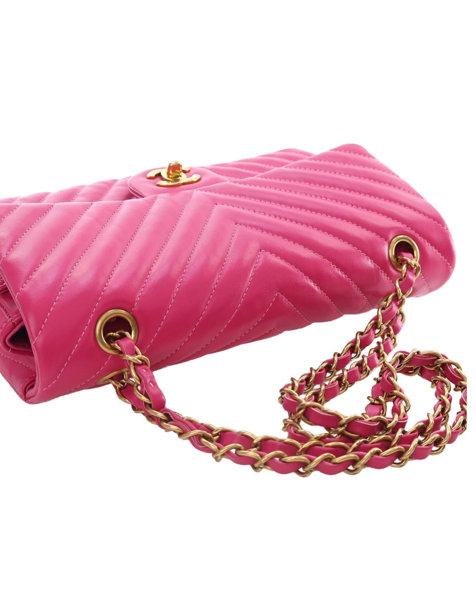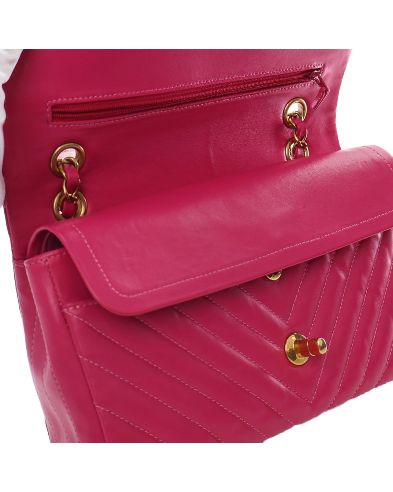 This shoulder bag features a quilted lambskin leather body leather woven chain shoulder straps front flaps with interlocking Cs and twist lock closure an exterior back slip pocket and interior zip and slip pockets.