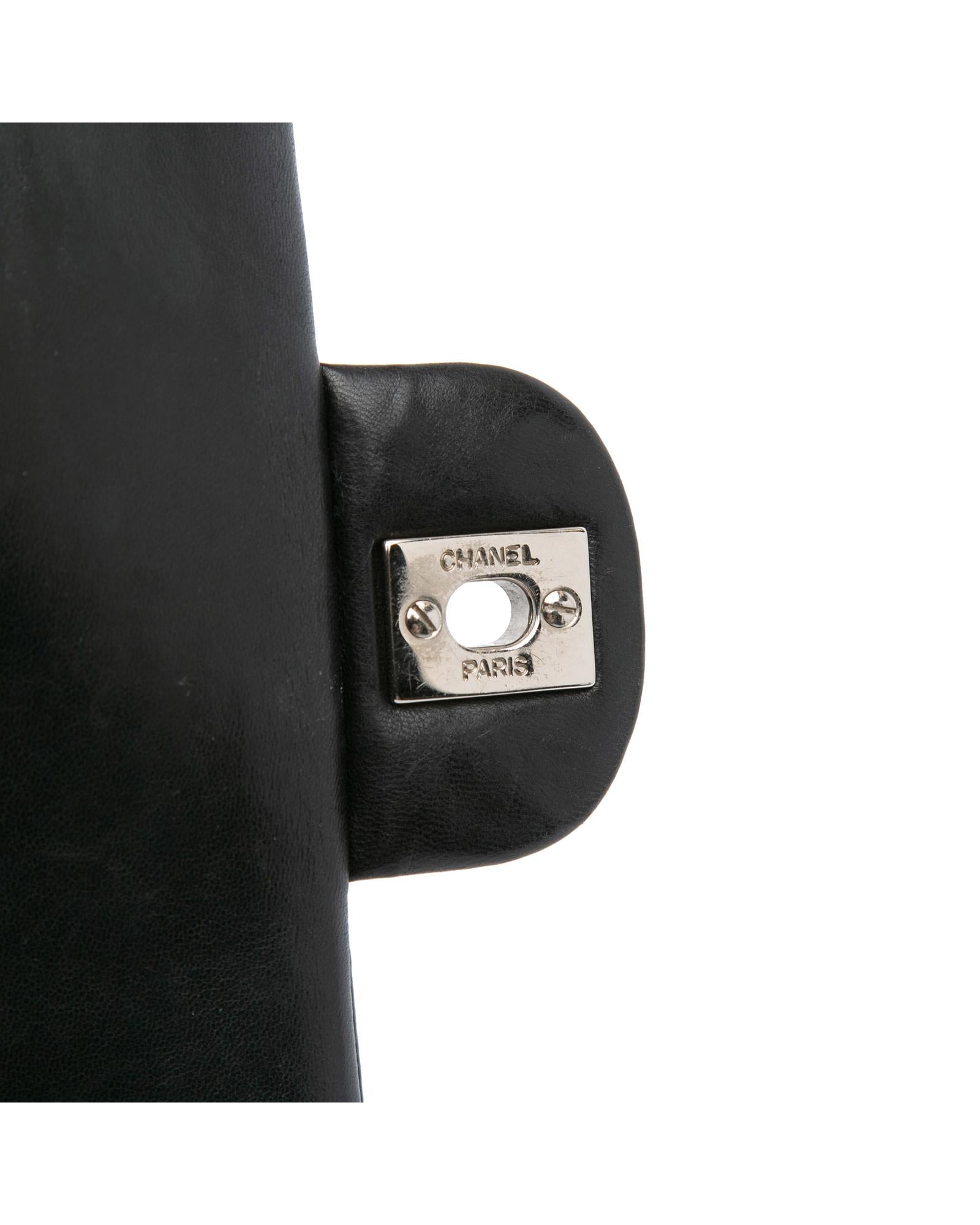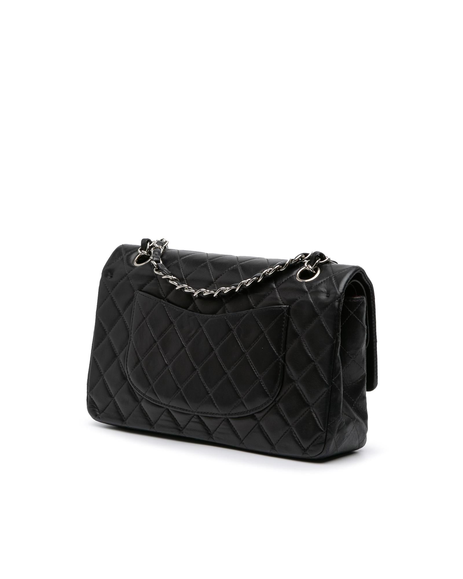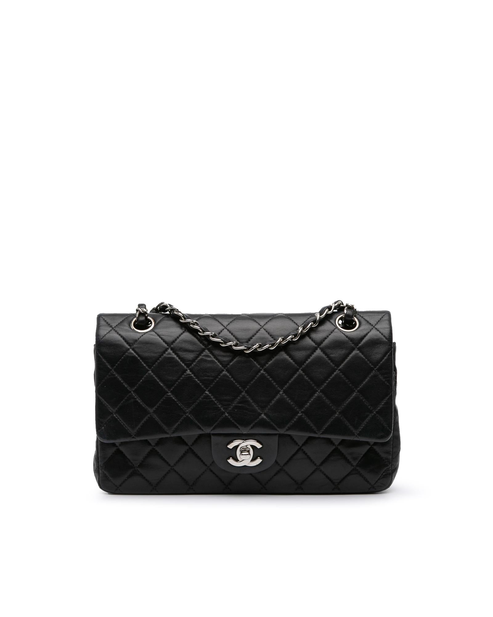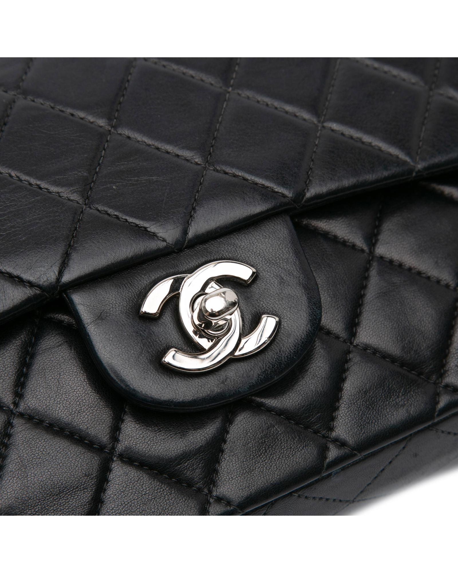 This shoulder bag features a quilted lambskin body a back exterior slip pocket leather woven chain straps double front flaps with interlocking Cs and a twist lock closure and interior zip and slip pockets.