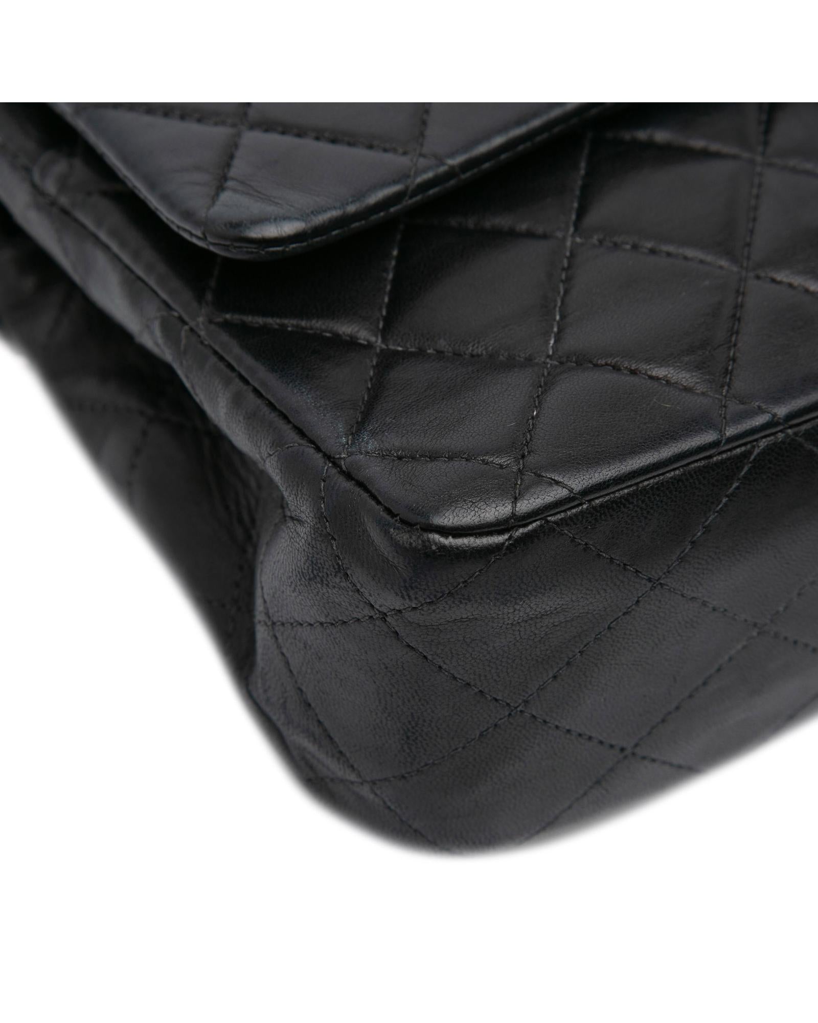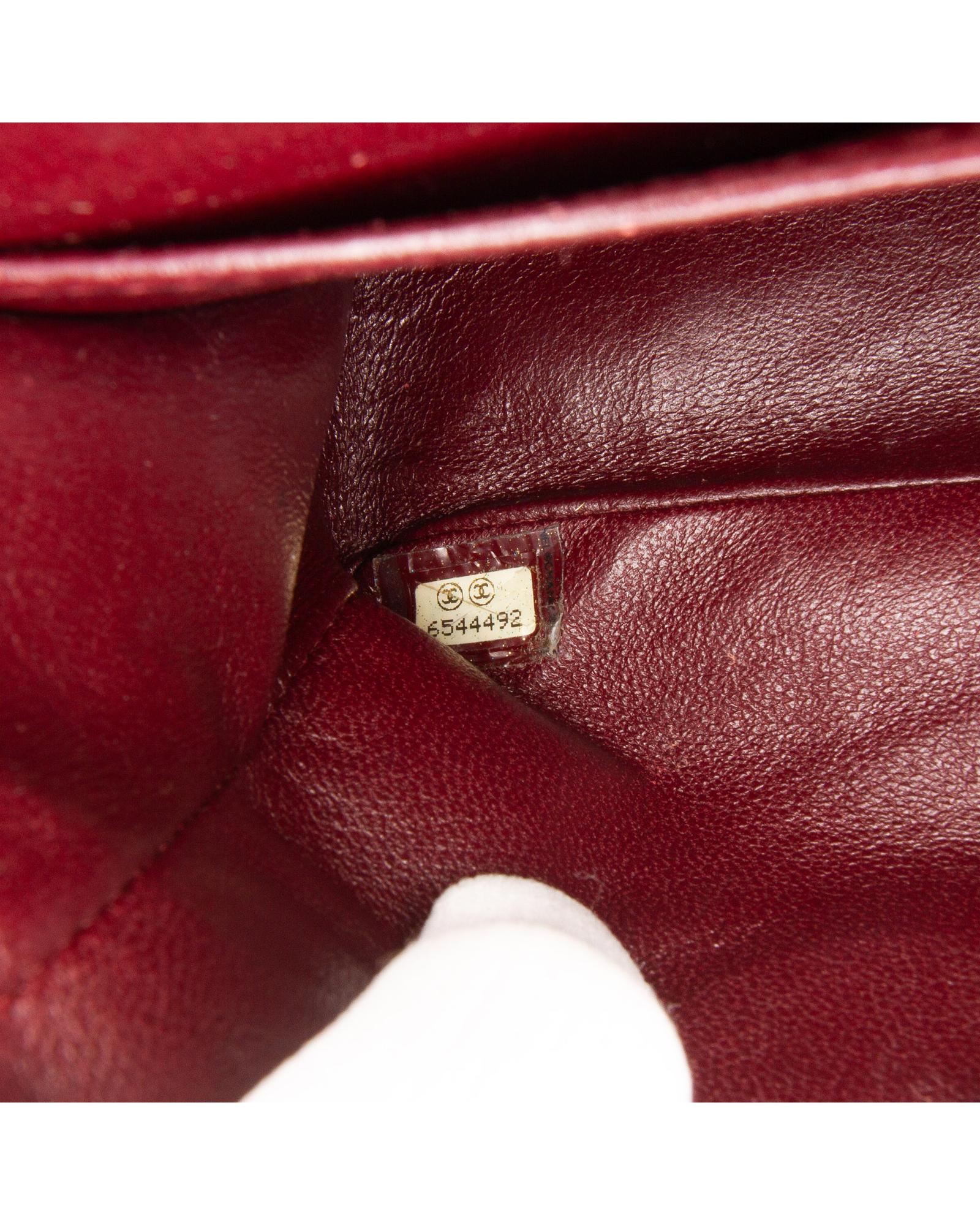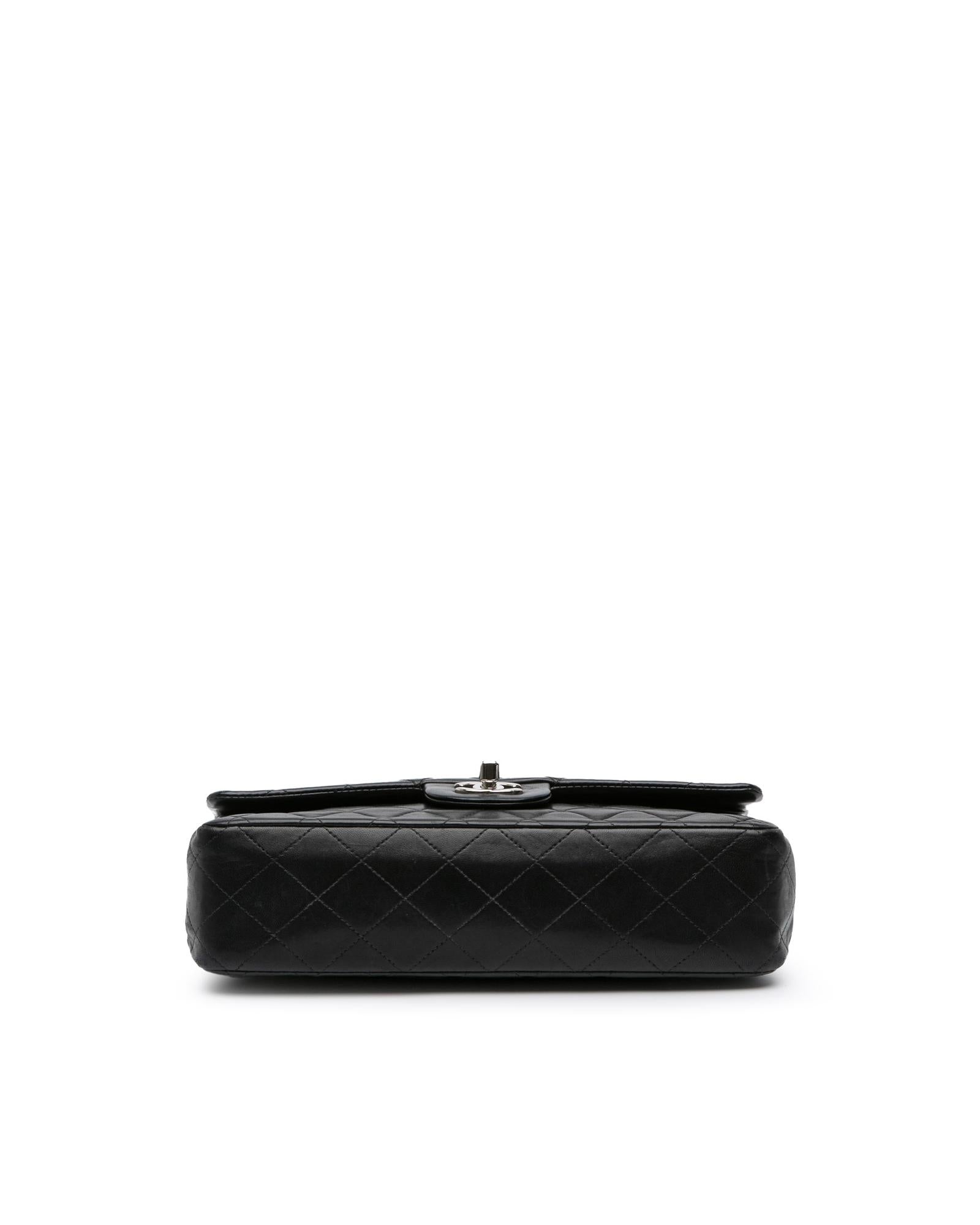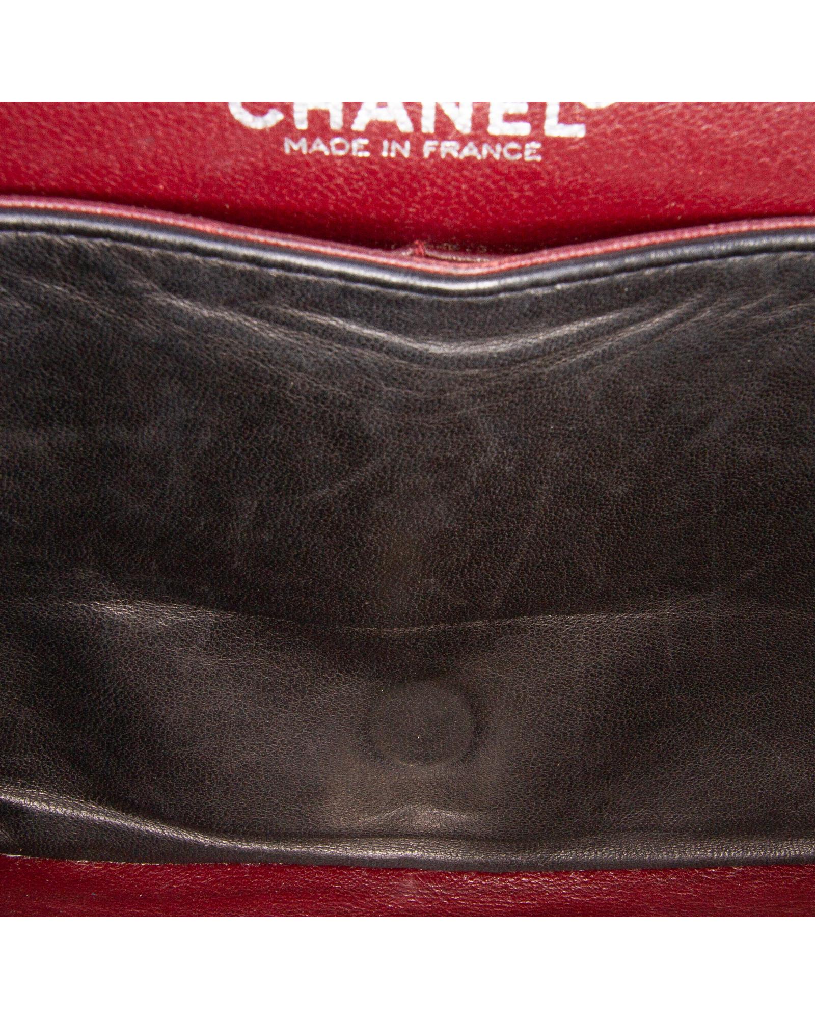 This shoulder bag features a quilted lambskin body a back exterior slip pocket leather woven chain straps double front flaps with interlocking Cs and a twist lock closure and interior zip and slip pockets.