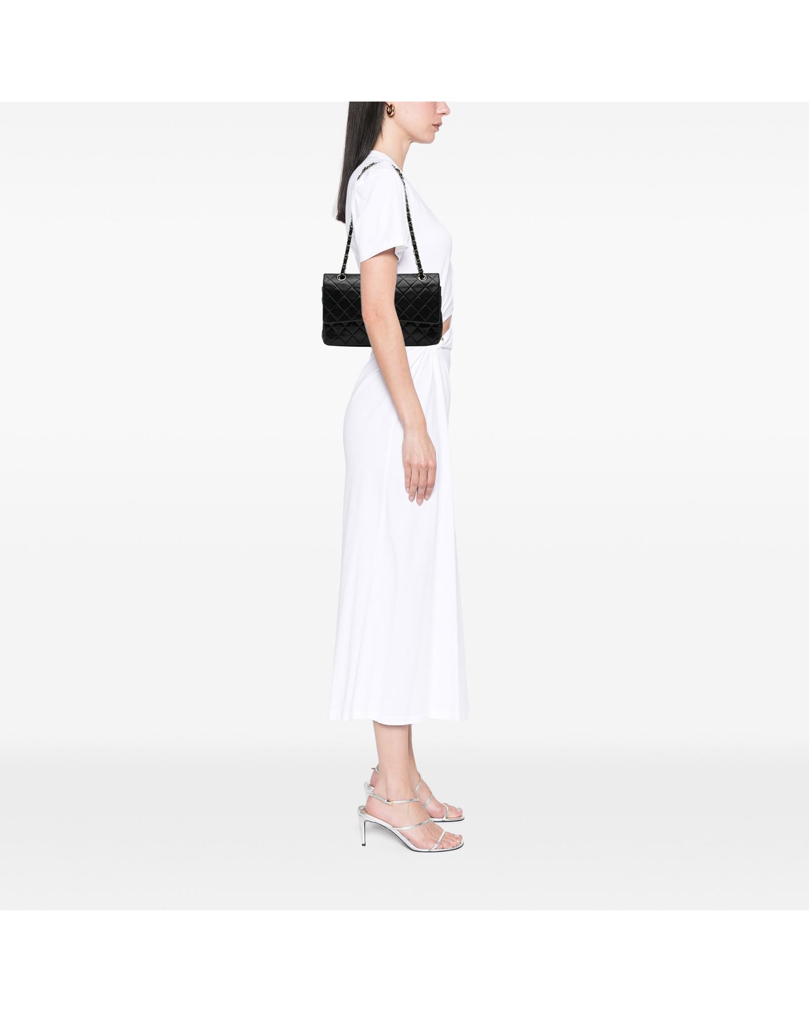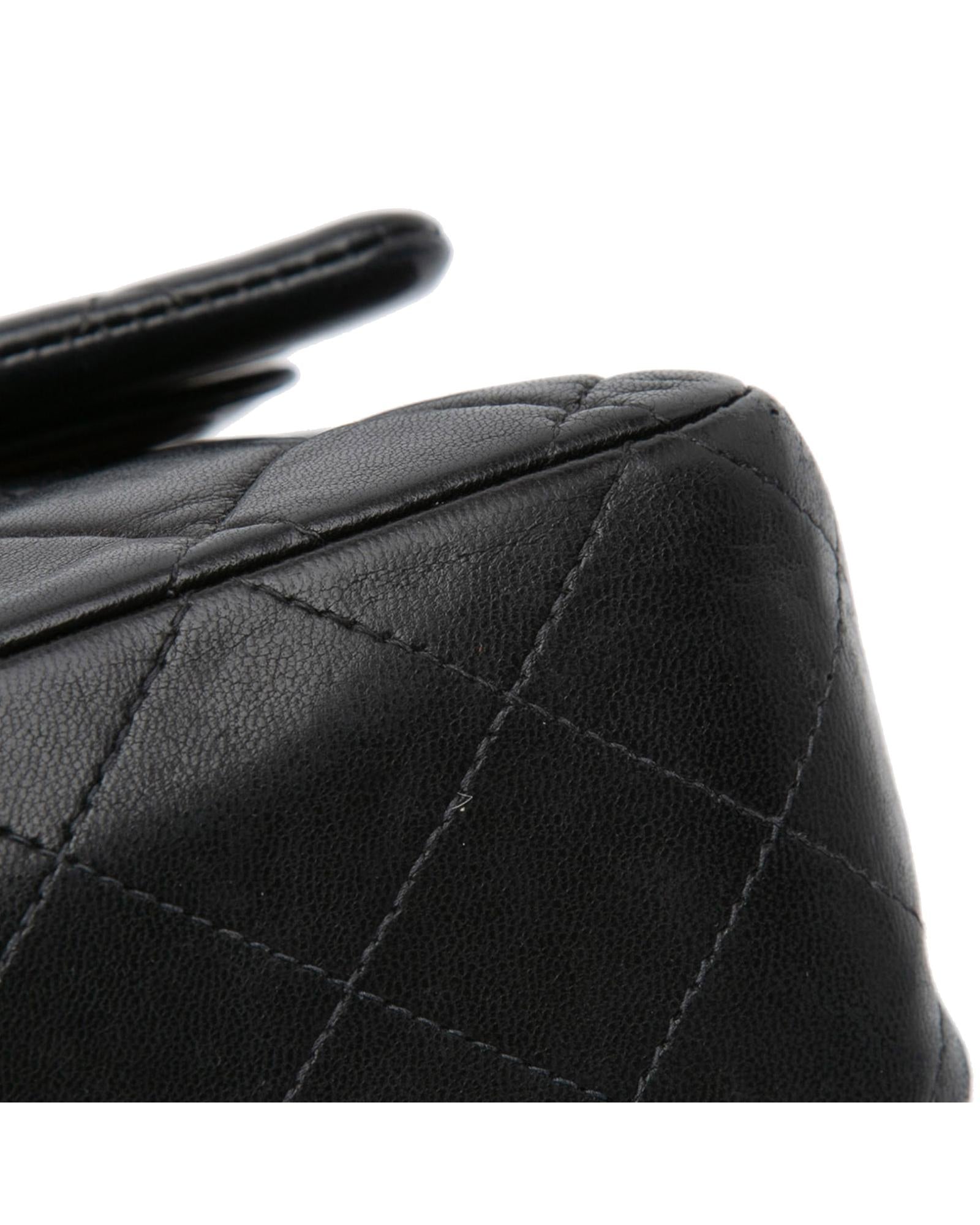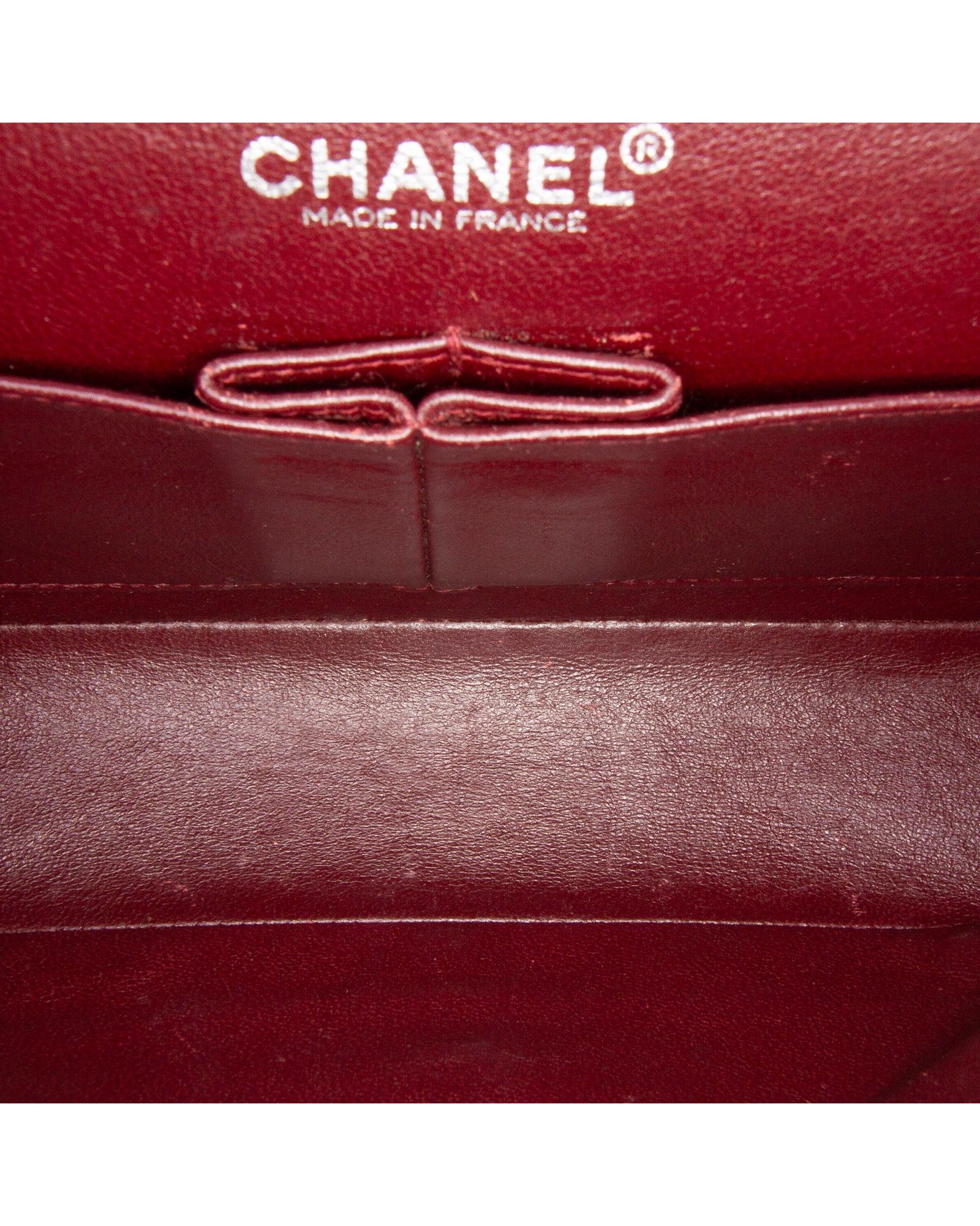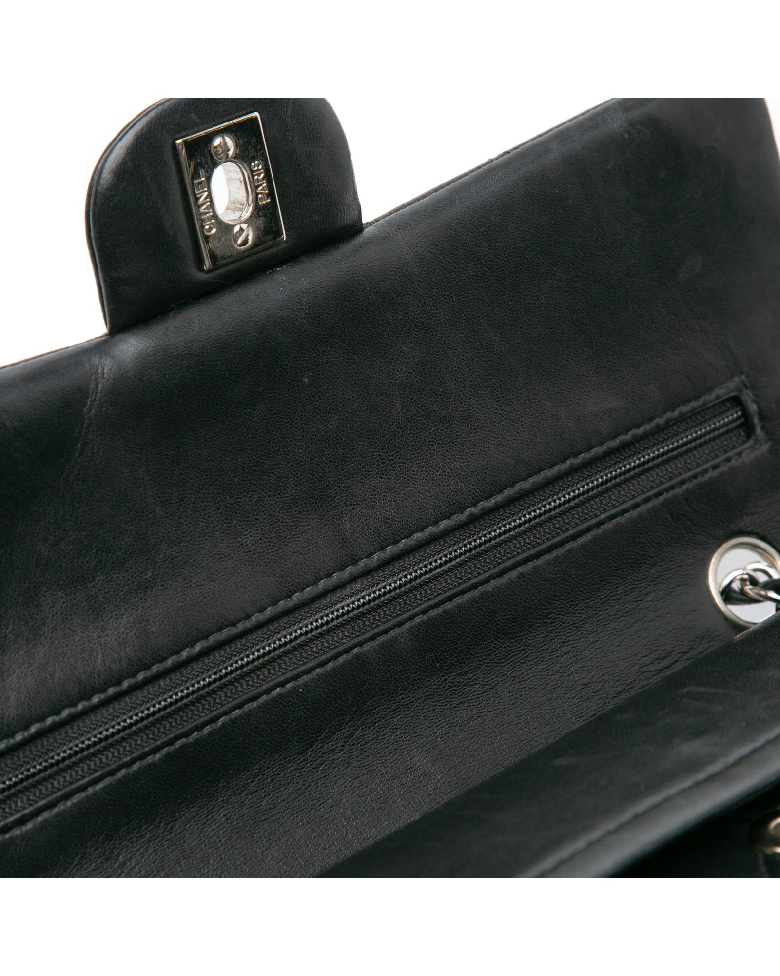 This shoulder bag features a quilted lambskin body a back exterior slip pocket leather woven chain straps double front flaps with interlocking Cs and a twist lock closure and interior zip and slip pockets.