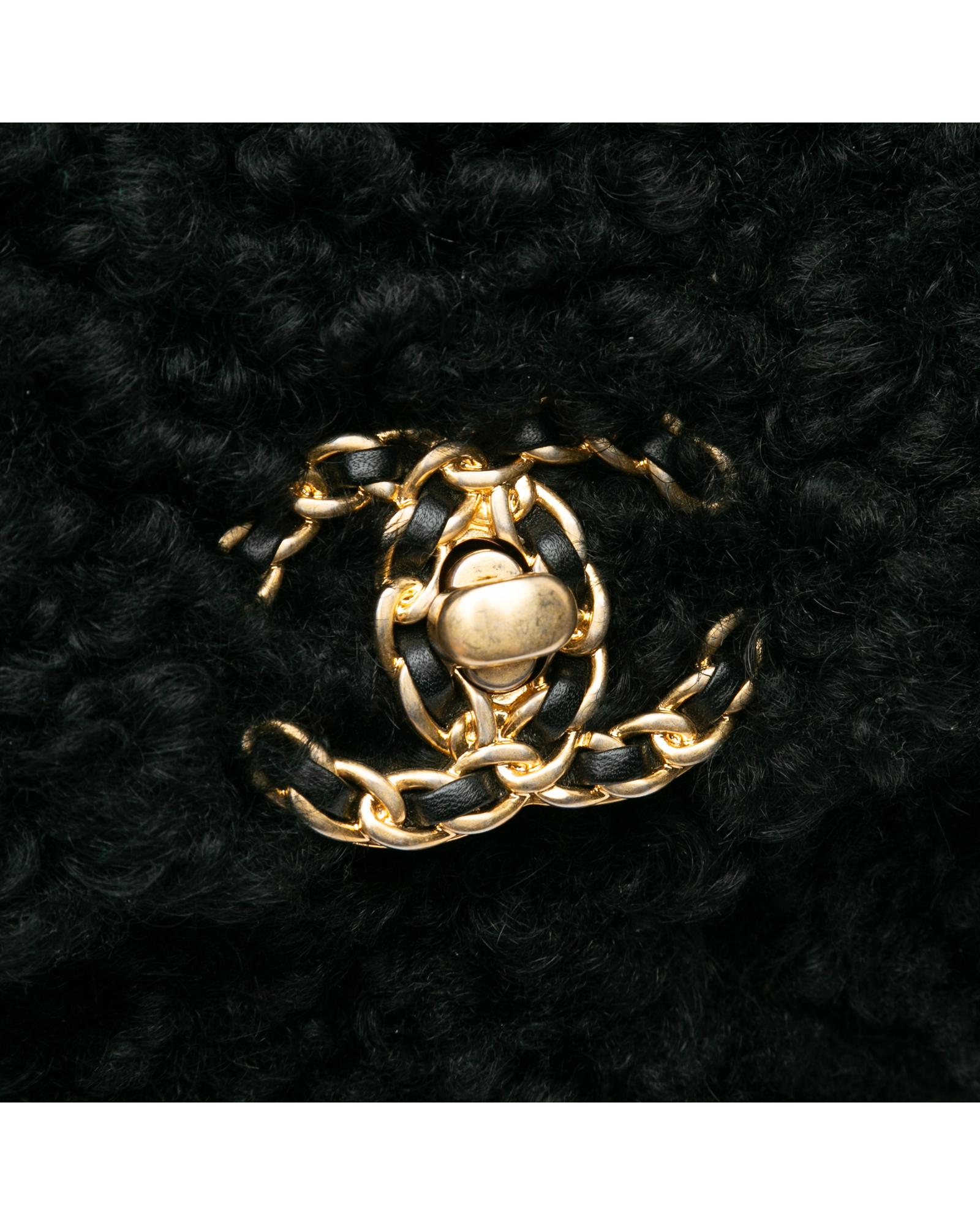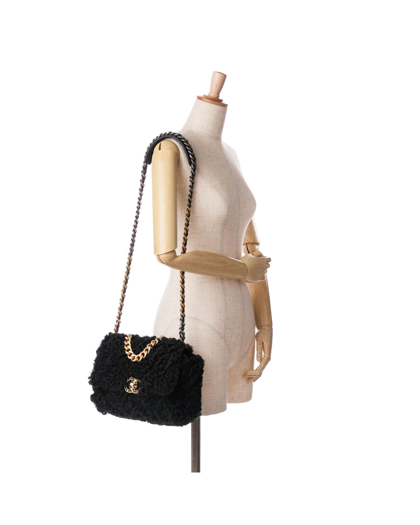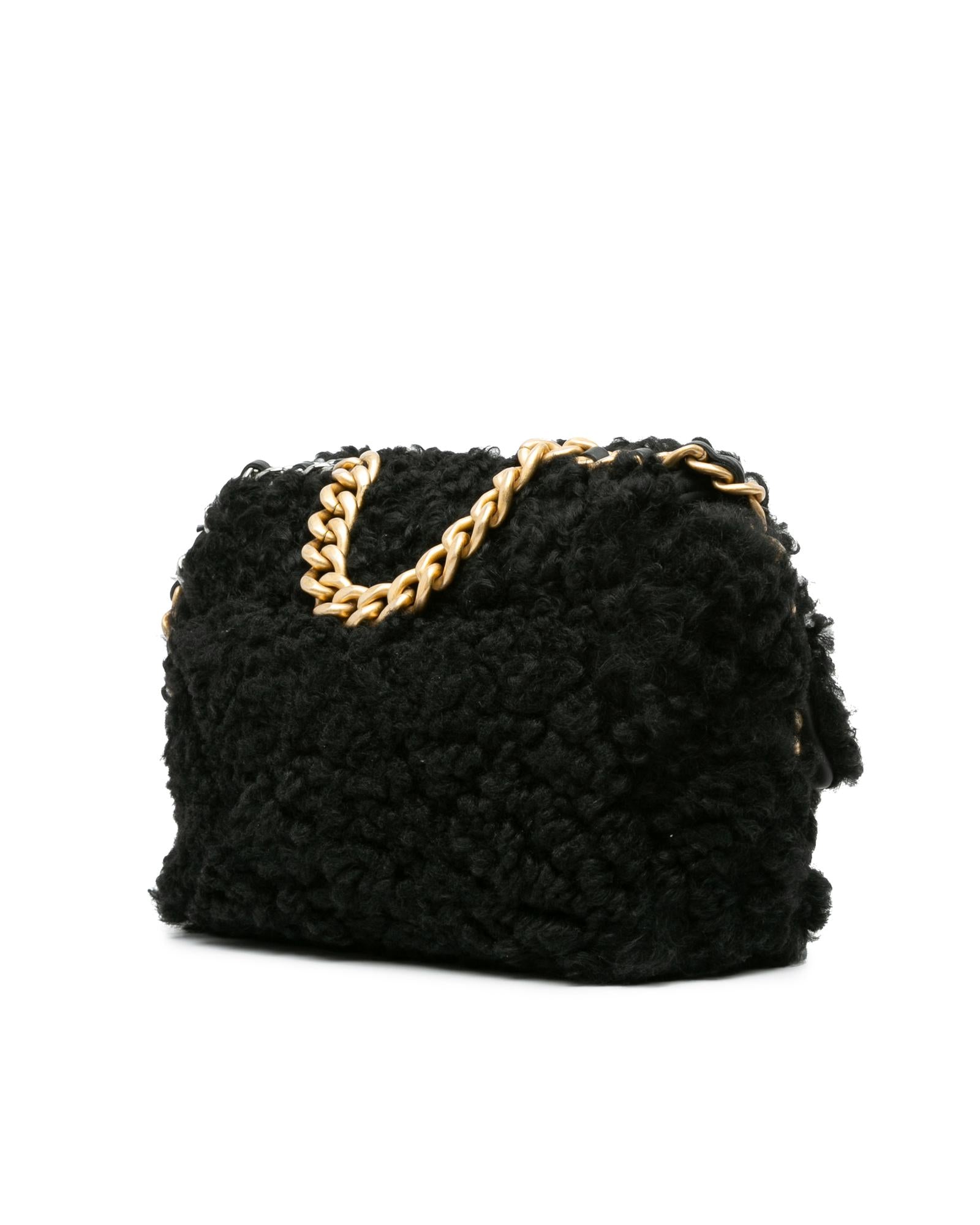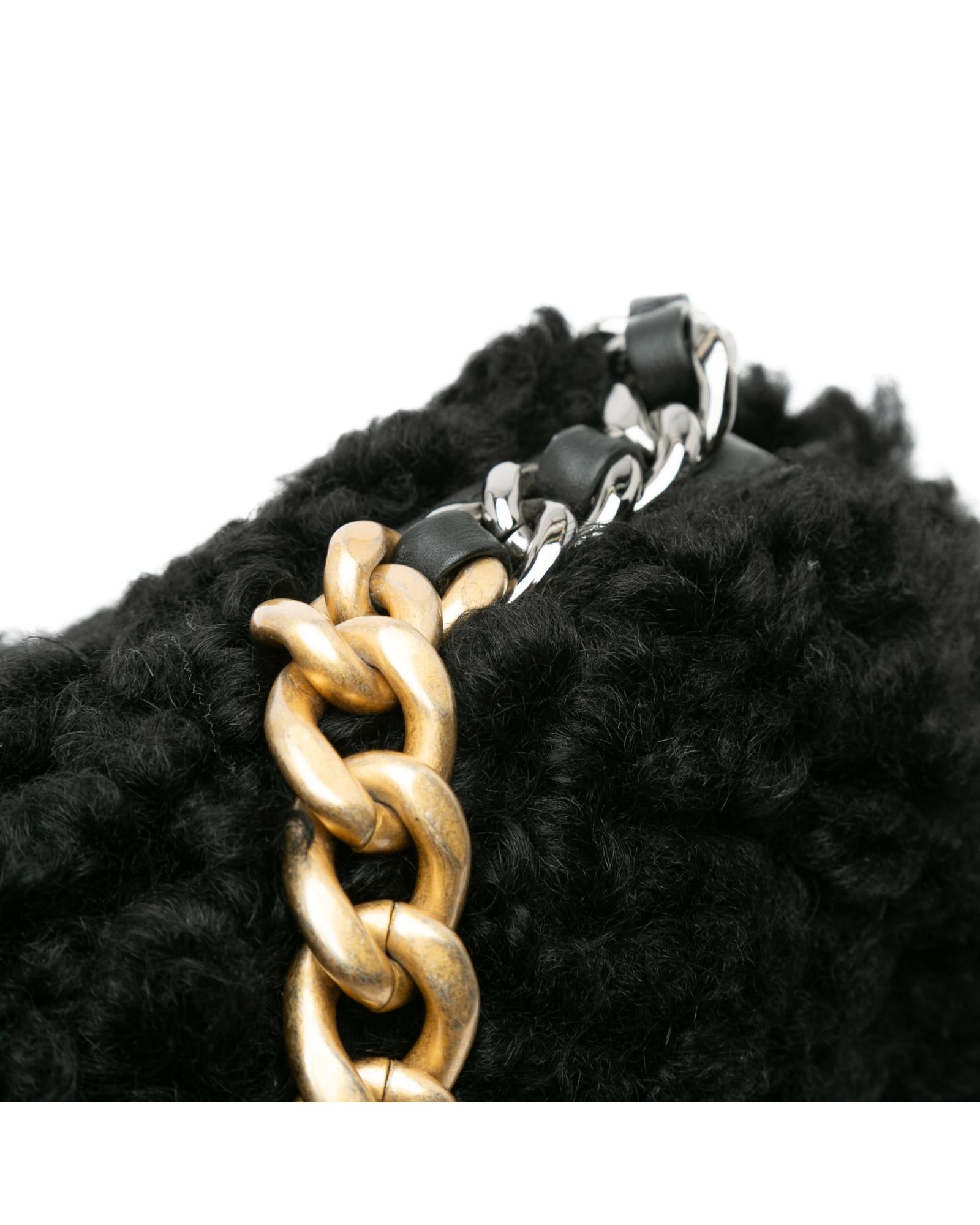 This satchel features a shearling body a gold-tone chain link handle a leather woven chain link shoulder strap a front flap with twist-lock closure an exterior back slip pocket and an interior zip pocket.Brand: Chanel Vintage