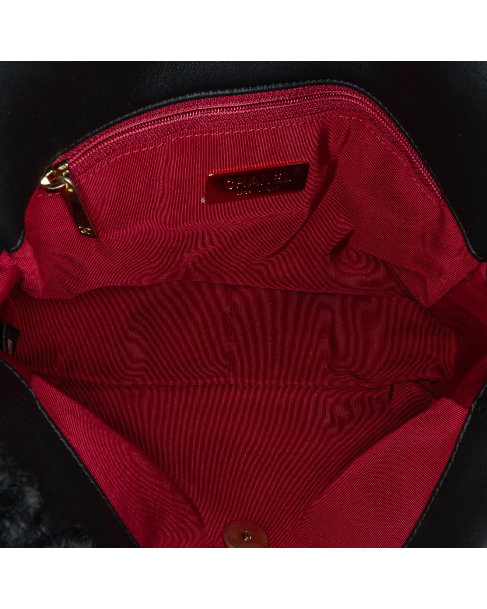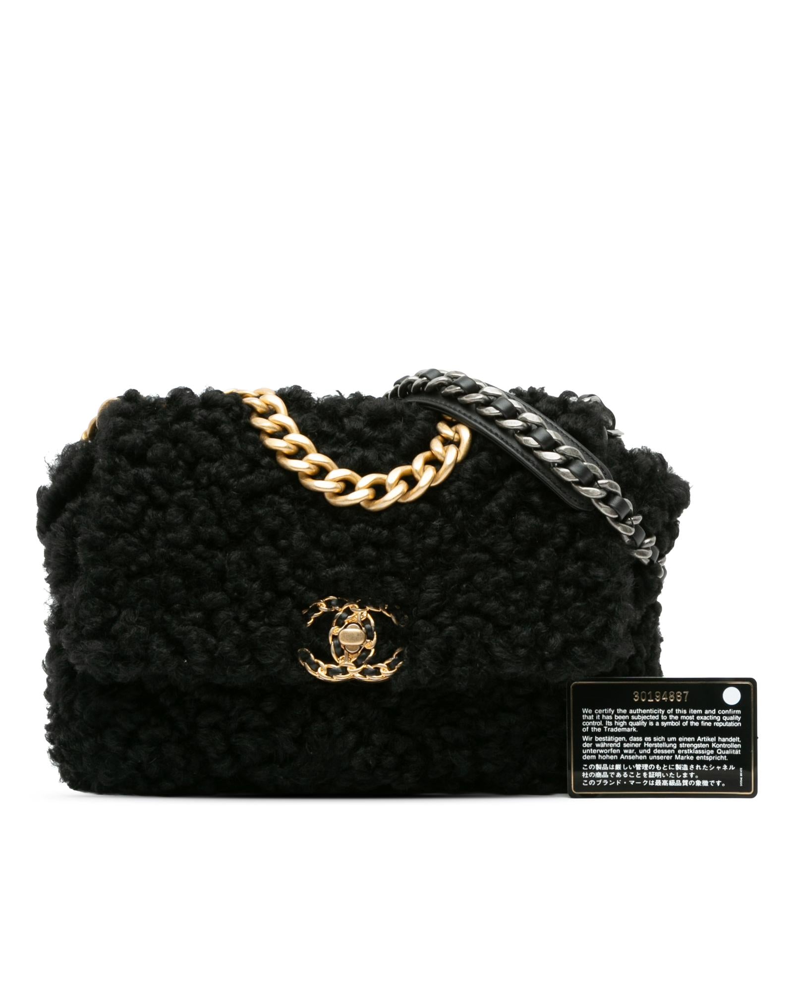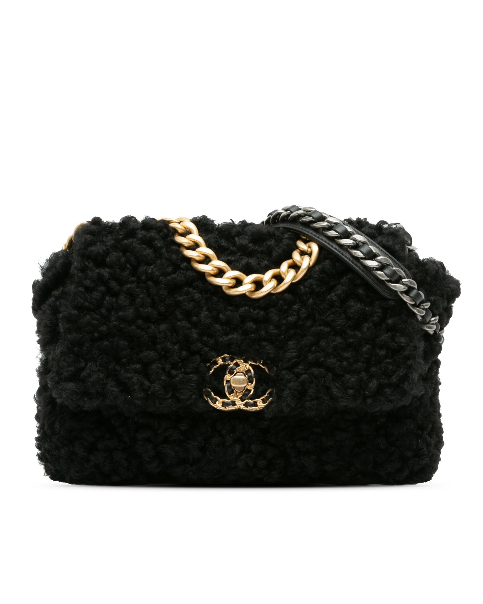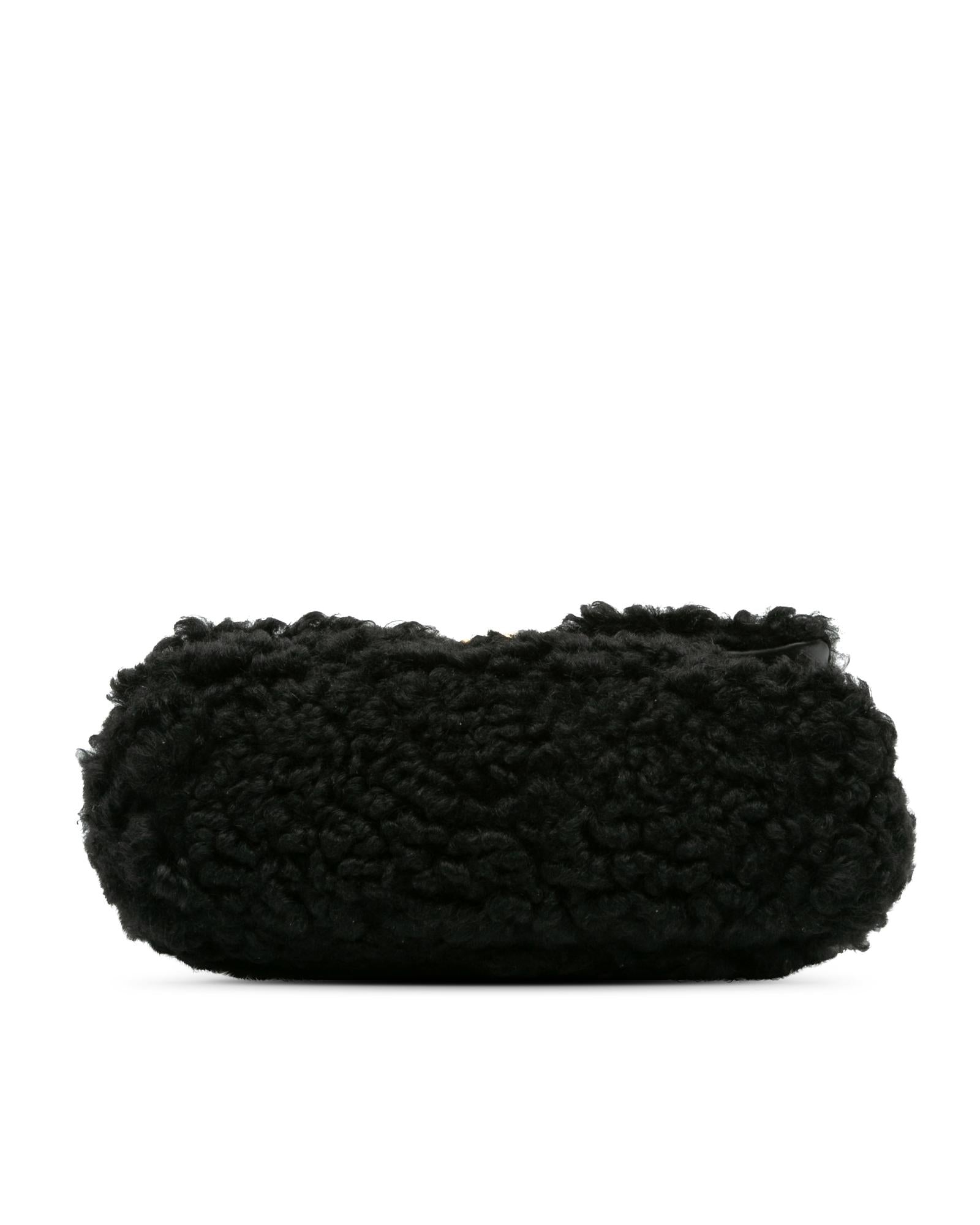 This satchel features a shearling body a gold-tone chain link handle a leather woven chain link shoulder strap a front flap with twist-lock closure an exterior back slip pocket and an interior zip pocket.Brand: Chanel Vintage