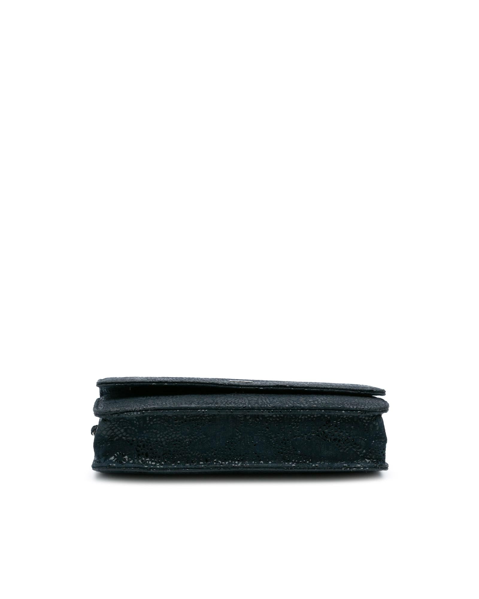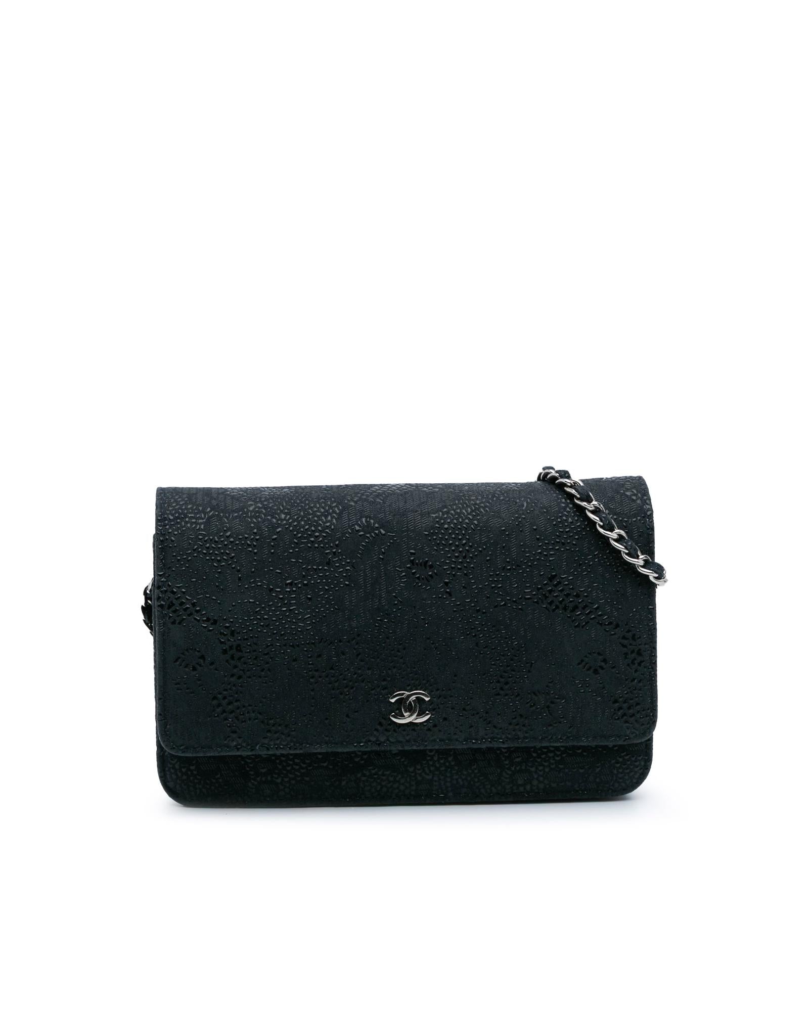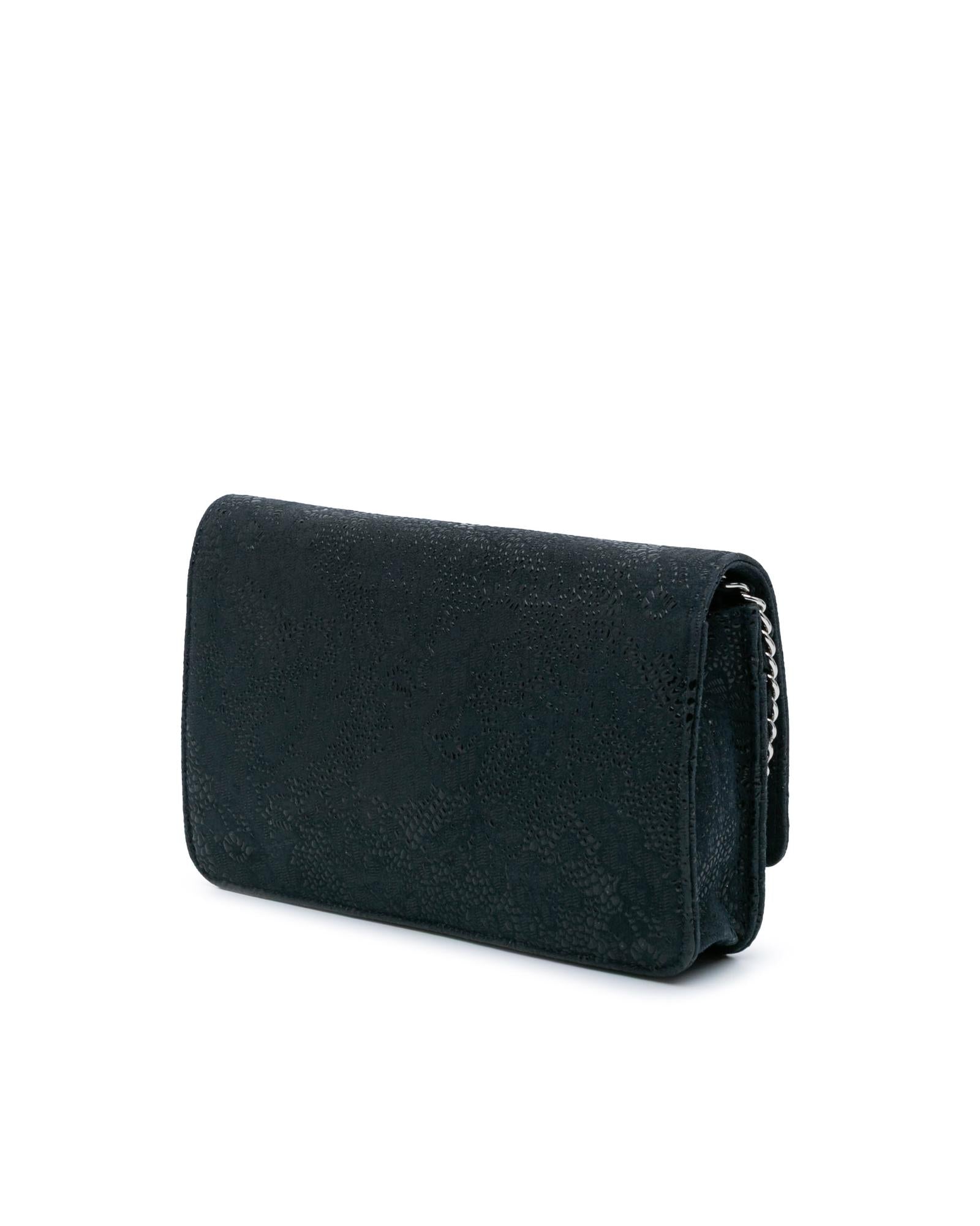 This crossbody bag features a goatskin body with lace overlay a lace-woven chain shoulder strap a front flap with magnetic snap closure and interior zip and slip pockets.Brand: Chanel Vintage