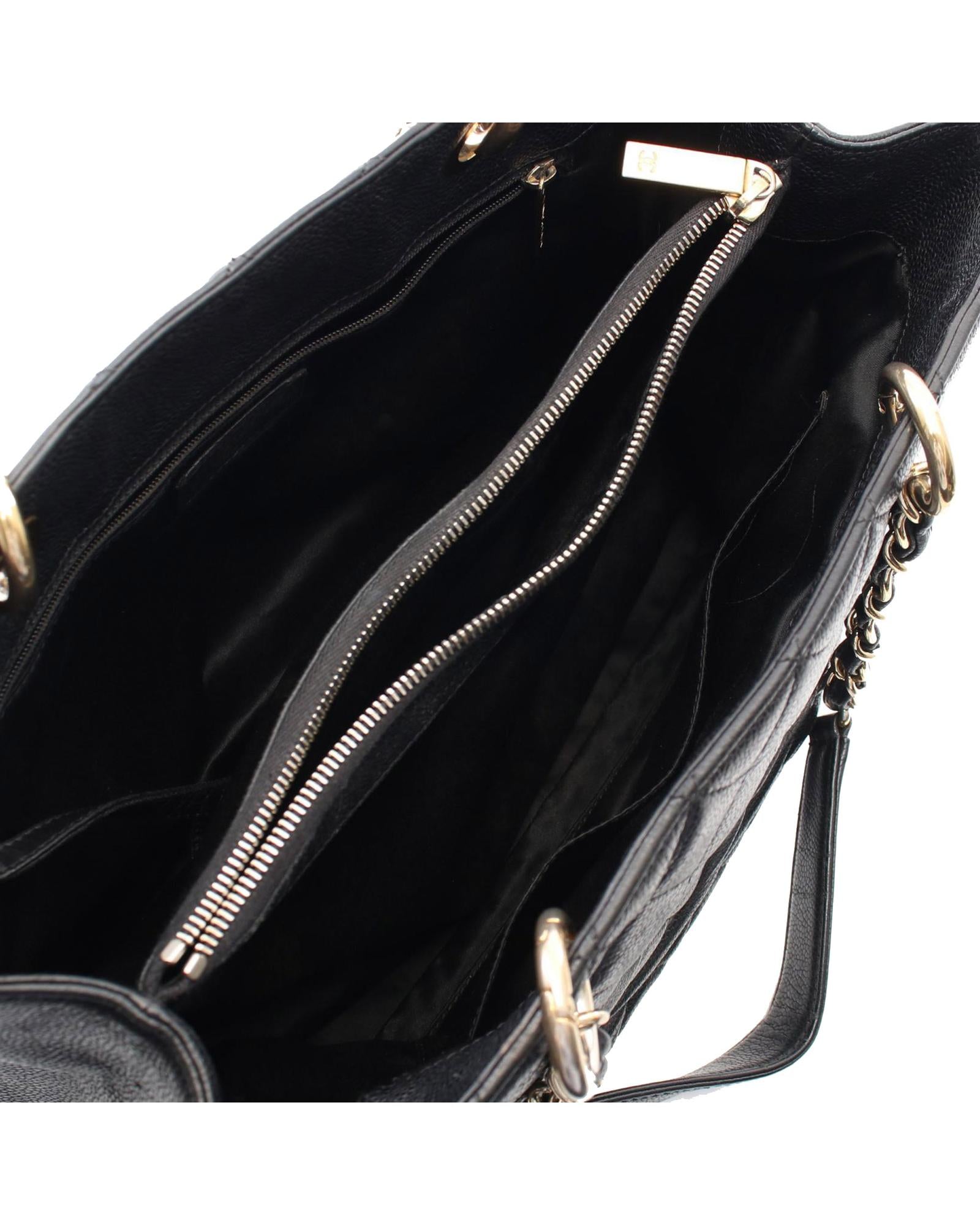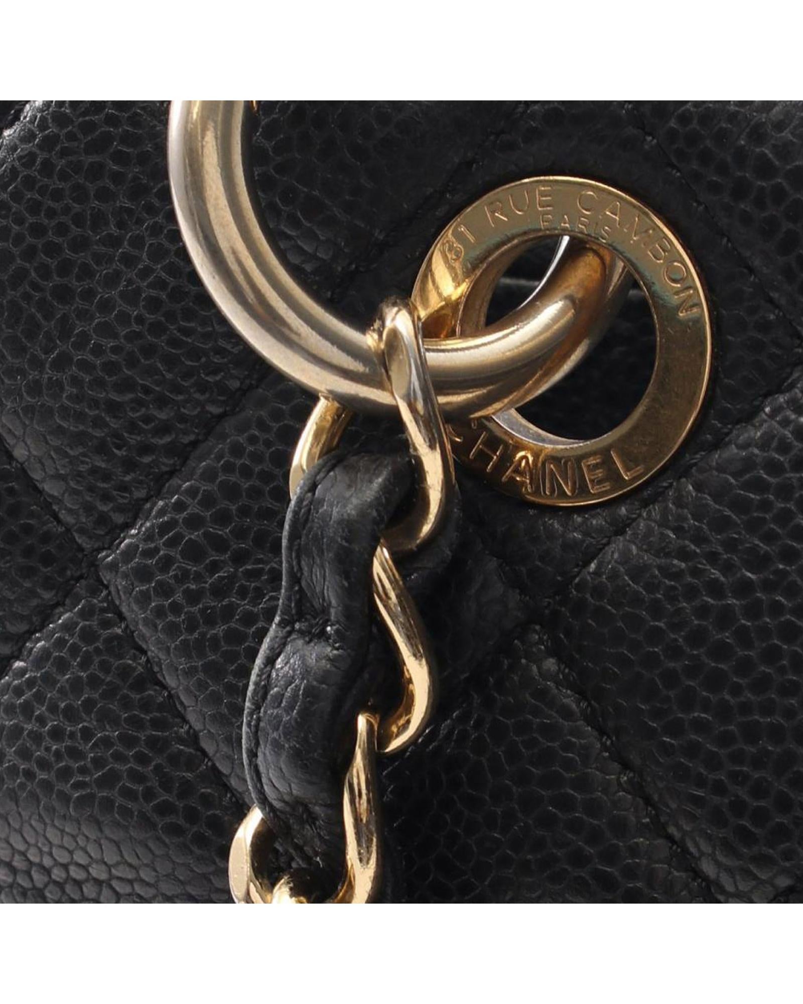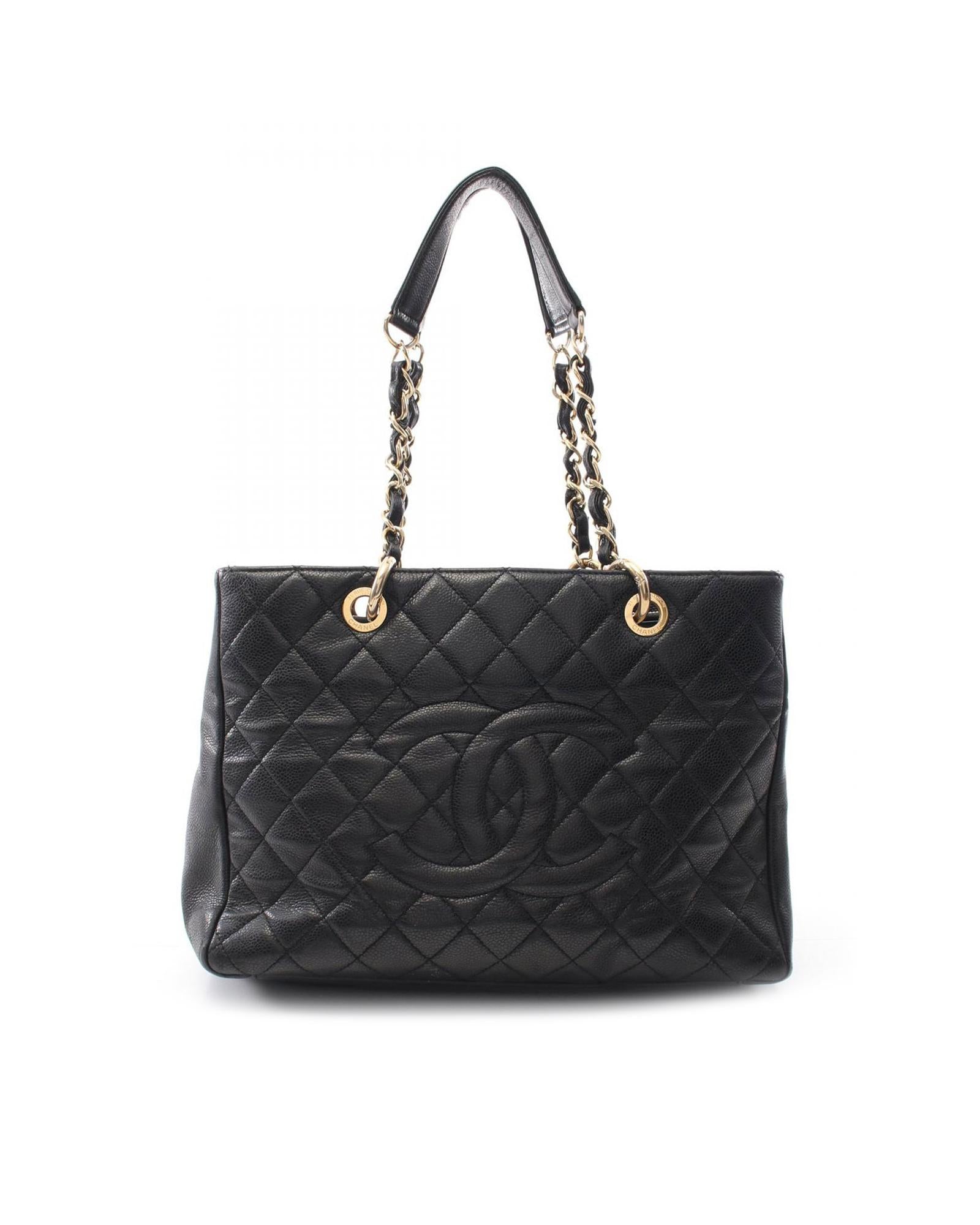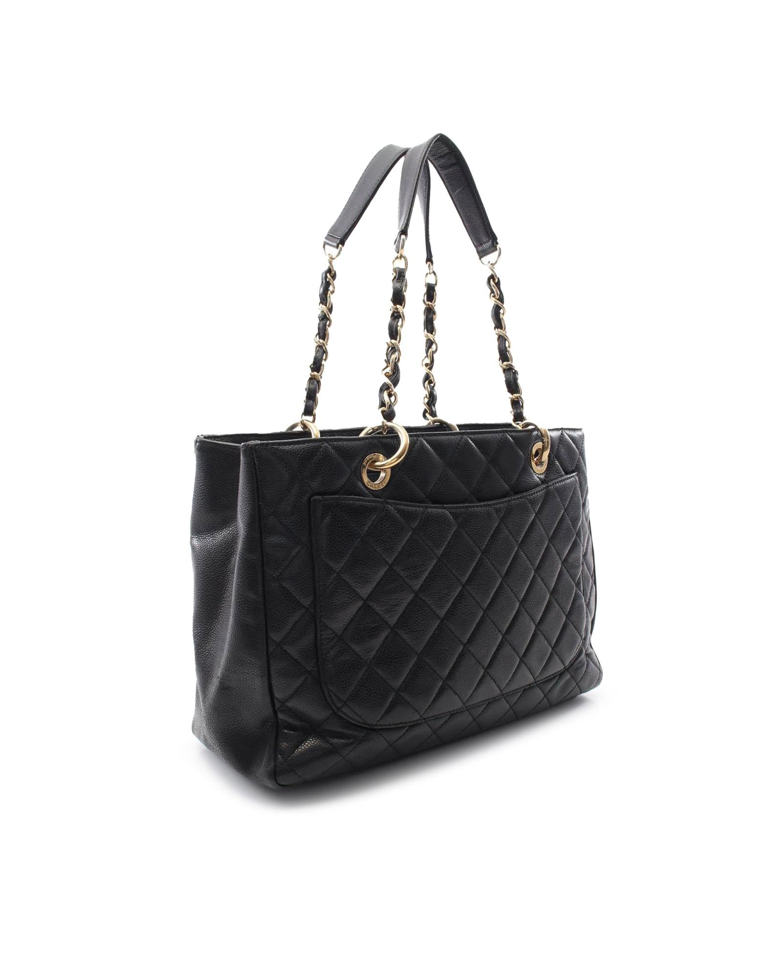 The Grand Shopping Tote features a quilted Caviar leather body leather woven chain shoulder straps an open top an interior zip compartment an exterior back slip pocket and interior zip and slip pockets.Brand: Chanel Vintage