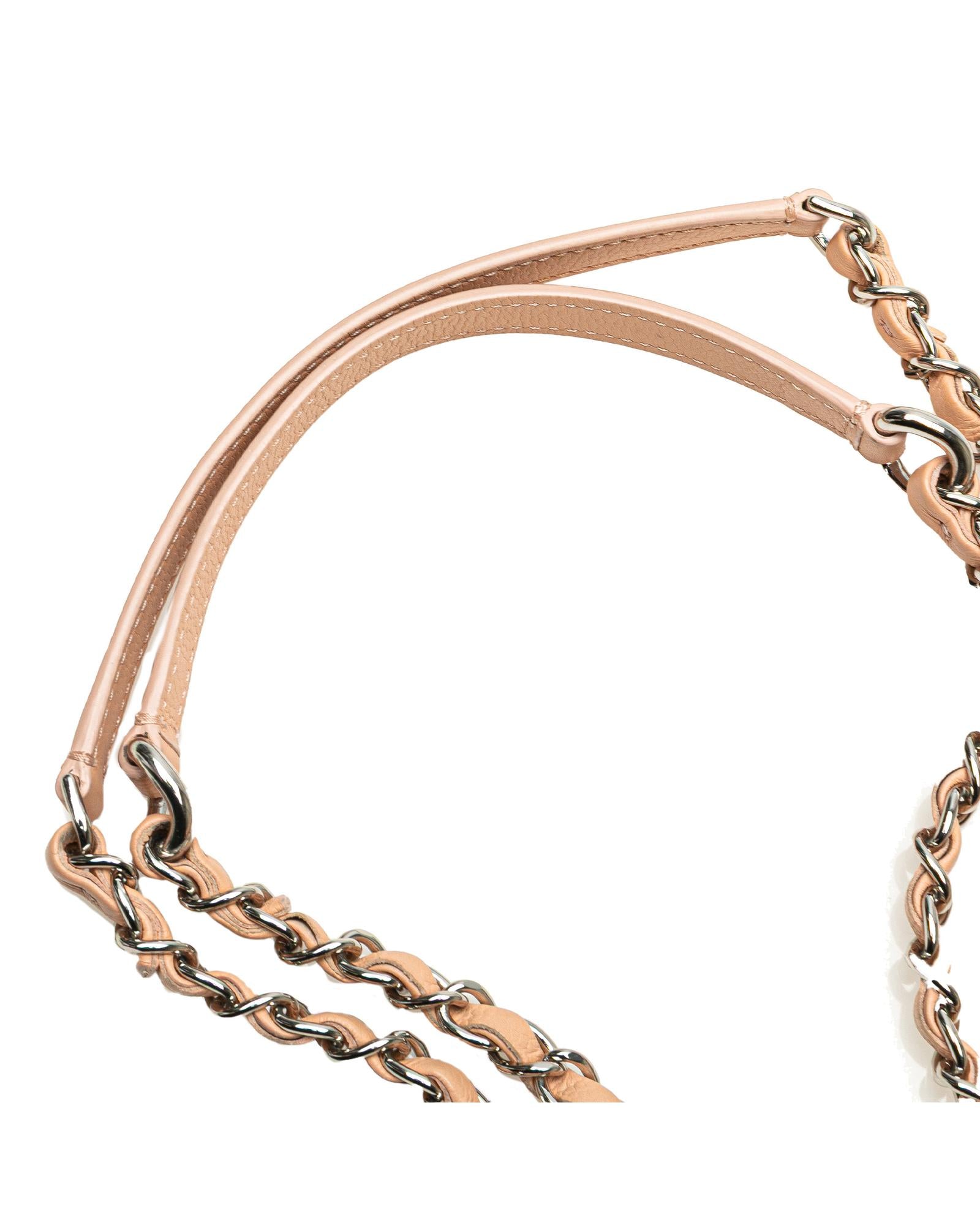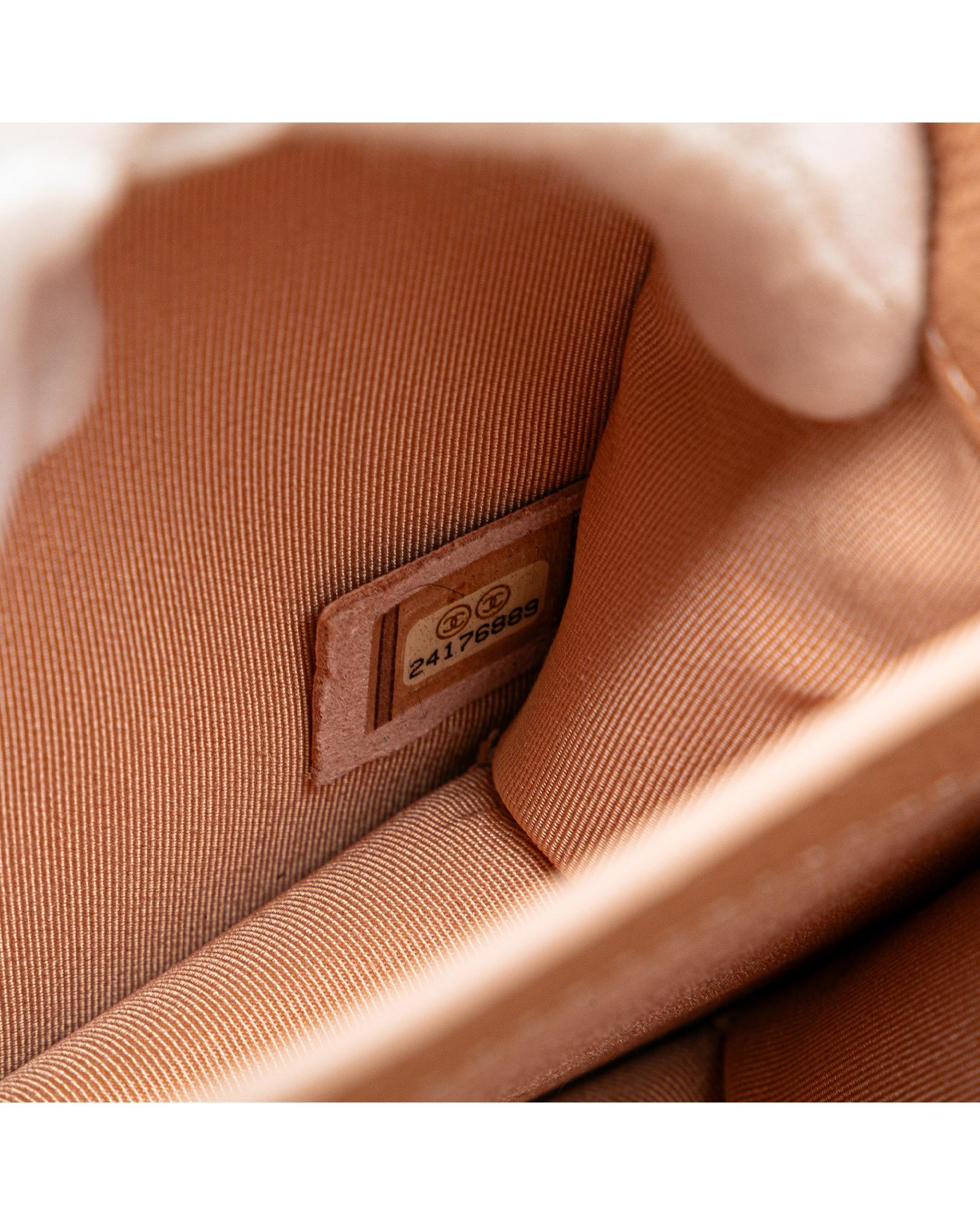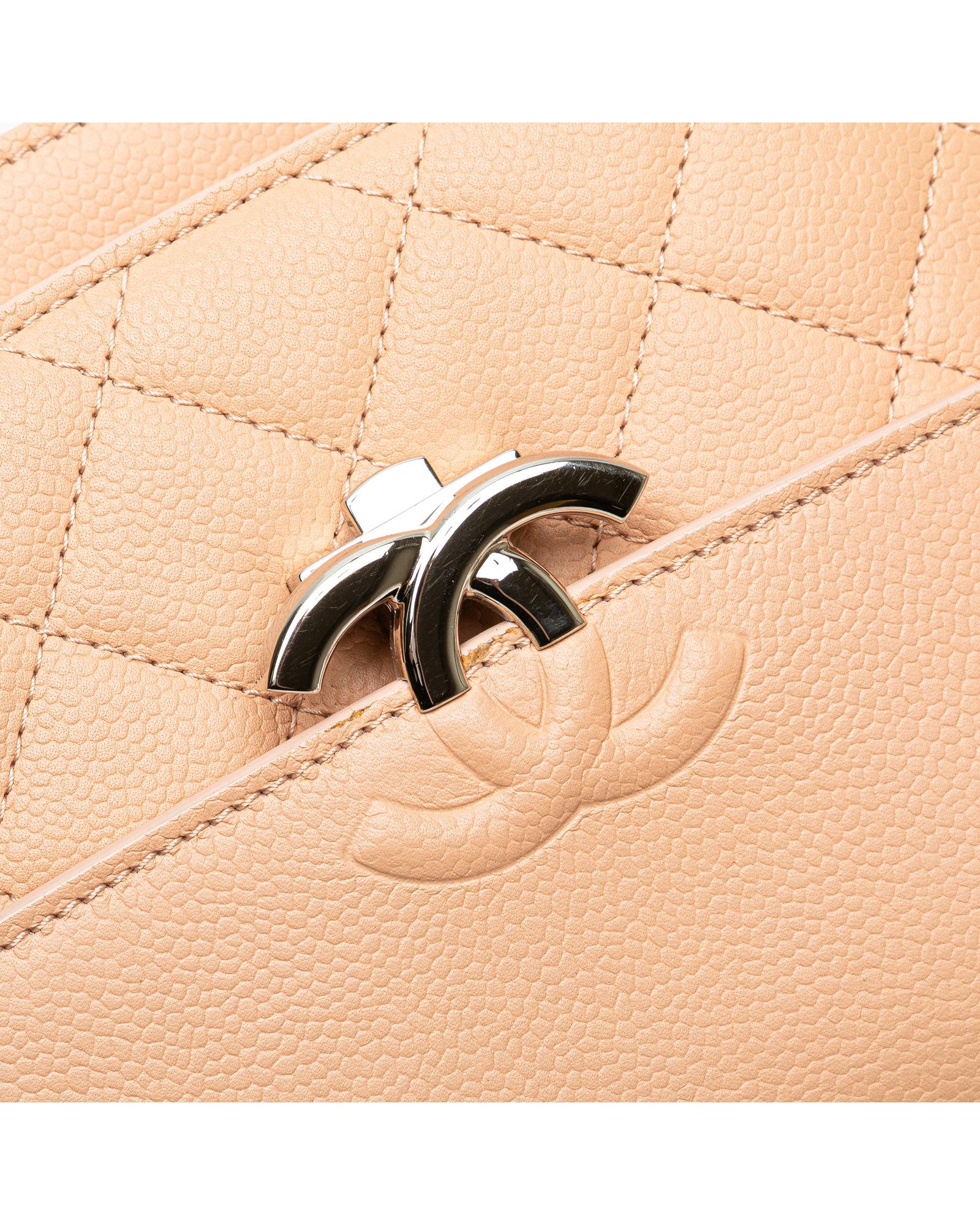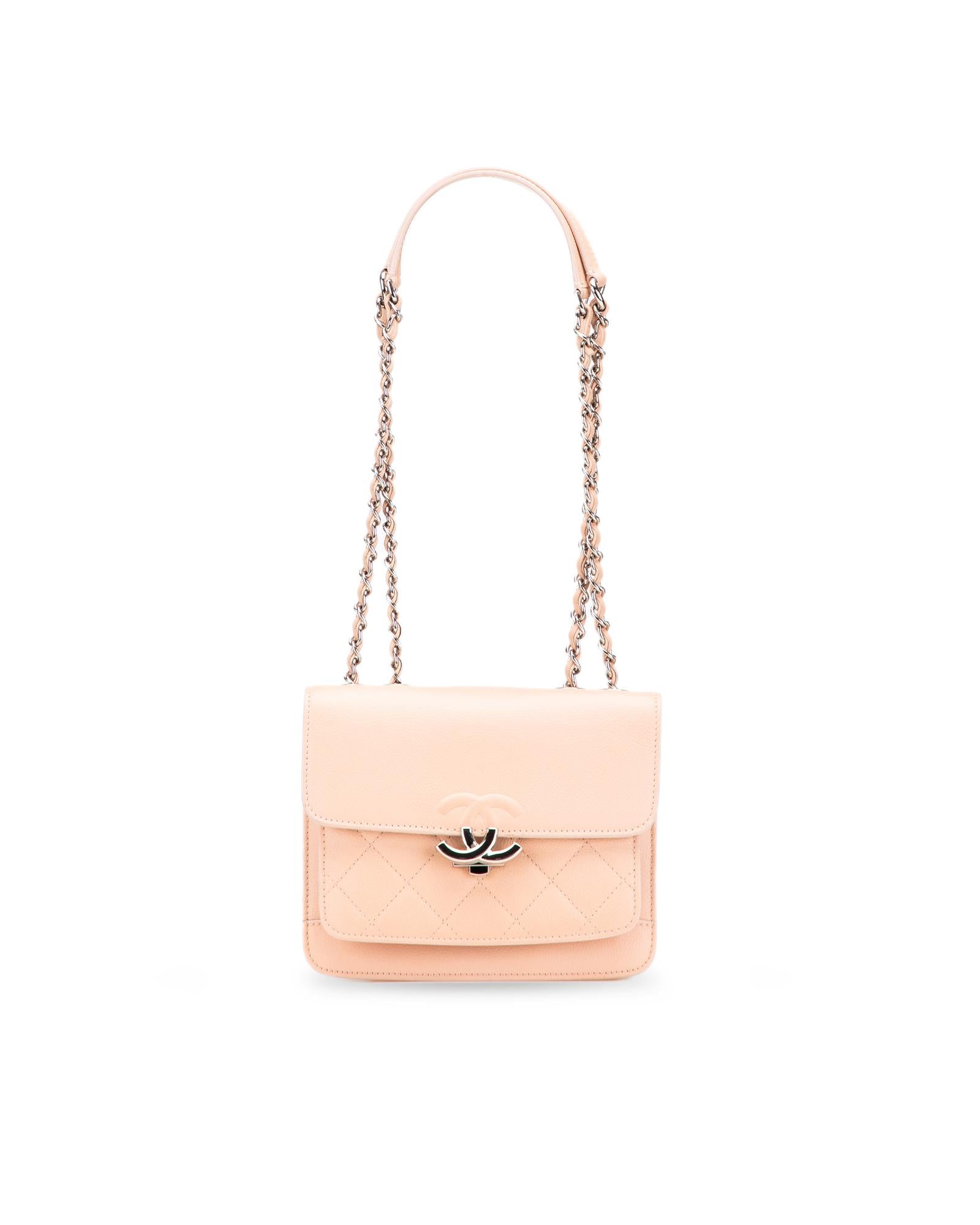 This shoulder bag features a quilted Caviar leather body leather woven chain straps with flat leather shoulder guards a front flap with metal lock closure and an interior slip pocket.Brand: Chanel Vintage